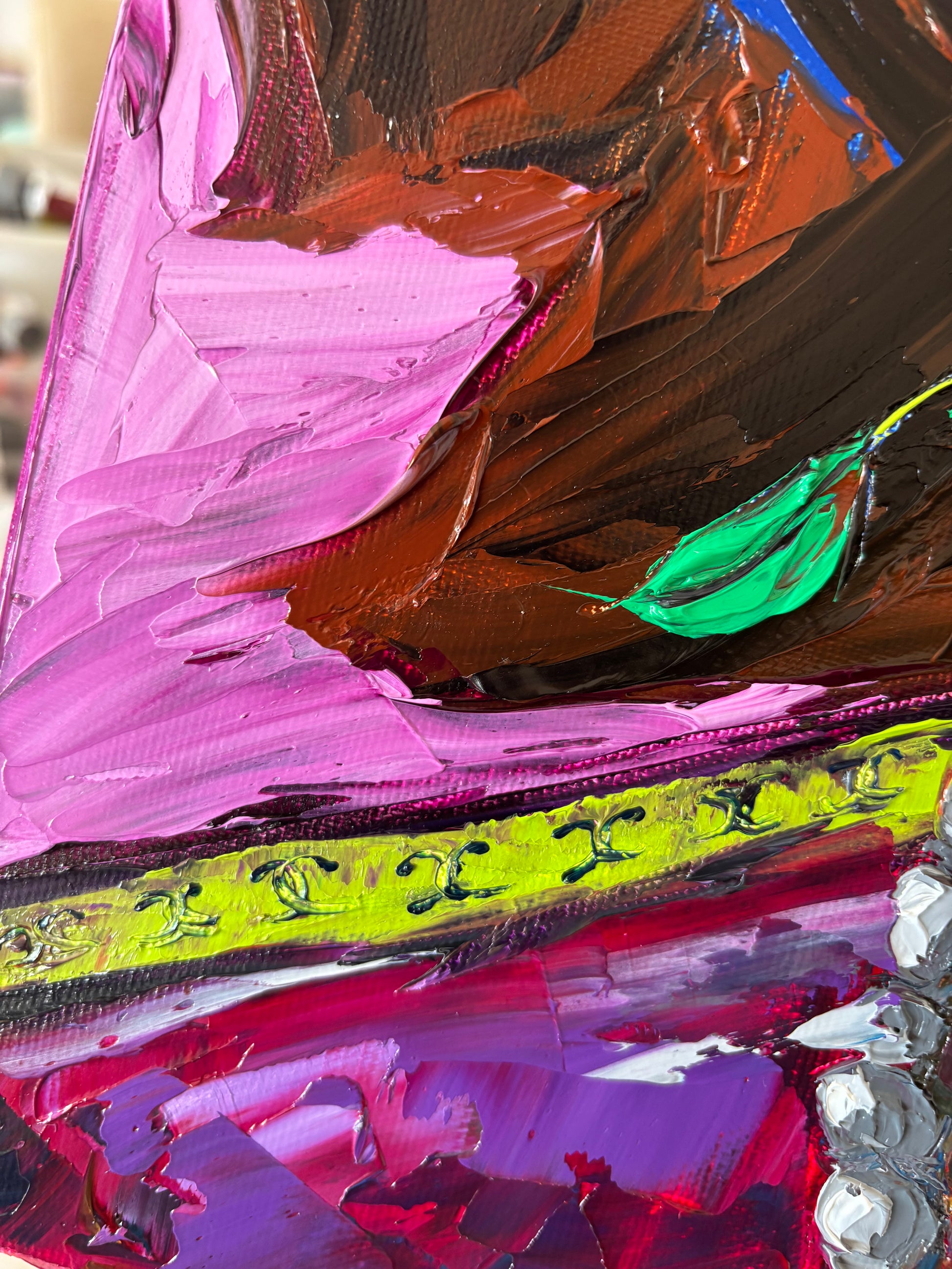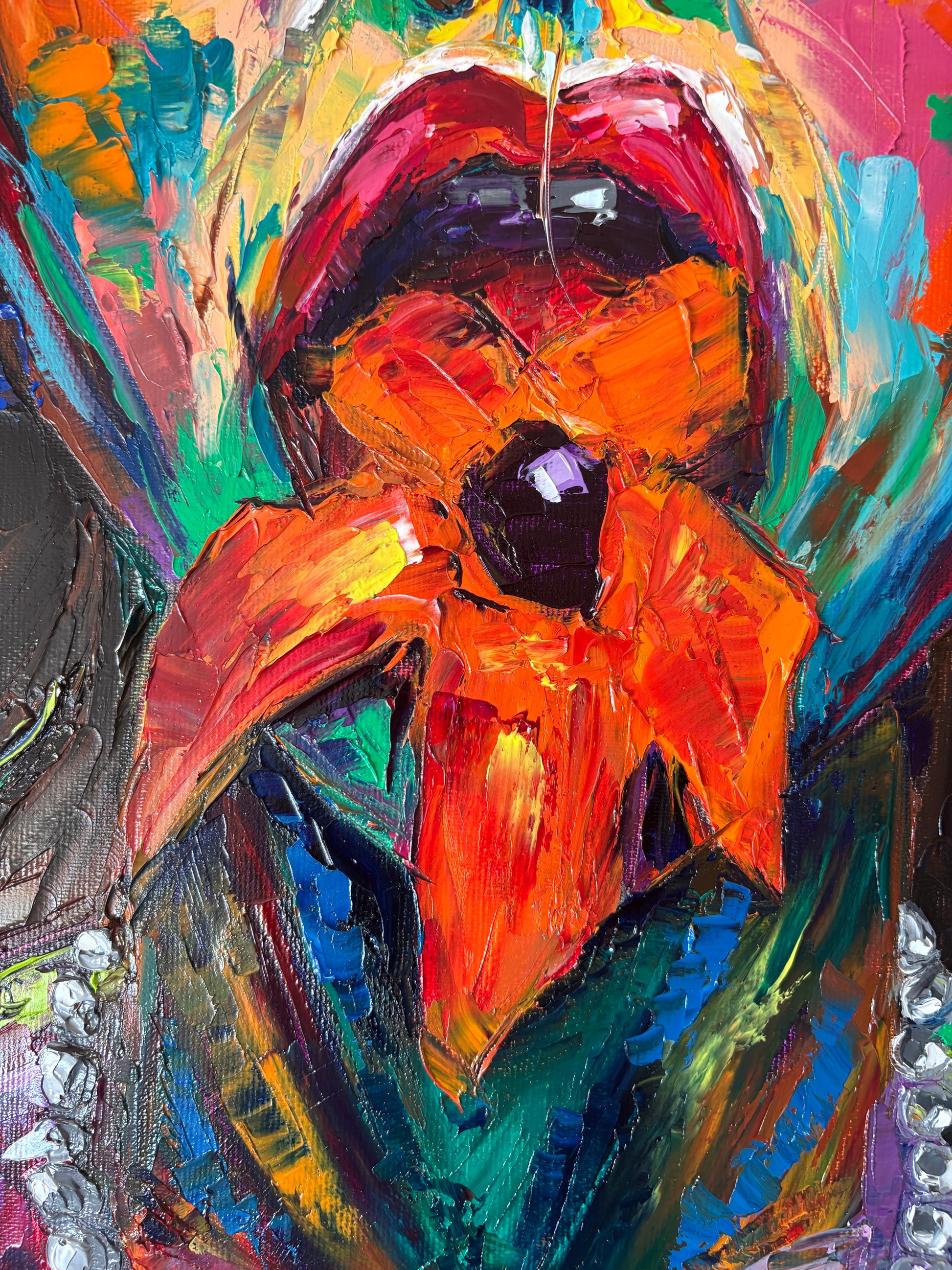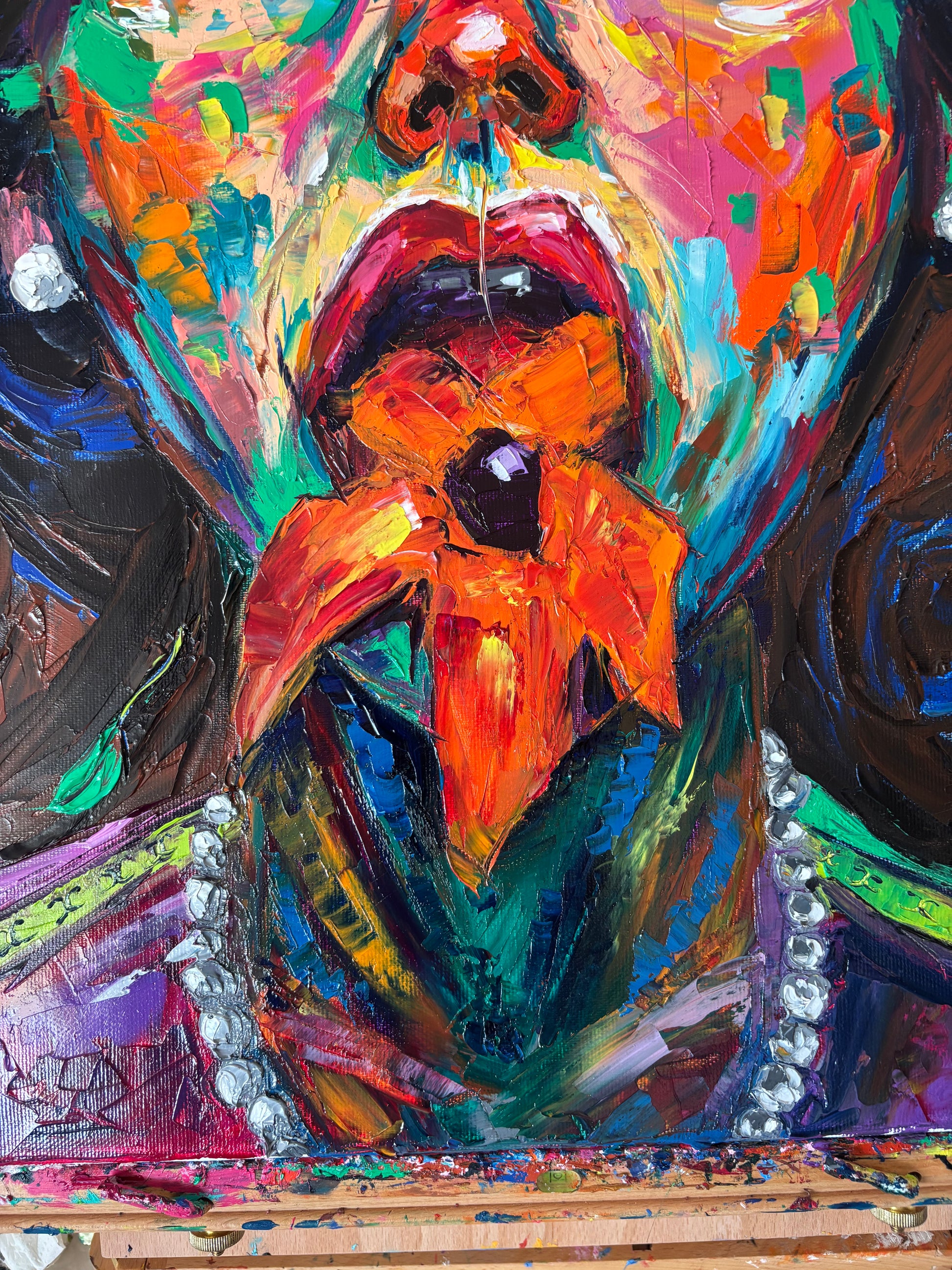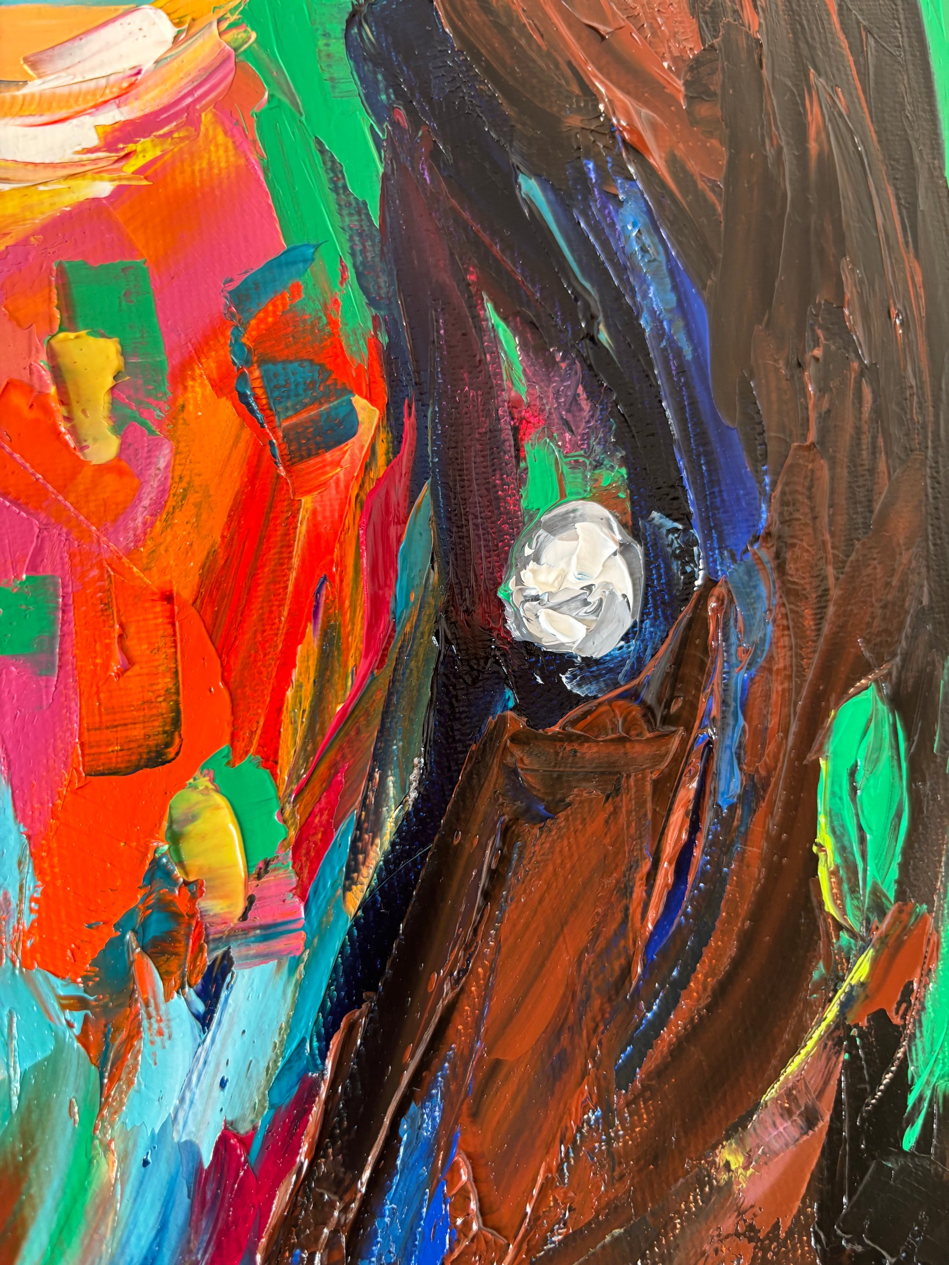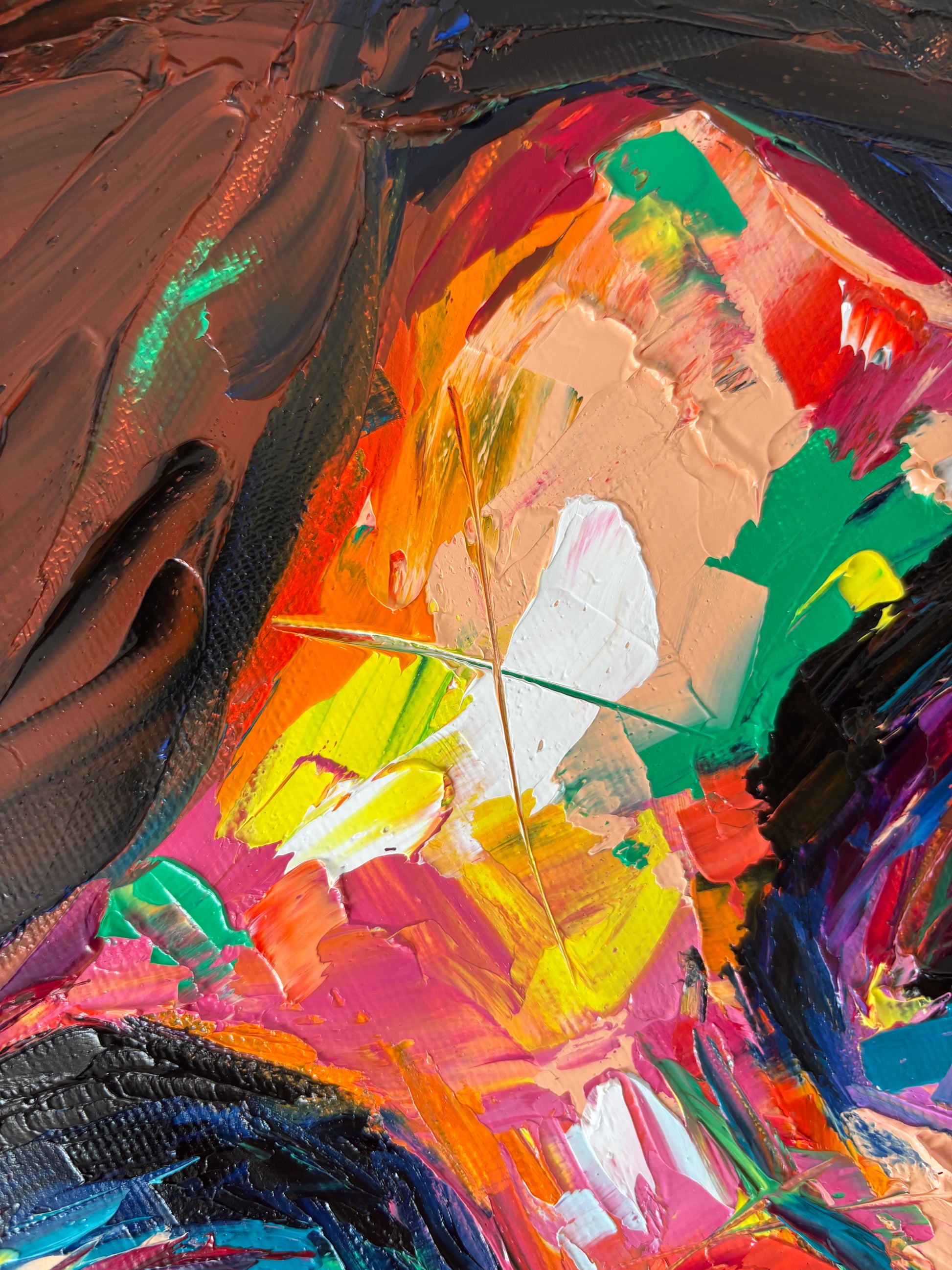 A bold and visceral portrait that merges beauty and desire in one explosive gesture. Blossombite captures the raw intensity of a woman consumed by color, as if passion itself blooms and bites back. The thick impasto textures and vibrant palette of emerald green, fiery orange, fuchsia, and deep violet bring the figure to life with magnetic energy.