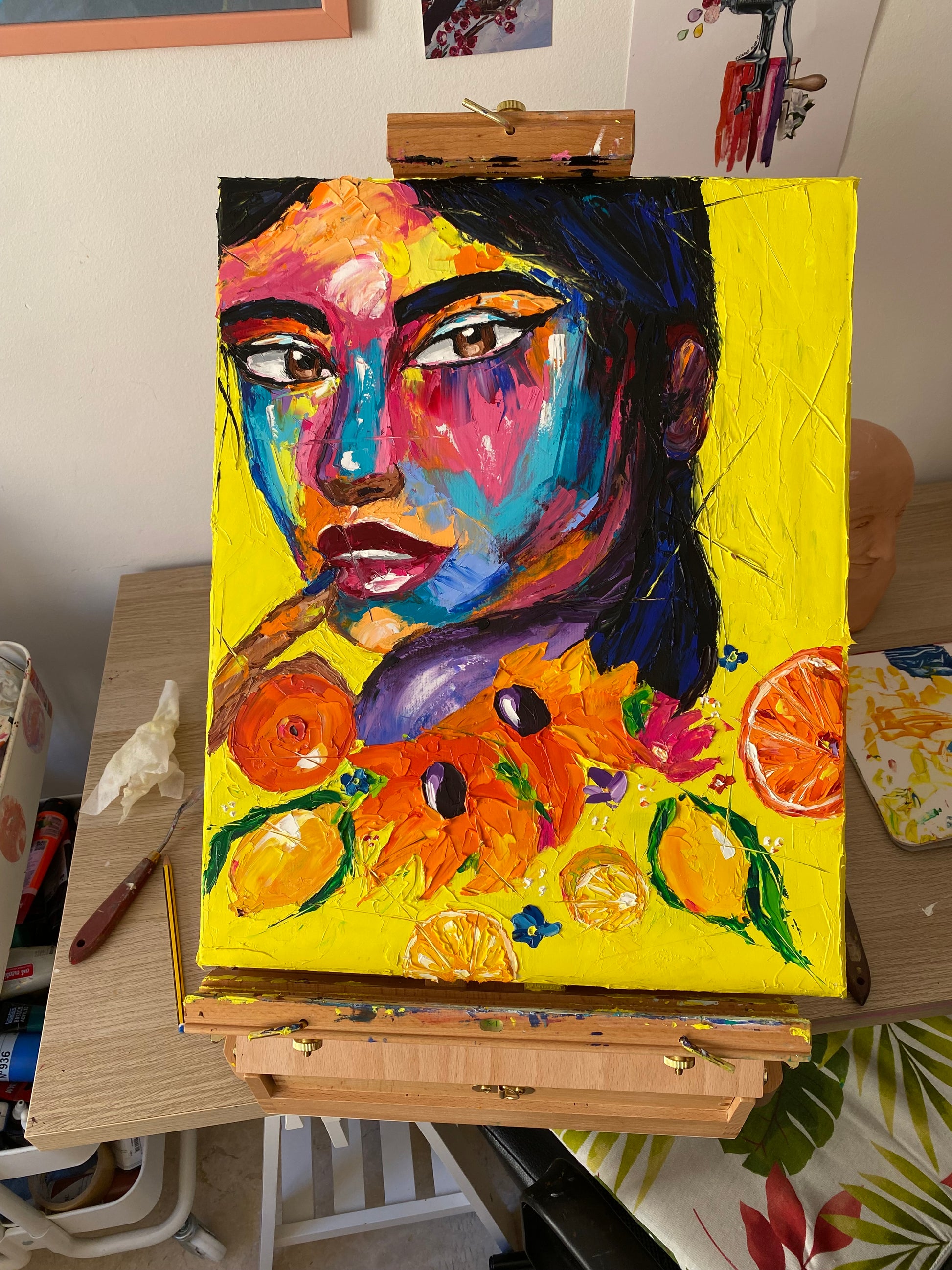 This vibrant portrait bursts with life and energy, blending bold strokes of fuchsia, turquoise, deep indigo, and golden yellow. The expressive female face is surrounded by a cascade of citrus fruits and radiant flowers, evoking a dreamlike garden where vitality and imagination collide. The textured impasto gives the piece a sculptural quality, allowing the light to dance across its surface and enhancing the intensity of every color.