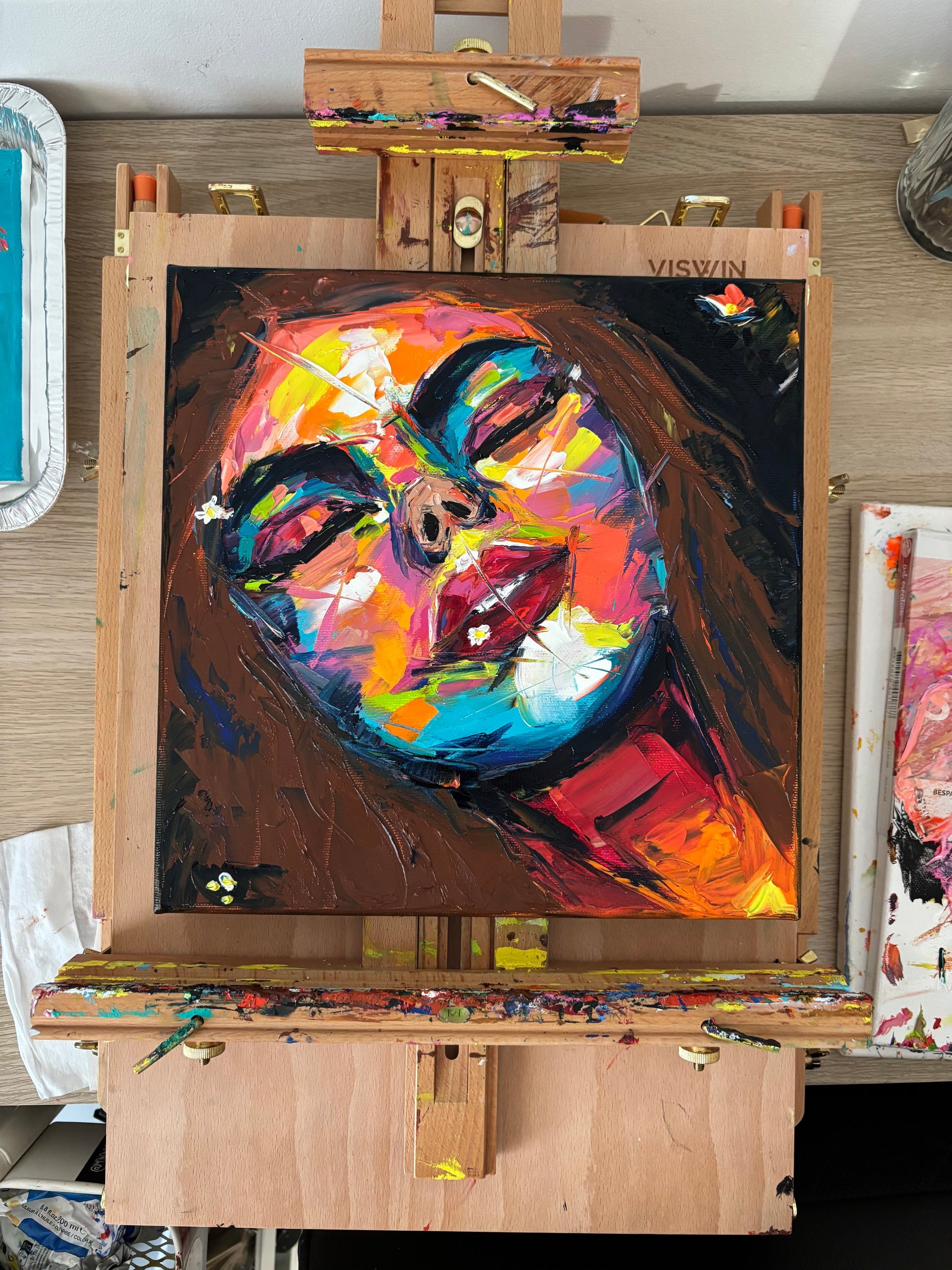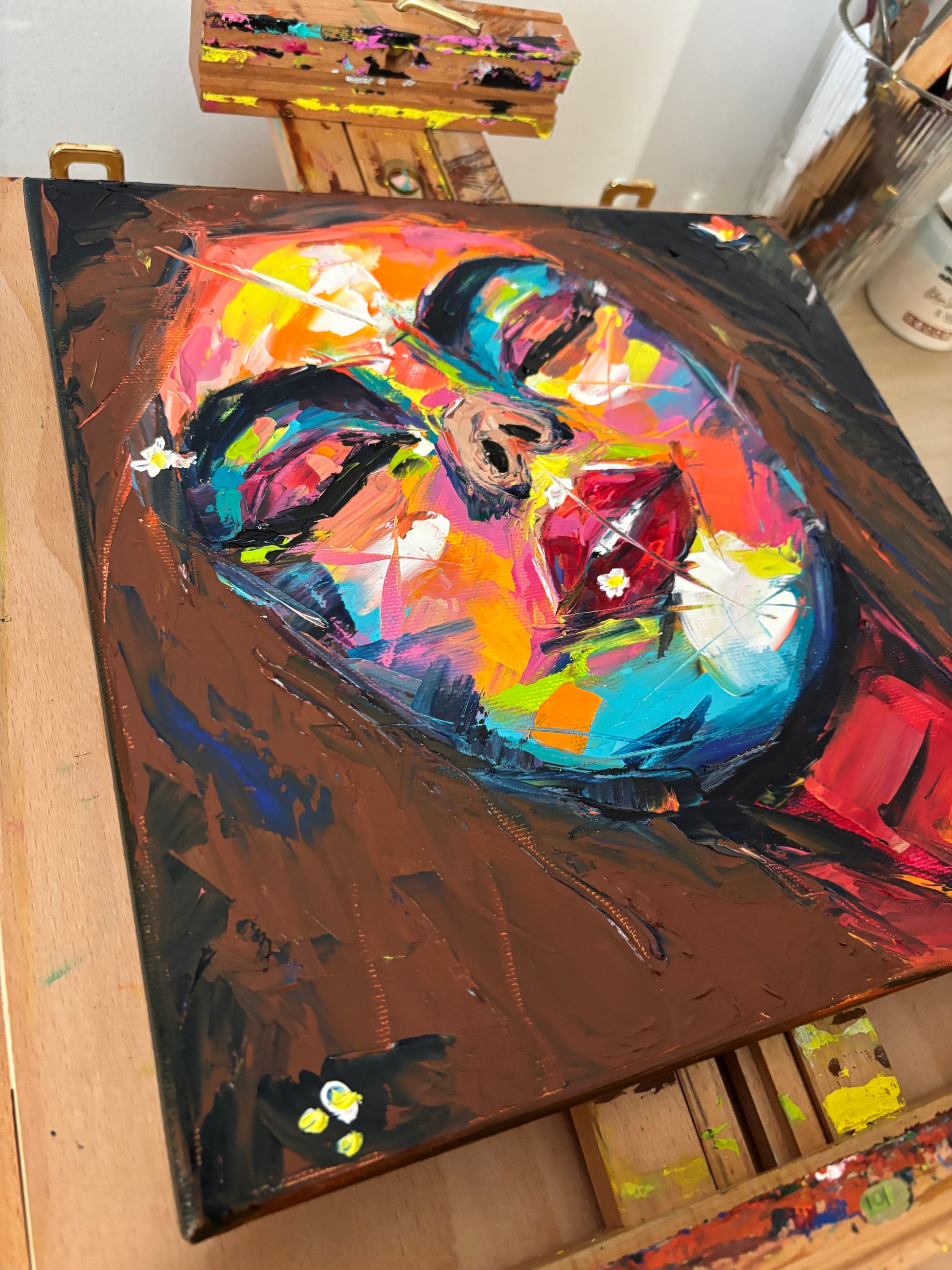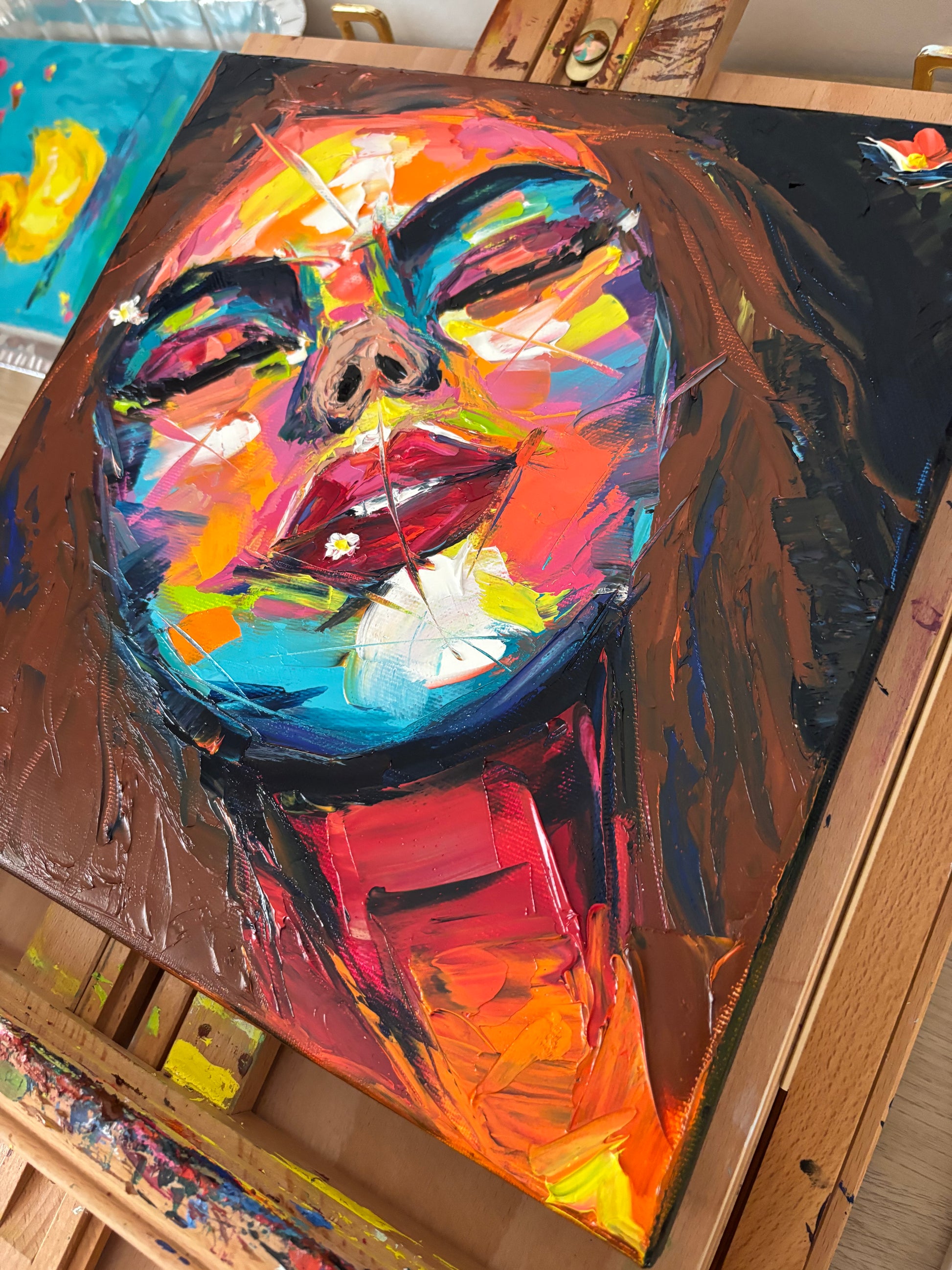 A bold, textured oil painting that captures the fleeting nature of dreams. With vibrant neon tones and a palette knife technique, the portrait of a serene woman emerges from a whirlwind of color and emotion. Tiny daisies hint at innocence and memory, scattered through a field of expressive chaos. A tribute to what we almost remember.