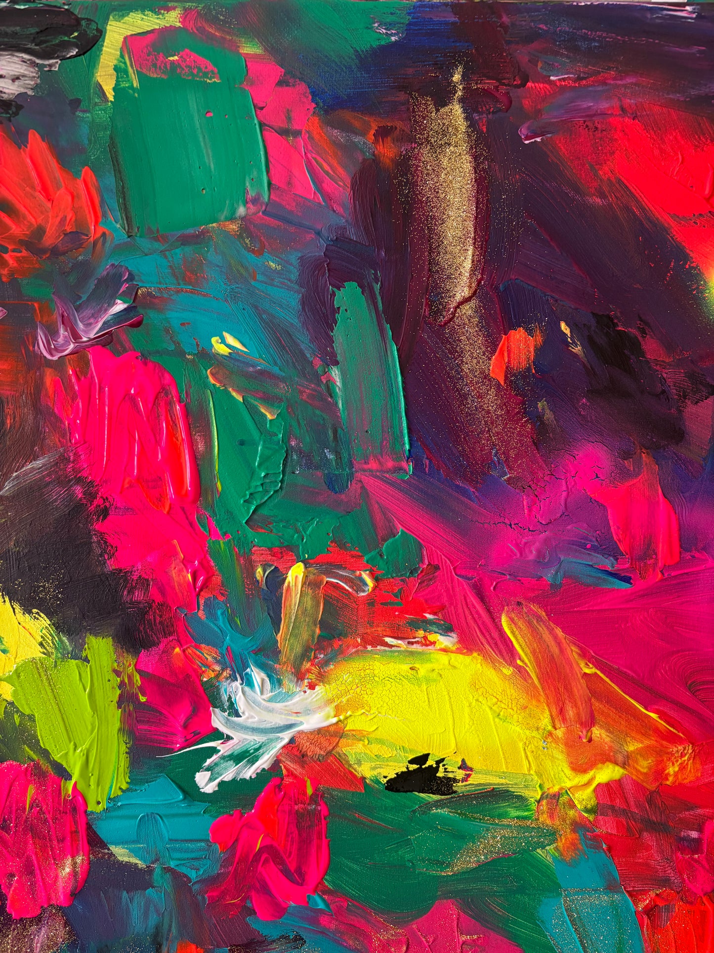Medium: Acrylic on canvas. Modeling paste and glitter.