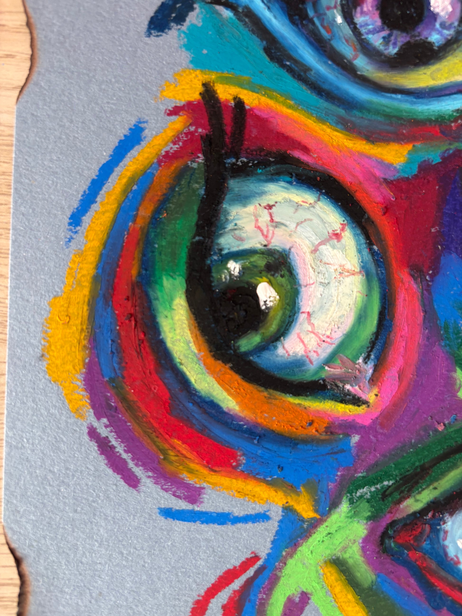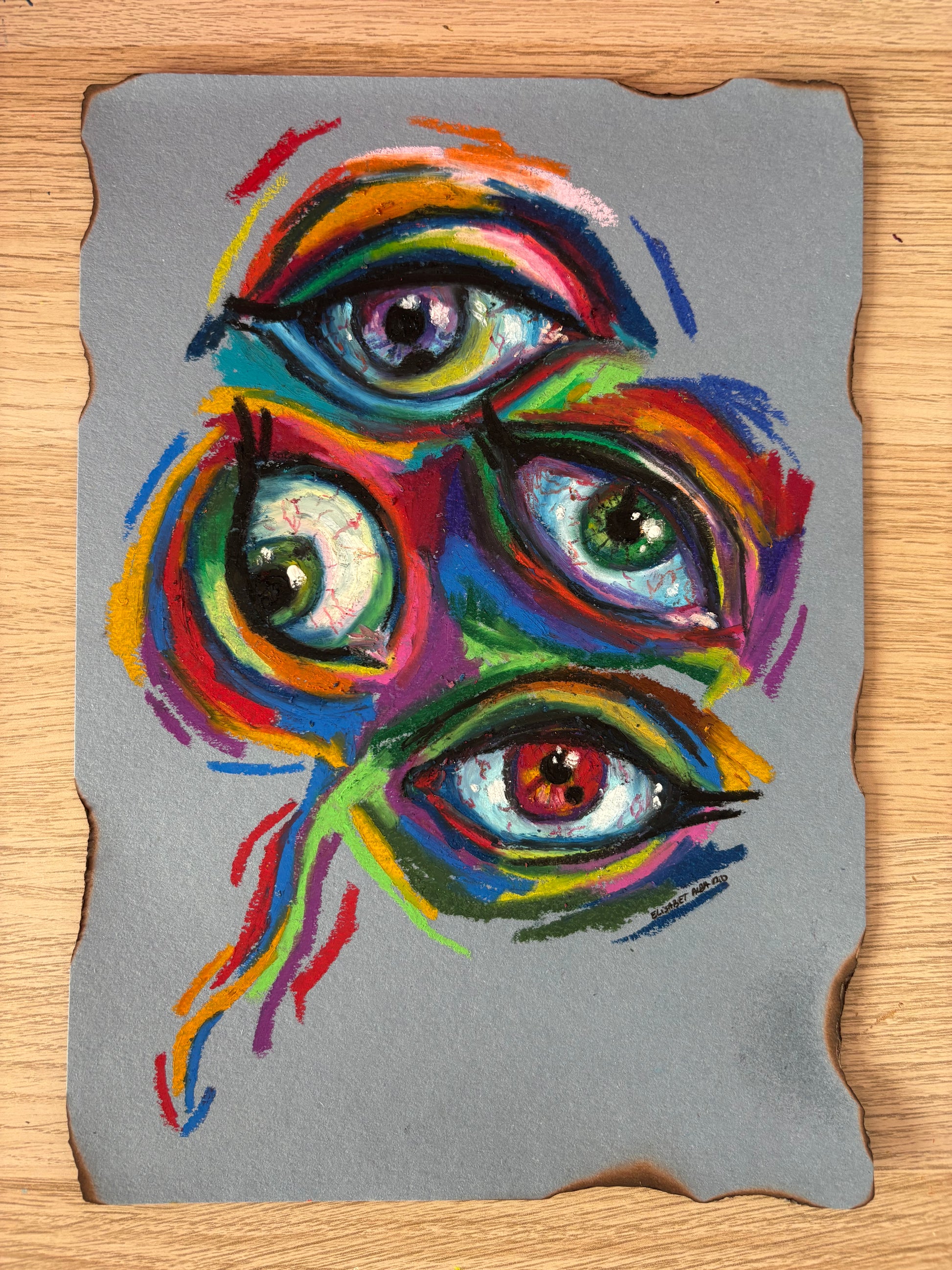 Eternal Gaze is an expressive pastel-on-paper artwork that explores perception, memory, and the many ways we see the world. Four vibrant eyes, painted with oil pastels in bold and radiant colors, seem to look beyond the surface, inviting the viewer into layers of vision and emotion.