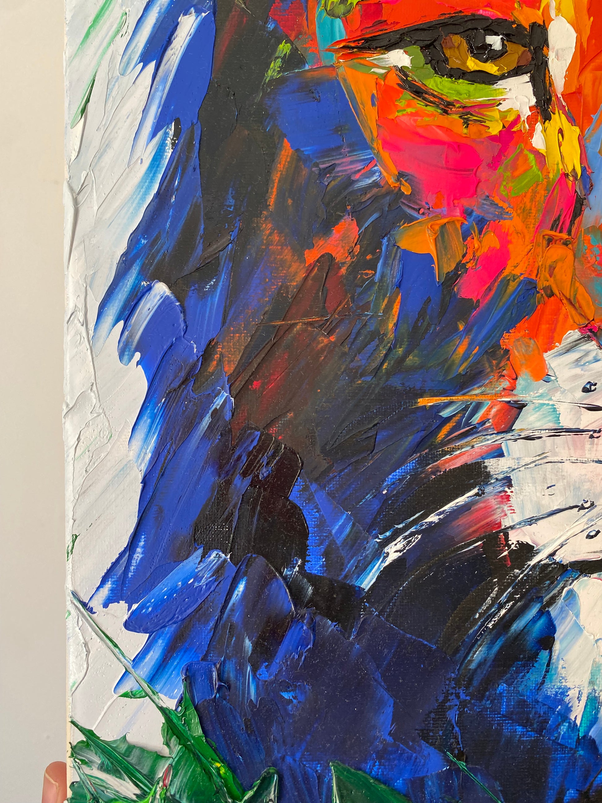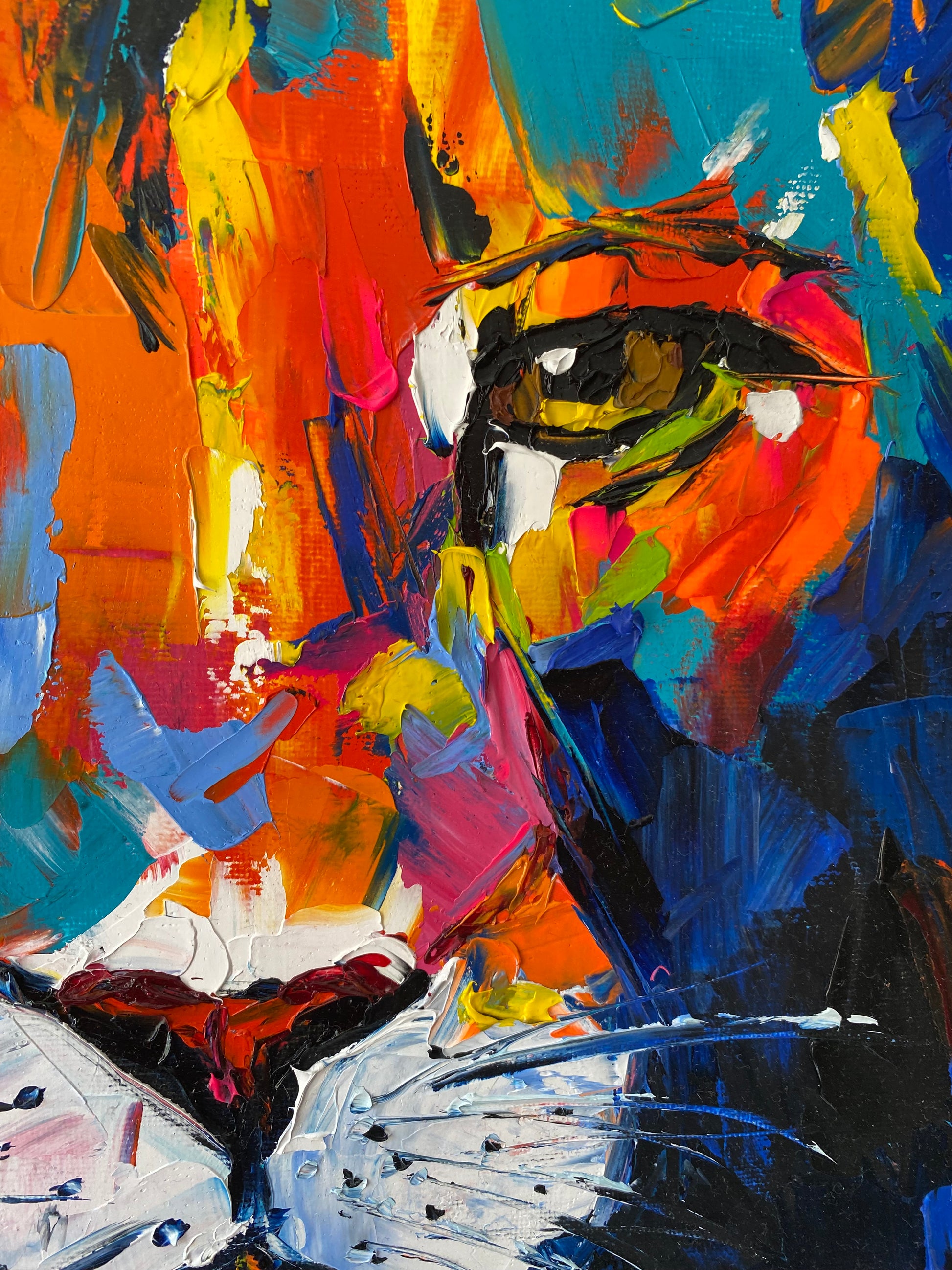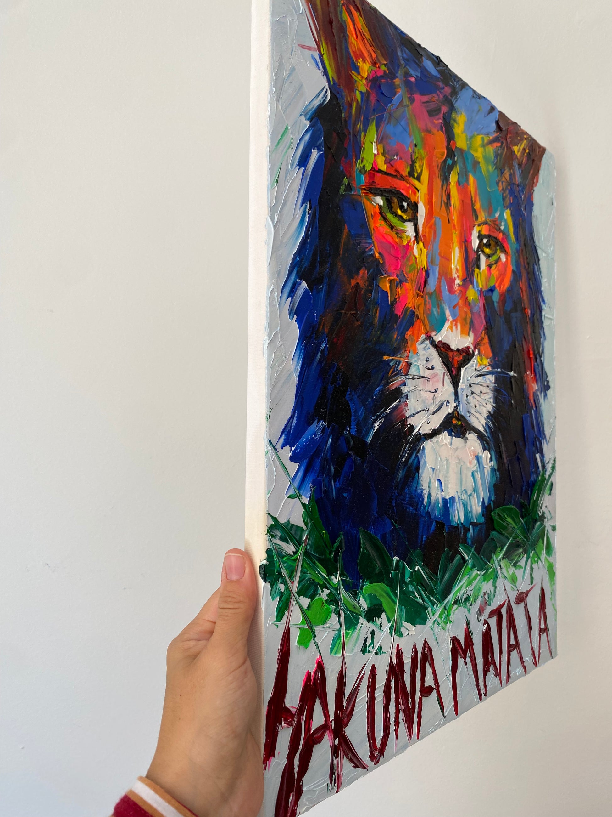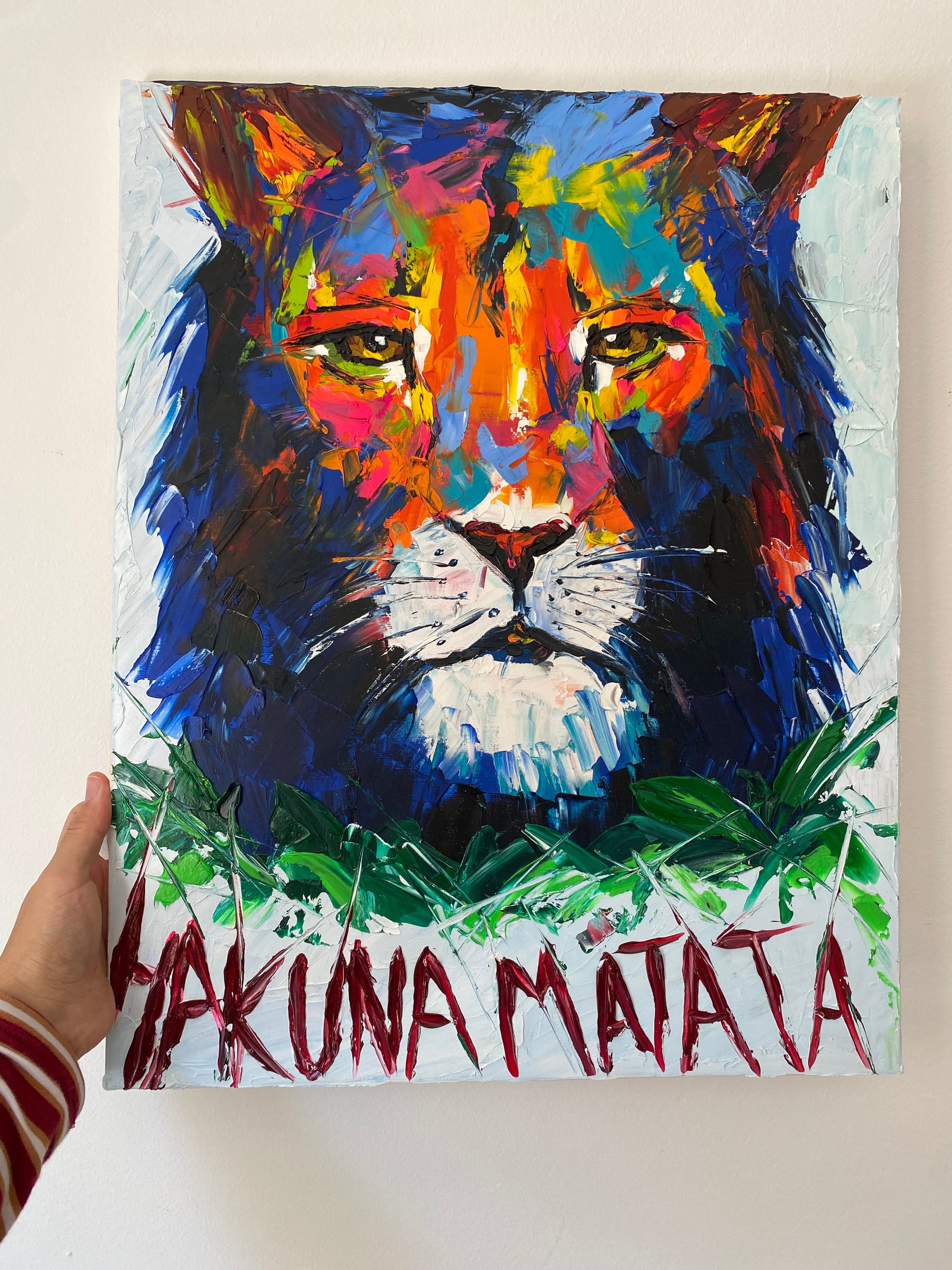 This striking oil painting features a majestic lion brought to life through a bold palette knife technique and a kaleidoscope of vibrant colors. The intense gaze, paired with expressive strokes, radiates strength, serenity, and wild beauty. The phrase Hakuna Matata carved into the composition adds a playful, carefree spirit — reminding us to embrace life with courage and joy. Painted in oil on canvas.