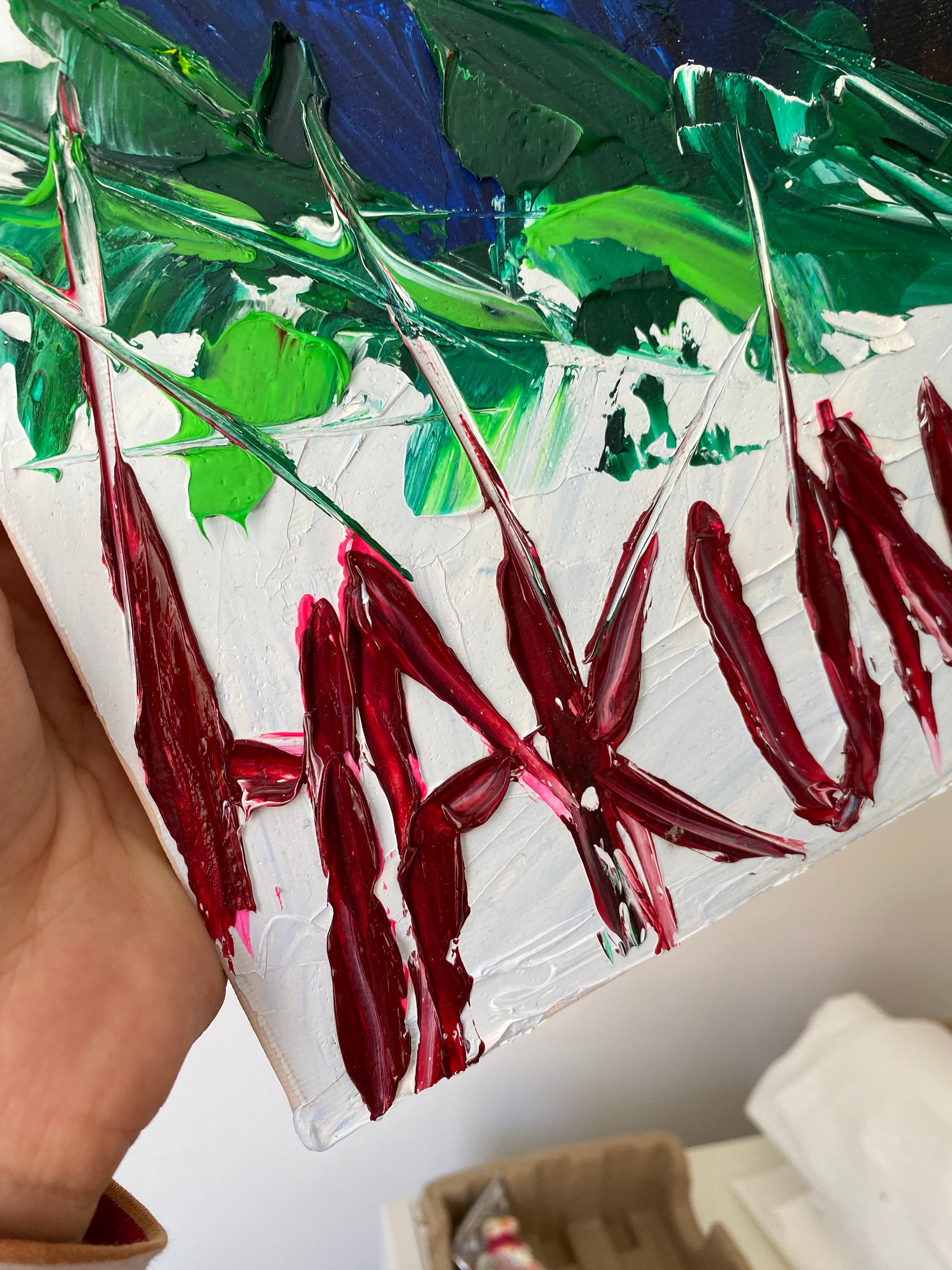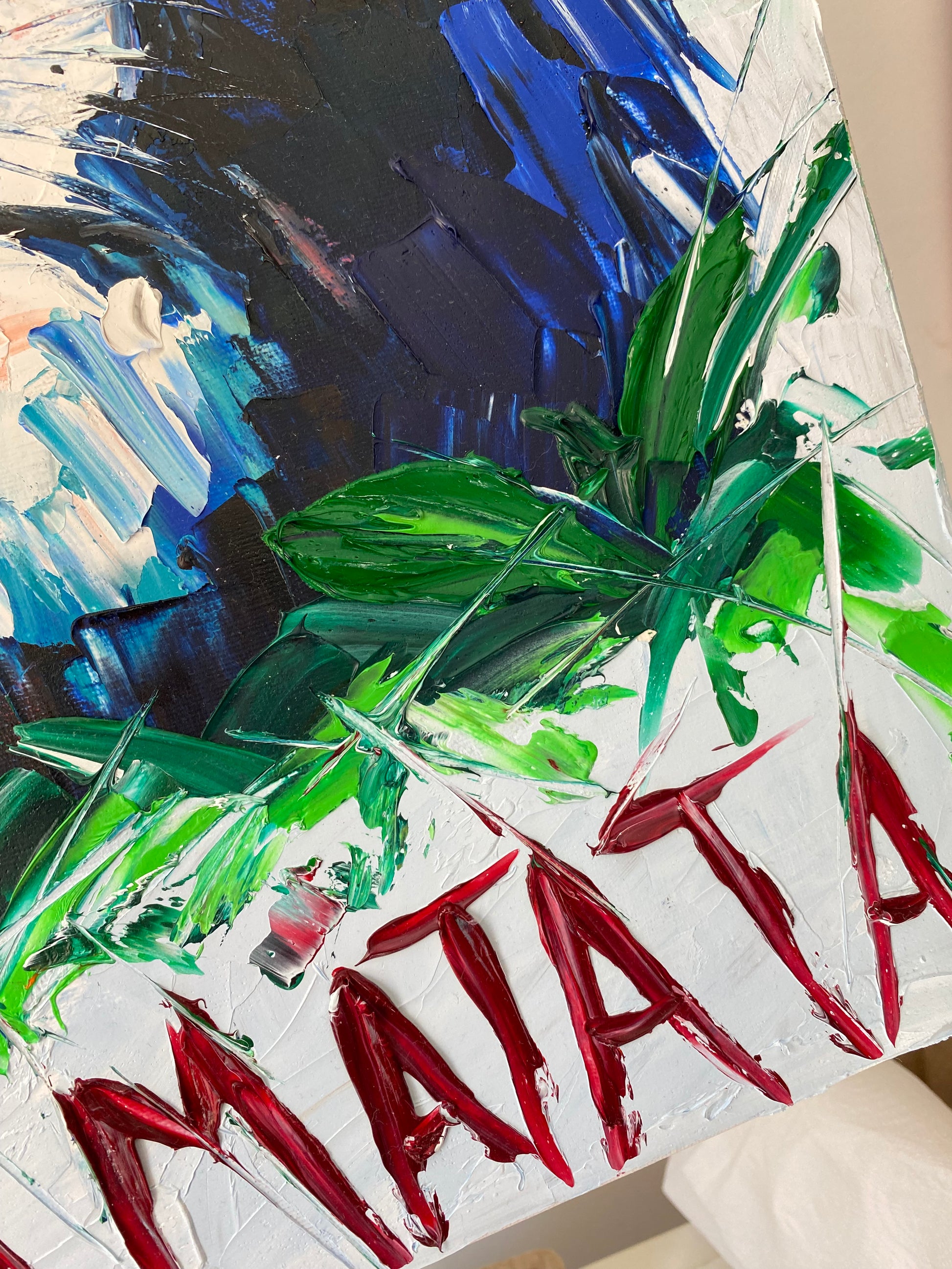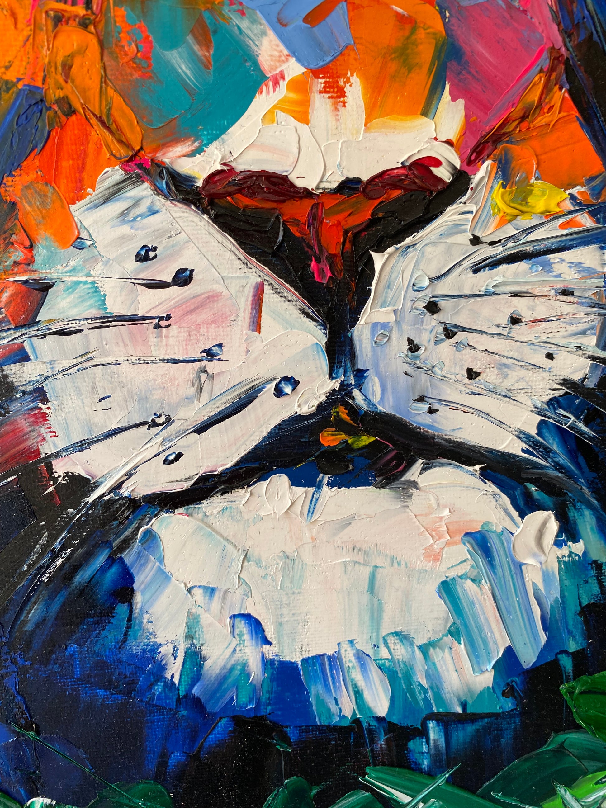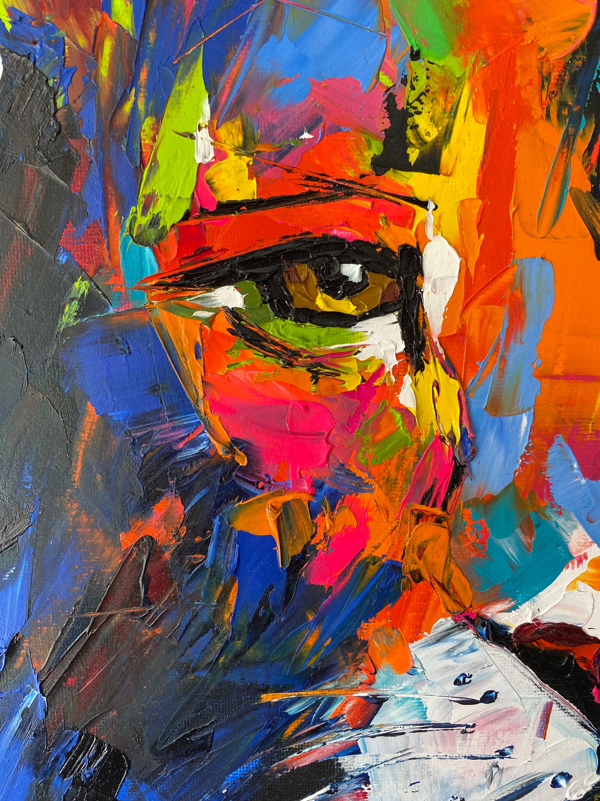 This striking oil painting features a majestic lion brought to life through a bold palette knife technique and a kaleidoscope of vibrant colors. The intense gaze, paired with expressive strokes, radiates strength, serenity, and wild beauty. The phrase Hakuna Matata carved into the composition adds a playful, carefree spirit — reminding us to embrace life with courage and joy. Painted in oil on canvas.