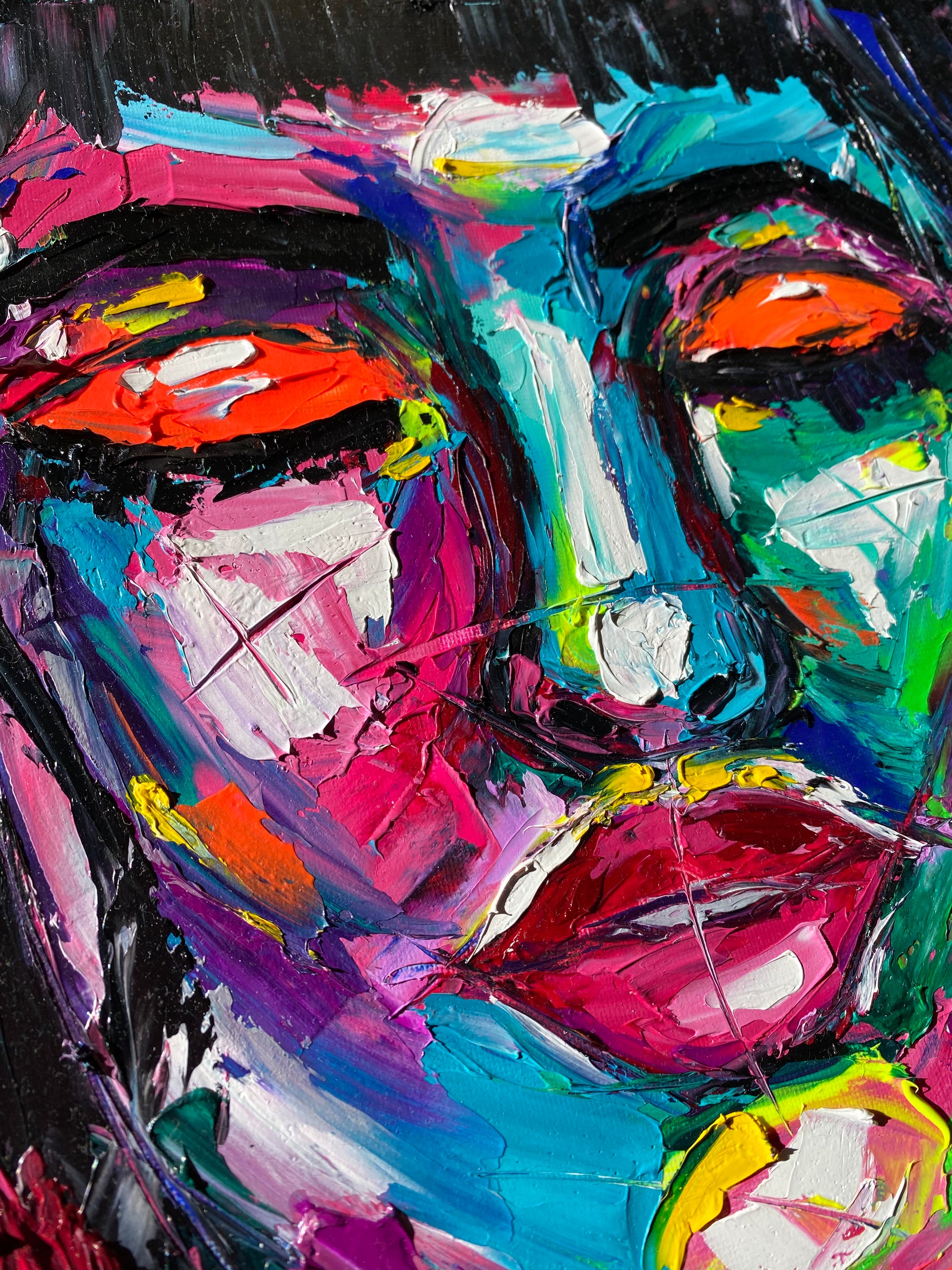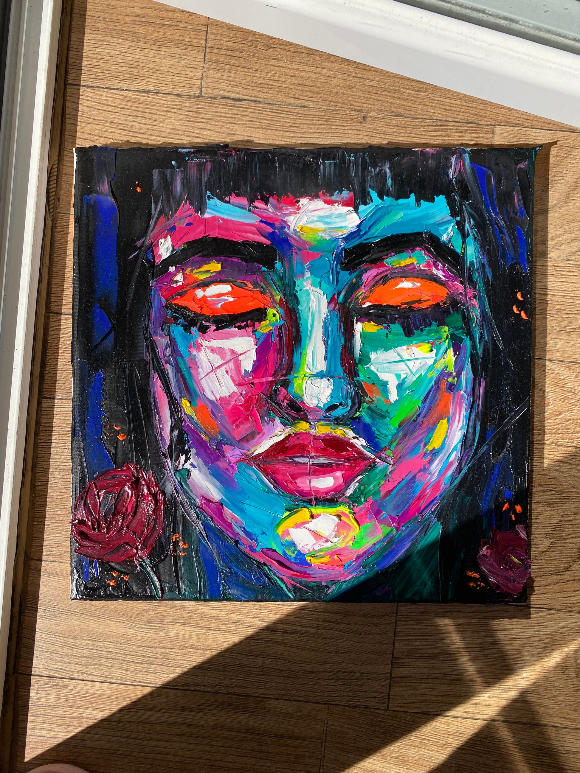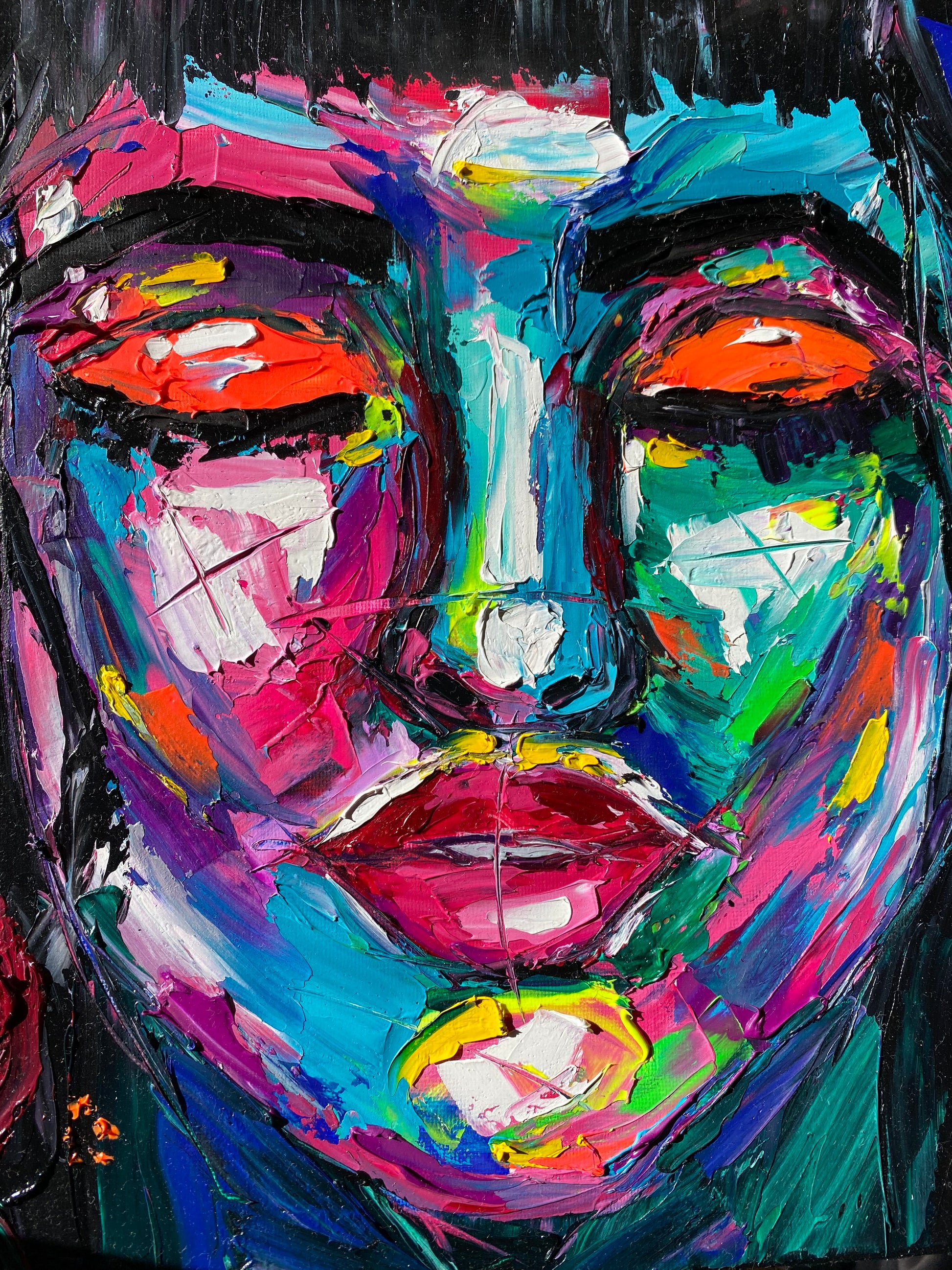 Intimate and evocative, this oil on canvas captures the haunting power of memory and presence. With eyes closed, the face radiates in bold strokes of turquoise, magenta, crimson, and neon orange—colors that seem to pulse with hidden emotion. The surrounding roses add a quiet symbolism of love and longing, contrasting against the dark background. Painted with a palette knife, the textures bring intensity and vulnerability to the surface. A deeply emotional work that speaks of connection, absence, and the visions that linger when we shut the world out.