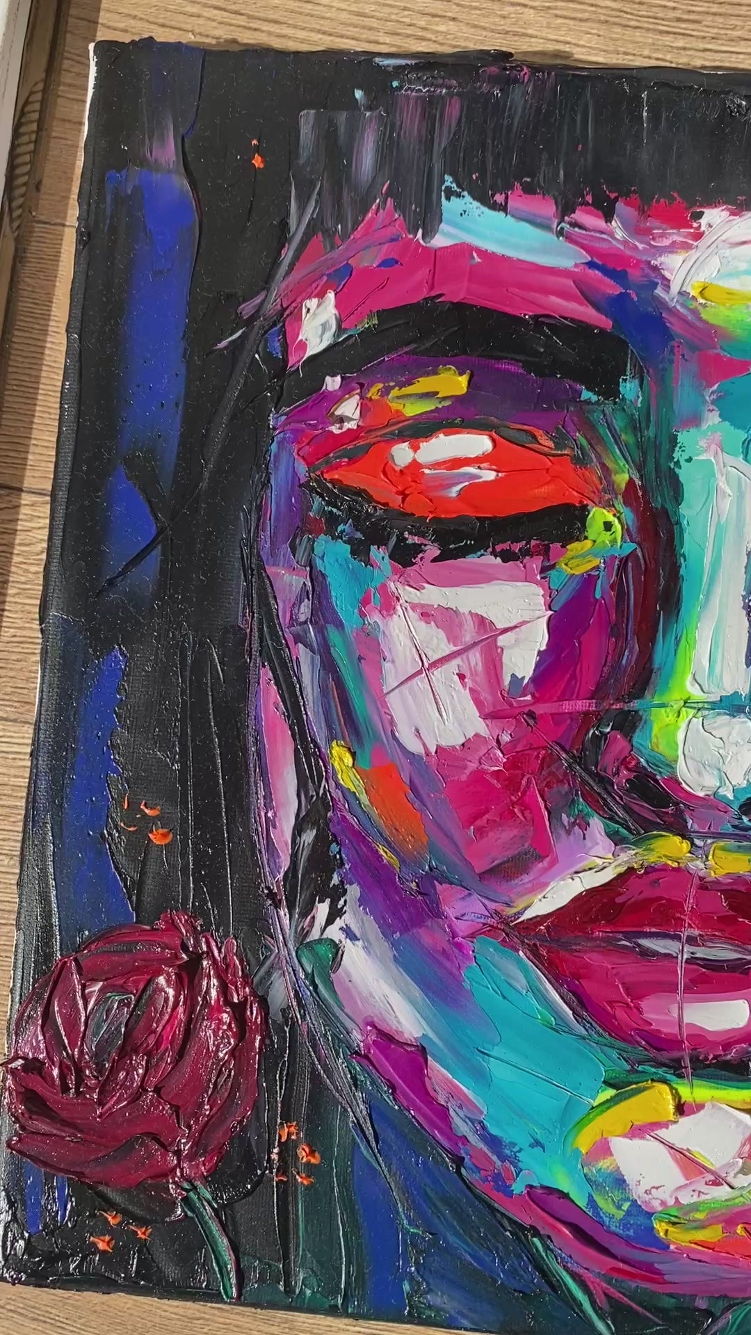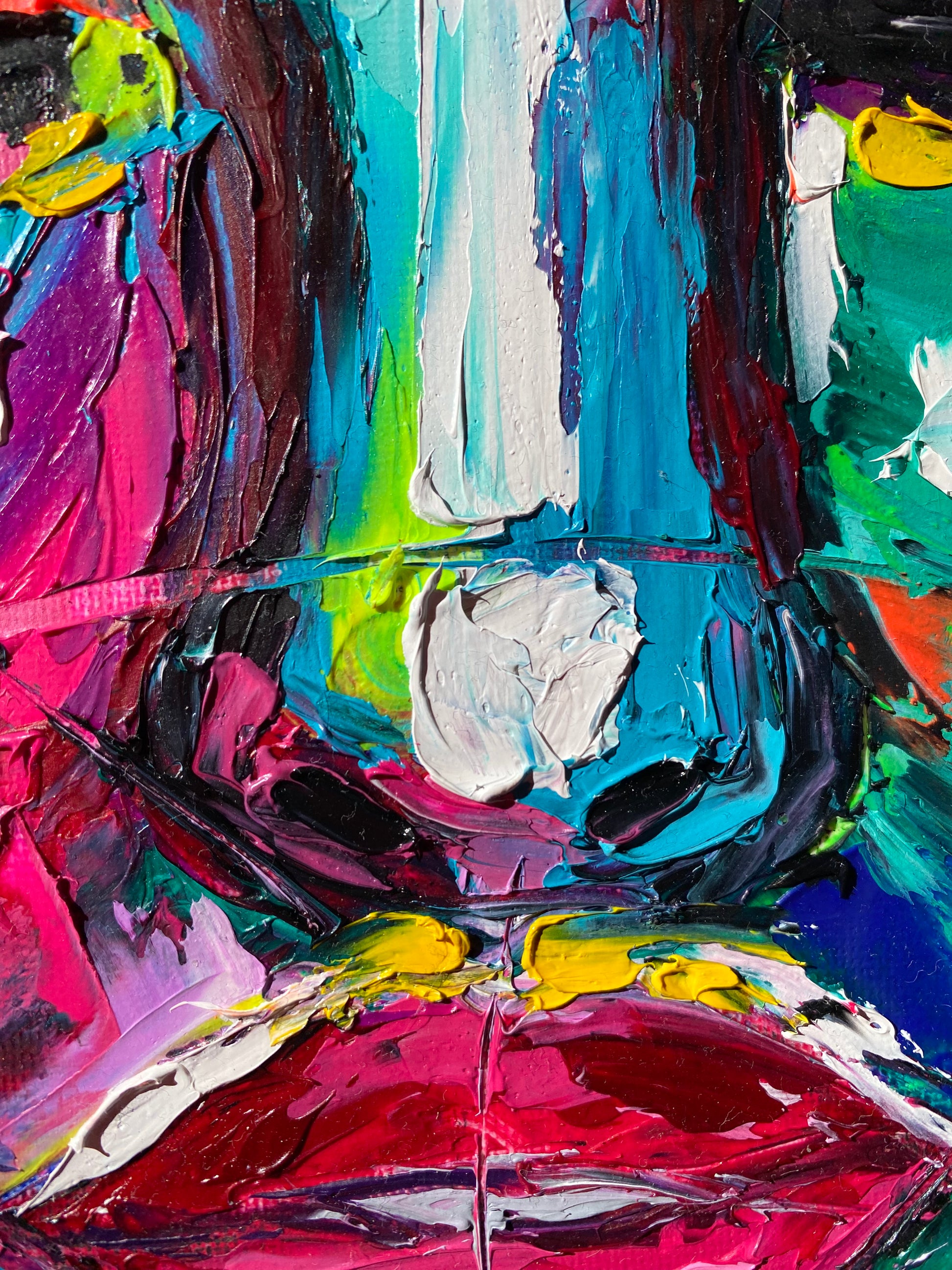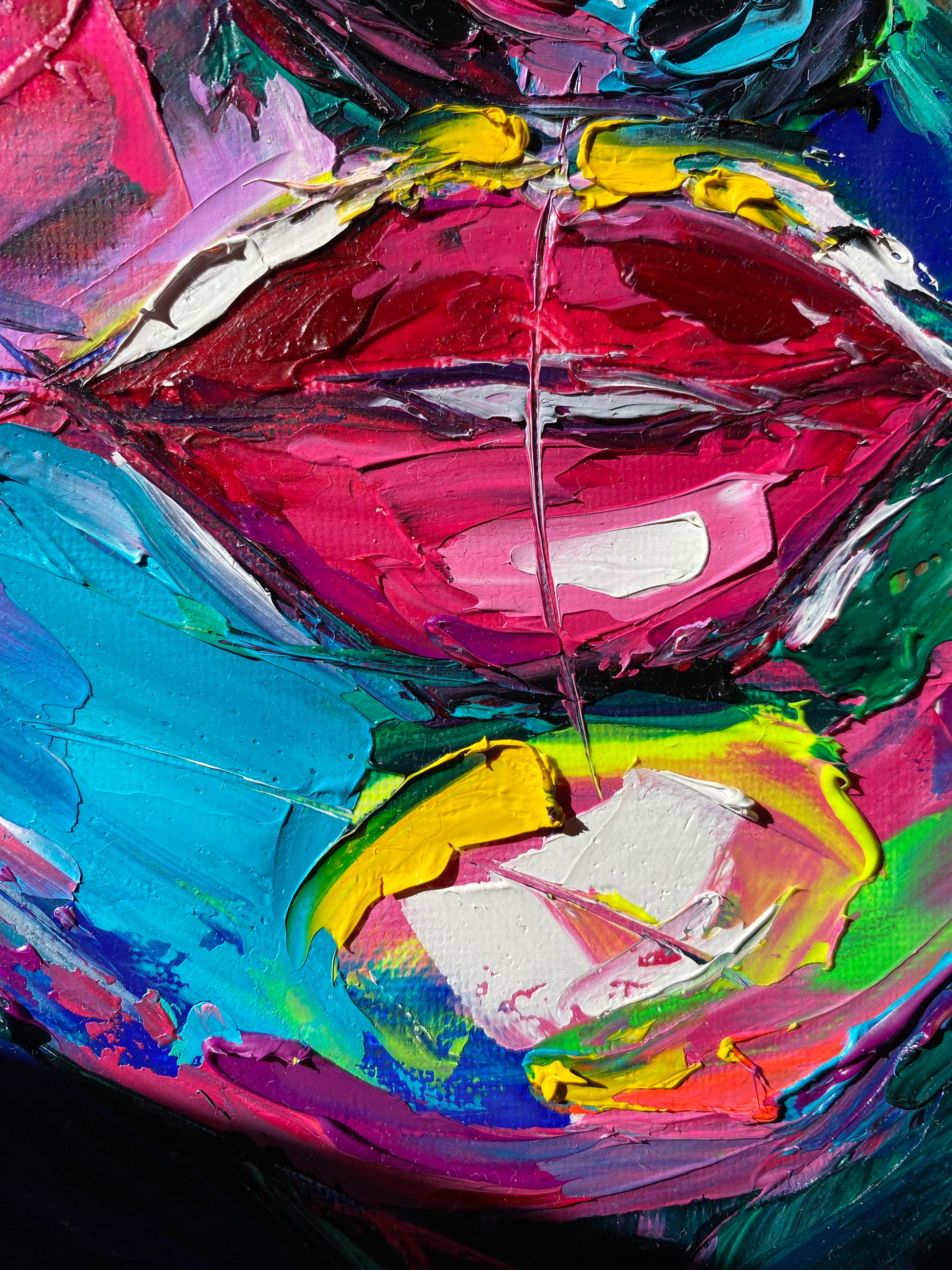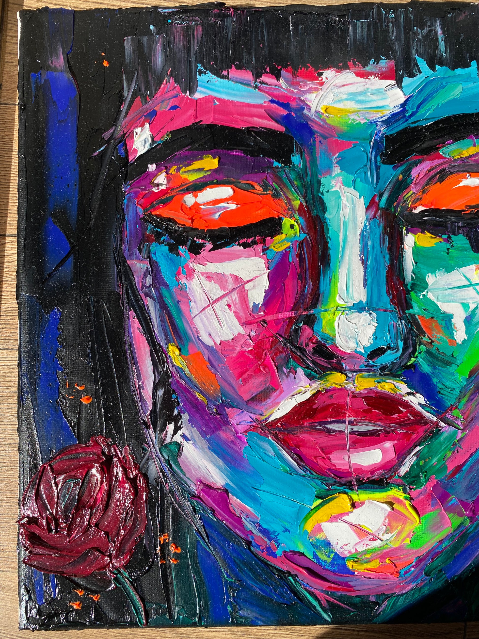 Intimate and evocative, this oil on canvas captures the haunting power of memory and presence. With eyes closed, the face radiates in bold strokes of turquoise, magenta, crimson, and neon orange—colors that seem to pulse with hidden emotion. The surrounding roses add a quiet symbolism of love and longing, contrasting against the dark background. Painted with a palette knife, the textures bring intensity and vulnerability to the surface. A deeply emotional work that speaks of connection, absence, and the visions that linger when we shut the world out.