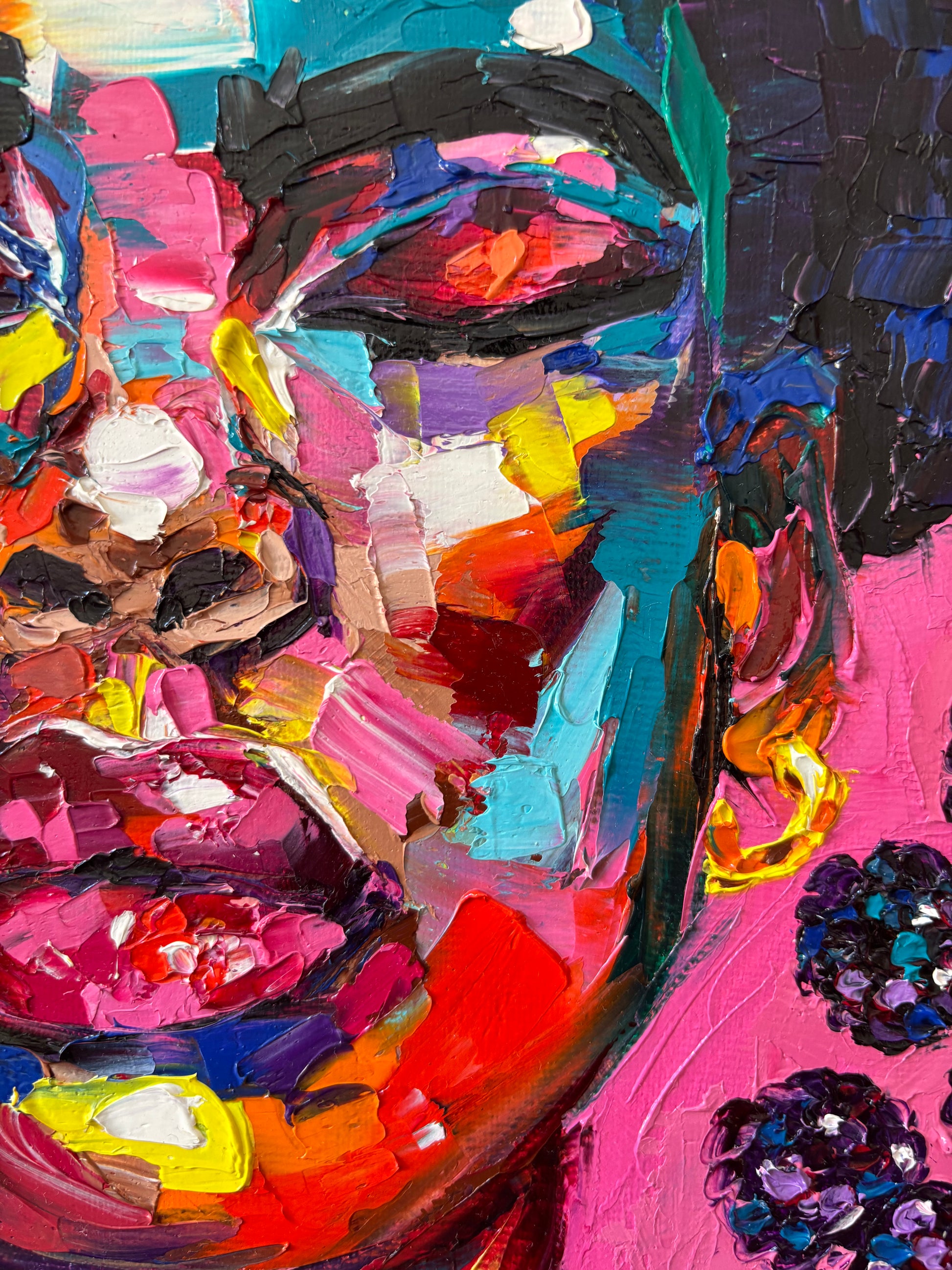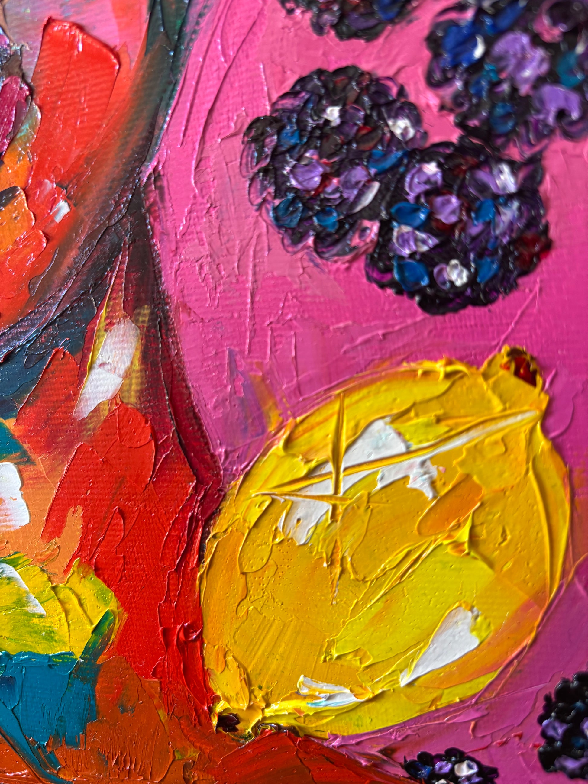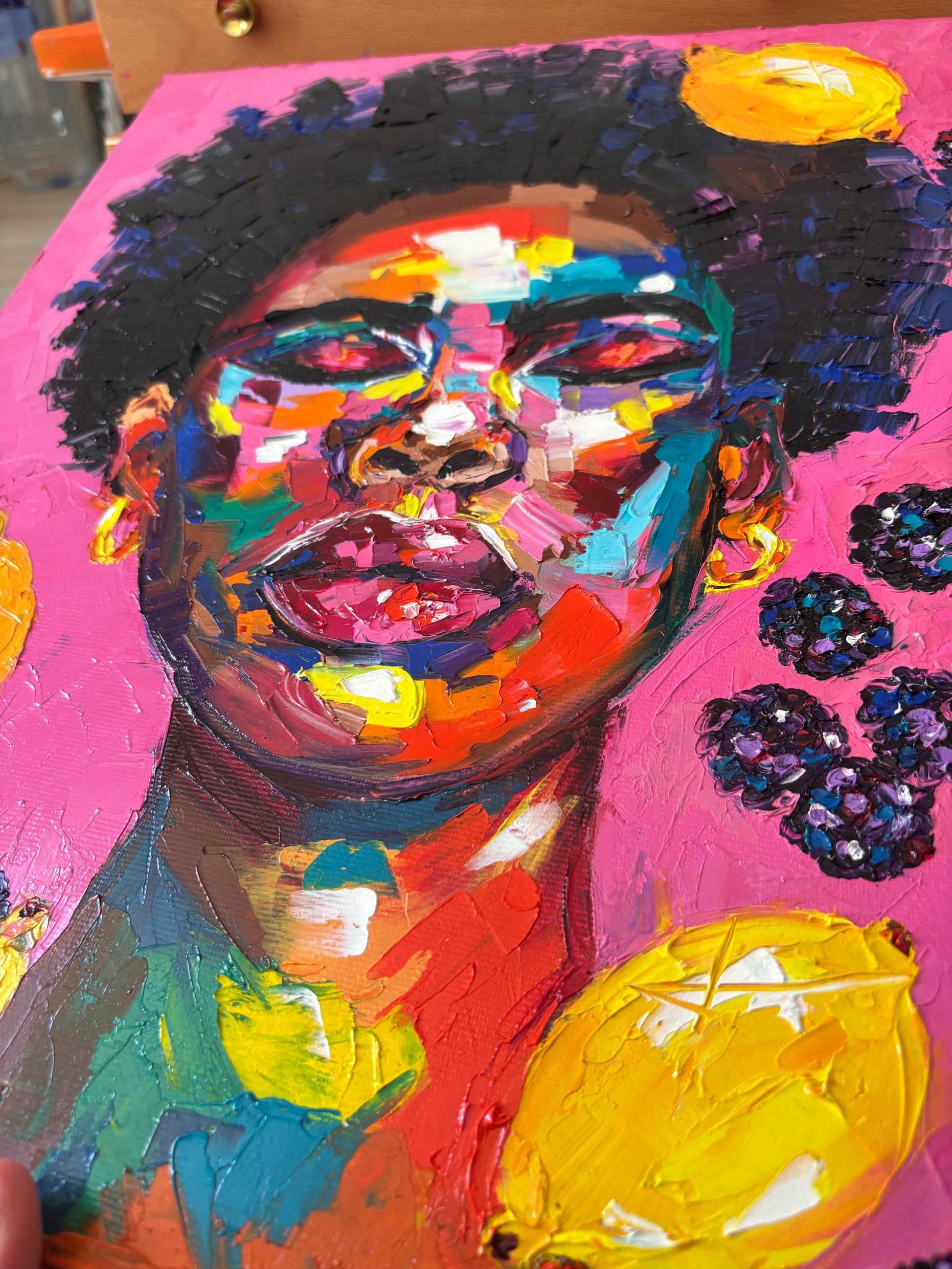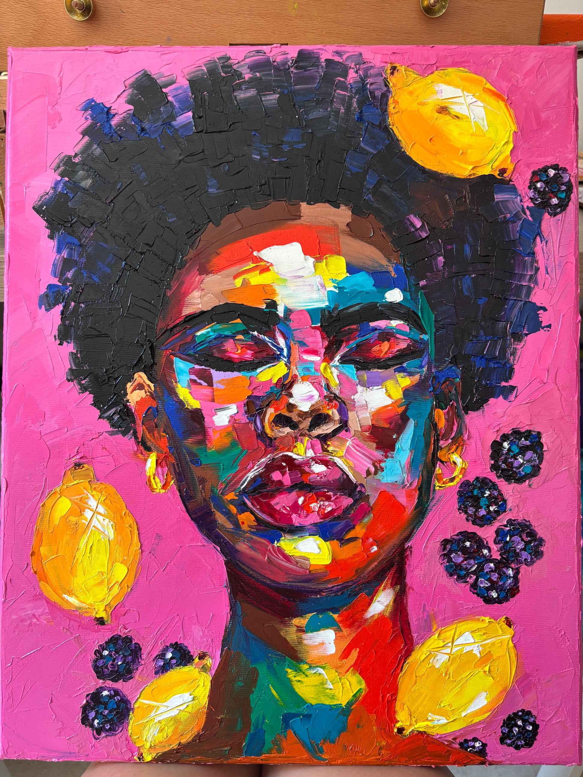 This vibrant portrait celebrates strength, individuality, and joyful resistance. Surrounded by lemons and blackberries, the figure symbolizes turning challenges into beauty — a bold expression of resilience, identity, and colorful self-expression.