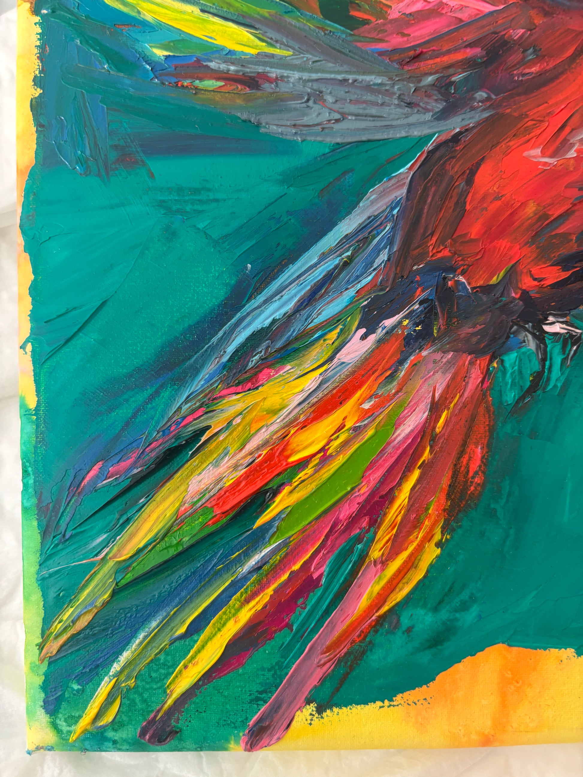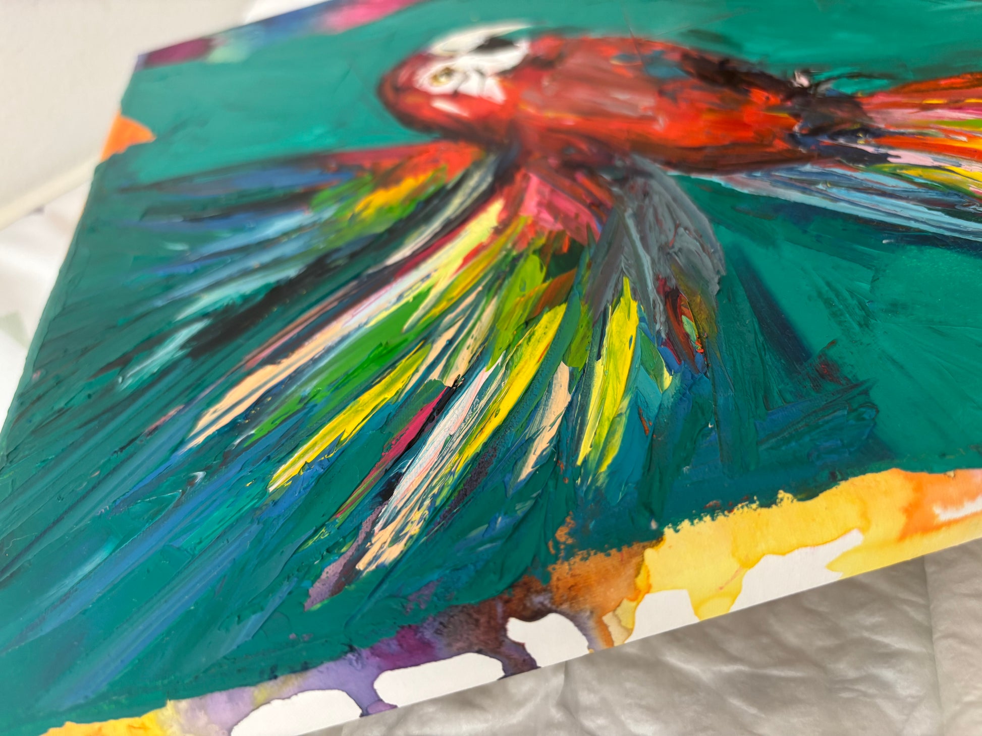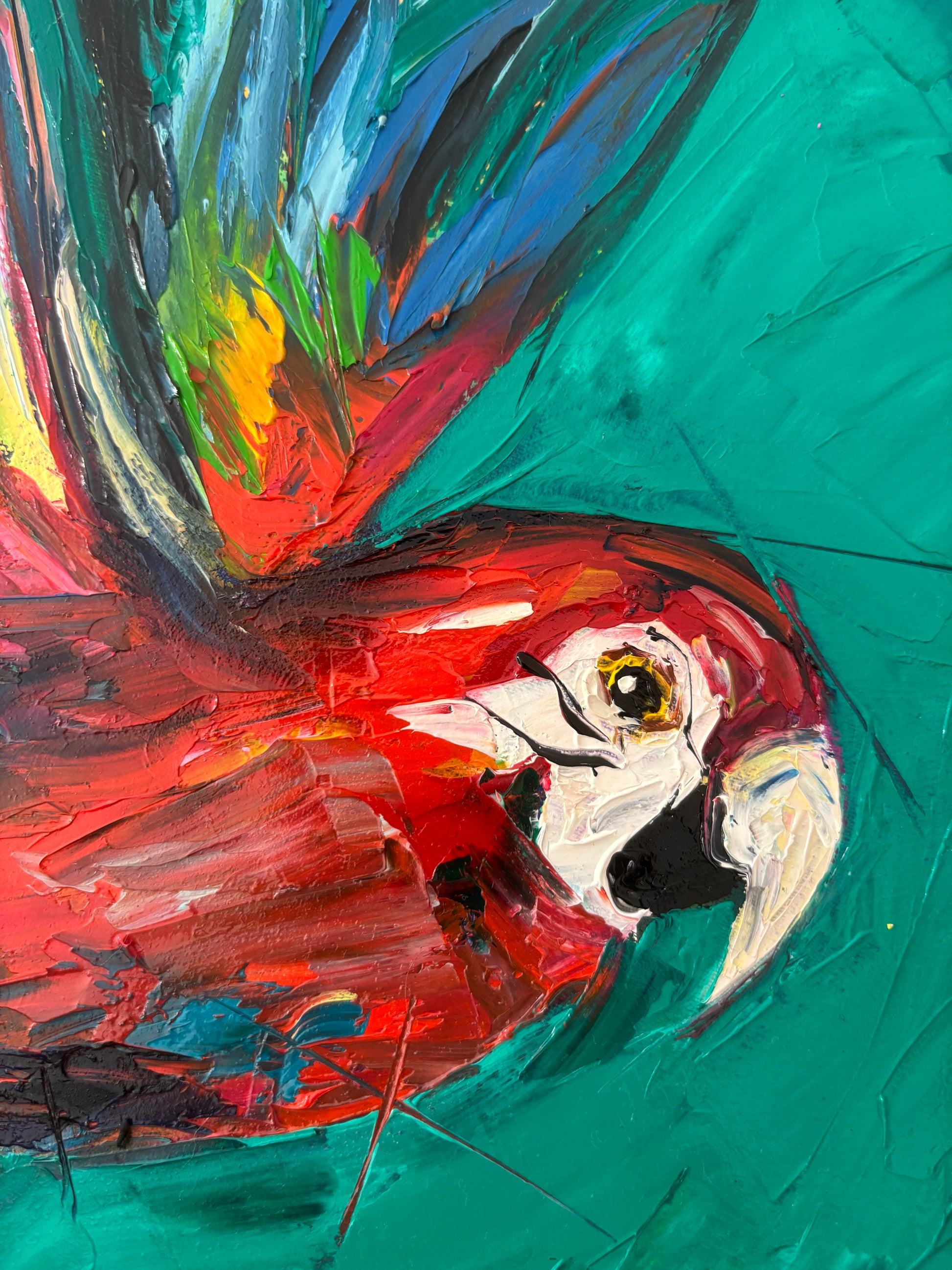 “Messenger of the Rainforest” is a vibrant oil painting created with bold palette knife strokes, capturing the untamed beauty of a scarlet macaw in flight. Bursting with reds, blues, yellows, and greens, the bird’s wings and tail radiate energy against a deep emerald background. Certain areas of the backdrop are painted in watercolor on canvas, adding a unique softness and fluid contrast to the heavy oil textures. This expressive piece embodies freedom, vitality, and the wild spirit of nature, making it a striking centerpiece for any art collection.