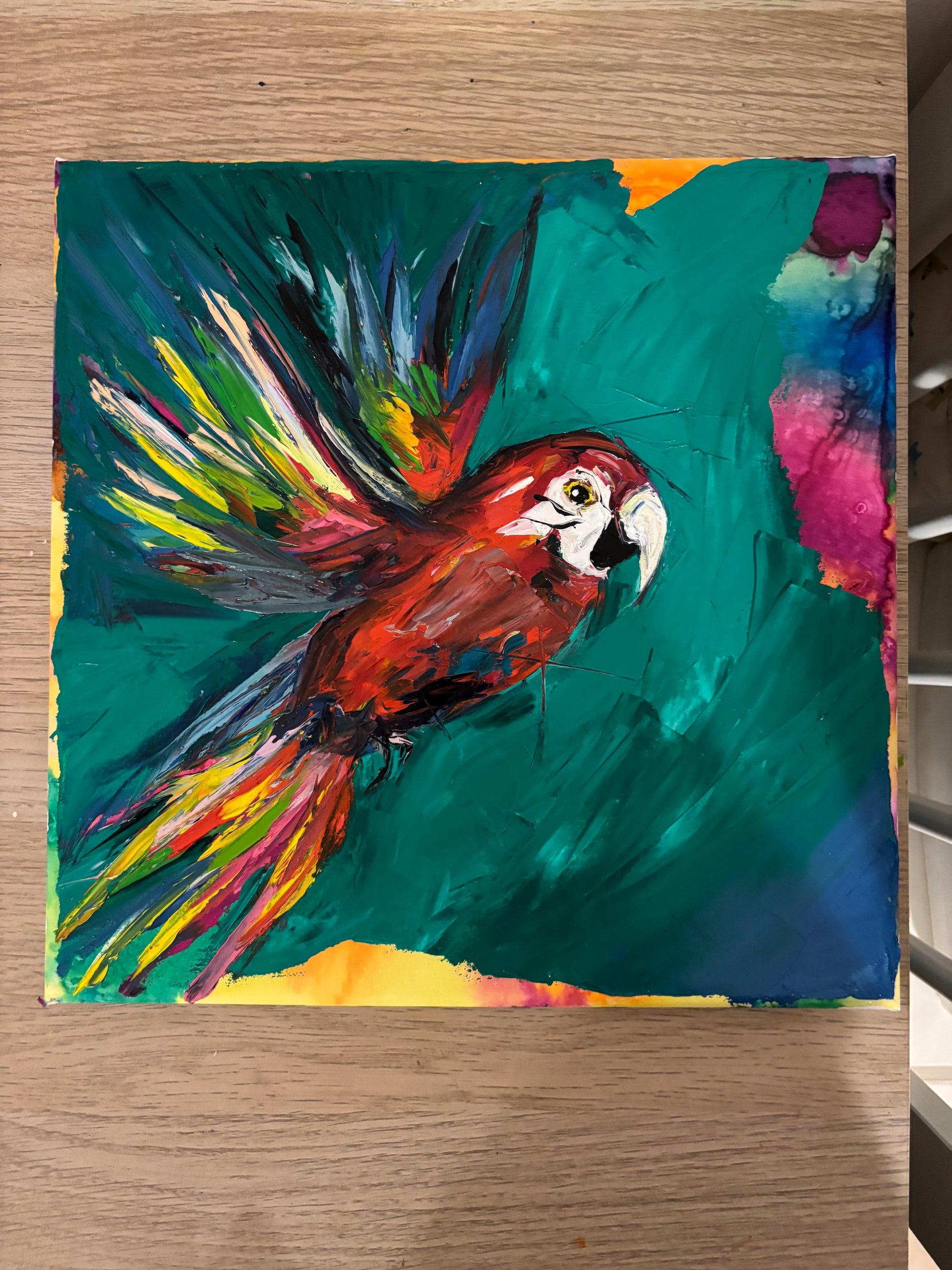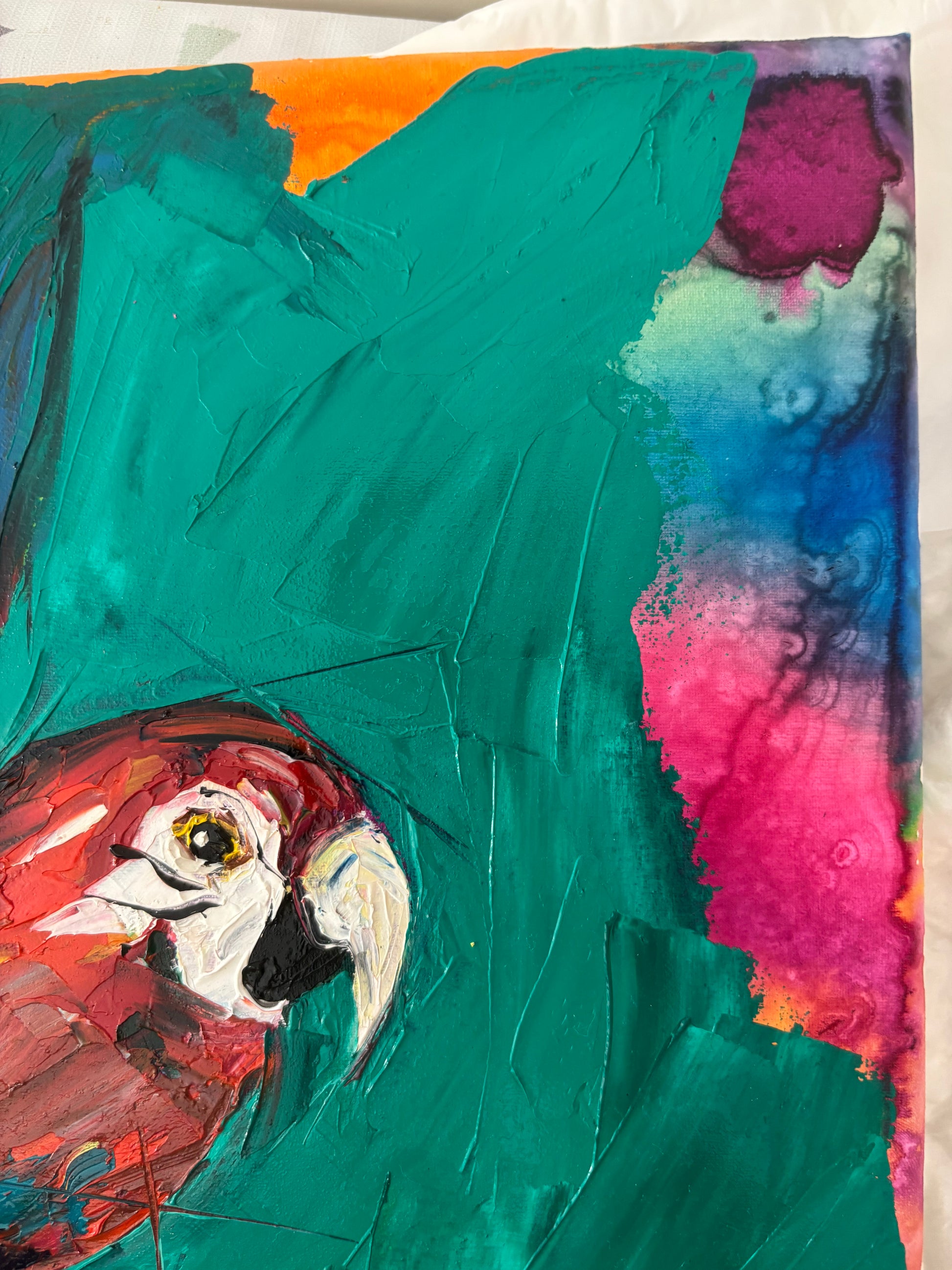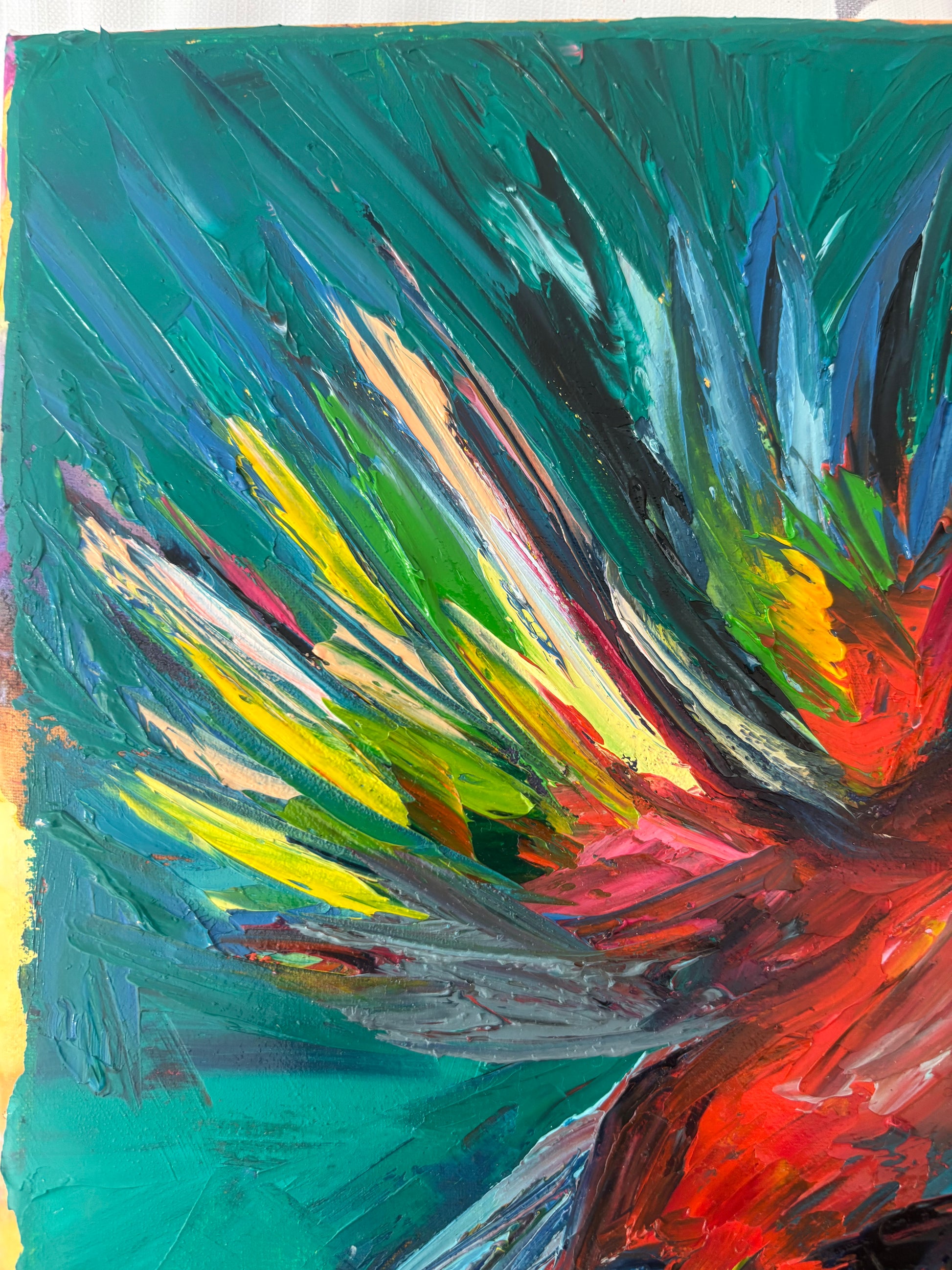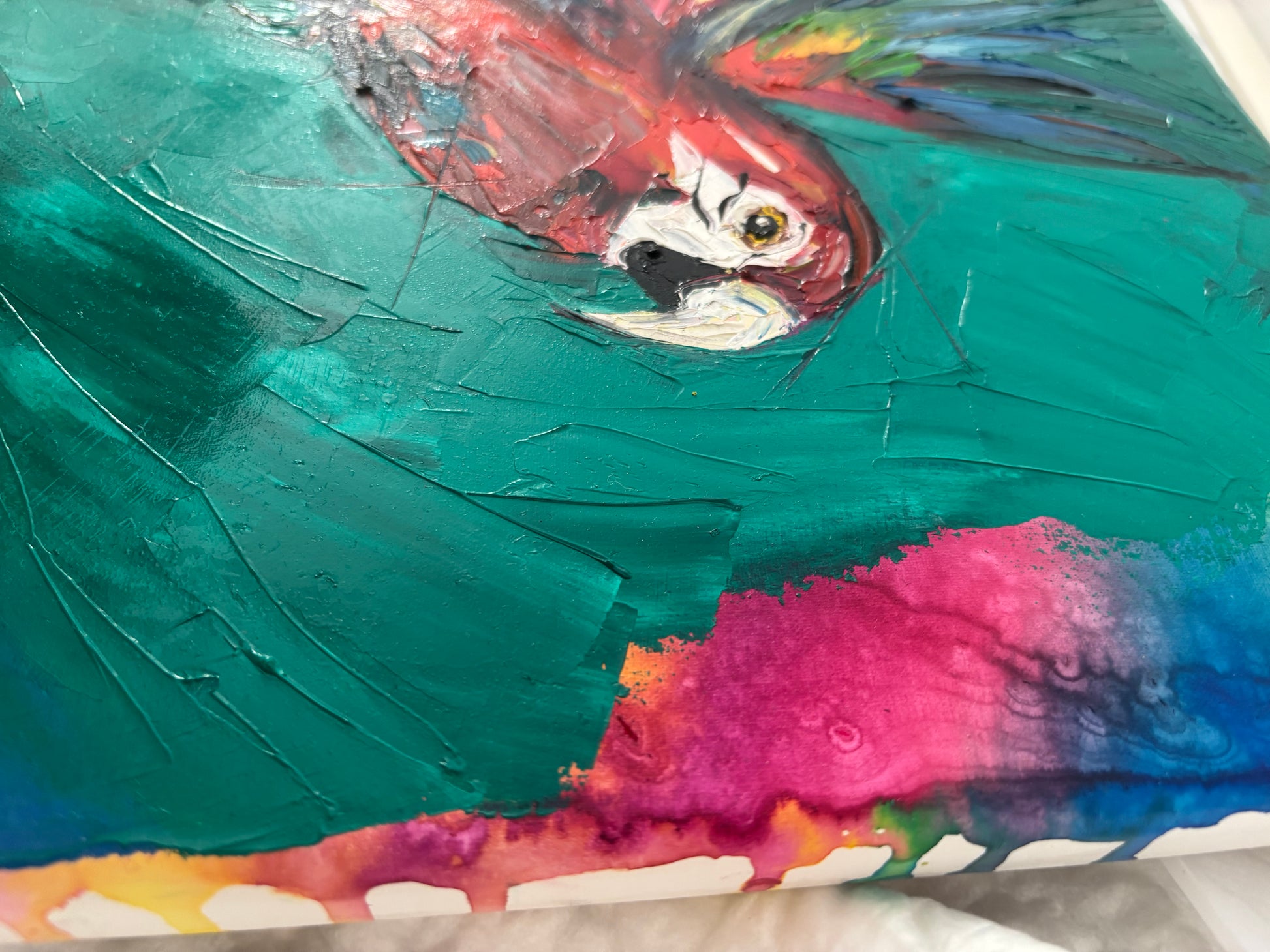 “Messenger of the Rainforest” is a vibrant oil painting created with bold palette knife strokes, capturing the untamed beauty of a scarlet macaw in flight. Bursting with reds, blues, yellows, and greens, the bird’s wings and tail radiate energy against a deep emerald background. Certain areas of the backdrop are painted in watercolor on canvas, adding a unique softness and fluid contrast to the heavy oil textures. This expressive piece embodies freedom, vitality, and the wild spirit of nature, making it a striking centerpiece for any art collection.