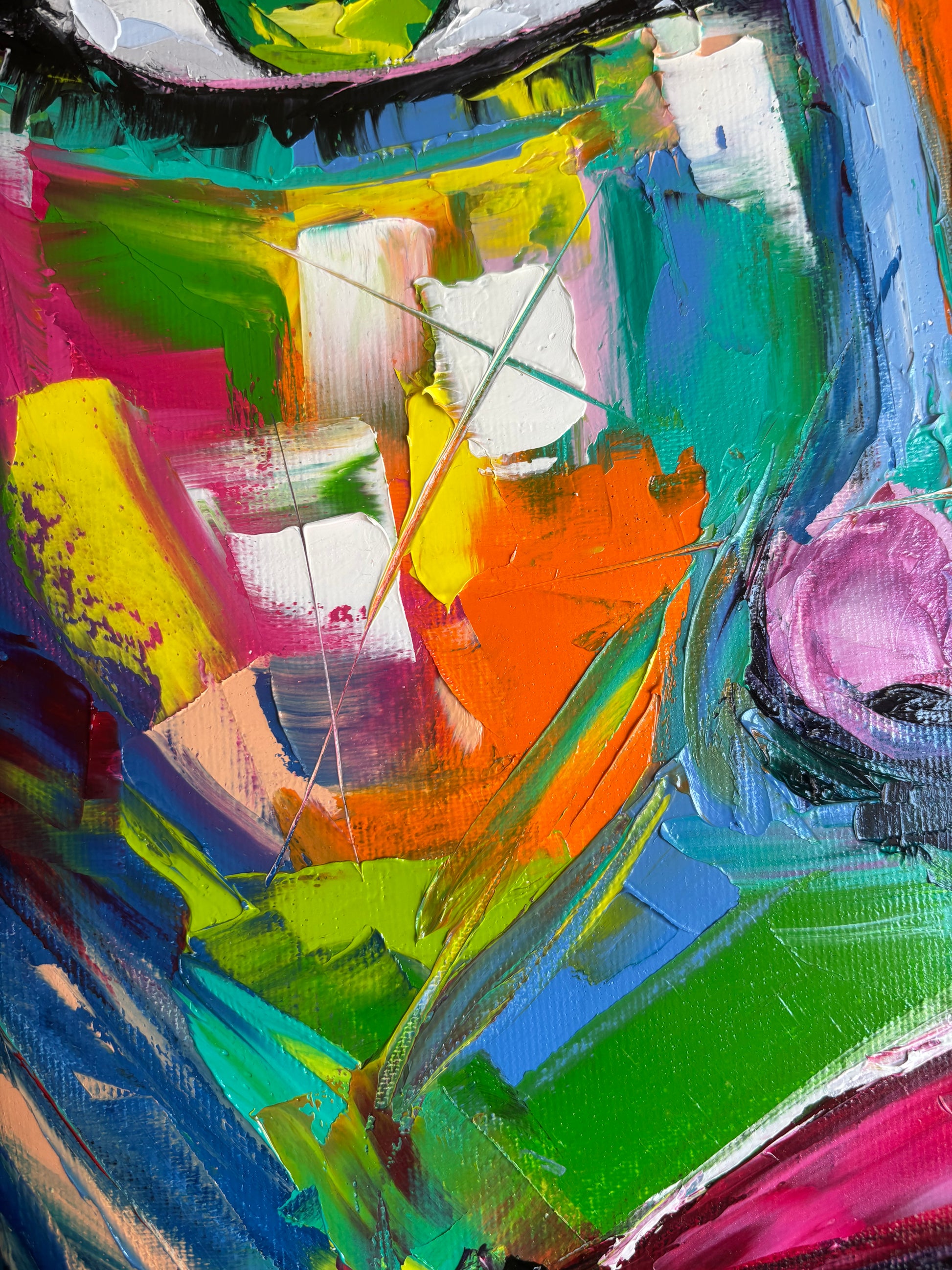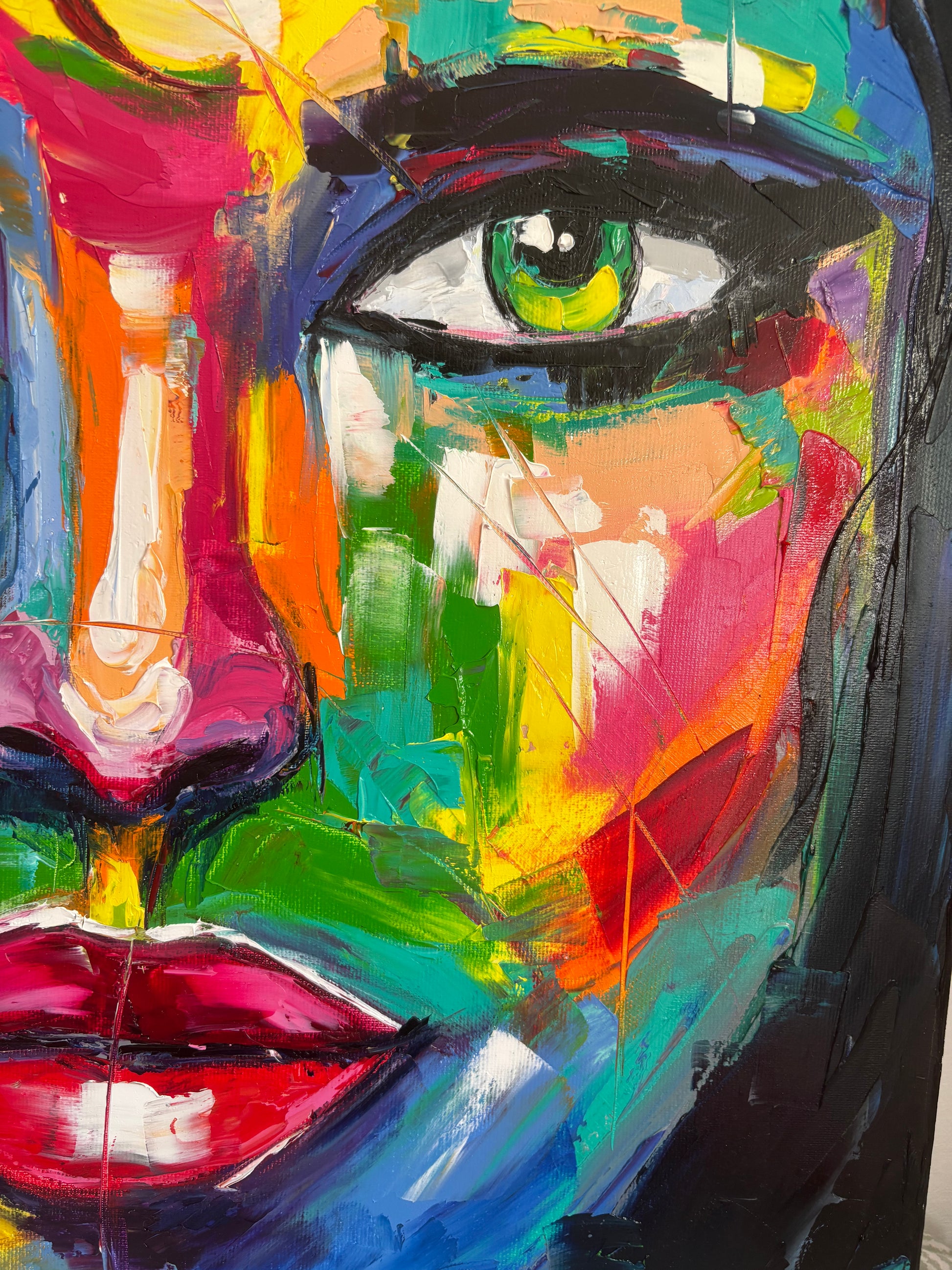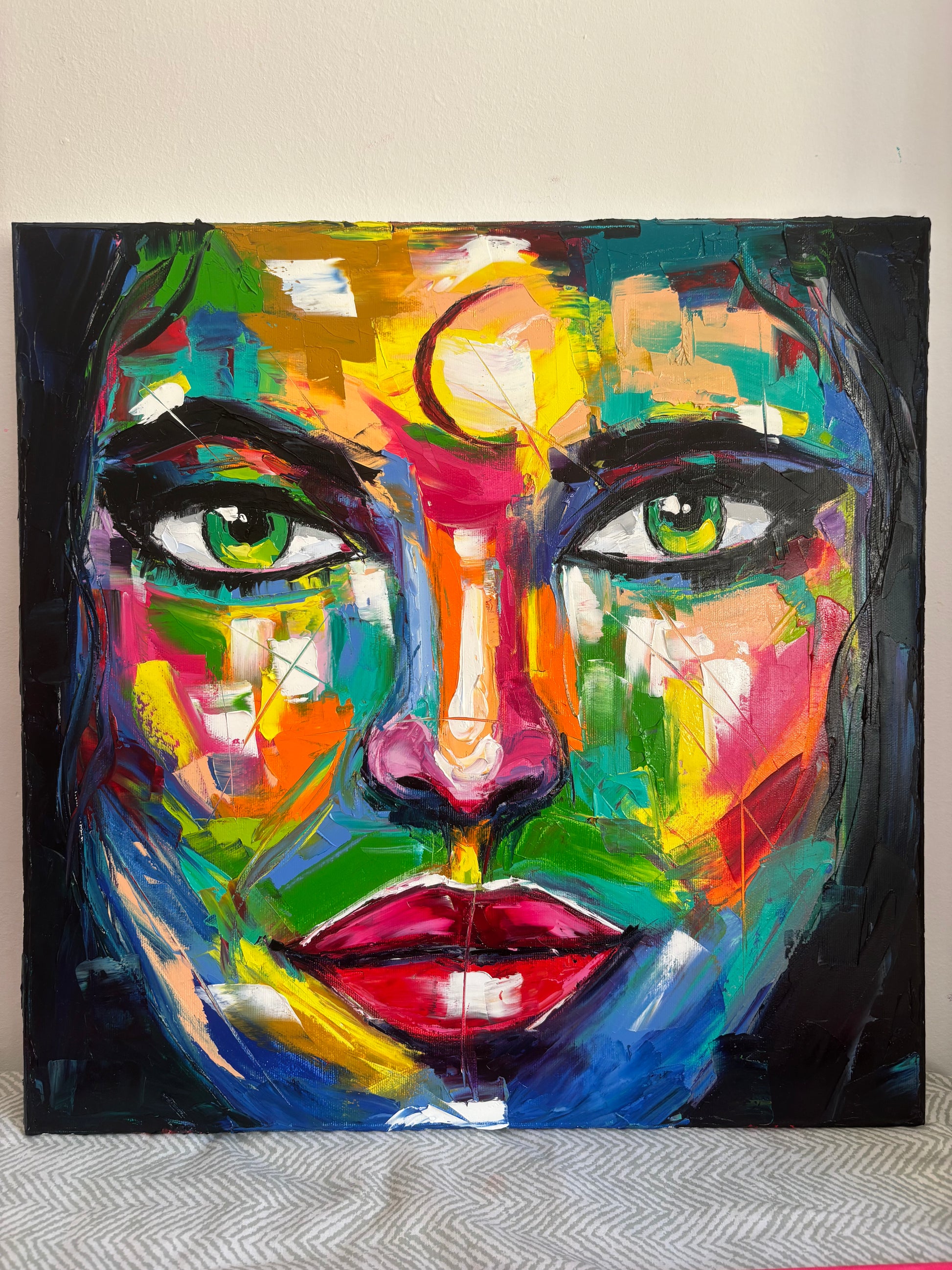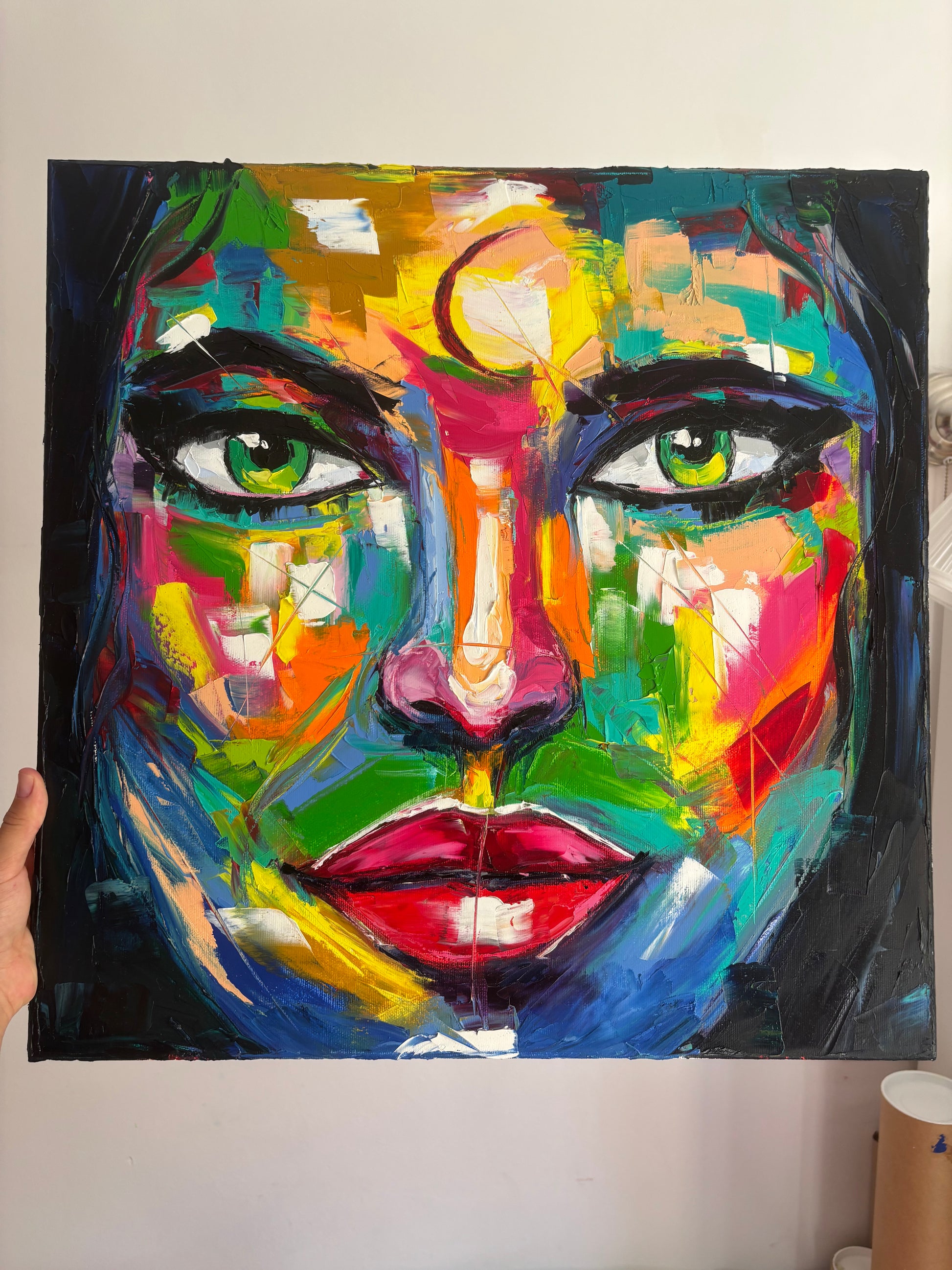 “Moonlit Skin” is an expressive oil painting brought to life with bold palette knife strokes and radiant colors. The intense green eyes and vivid red lips draw immediate attention, while a crescent moon glows on the forehead, symbolizing mystery, femininity, and inner strength. Layers of vibrant hues—turquoise, yellow, pink, green, and deep blue—merge into a textured mosaic that gives the portrait both depth and emotion. This striking artwork is a powerful statement piece, embodying beauty, resilience, and the luminous energy of the moon.