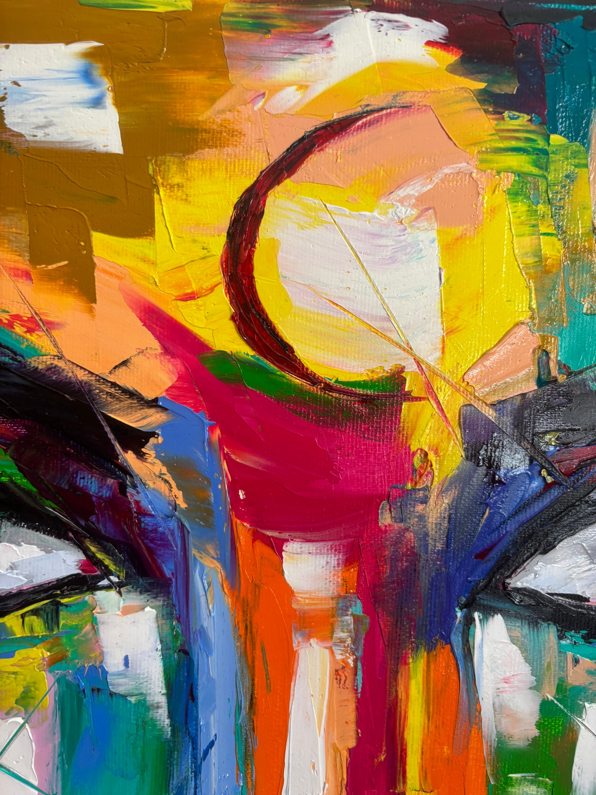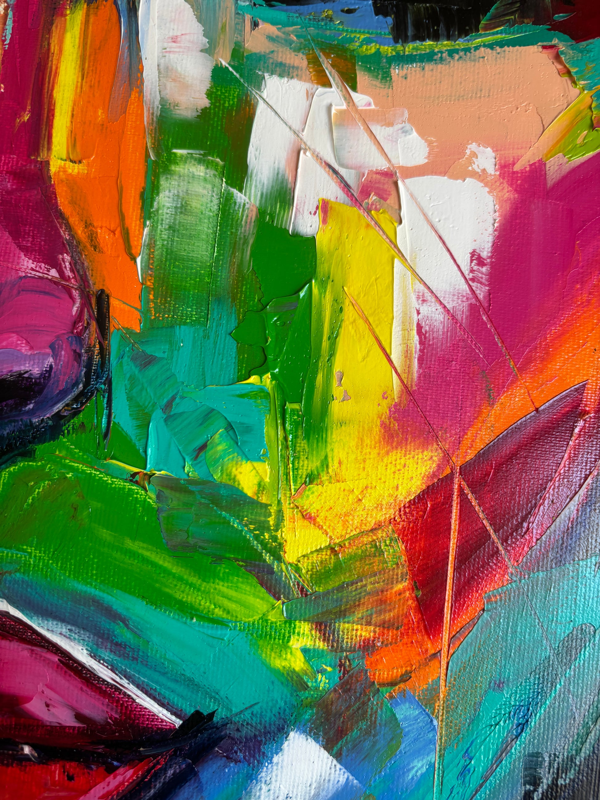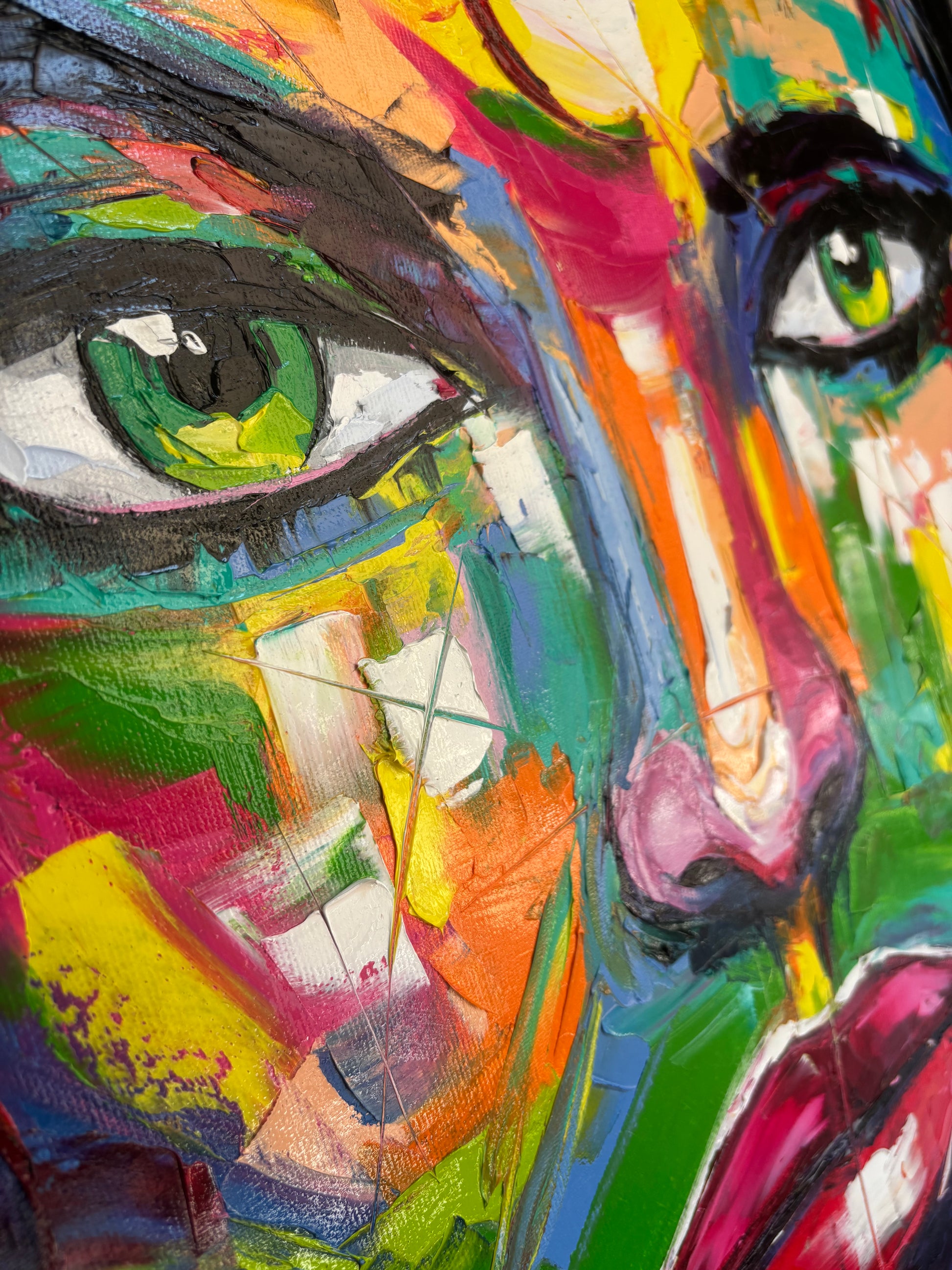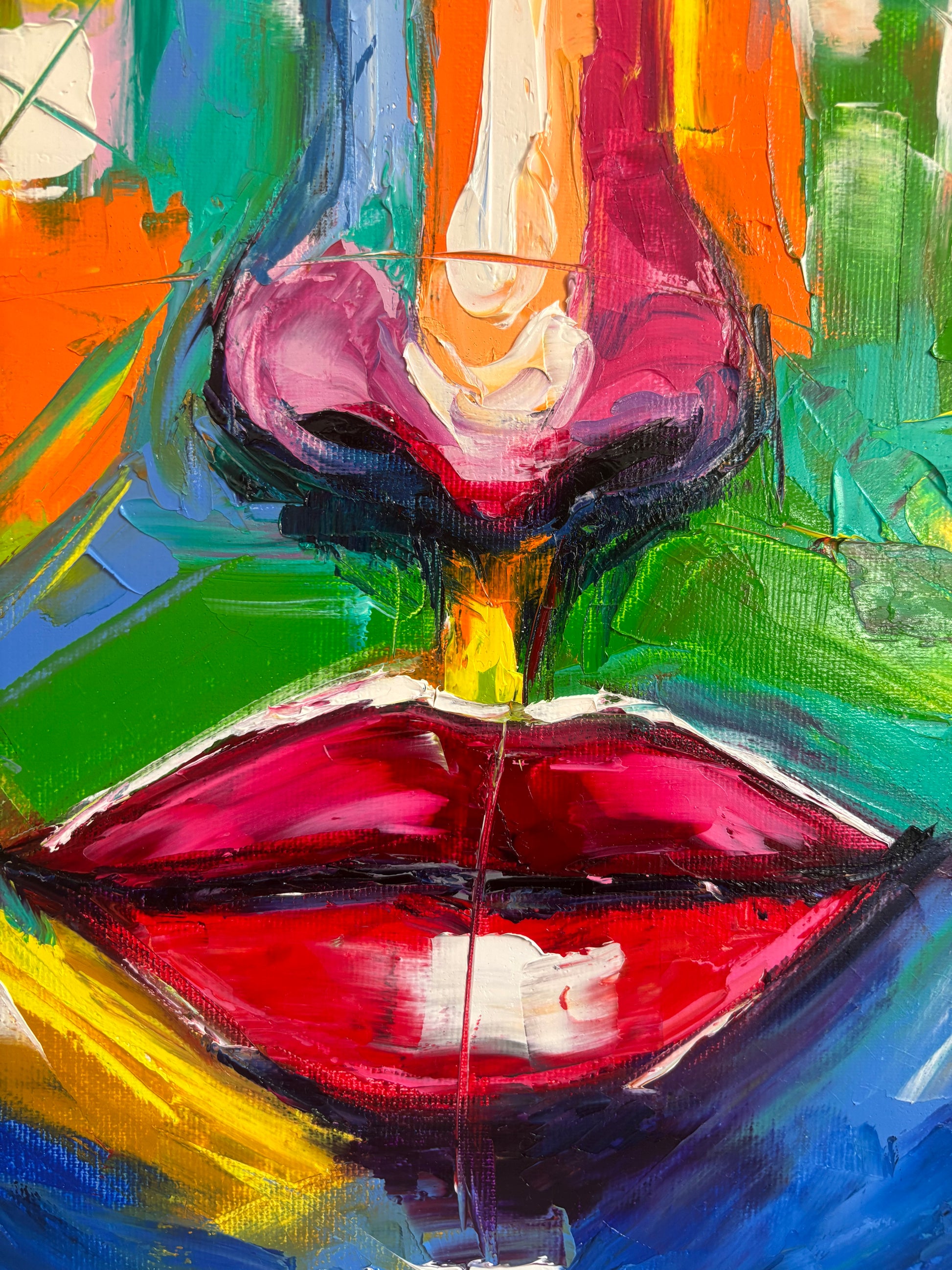 “Moonlit Skin” is an expressive oil painting brought to life with bold palette knife strokes and radiant colors. The intense green eyes and vivid red lips draw immediate attention, while a crescent moon glows on the forehead, symbolizing mystery, femininity, and inner strength. Layers of vibrant hues—turquoise, yellow, pink, green, and deep blue—merge into a textured mosaic that gives the portrait both depth and emotion. This striking artwork is a powerful statement piece, embodying beauty, resilience, and the luminous energy of the moon.