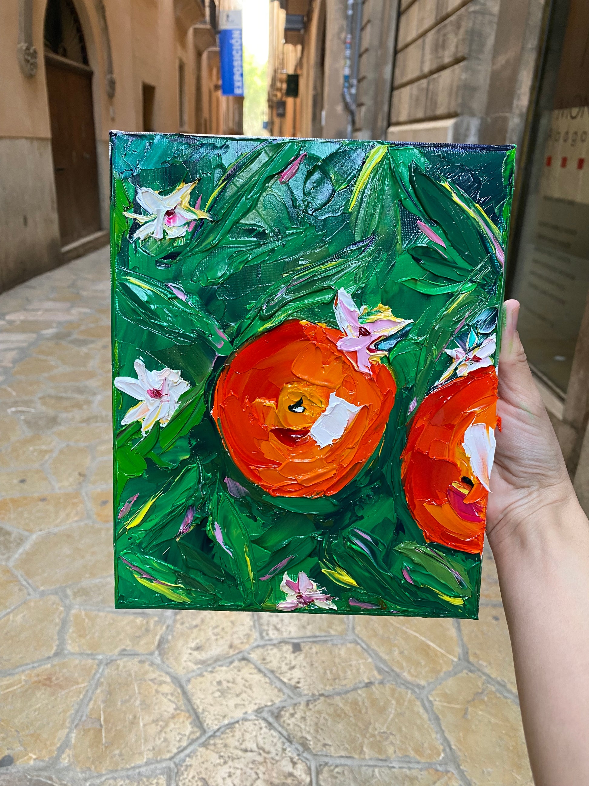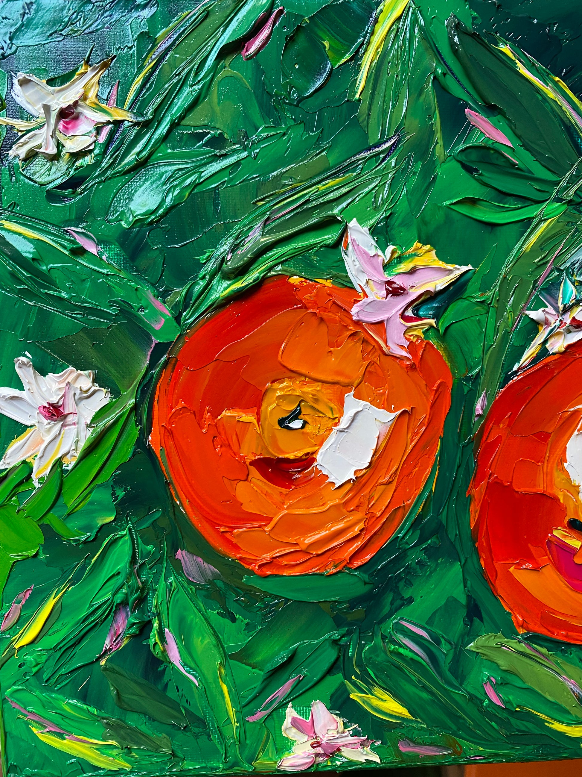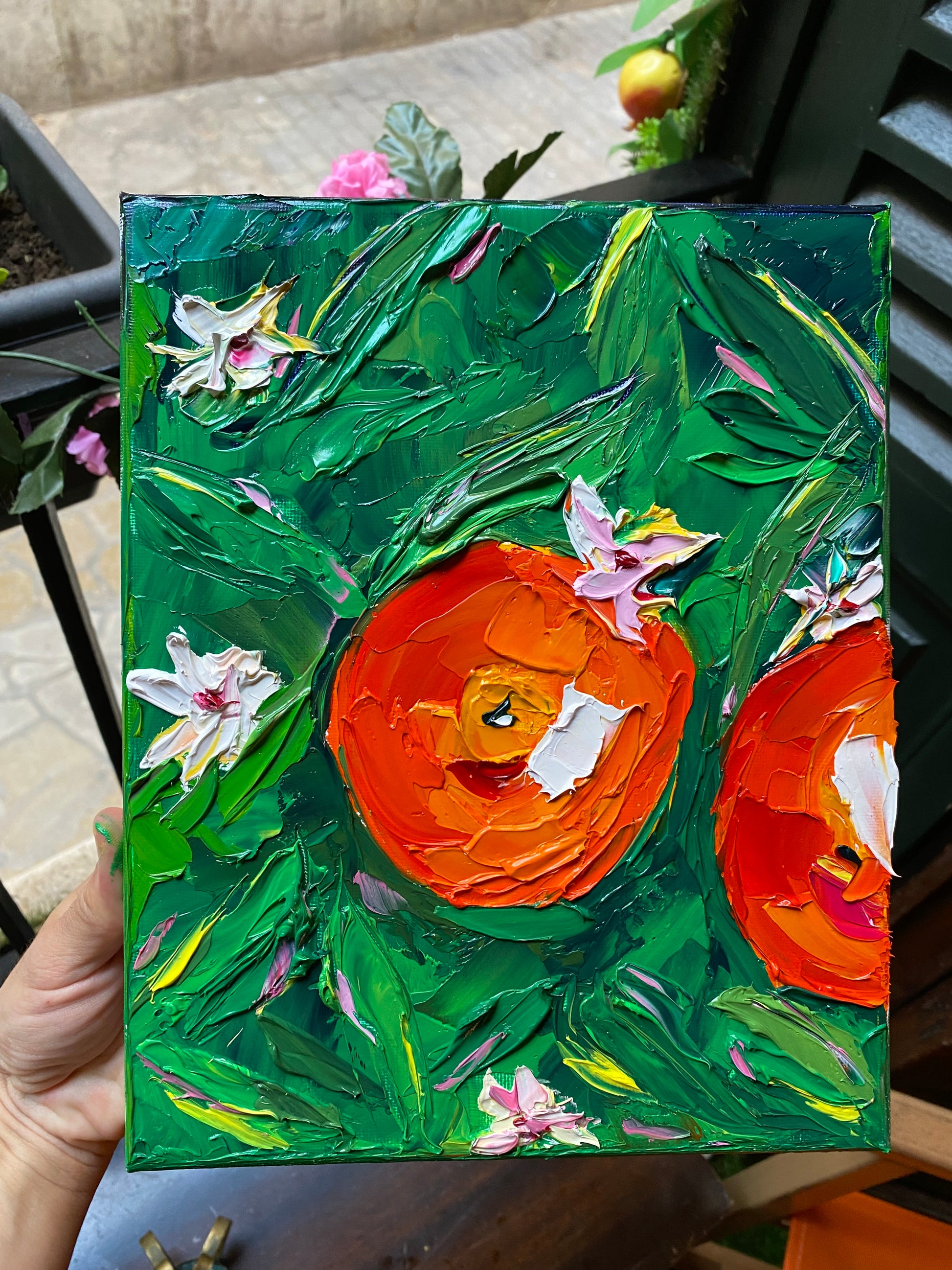 “My Happy Place” is a joyful still life created with oil on canvas using a palette knife. The vibrant oranges burst with life among lush green leaves, while delicate blossoms soften the scene with a poetic touch. Thick impasto strokes and bold colors evoke a sense of abundance and warmth, celebrating the simple pleasures of nature.