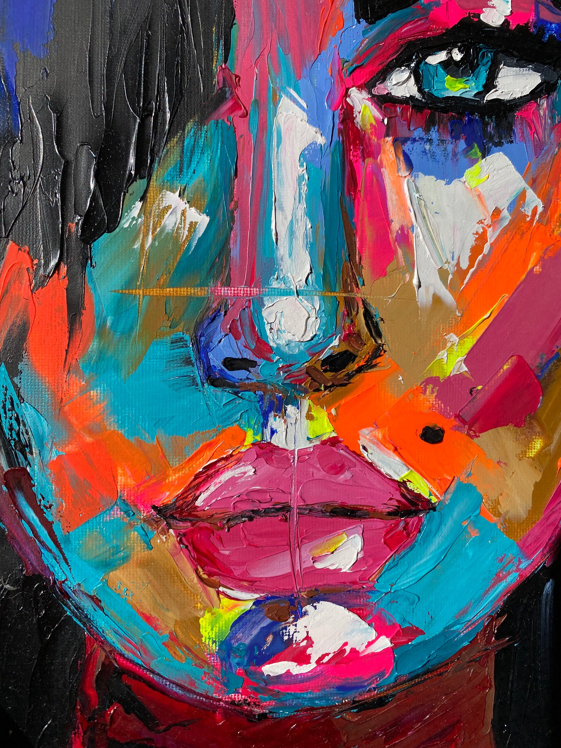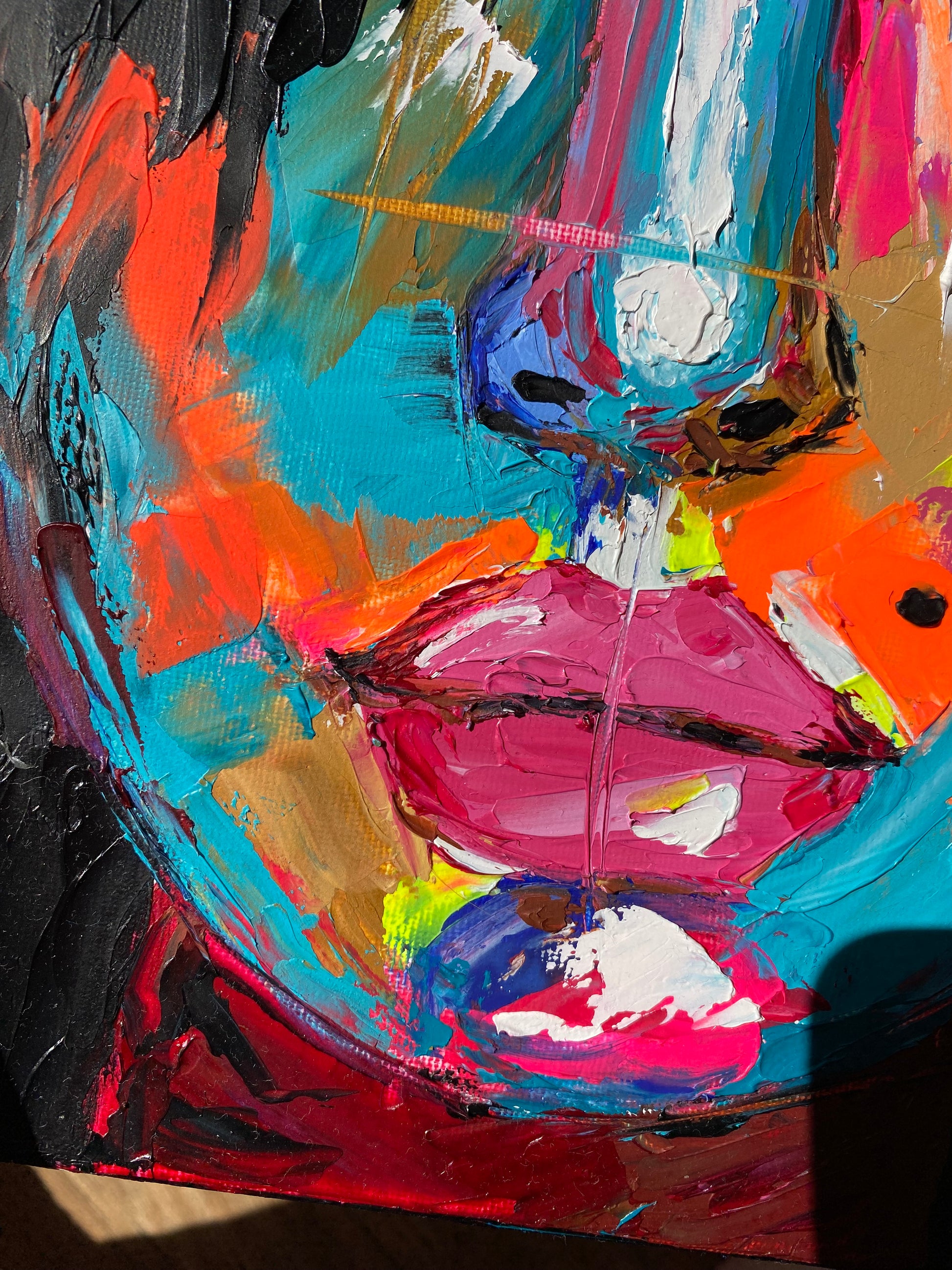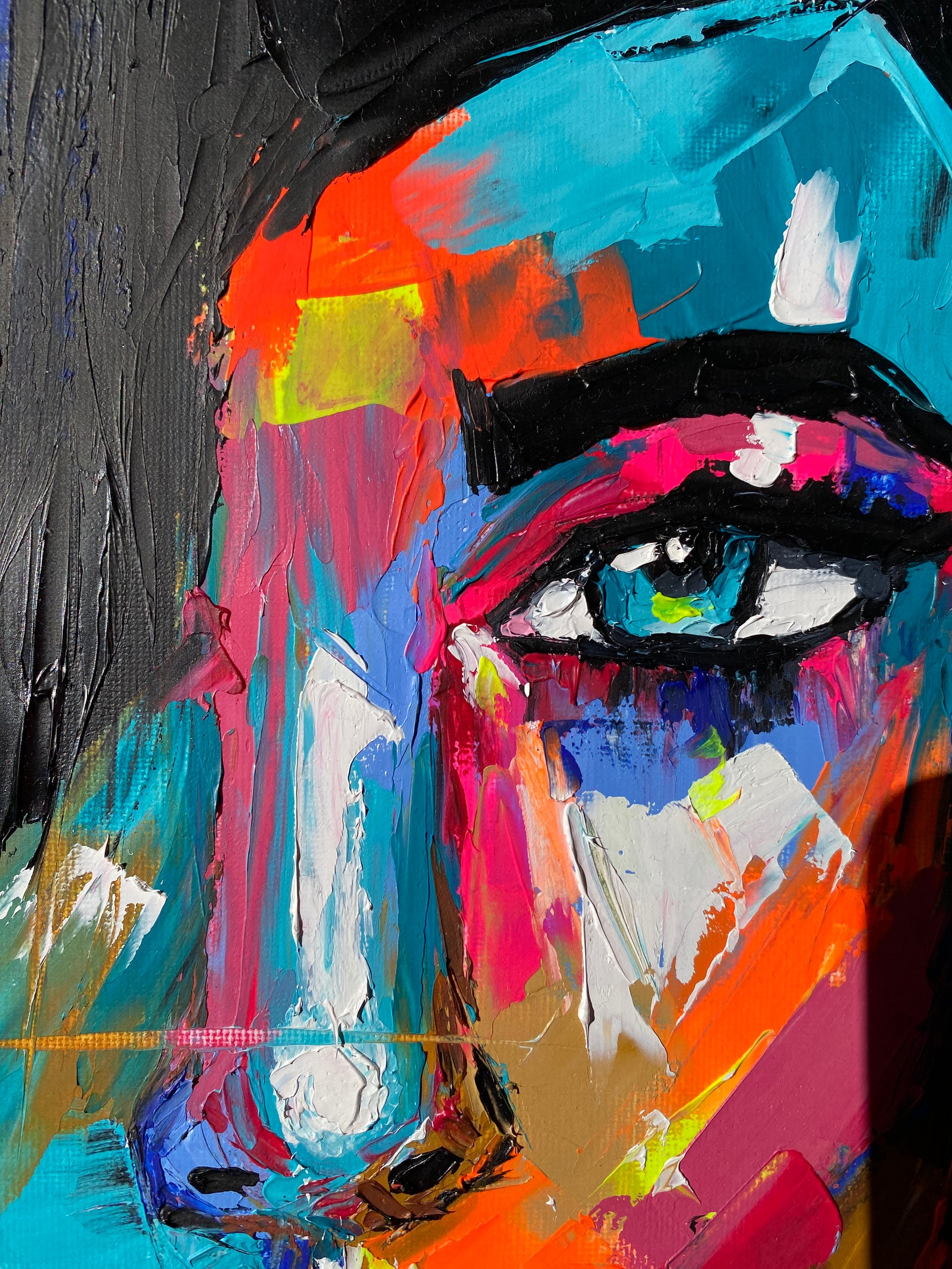 Half dream, half reality, Onyria captures the essence of a surreal gaze that lingers between worlds. Painted with a palette knife, the face emerges in radiant layers of turquoise, magenta, orange, and gold against a stark black background, where texture and color collide in vibrant tension. The piercing eye invites the viewer into a dreamlike state—intimate, mysterious, and powerful. A striking portrait that embodies both vulnerability and the transcendence of imagination.