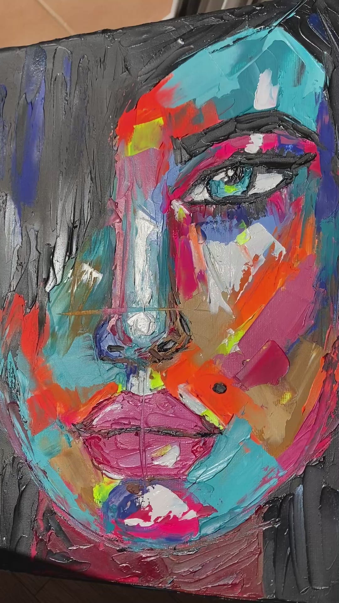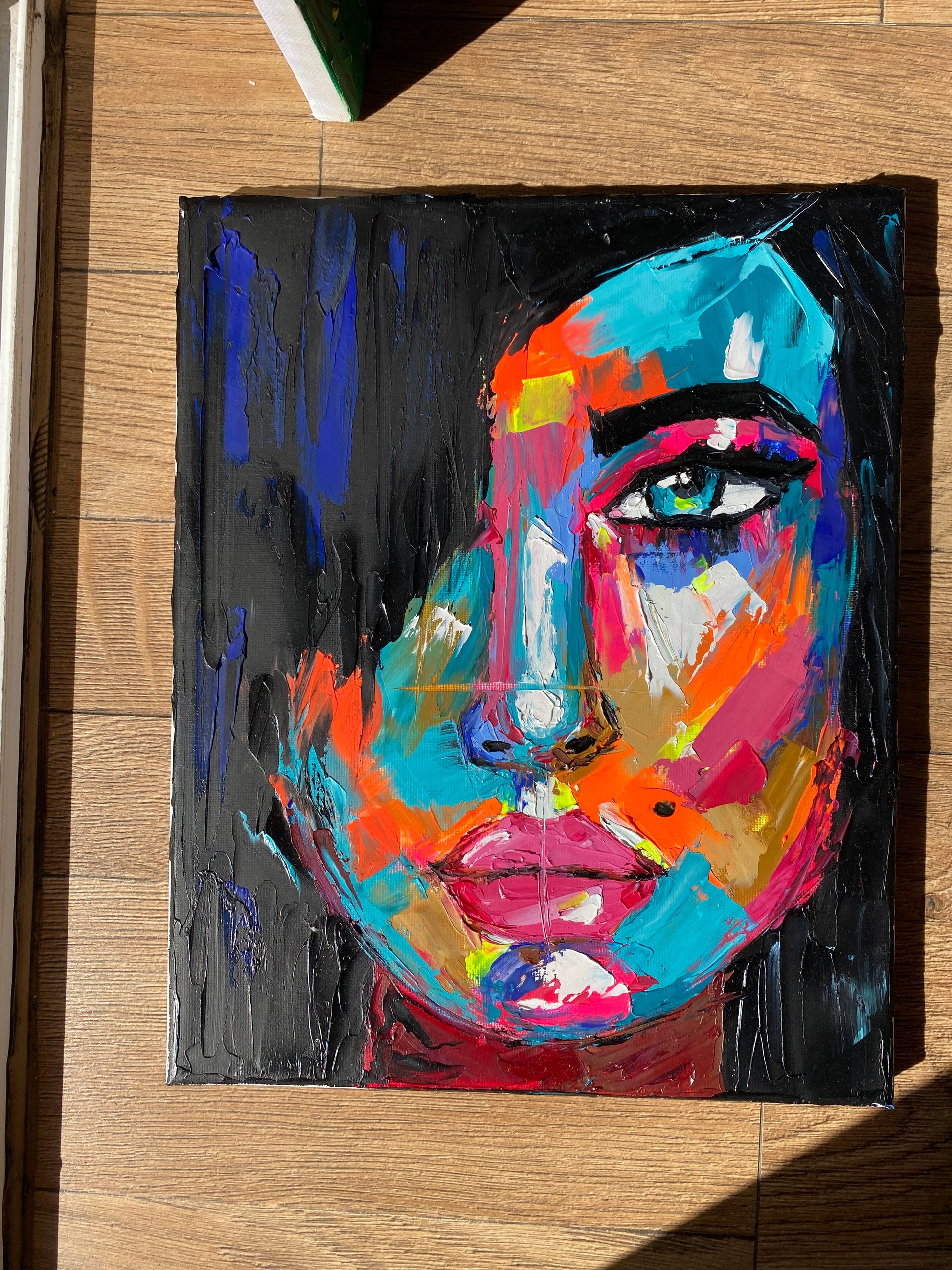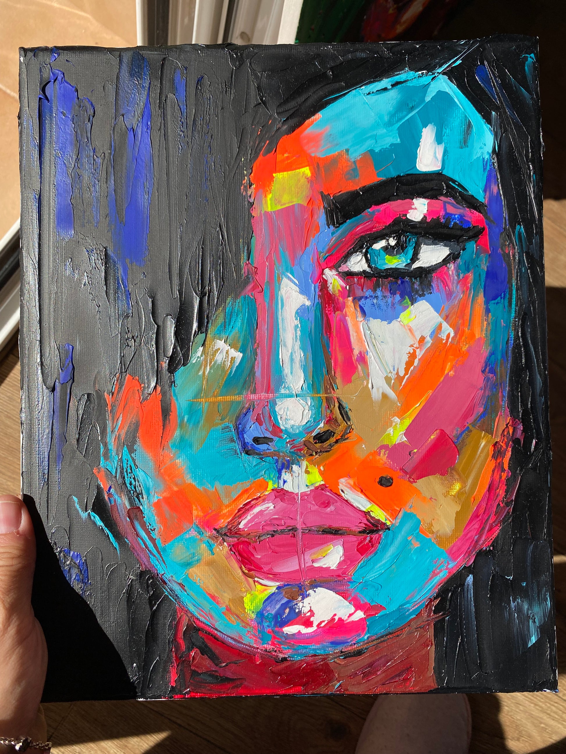Half dream, half reality, Onyria captures the essence of a surreal gaze that lingers between worlds. Painted with a palette knife, the face emerges in radiant layers of turquoise, magenta, orange, and gold against a stark black background, where texture and color collide in vibrant tension. The piercing eye invites the viewer into a dreamlike state—intimate, mysterious, and powerful. A striking portrait that embodies both vulnerability and the transcendence of imagination.