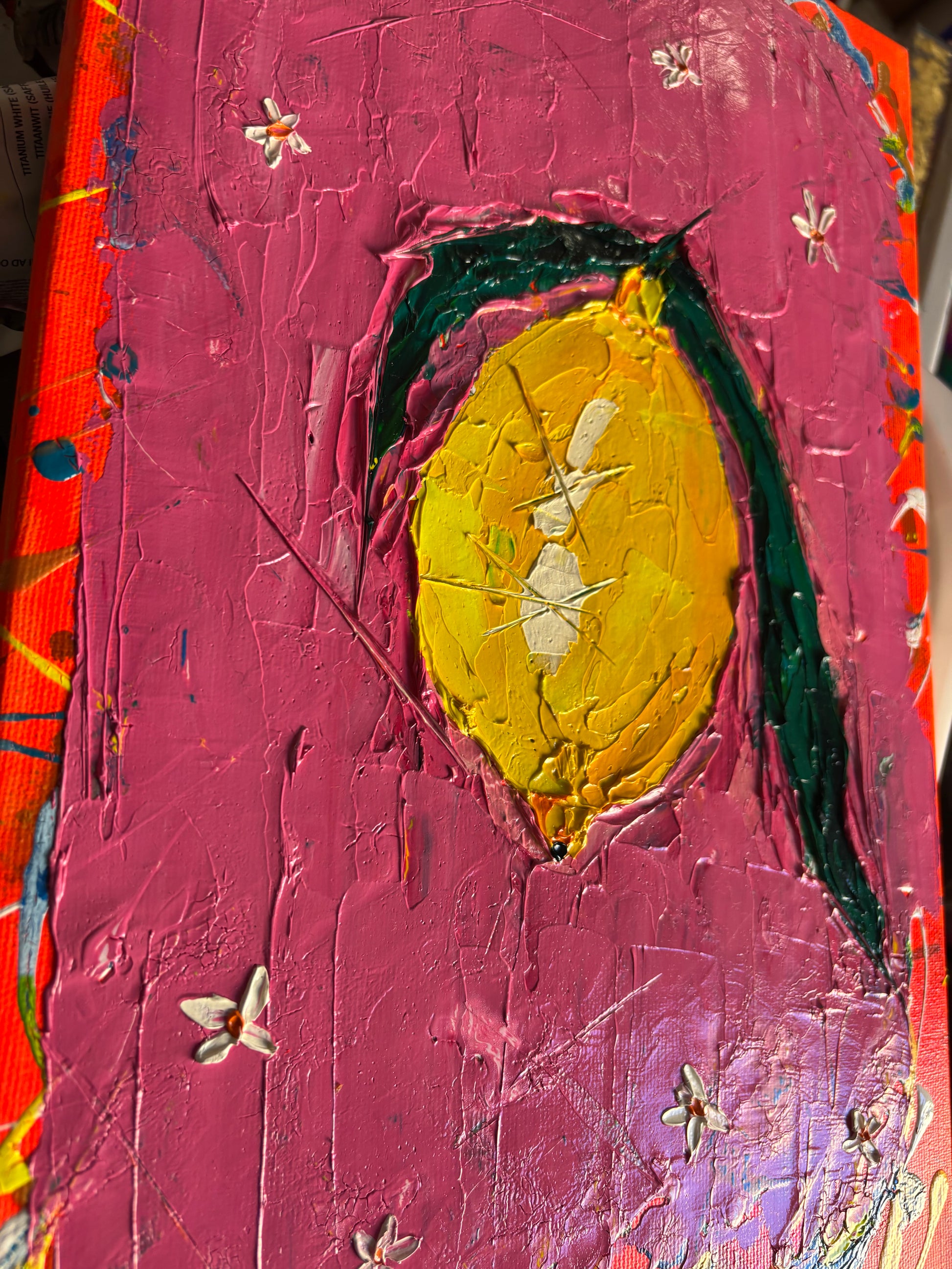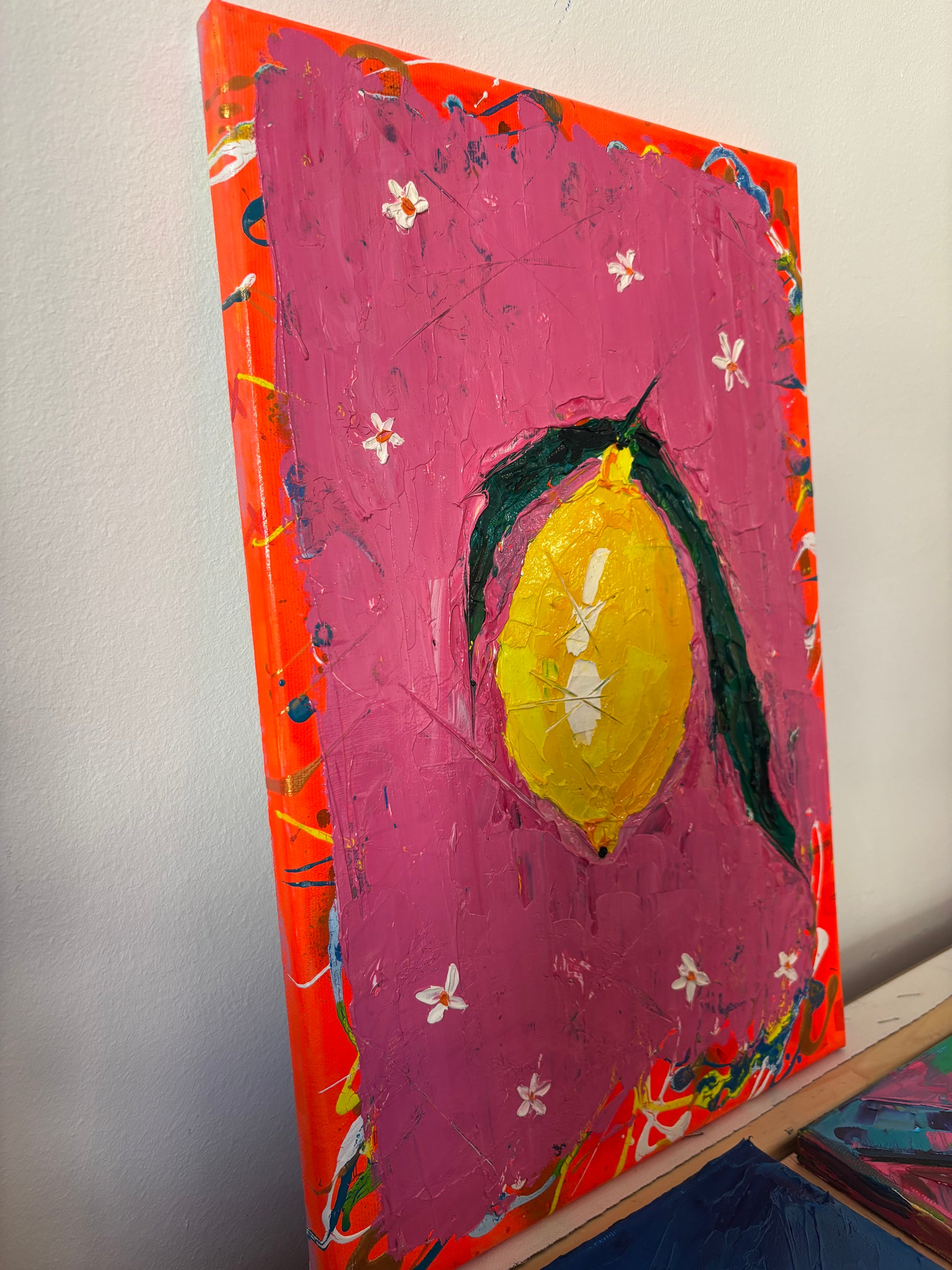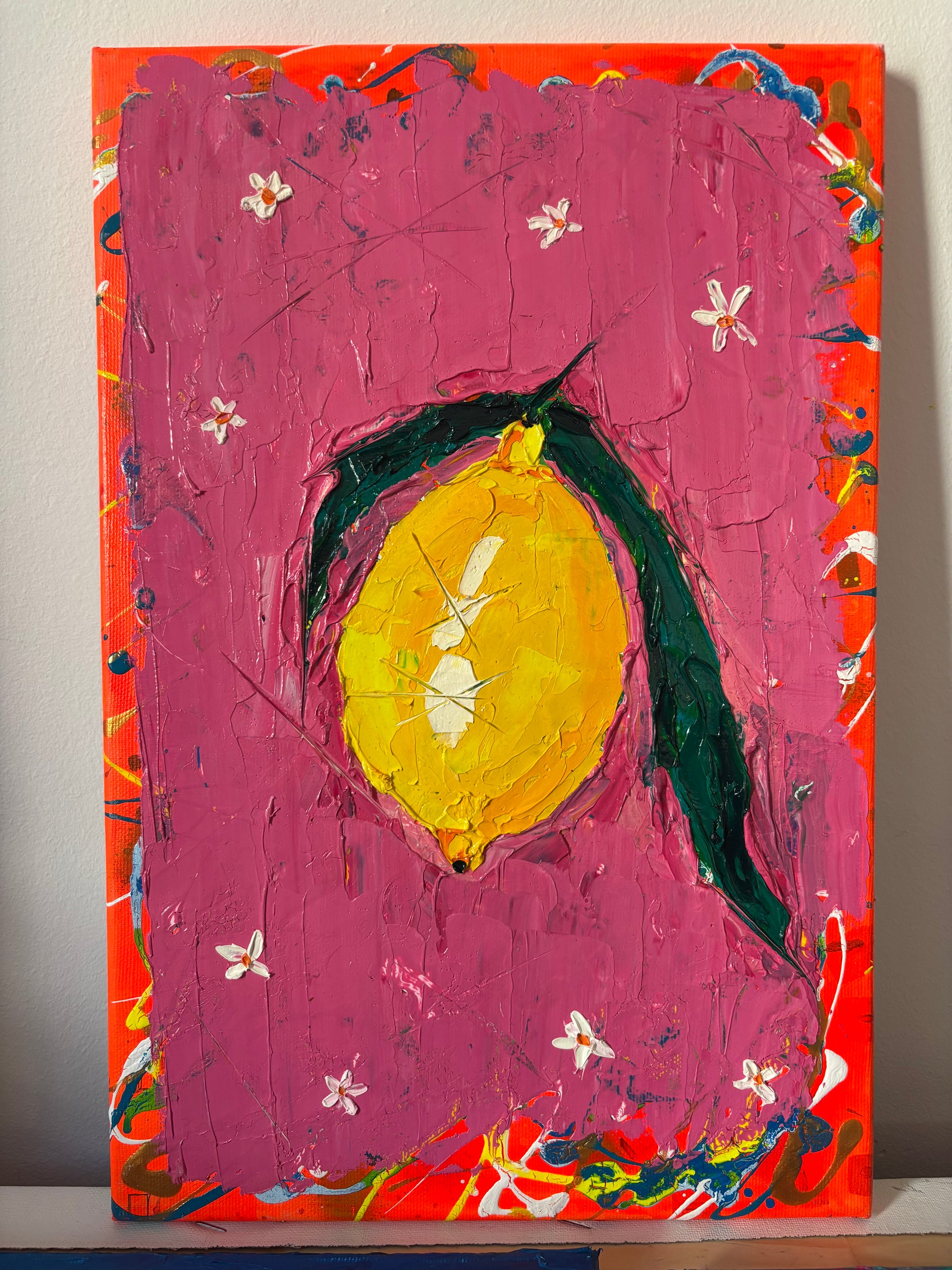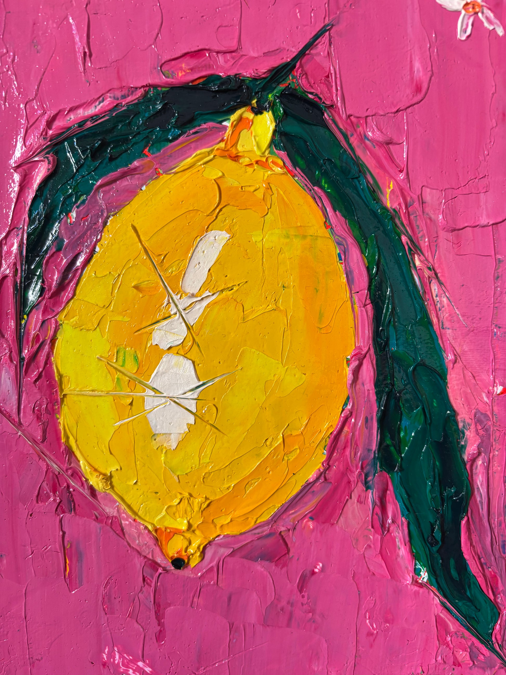 “Pretty” is a joyful and vibrant oil painting that transforms a simple lemon into a striking symbol of freshness and vitality. Set against a bold magenta background with playful floral details, the piece radiates energy and optimism.
