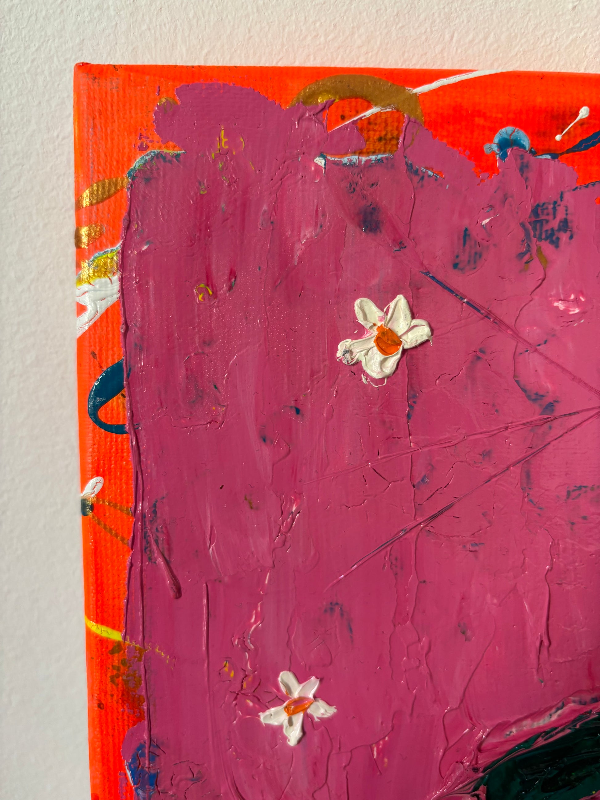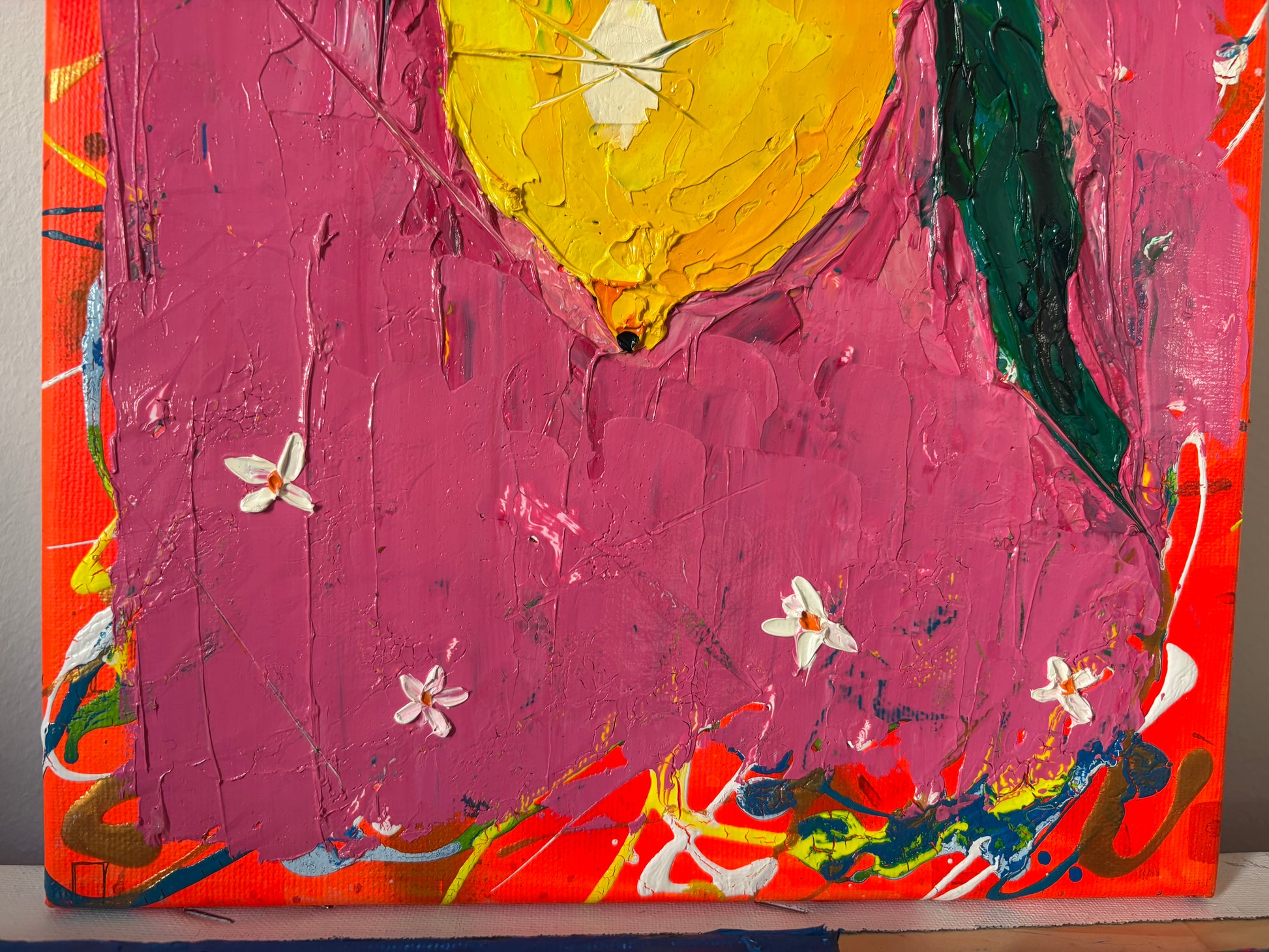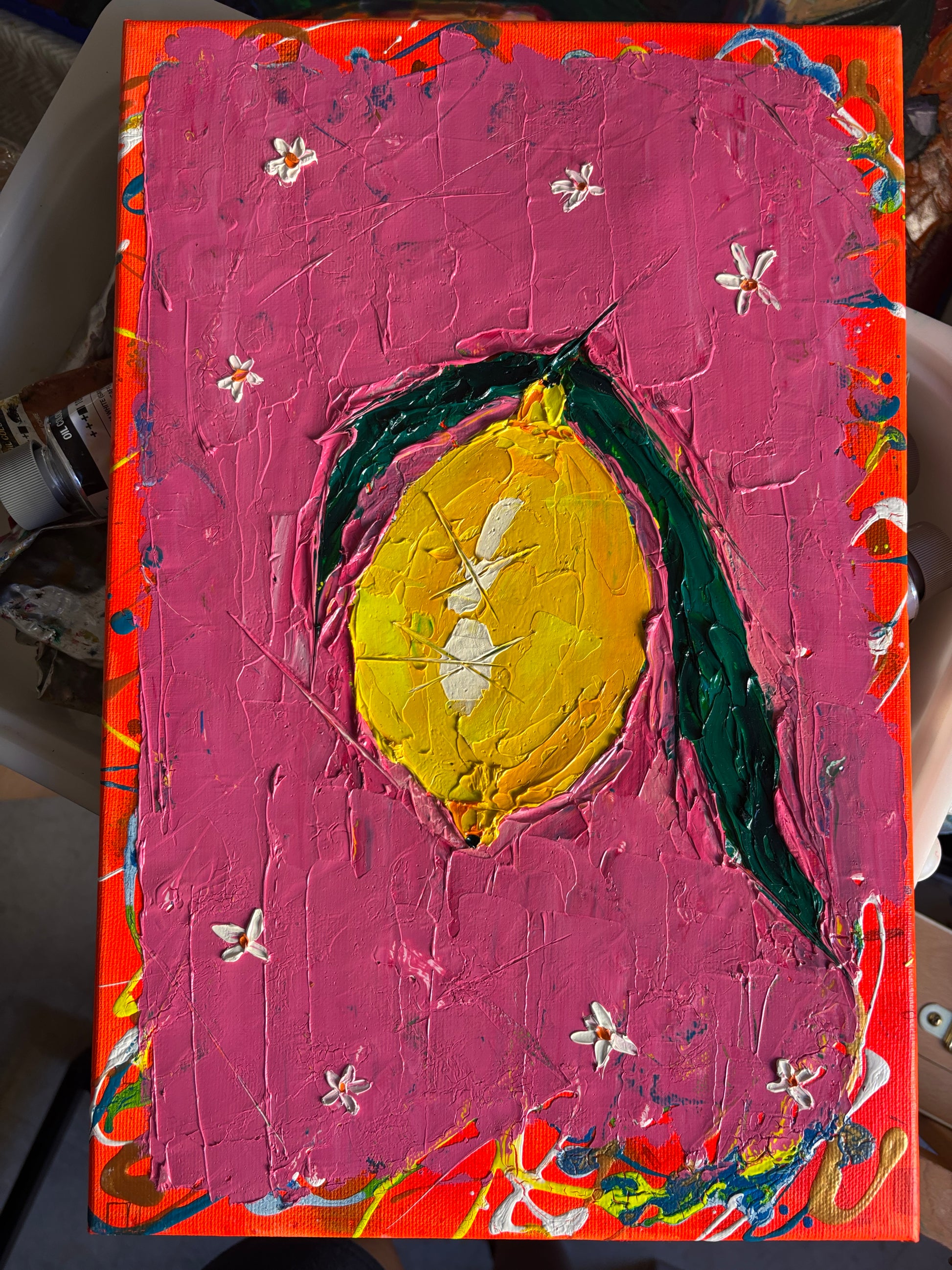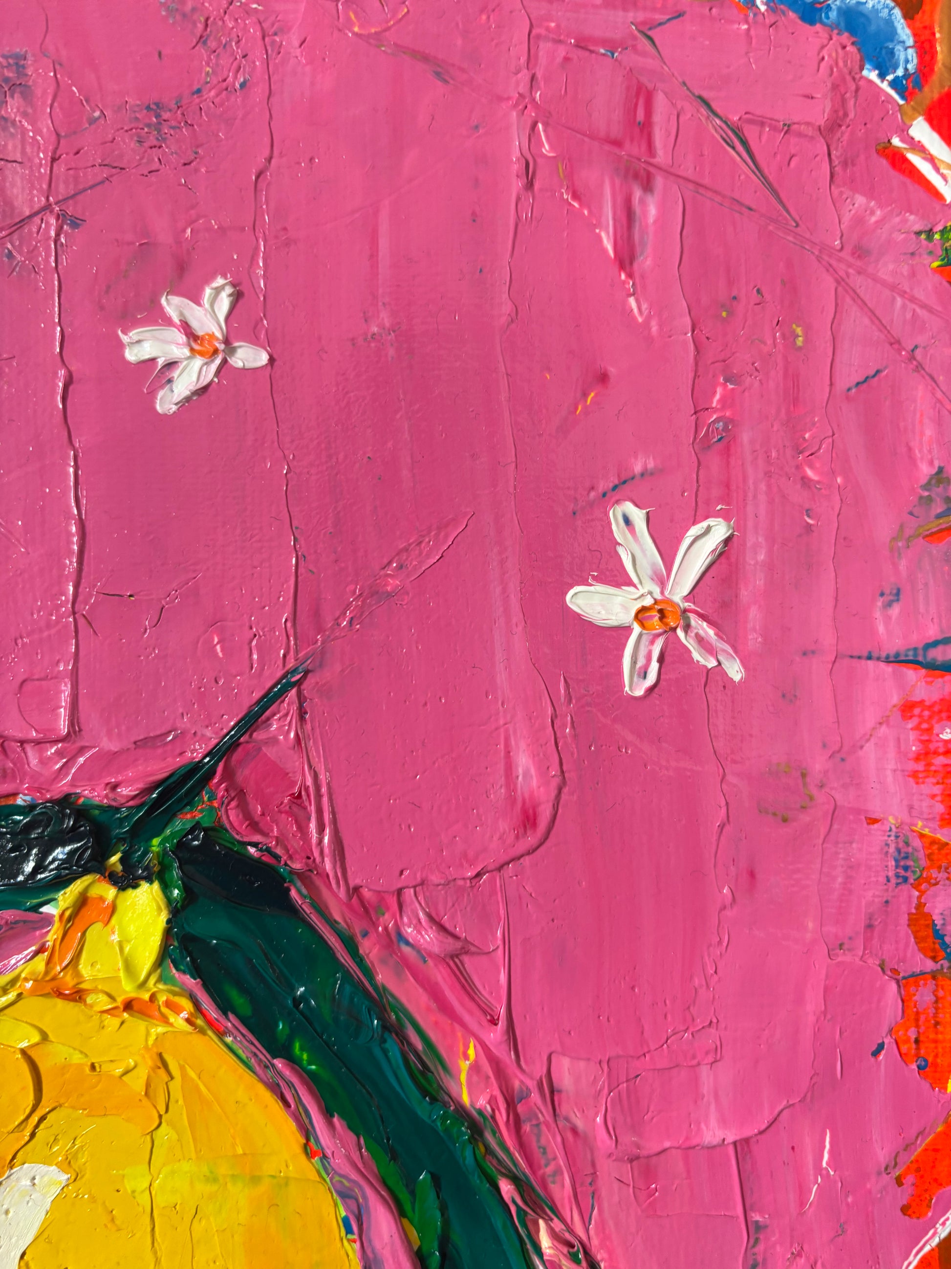 “Pretty” is a joyful and vibrant oil painting that transforms a simple lemon into a striking symbol of freshness and vitality. Set against a bold magenta background with playful floral details, the piece radiates energy and optimism.