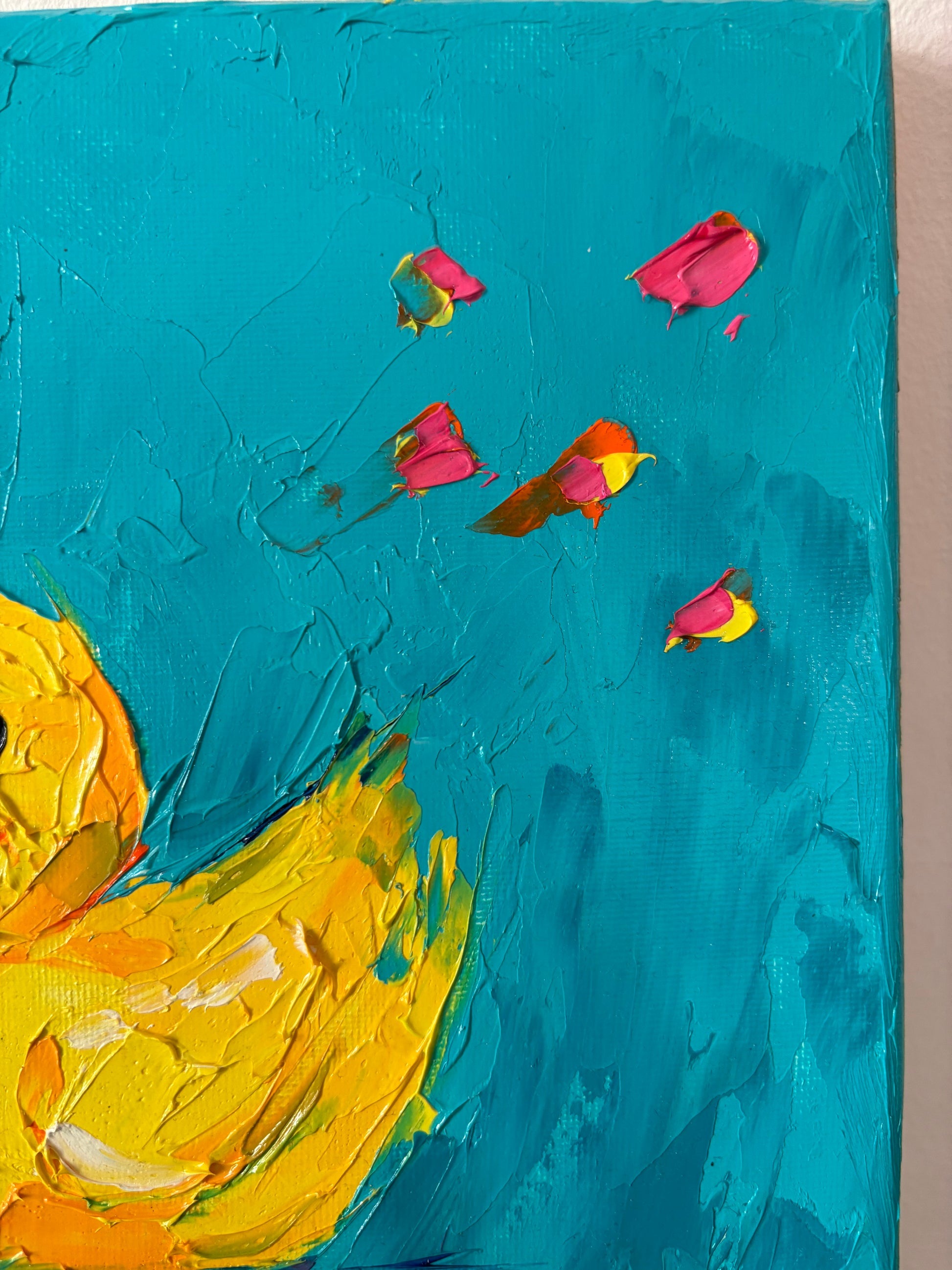 Painted entirely in oil with bold palette-knife strokes, the work is rich in texture and movement, giving the duck a lively, almost whimsical presence. Its vibrant colors and expressive style transform a simple childhood symbol into a radiant celebration of happiness and warmth.