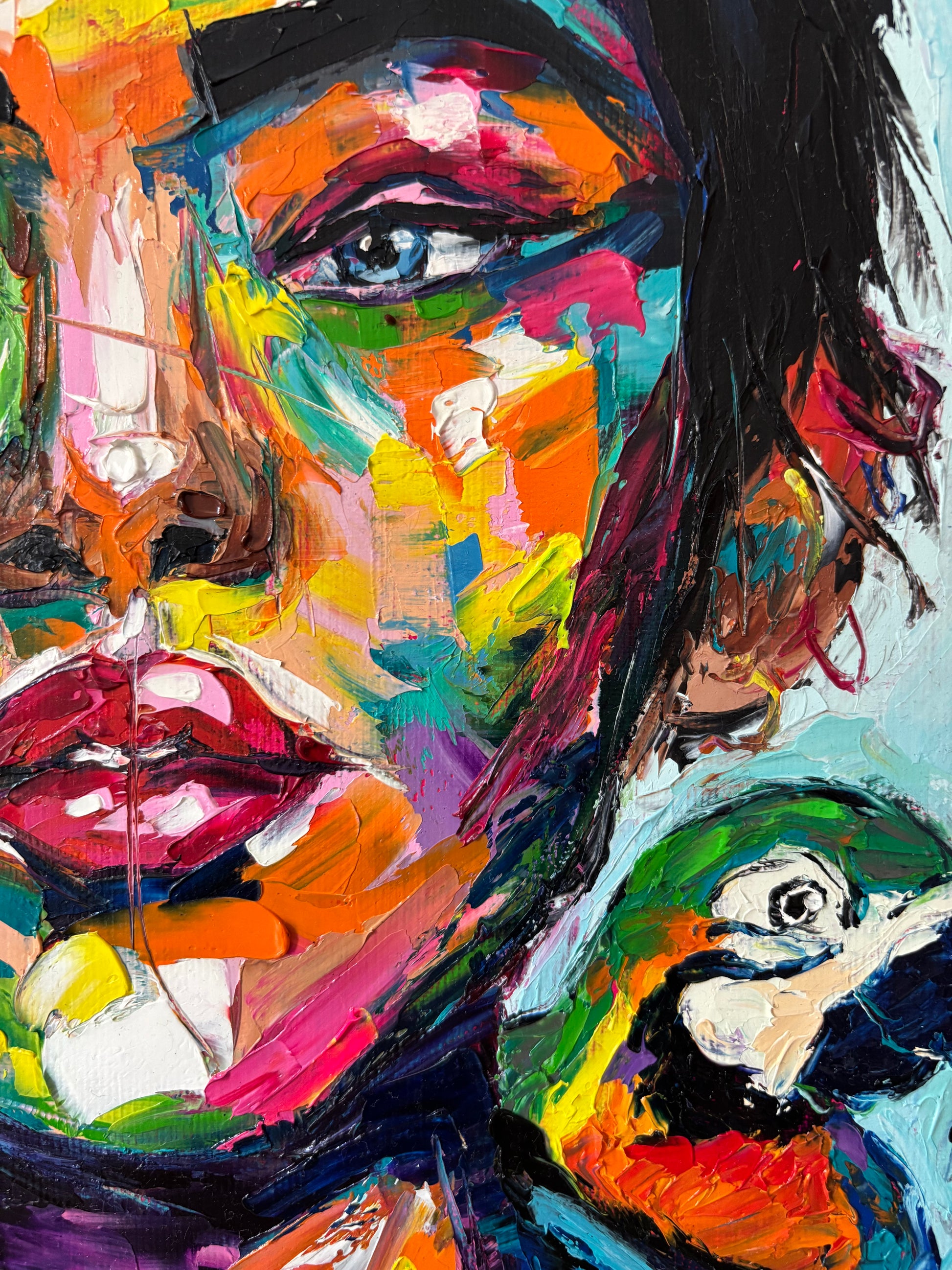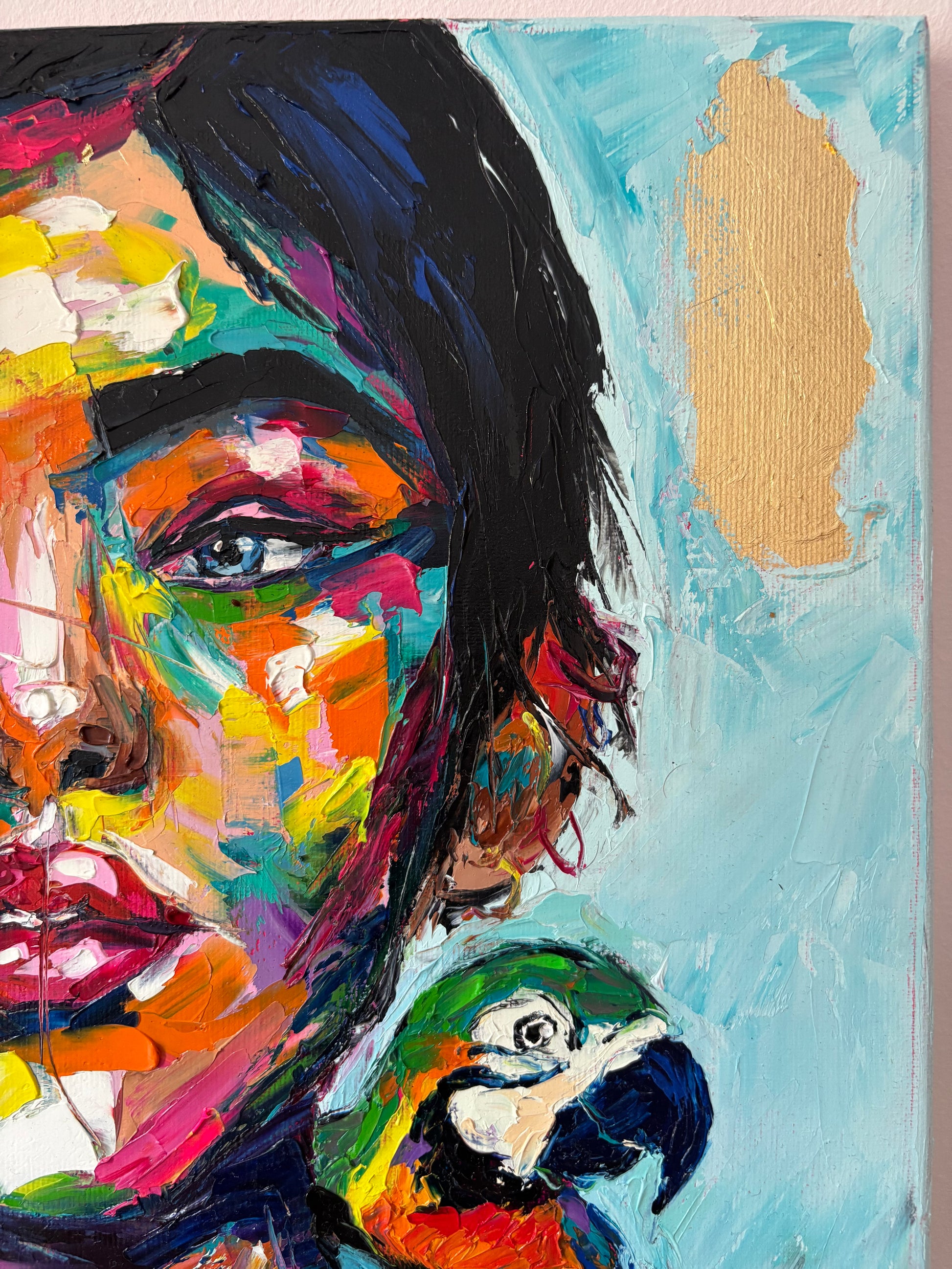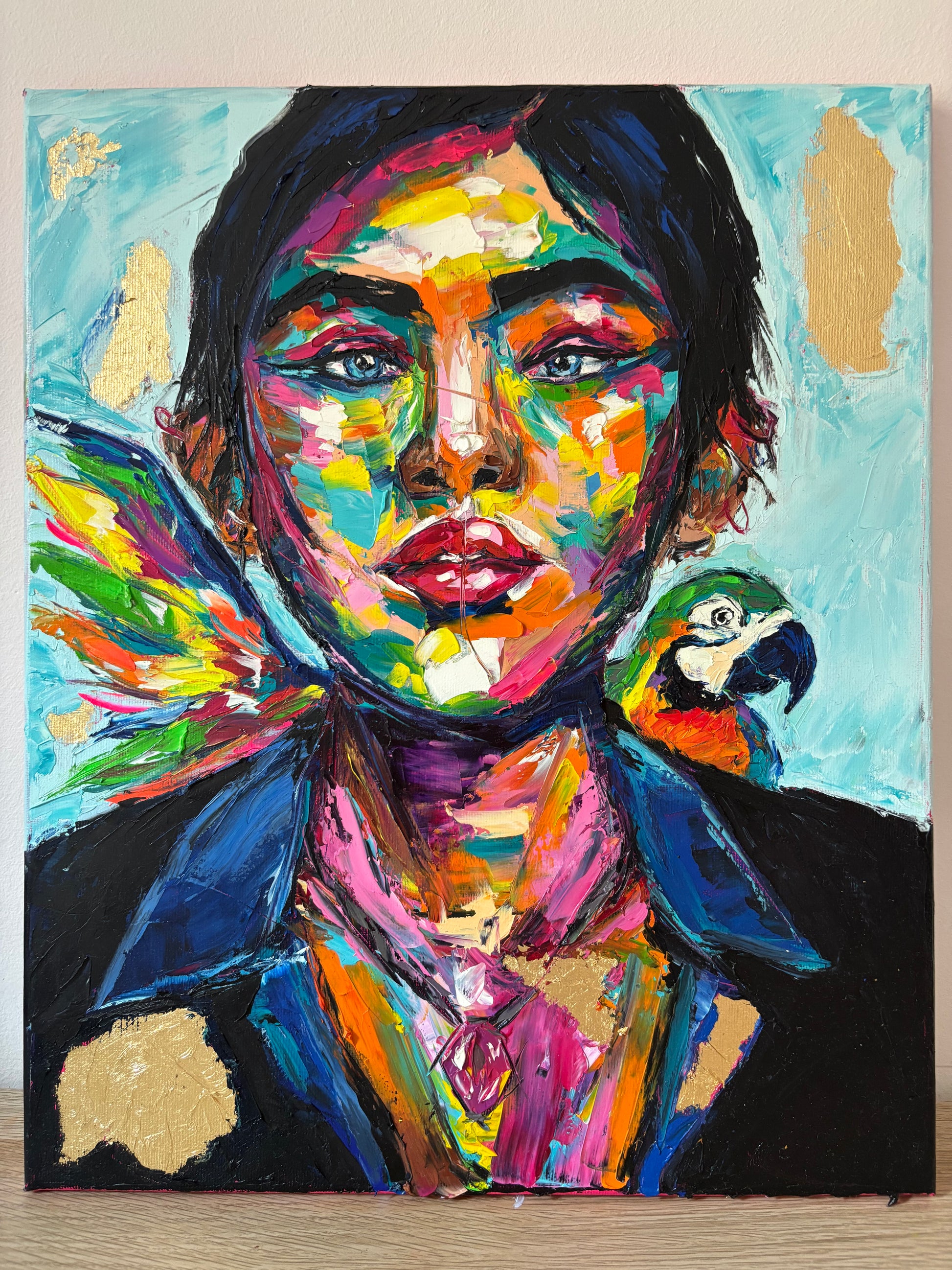 “Radiant Rebellion” is a striking oil-on-canvas portrait that embodies strength, individuality, and fearless expression. Painted with bold palette knife strokes and an explosion of vibrant colors, the woman’s gaze captivates with intensity while a parrot rests at her shoulder, symbolizing freedom and voice. Golden accents bring a touch of luminosity, enhancing the textured layers of oil and acrylic. This artwork is a powerful statement of beauty, resilience, and unapologetic self-expression.
