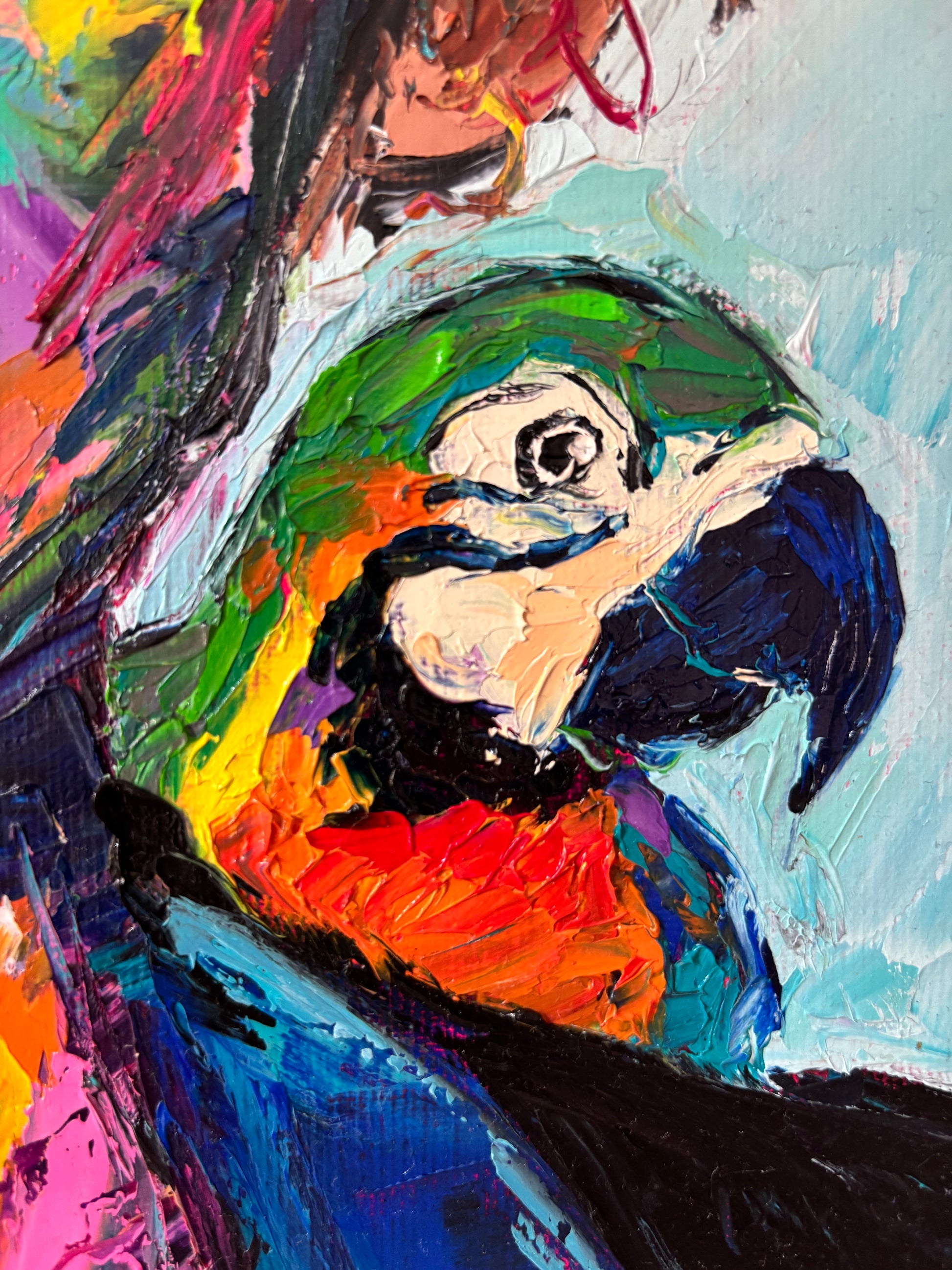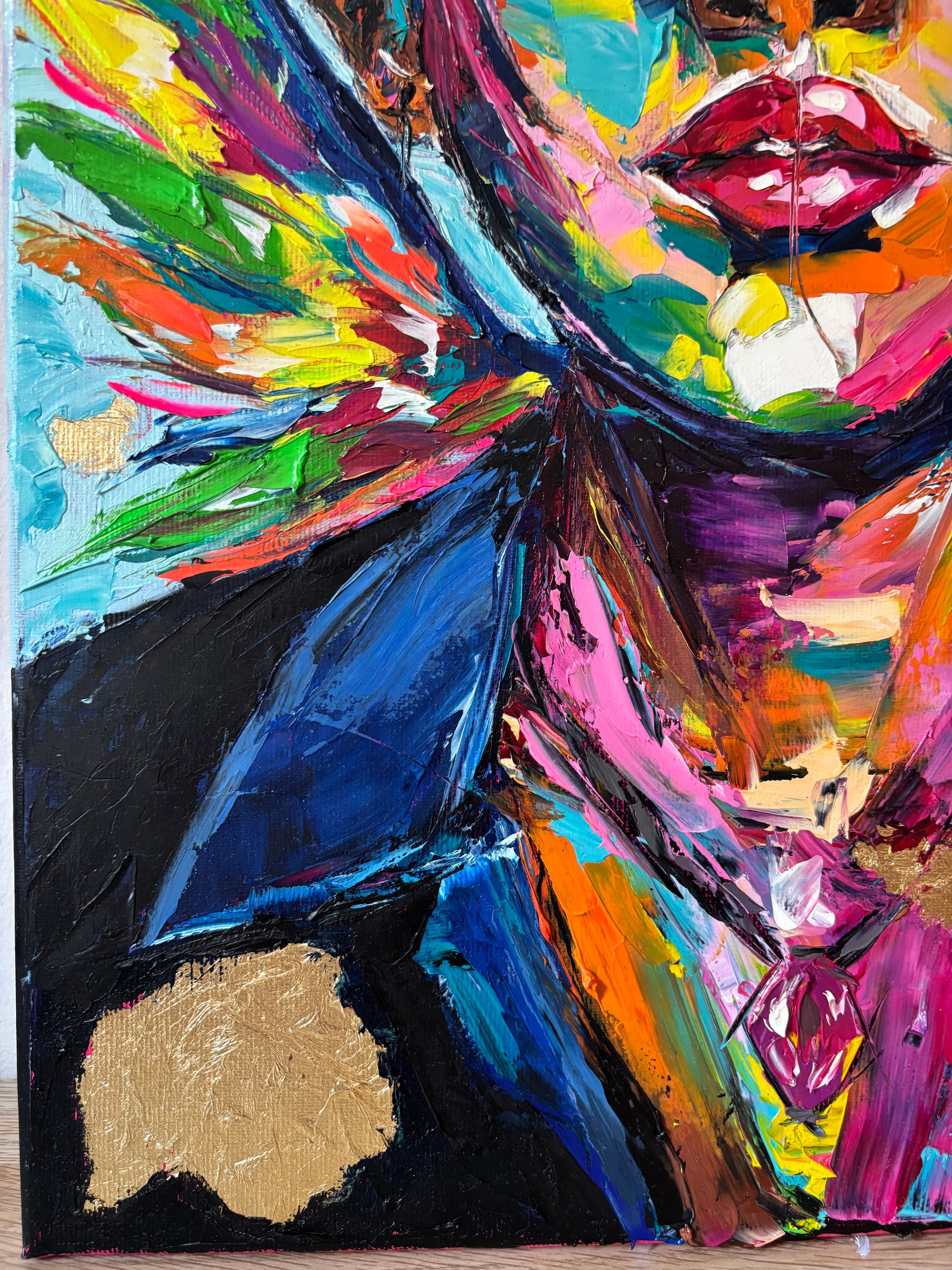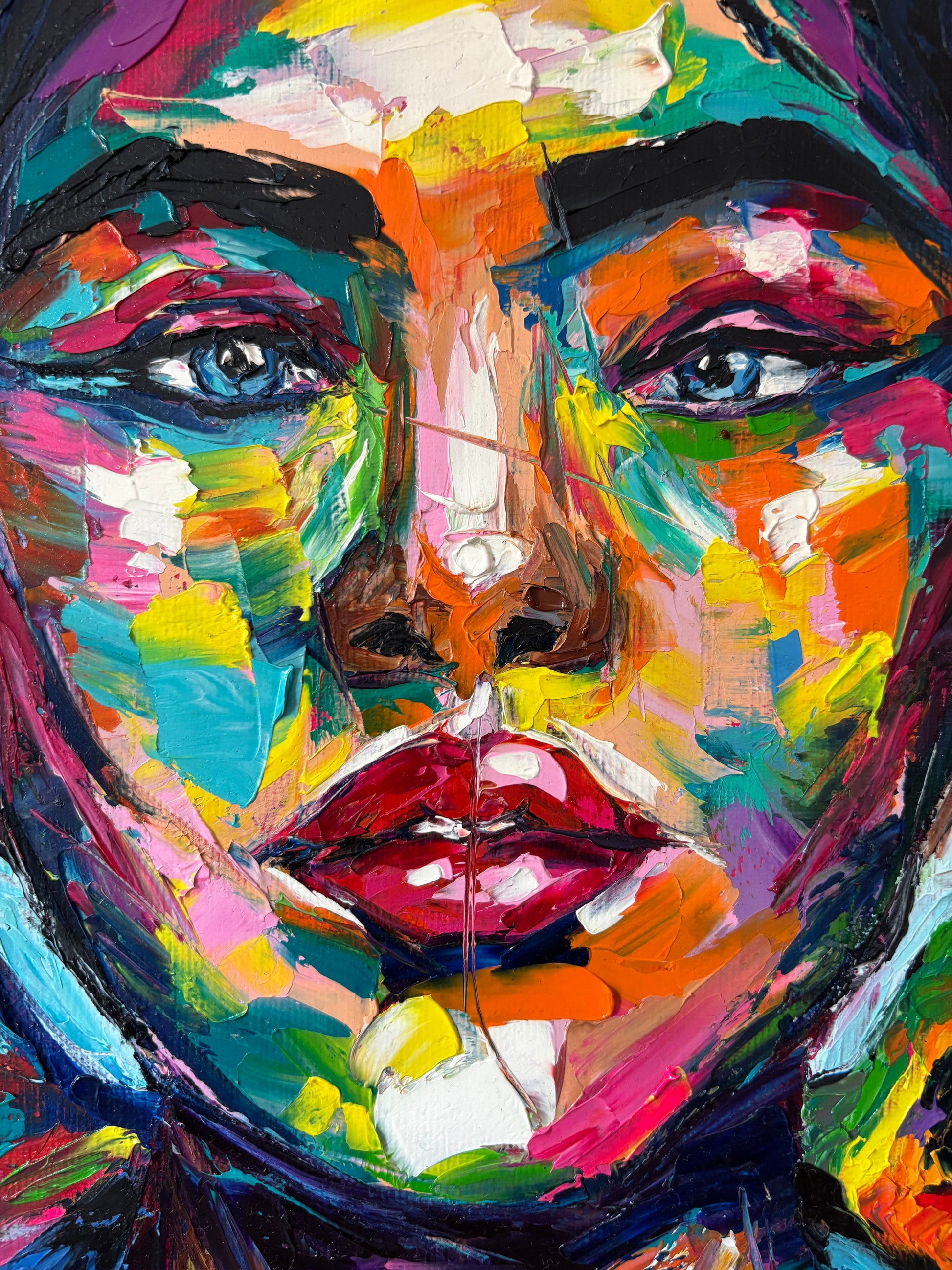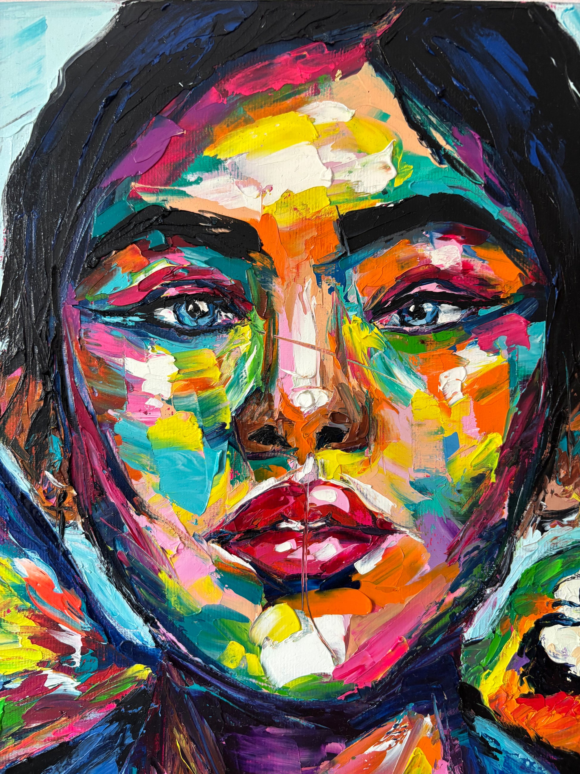 “Radiant Rebellion” is a striking oil-on-canvas portrait that embodies strength, individuality, and fearless expression. Painted with bold palette knife strokes and an explosion of vibrant colors, the woman’s gaze captivates with intensity while a parrot rests at her shoulder, symbolizing freedom and voice. Golden accents bring a touch of luminosity, enhancing the textured layers of oil and acrylic. This artwork is a powerful statement of beauty, resilience, and unapologetic self-expression.