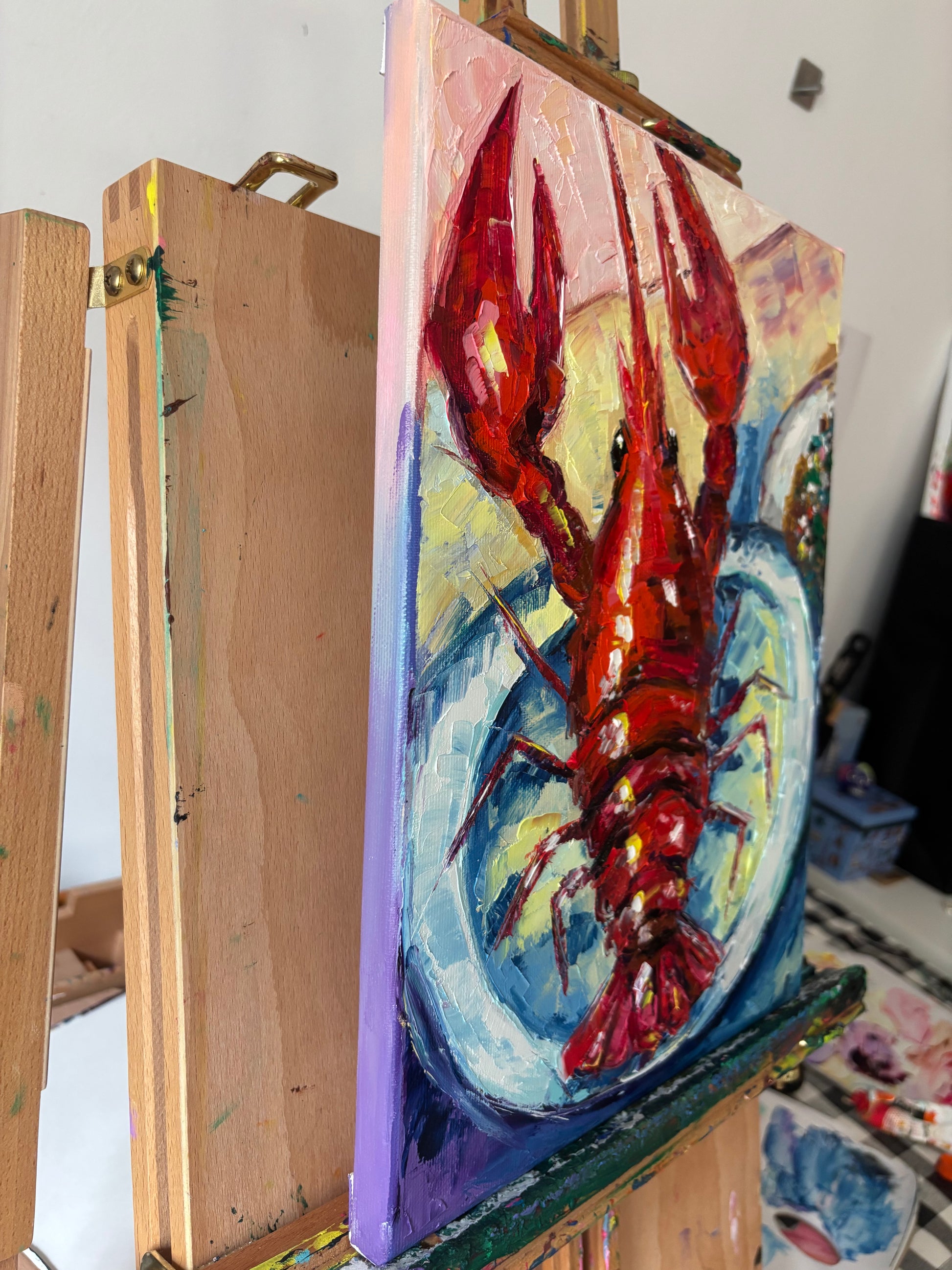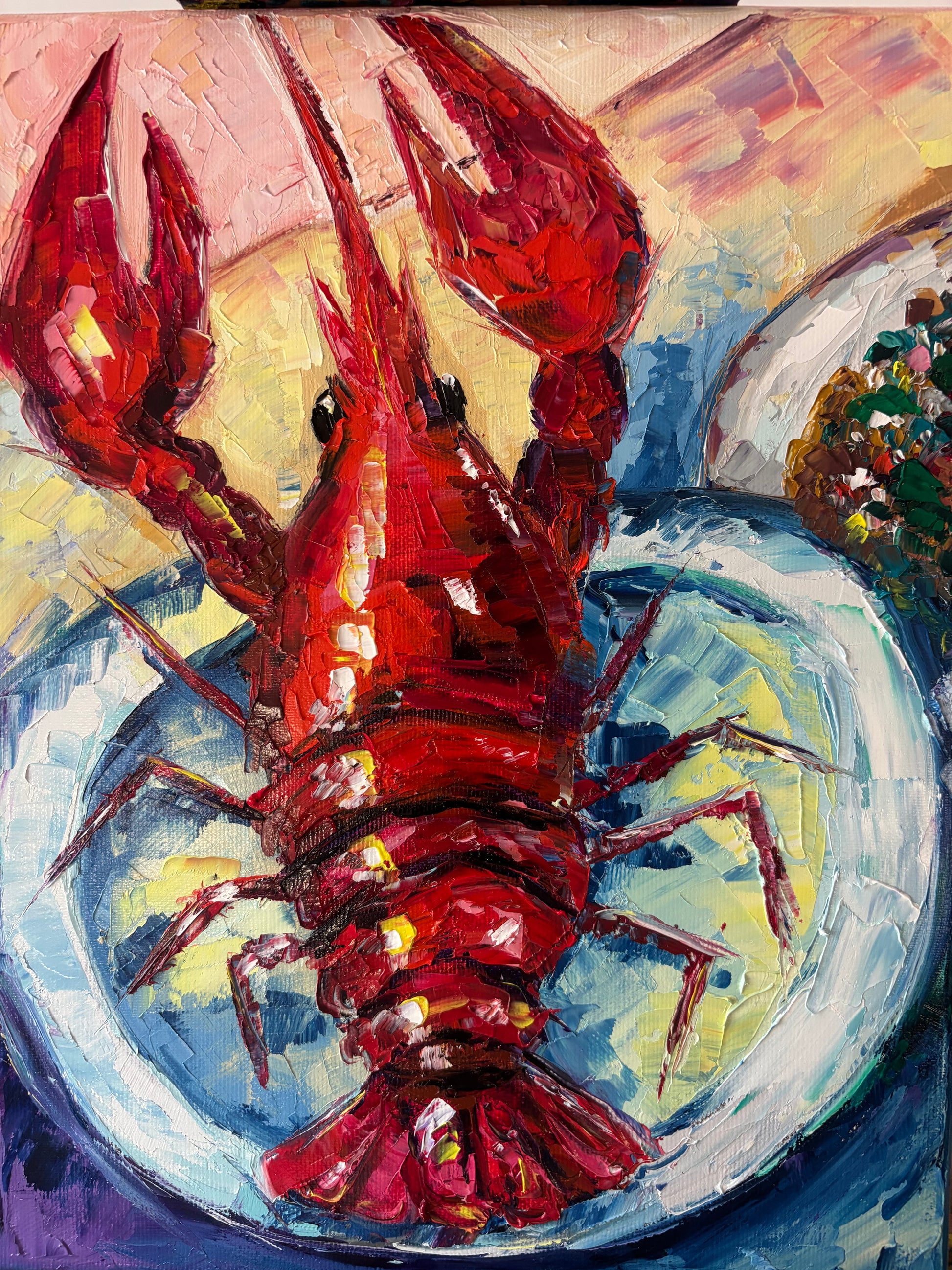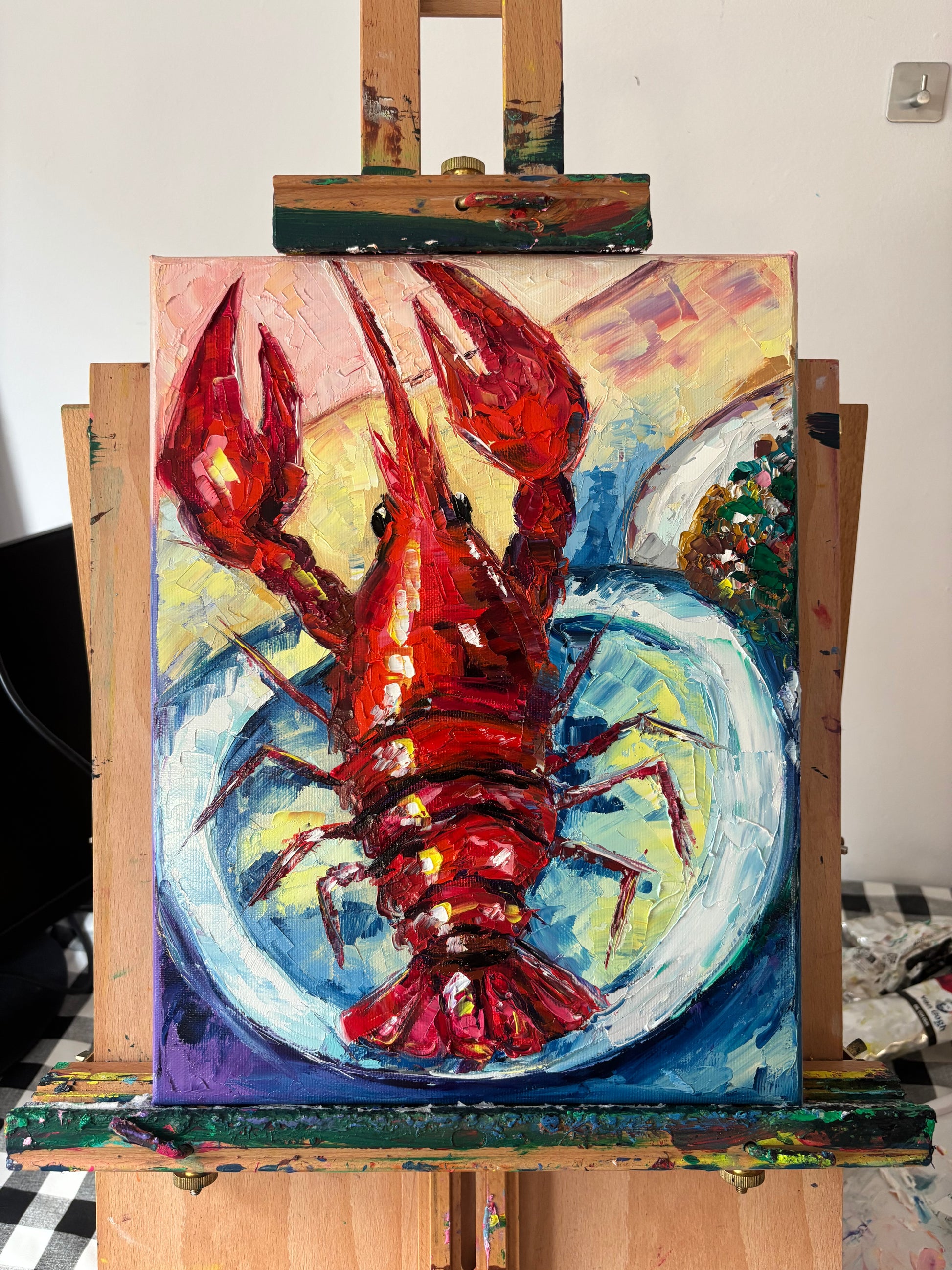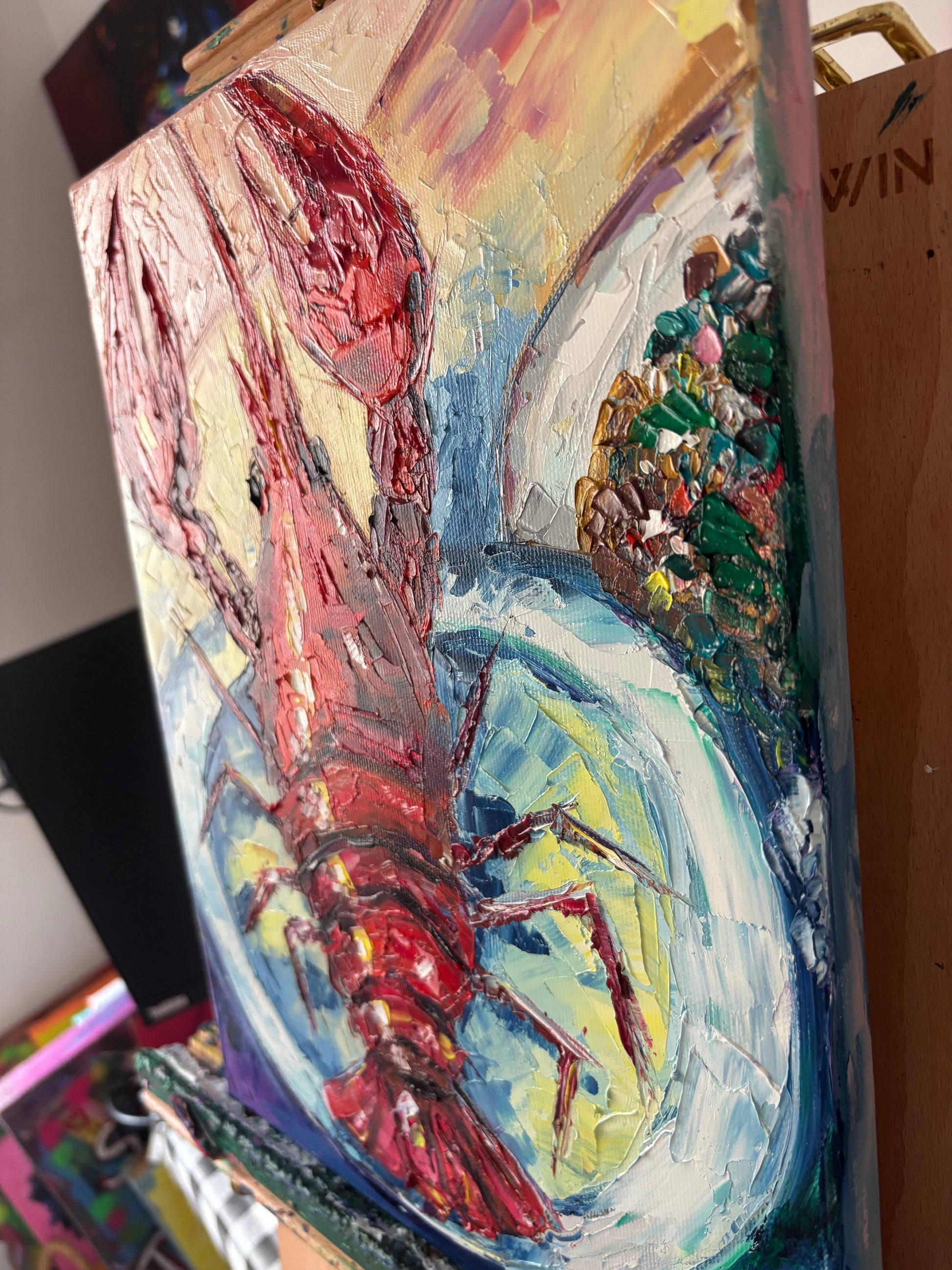 This expressive palette-knife lobster painting bursts with vibrant color and bold texture, capturing both the raw energy of the sea and the warmth of cherished family memories. Inspired by a day spent eating seafood in Portugal with my grandmother and paternal cousins, the piece blends thick impasto strokes, luminous reds and deep ocean hues to create a lively, emotional portrait of tradition, joy, and shared roots. It is a work that celebrates heritage, connection, and the simple moments that stay with us forever.