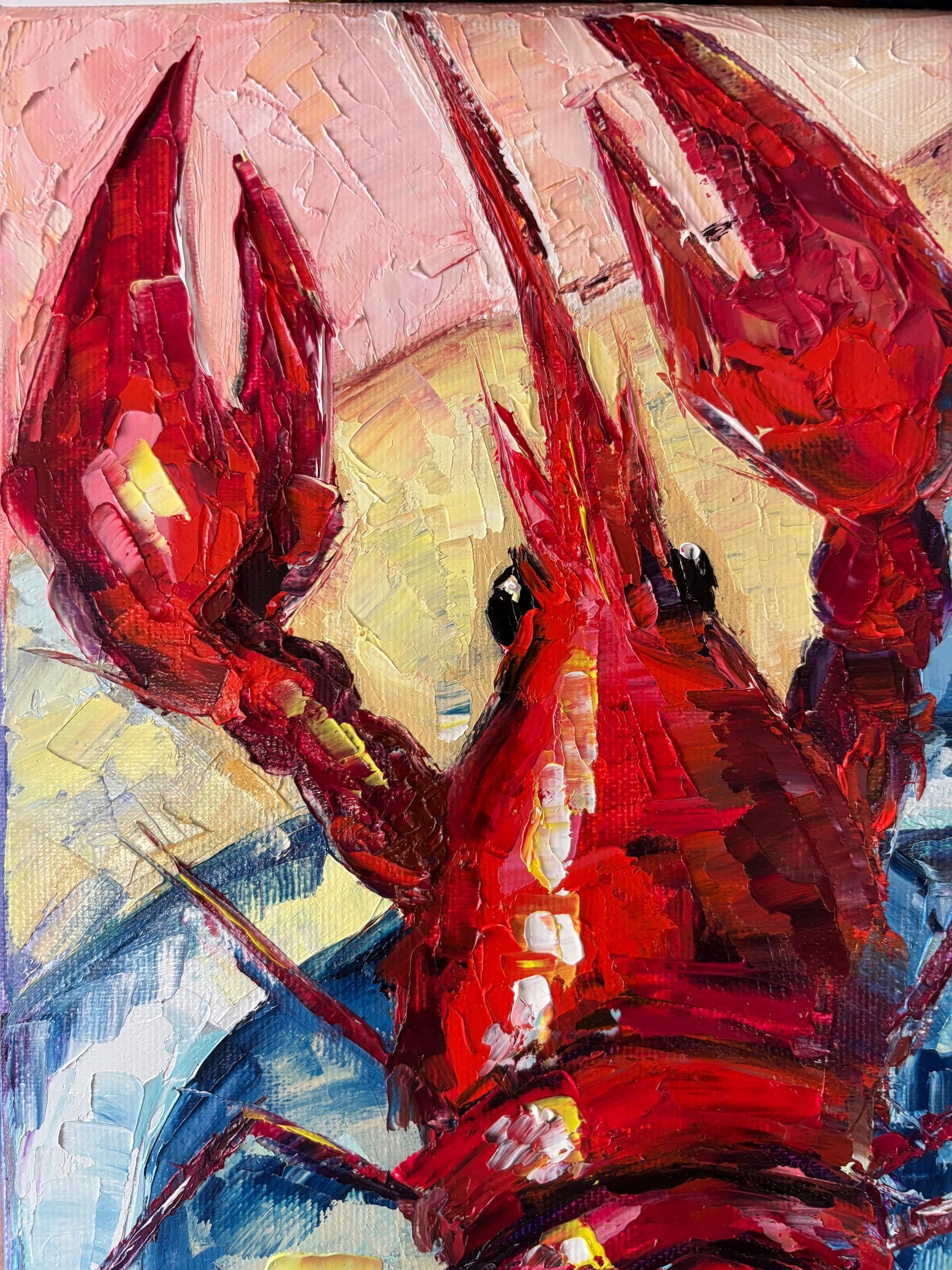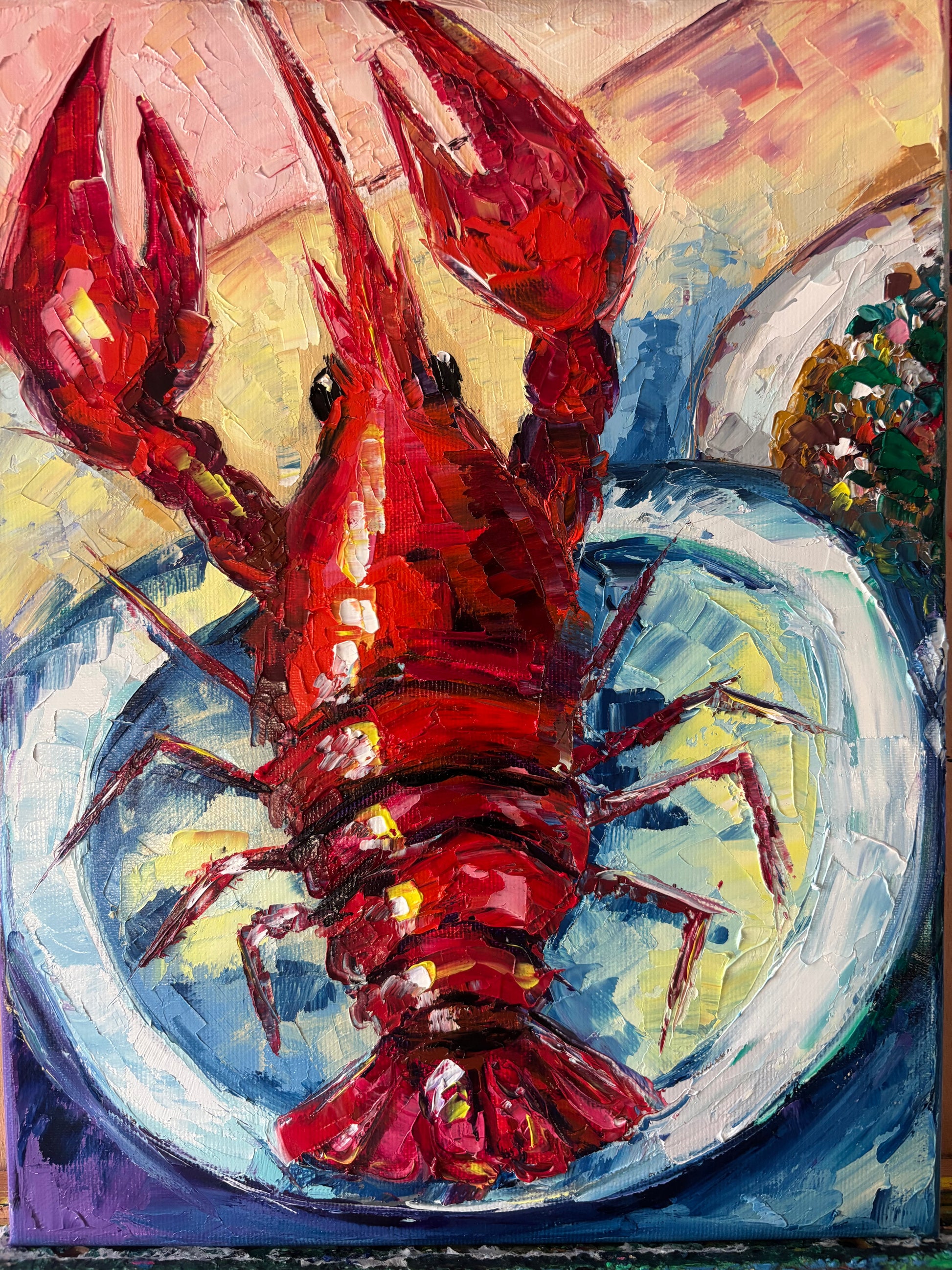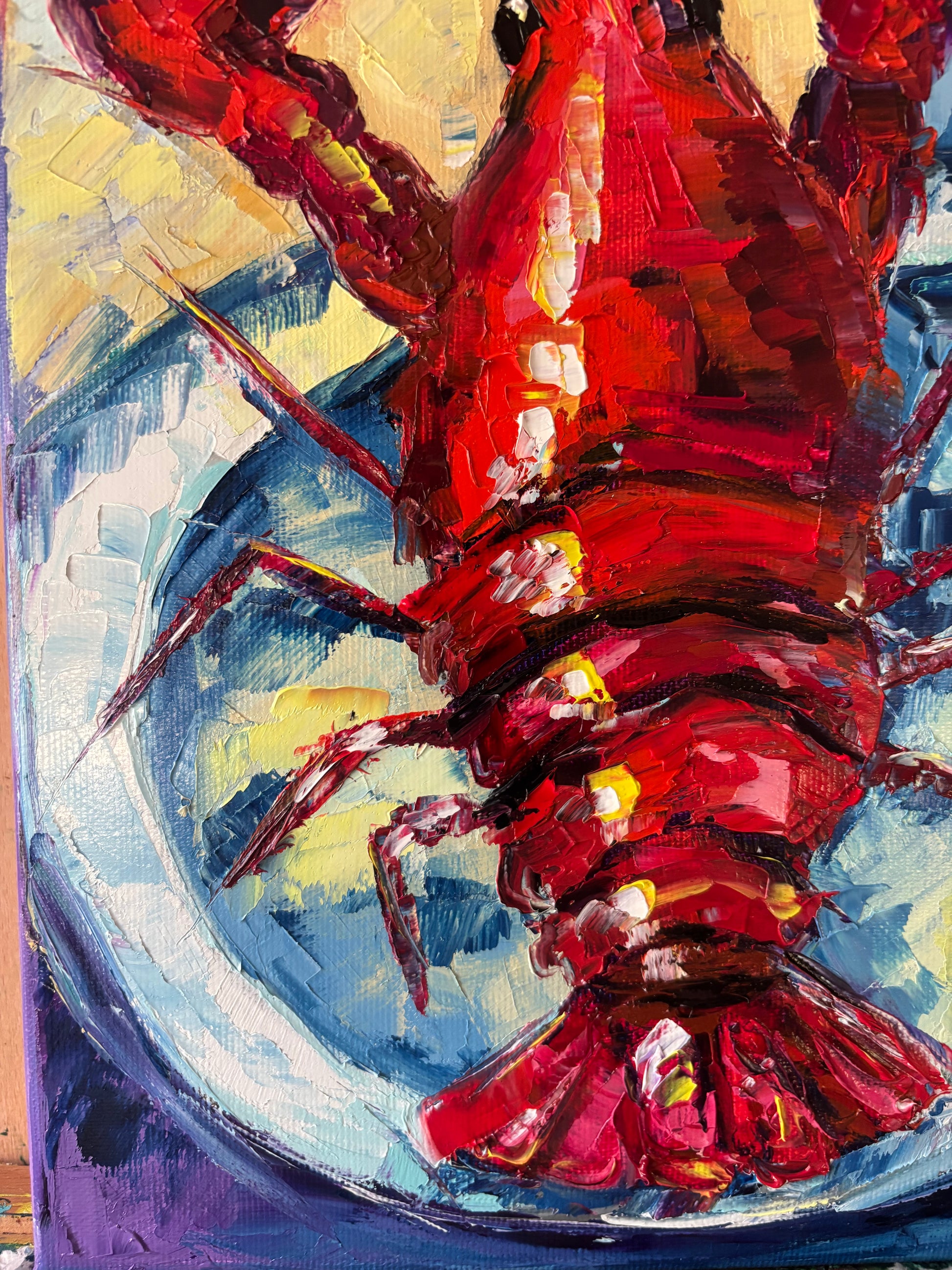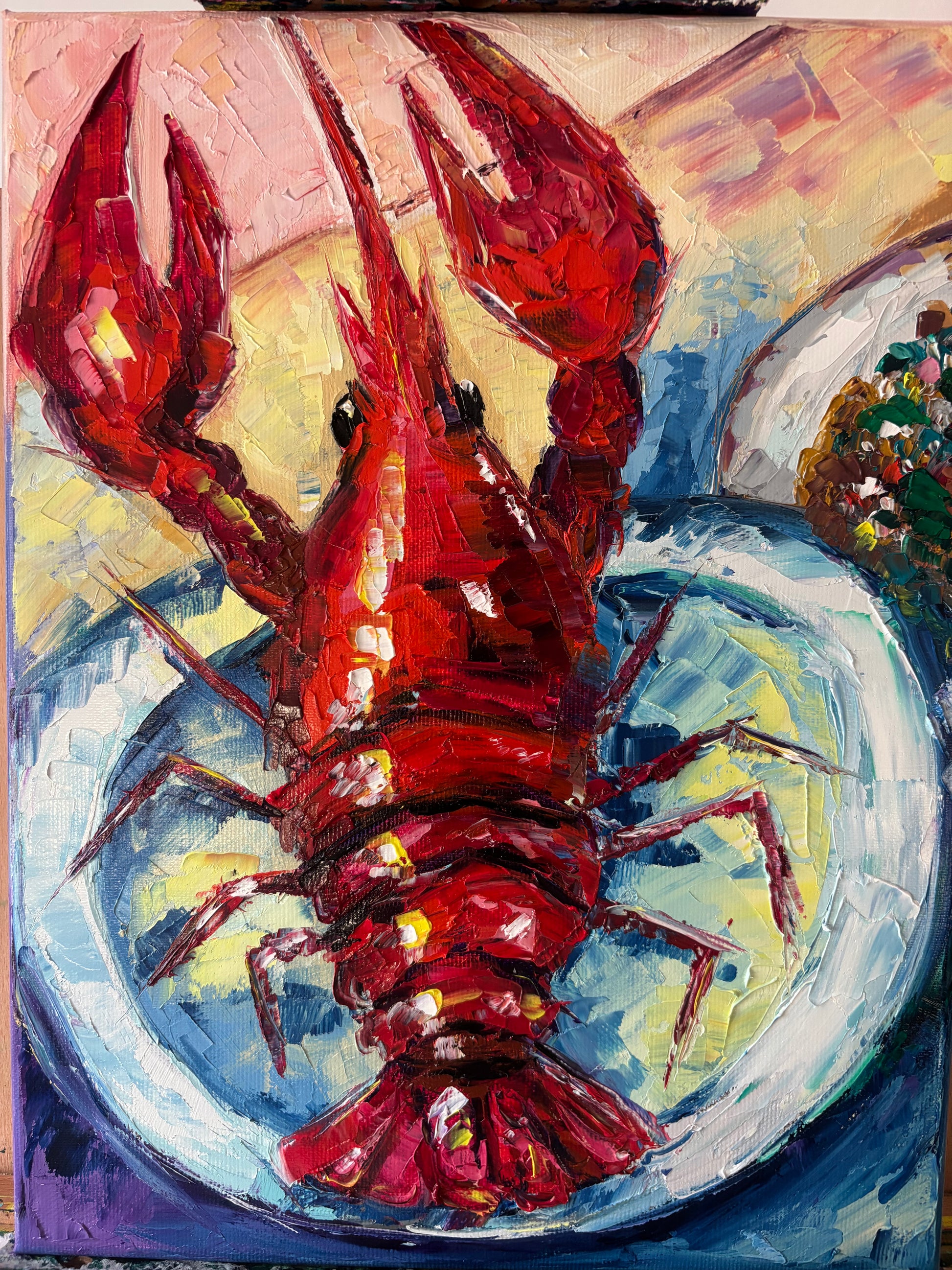 This expressive palette-knife lobster painting bursts with vibrant color and bold texture, capturing both the raw energy of the sea and the warmth of cherished family memories. Inspired by a day spent eating seafood in Portugal with my grandmother and paternal cousins, the piece blends thick impasto strokes, luminous reds and deep ocean hues to create a lively, emotional portrait of tradition, joy, and shared roots. It is a work that celebrates heritage, connection, and the simple moments that stay with us forever.