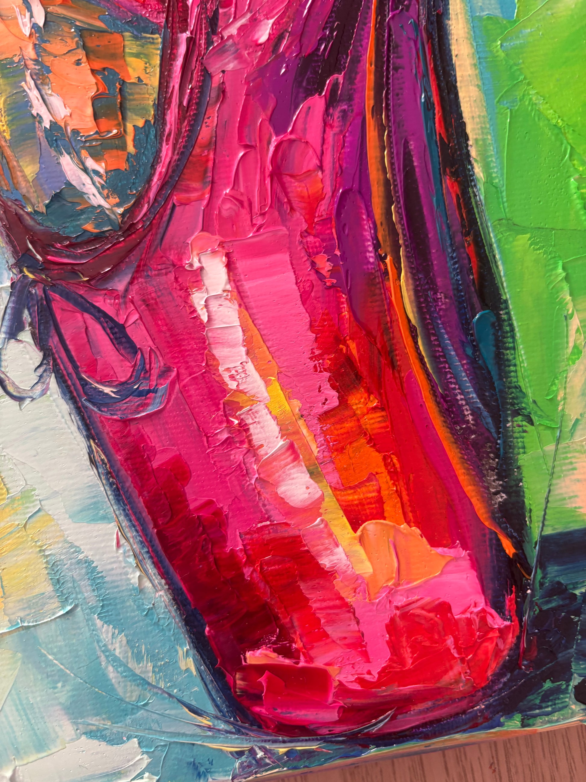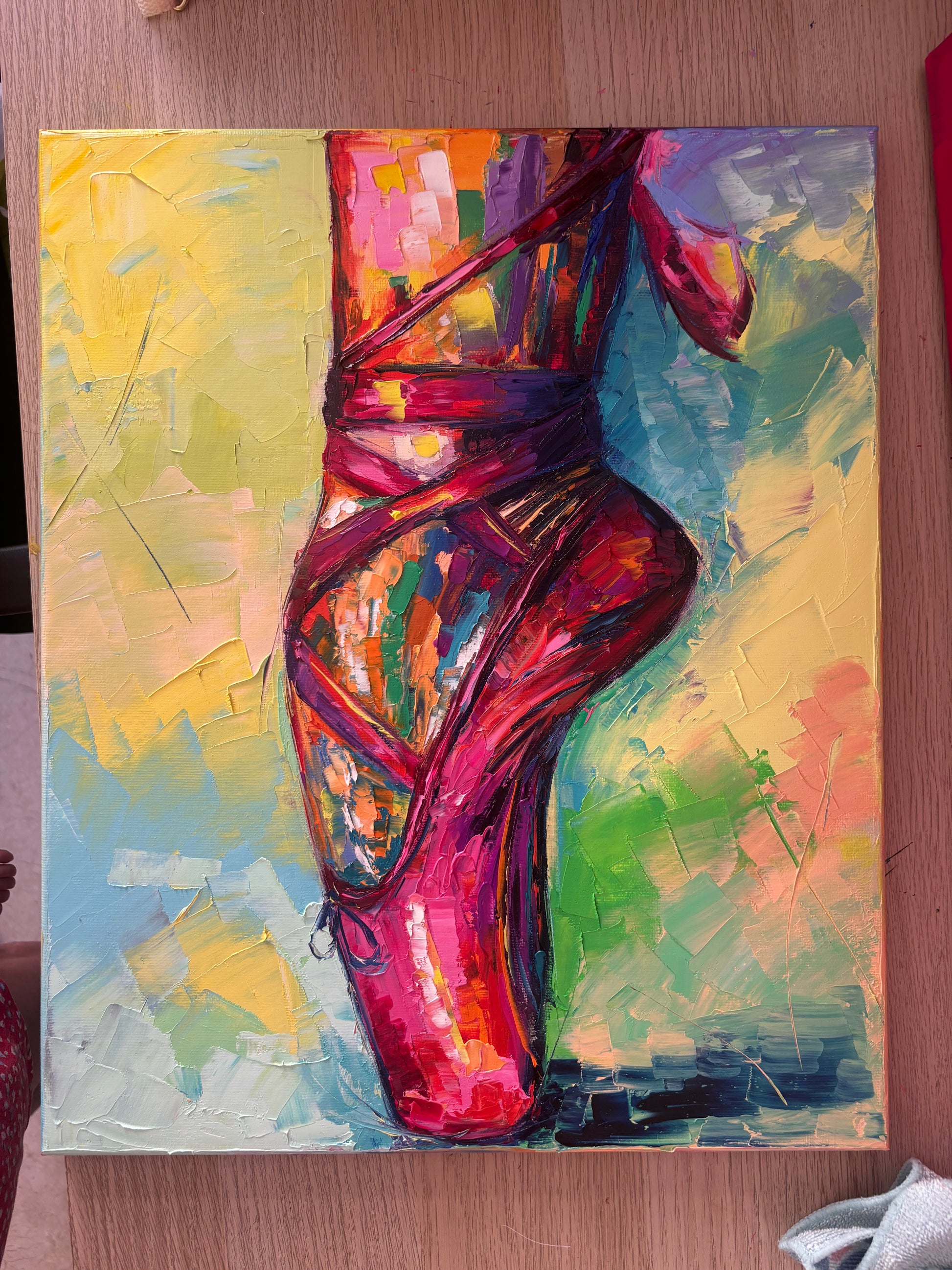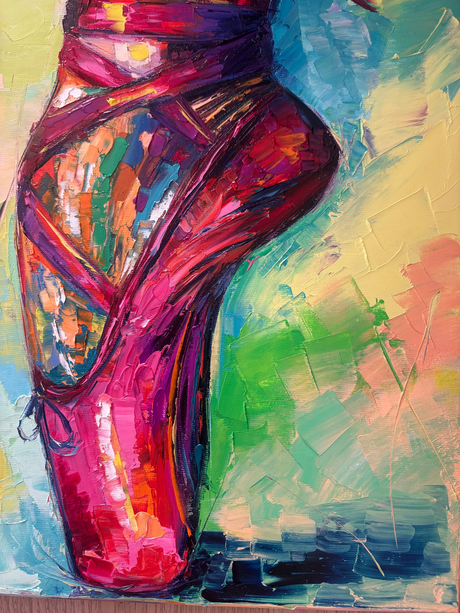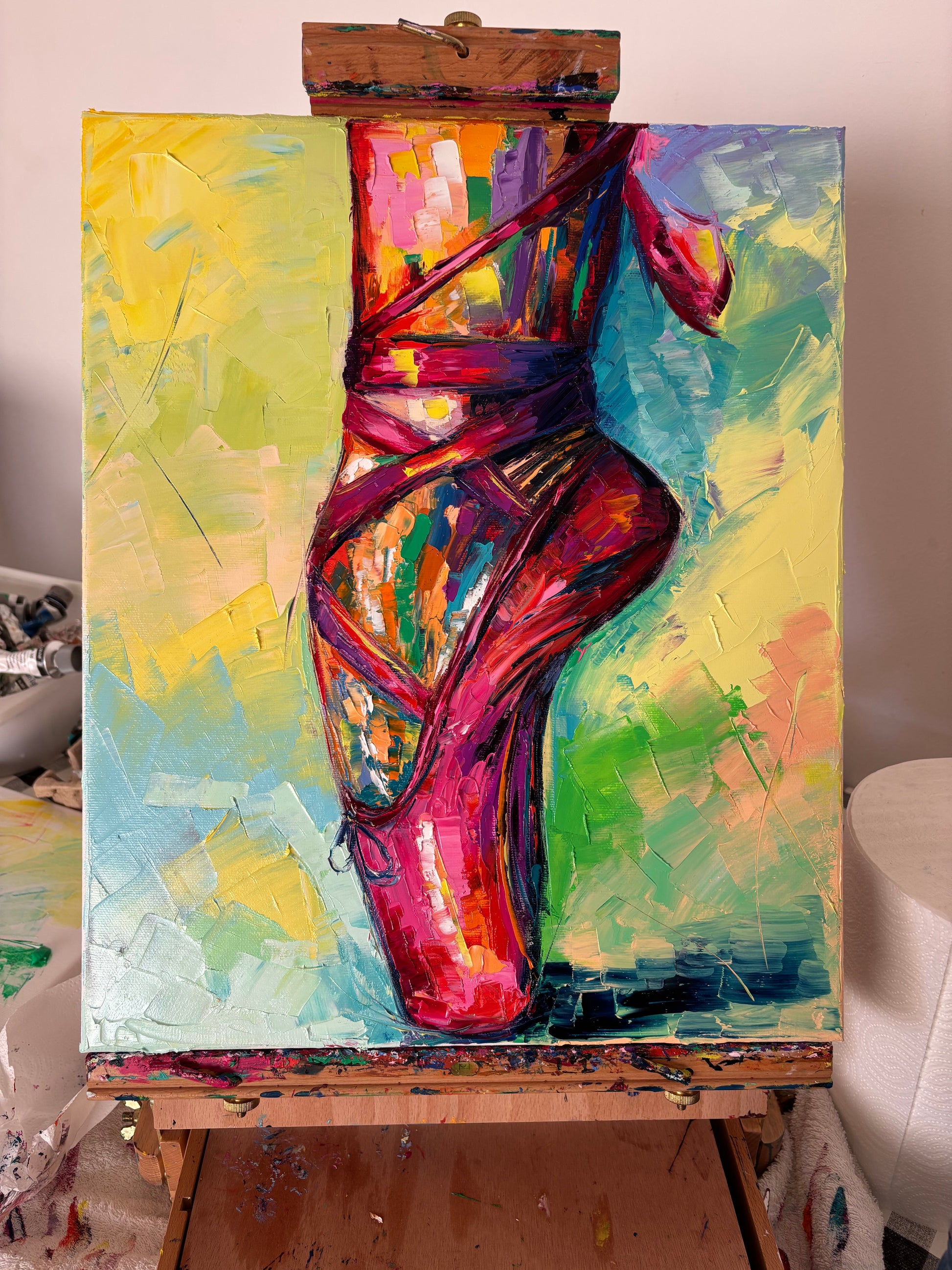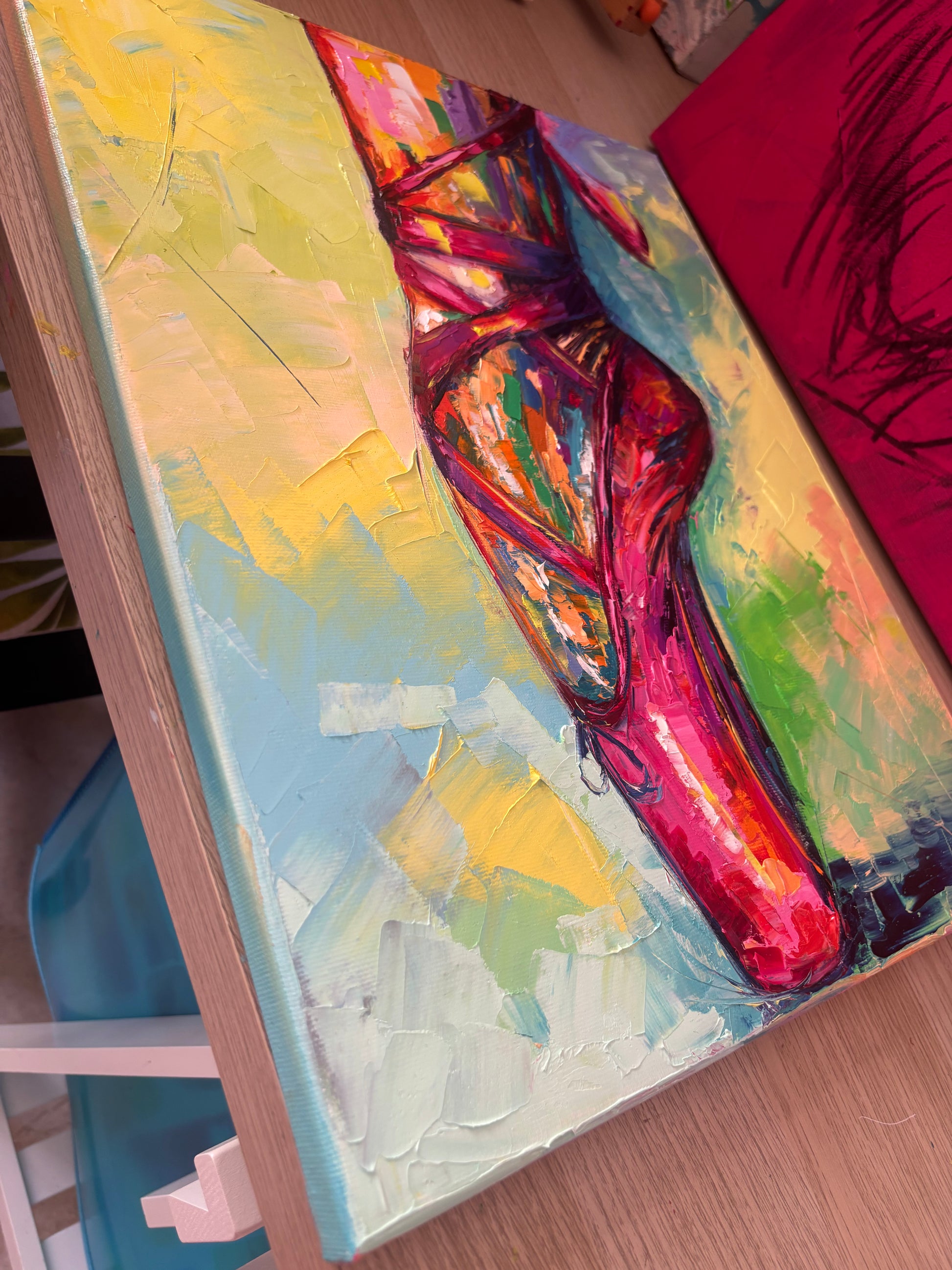 This oil-on-canvas piece, created with a palette knife, portrays the elegance and fragility of a ballerina’s foot en pointe. The vibrant strokes of crimson, pink, emerald, and turquoise contrast against a luminous background, evoking both beauty and tension. The shoe, glowing with intensity, becomes a metaphor for resilience—where discipline and grace coexist with the hidden scars of sacrifice. The silence of the stage conceals the struggles beneath, transforming pain into art.