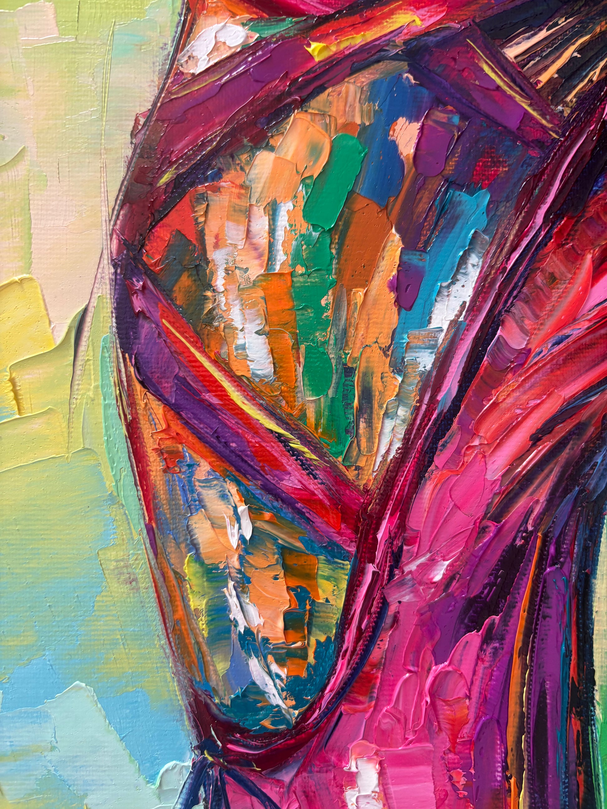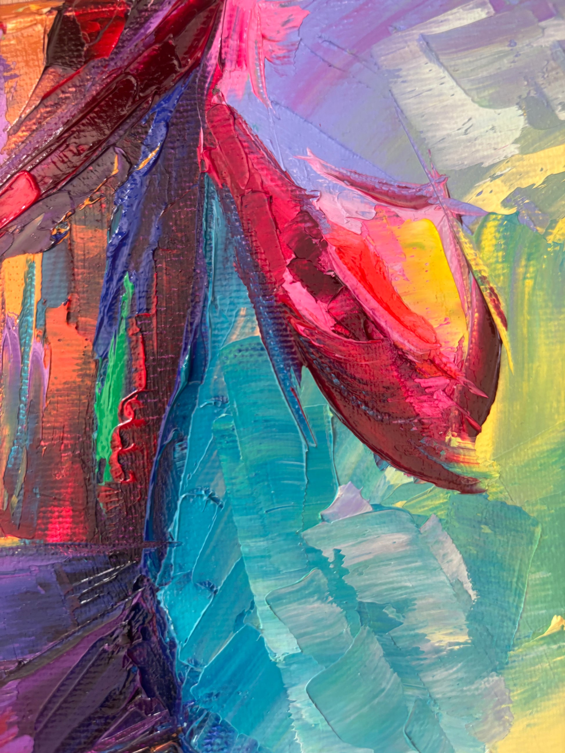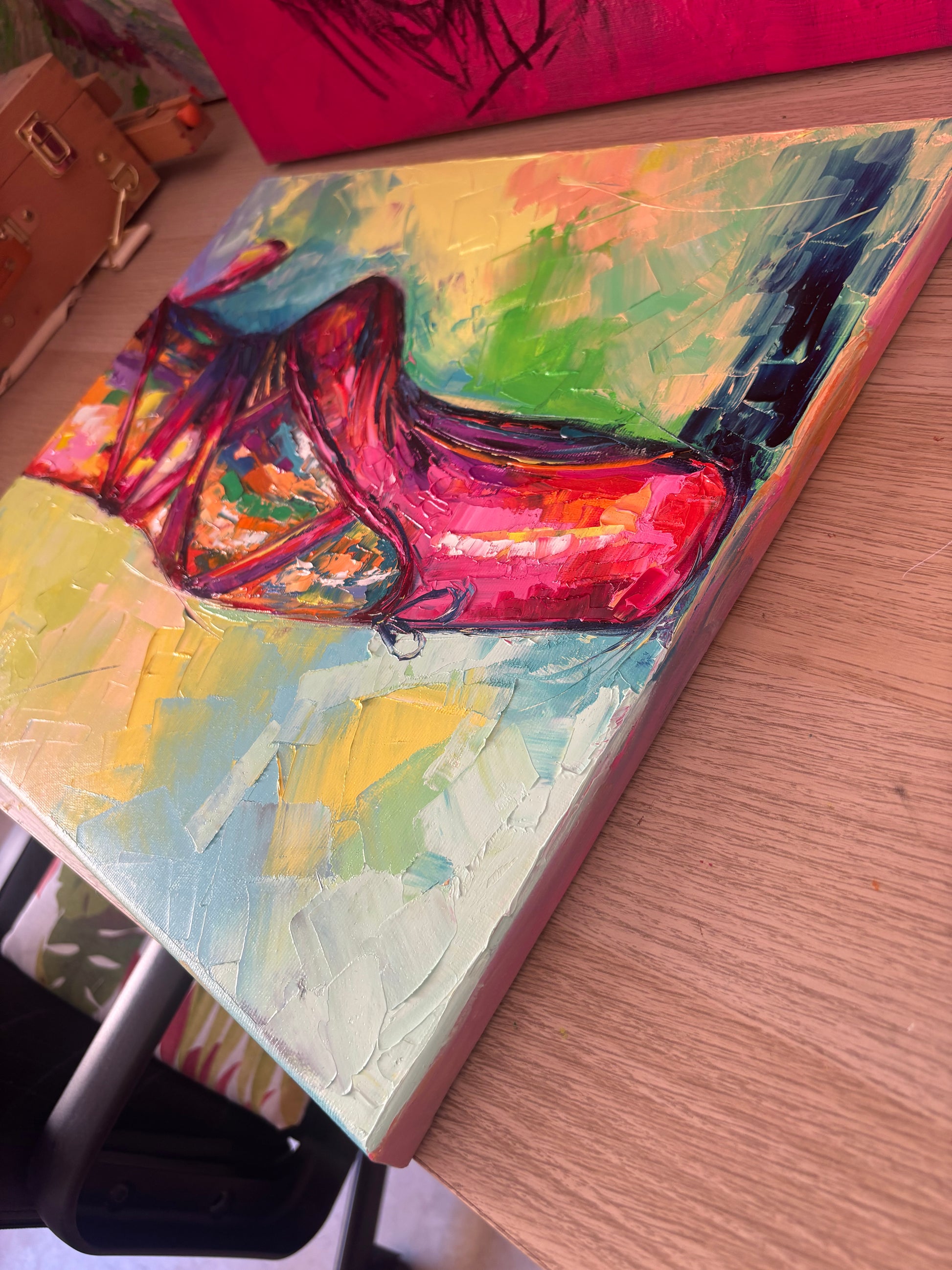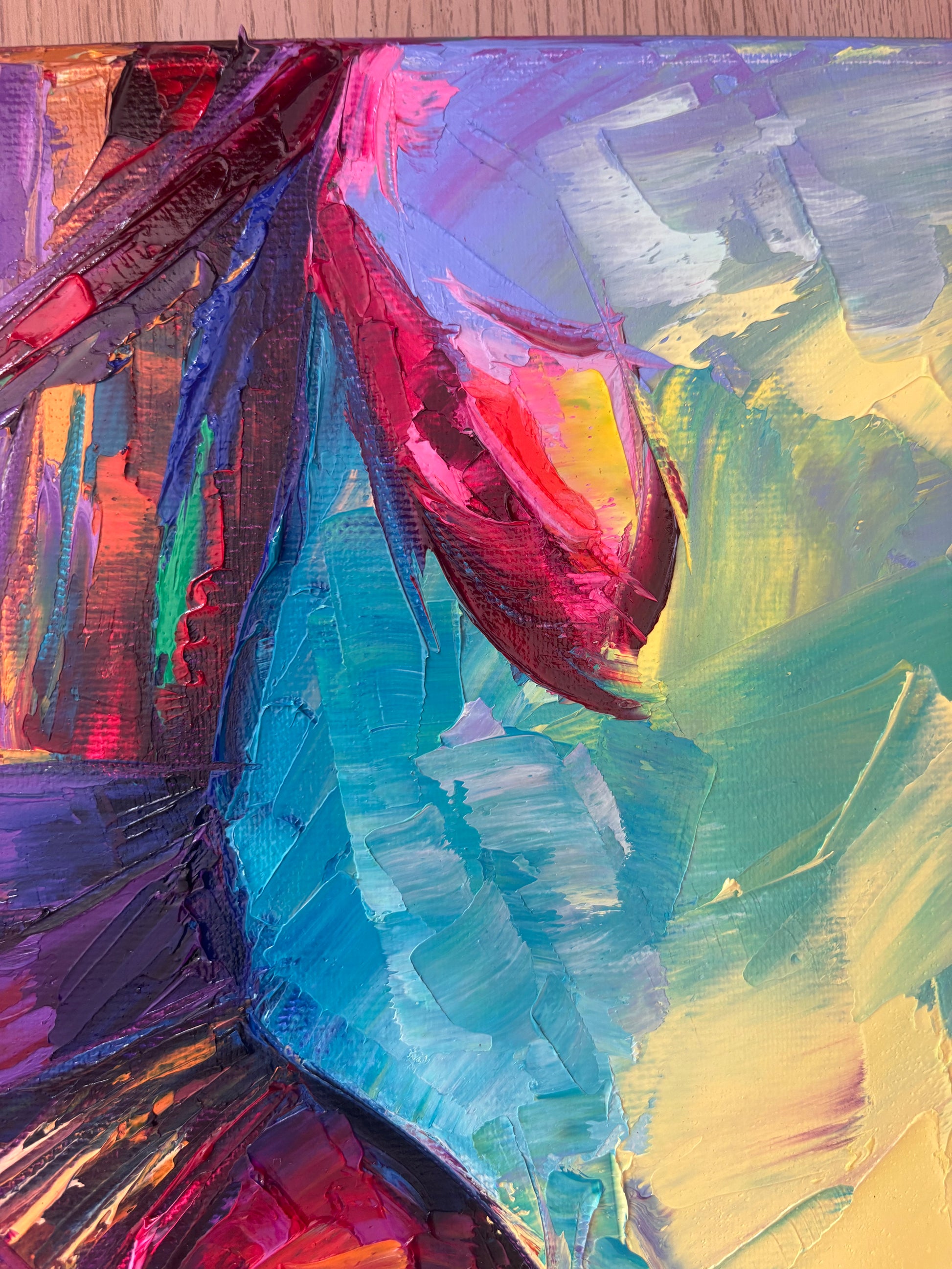 This oil-on-canvas piece, created with a palette knife, portrays the elegance and fragility of a ballerina’s foot en pointe. The vibrant strokes of crimson, pink, emerald, and turquoise contrast against a luminous background, evoking both beauty and tension. The shoe, glowing with intensity, becomes a metaphor for resilience—where discipline and grace coexist with the hidden scars of sacrifice. The silence of the stage conceals the struggles beneath, transforming pain into art.