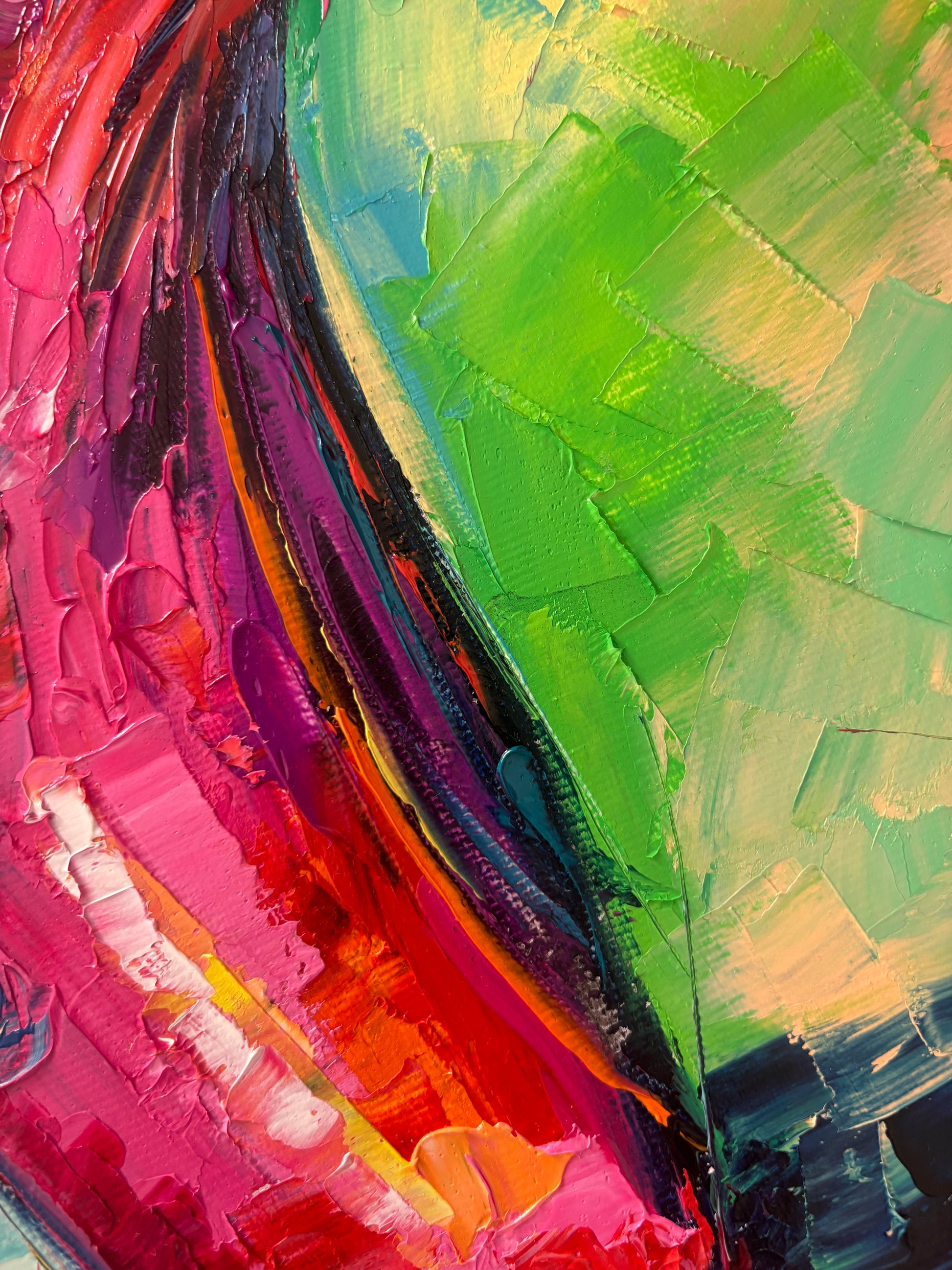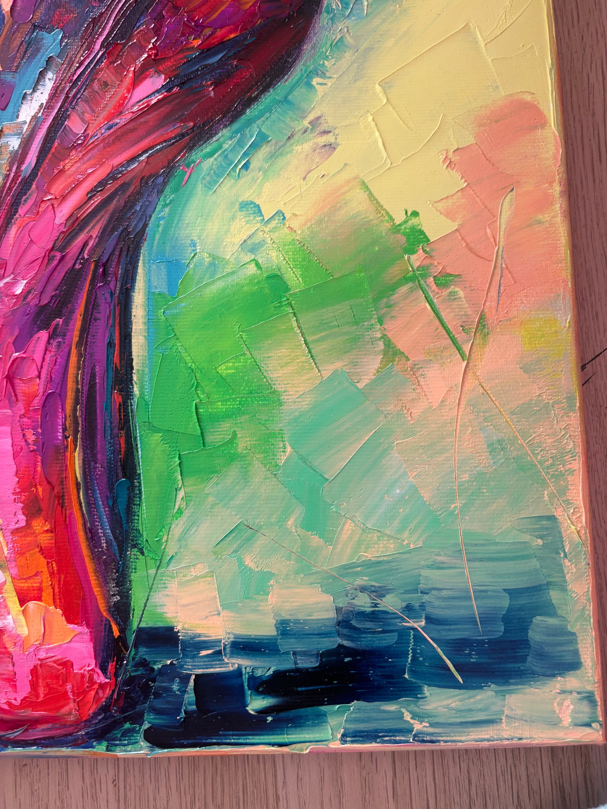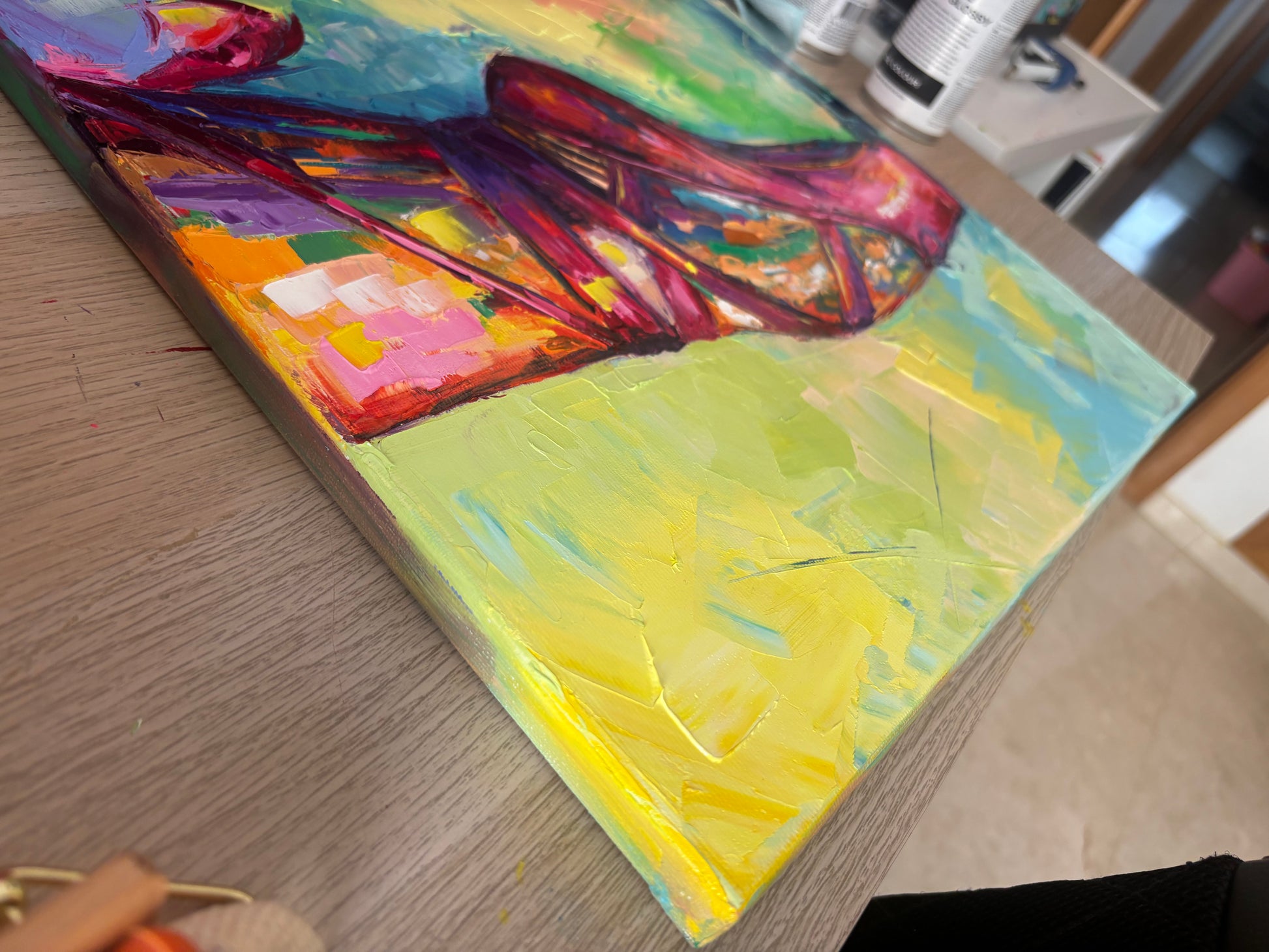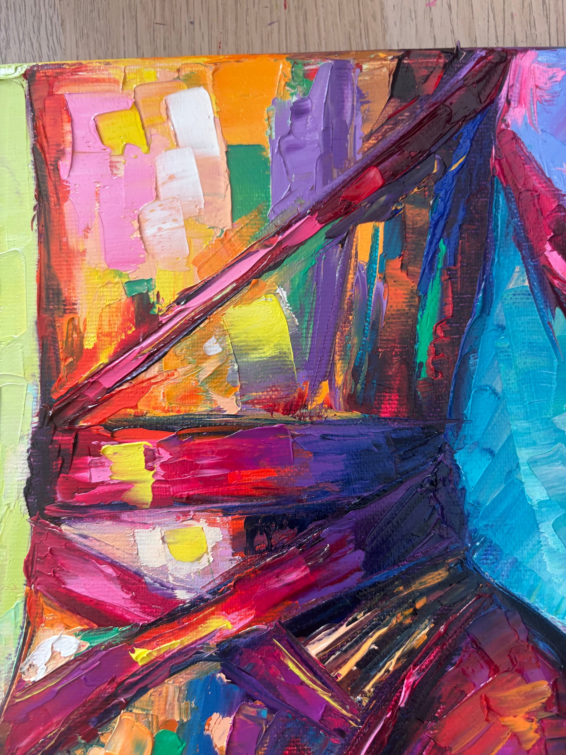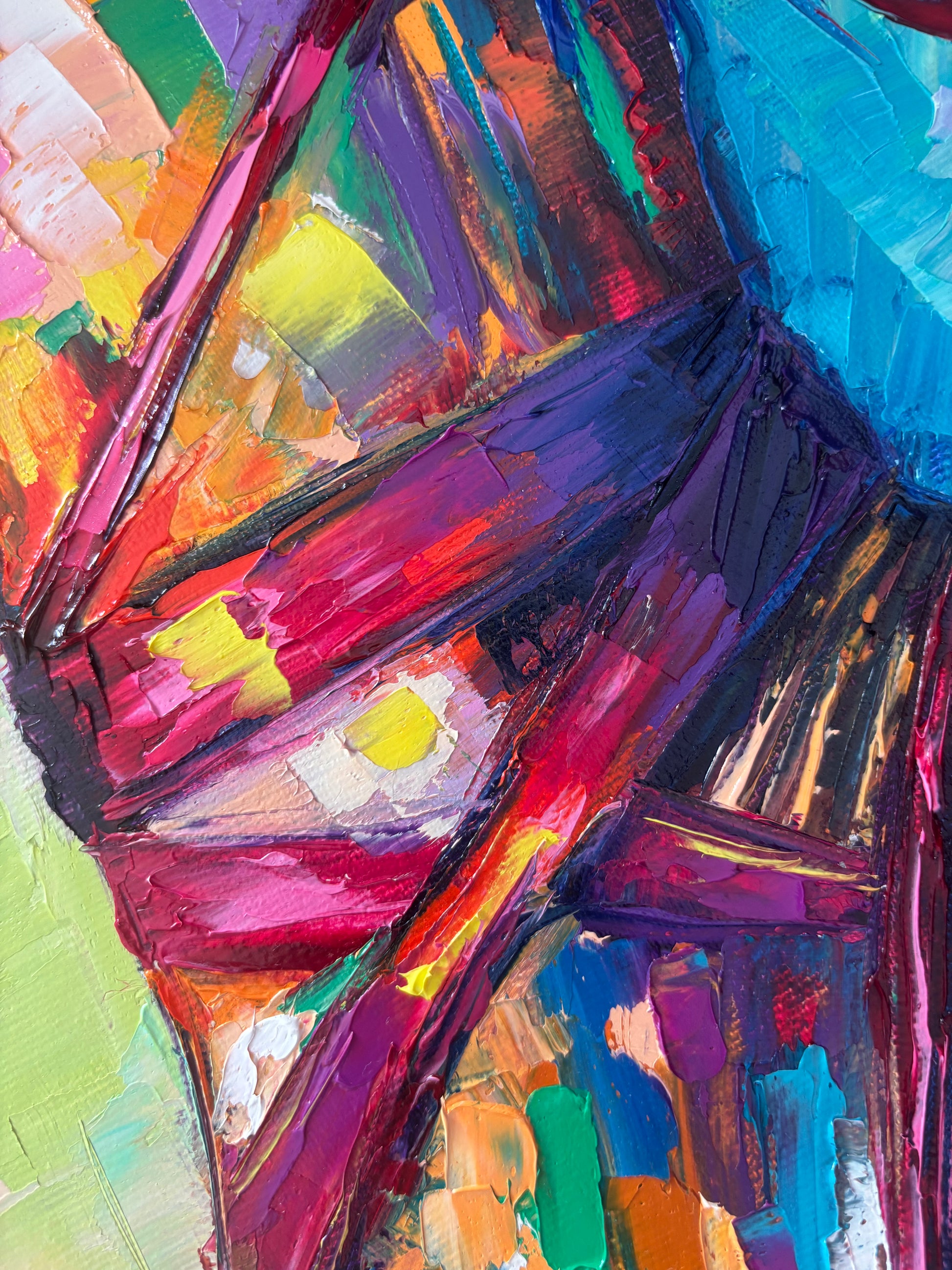 This oil-on-canvas piece, created with a palette knife, portrays the elegance and fragility of a ballerina’s foot en pointe. The vibrant strokes of crimson, pink, emerald, and turquoise contrast against a luminous background, evoking both beauty and tension. The shoe, glowing with intensity, becomes a metaphor for resilience—where discipline and grace coexist with the hidden scars of sacrifice. The silence of the stage conceals the struggles beneath, transforming pain into art.