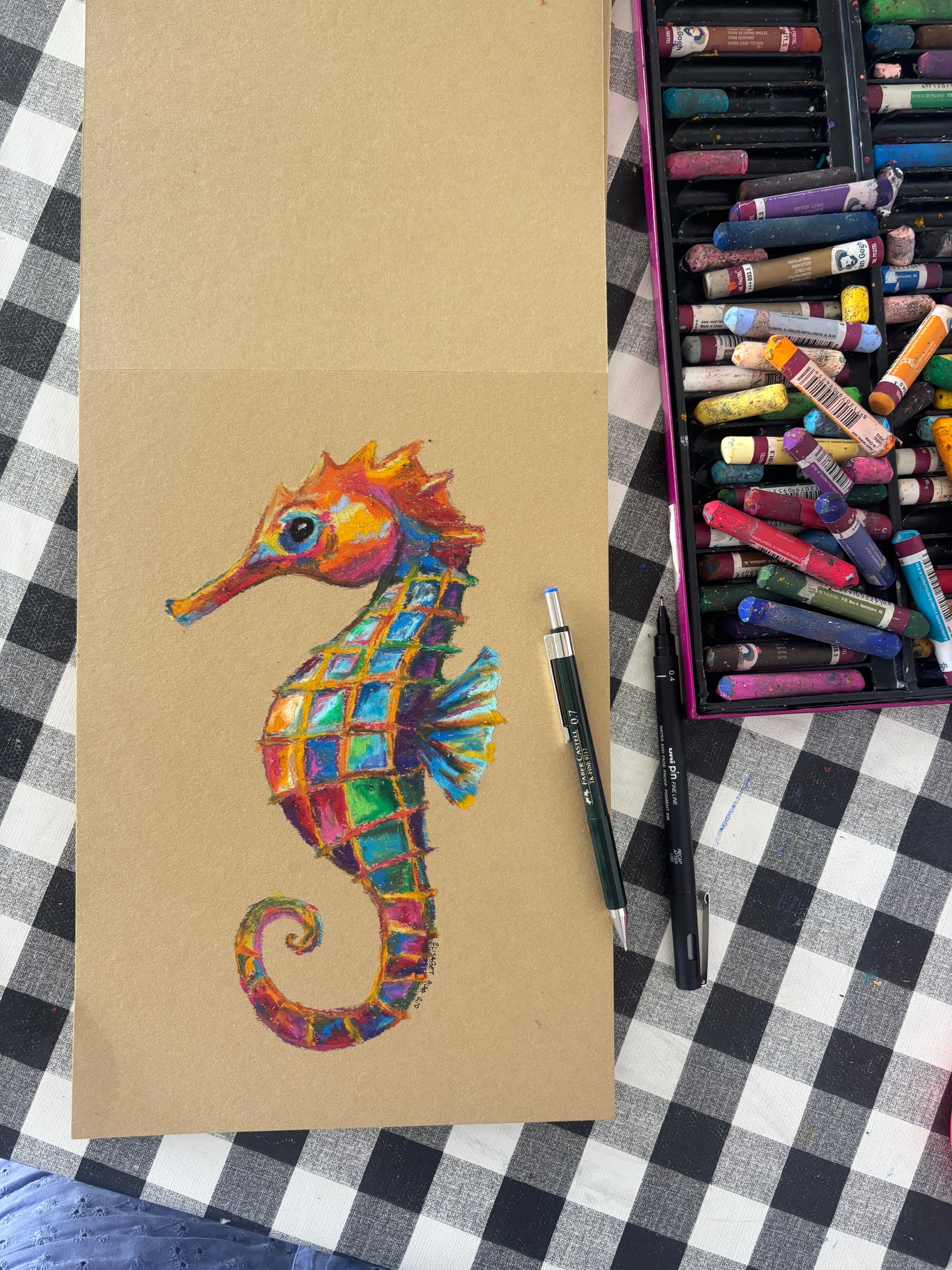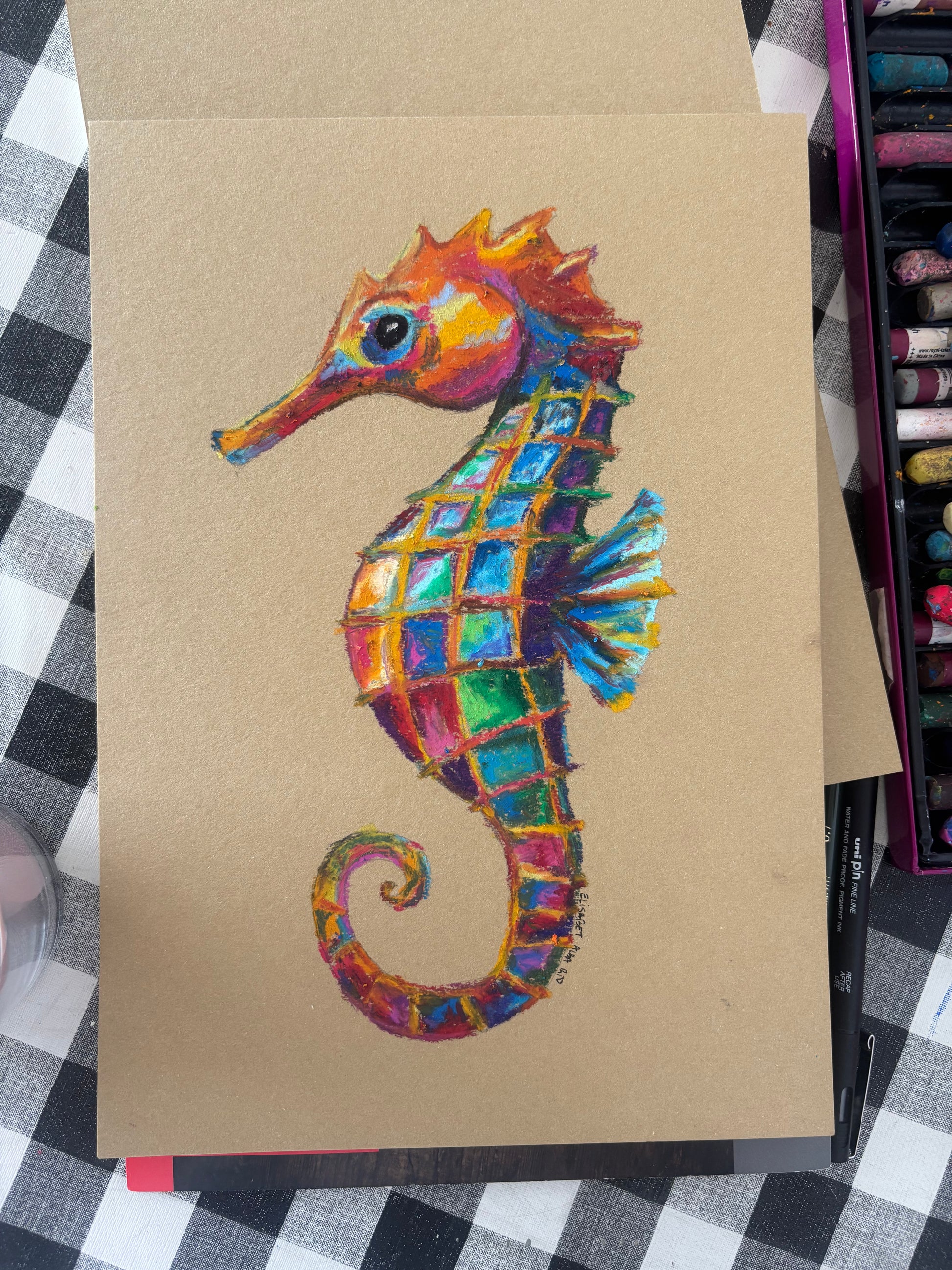 “Sea Whisper” captures the delicate magic of a seahorse, a creature long regarded as a symbol of patience, protection, and quiet strength. Created with vibrant oil pastels, this piece blends luminous colors and expressive textures to evoke the gentle rhythm of the sea. The composition invites the viewer to listen closely — as if the ocean itself were whispering secrets of calm and resilience through the figure of the seahorse.