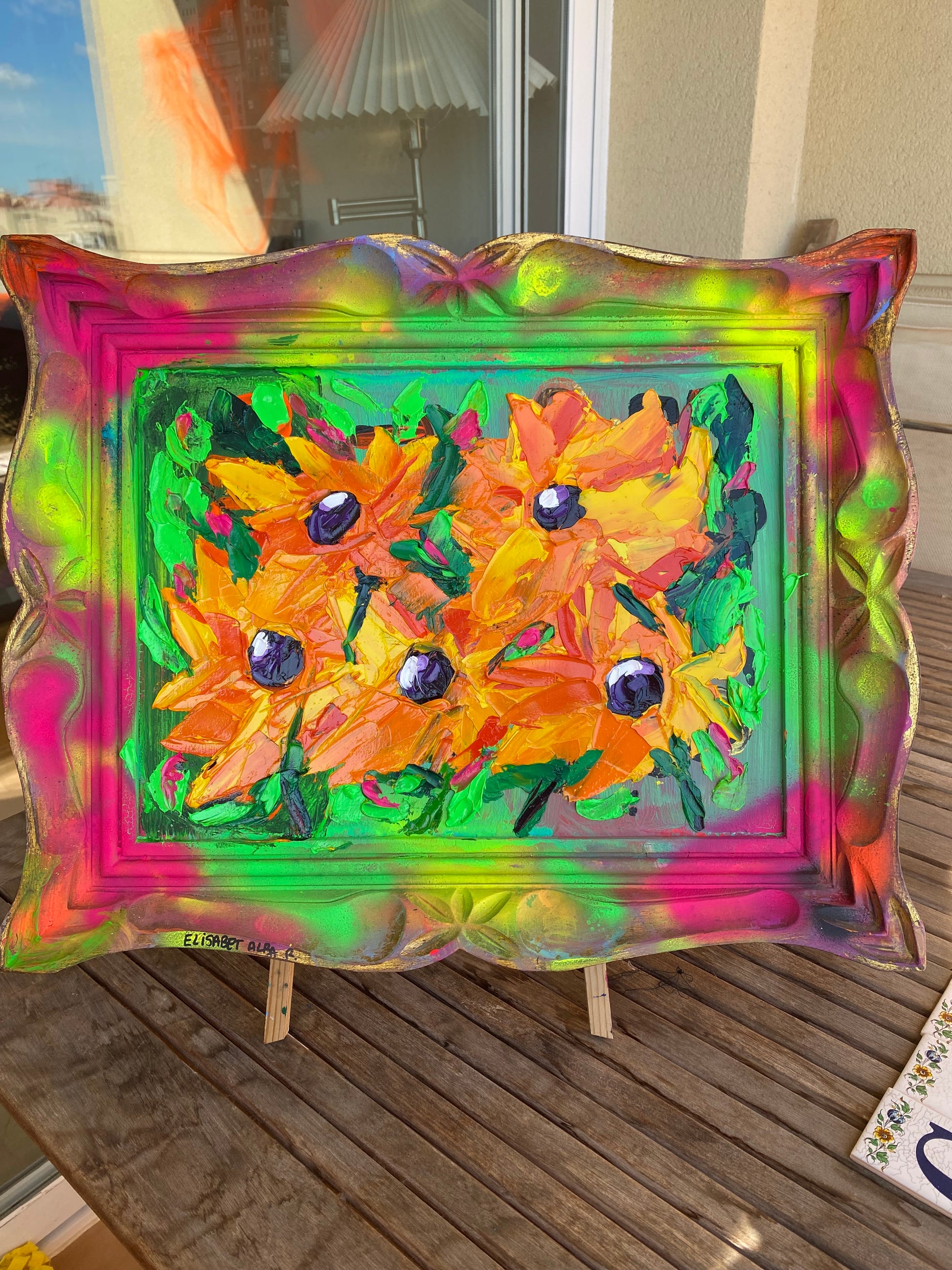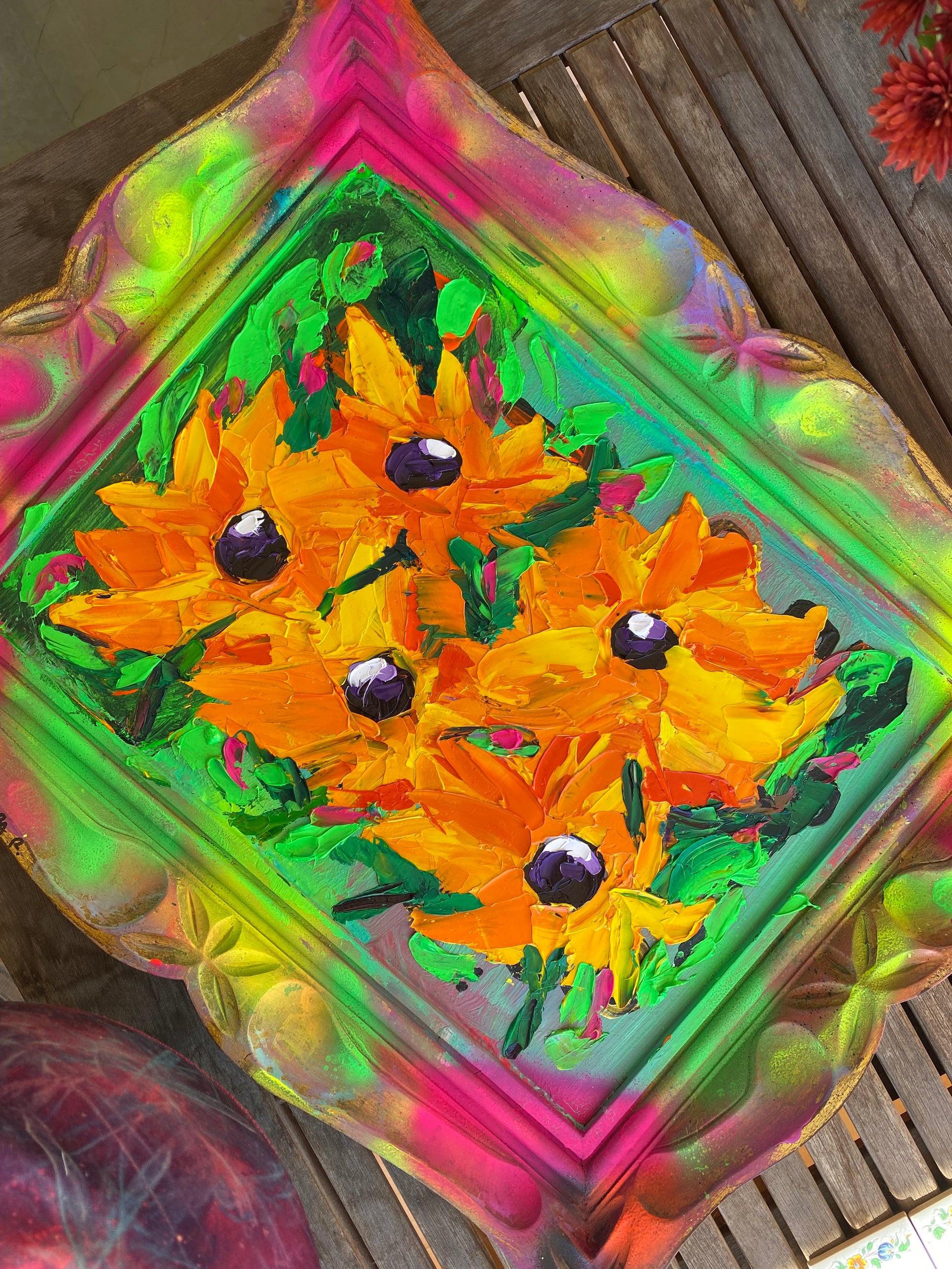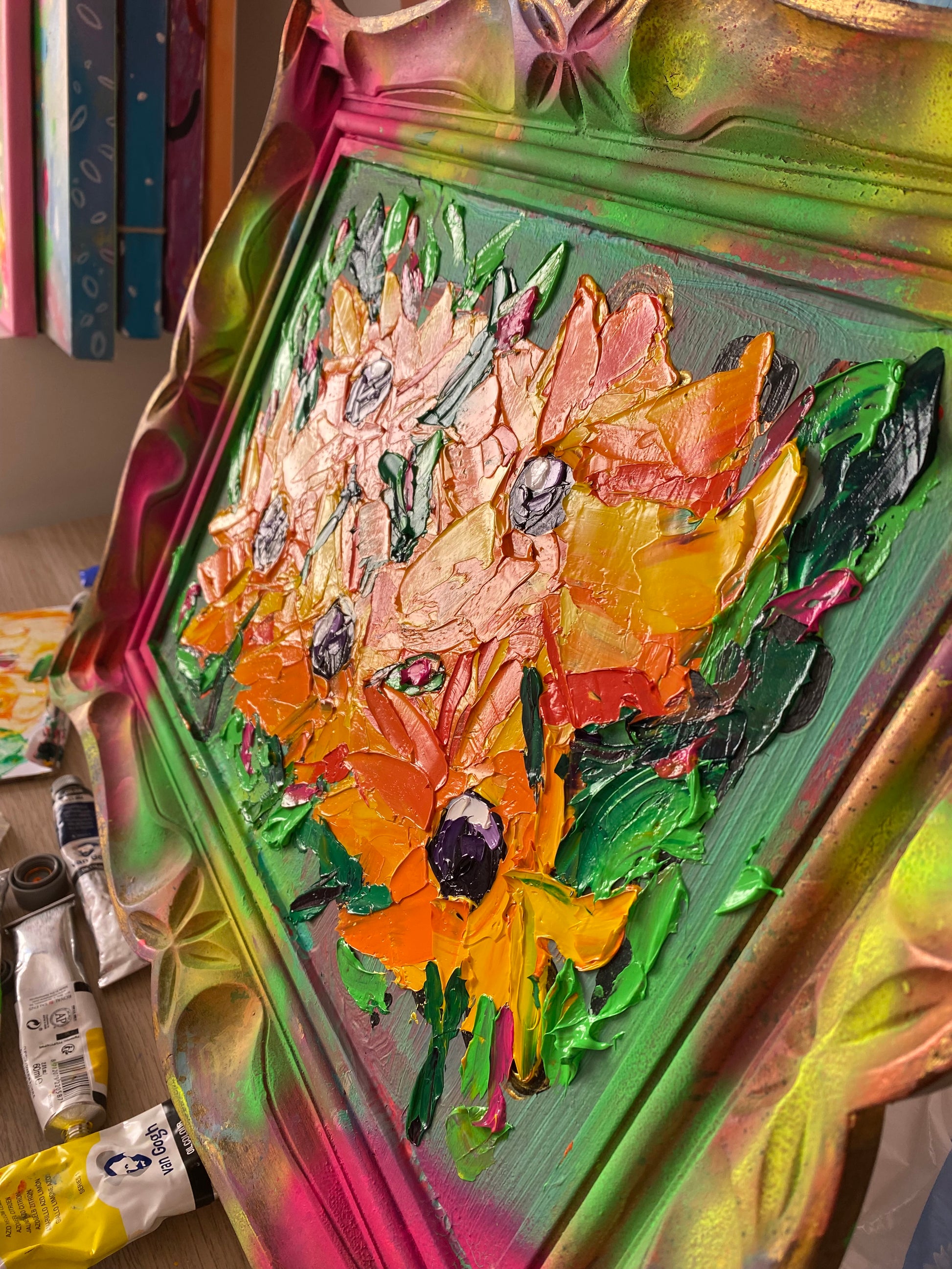 This expressive floral artwork is painted in oil on wood, nestled within a vintage frame that has been revitalized with vibrant spray paint. Bold palette knife strokes bring the flowers to life with rich texture and luminous energy. Self Love is a tribute to personal growth, radiant confidence, and the beauty of blooming in your own colors.