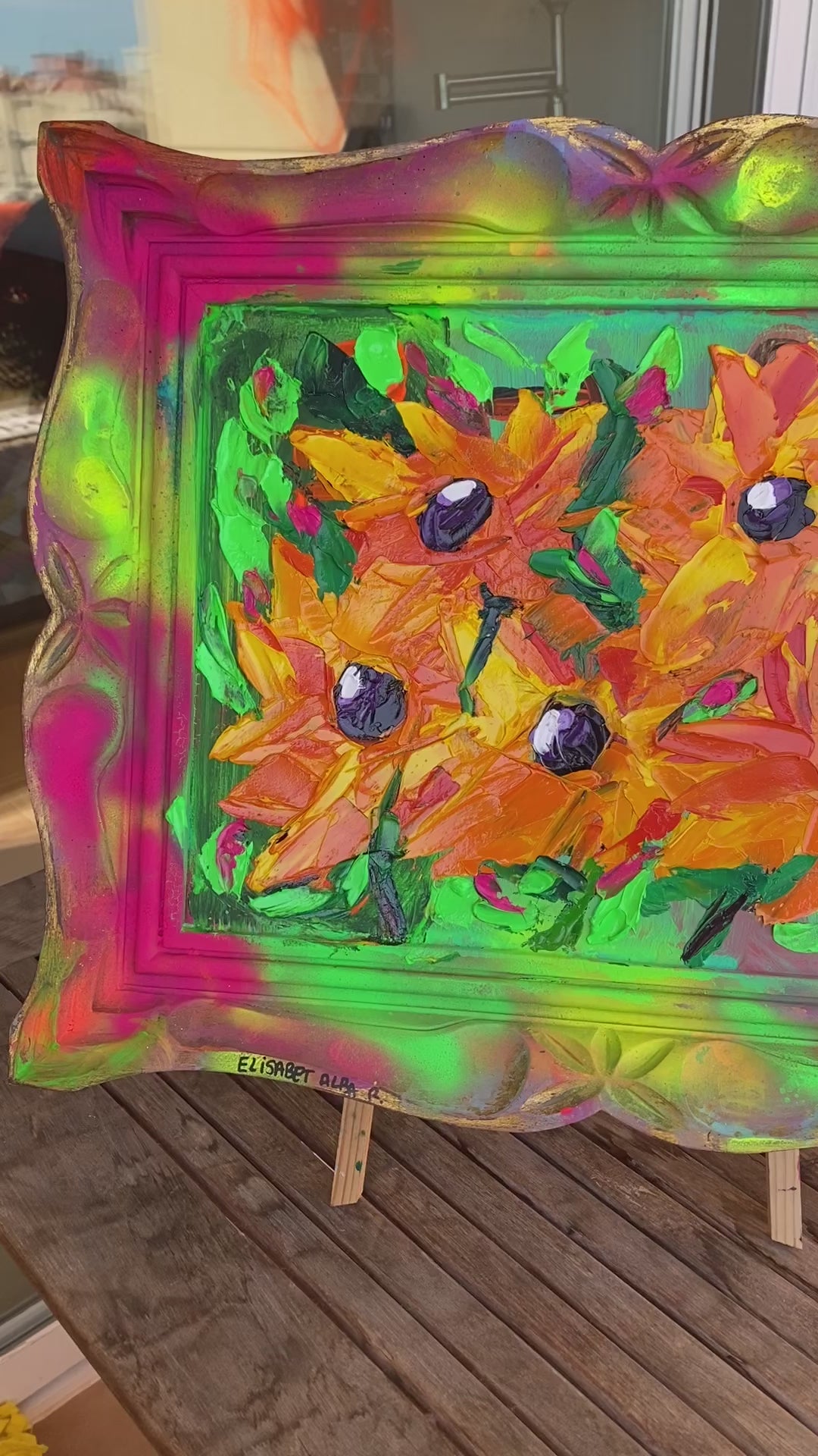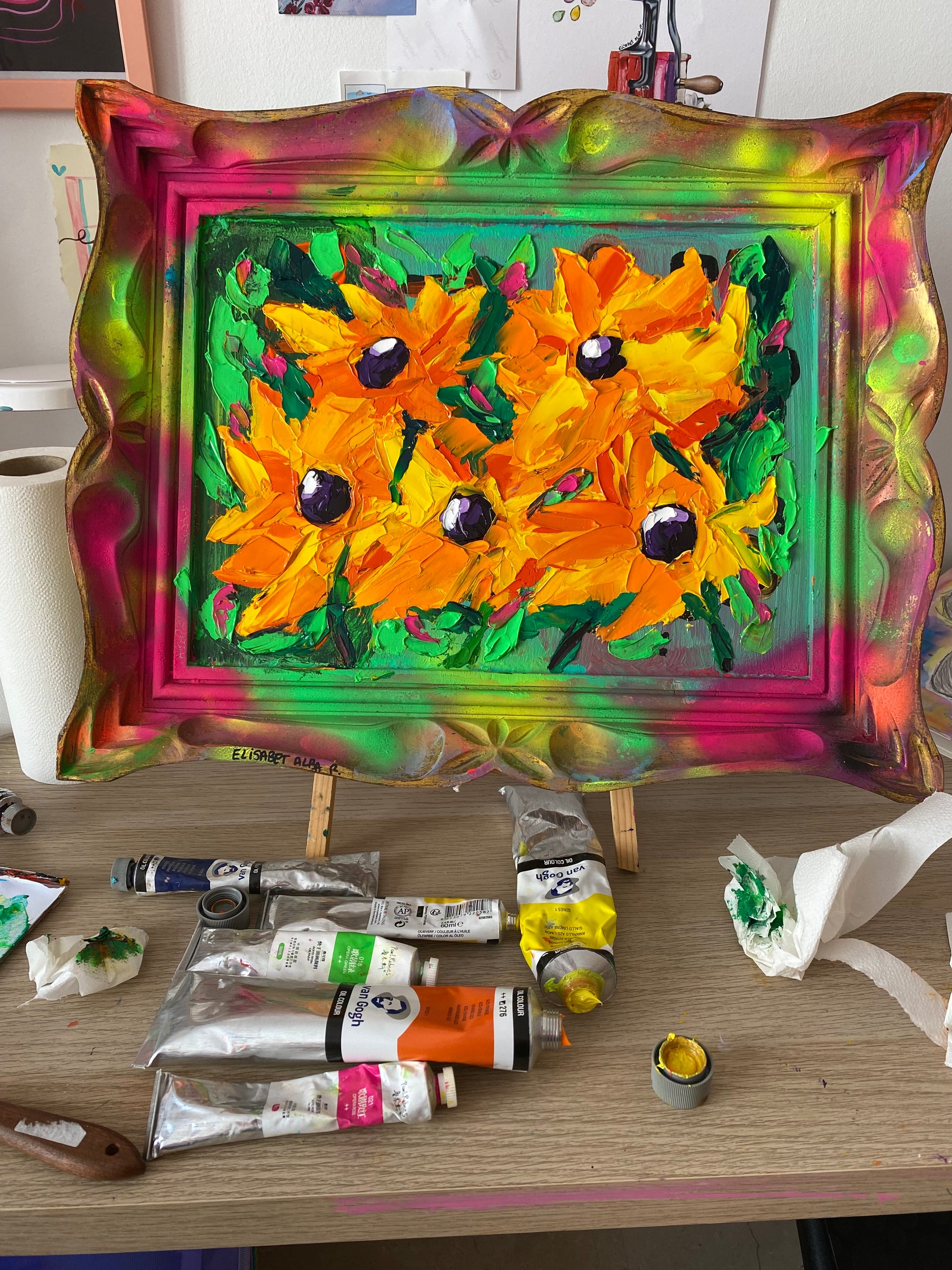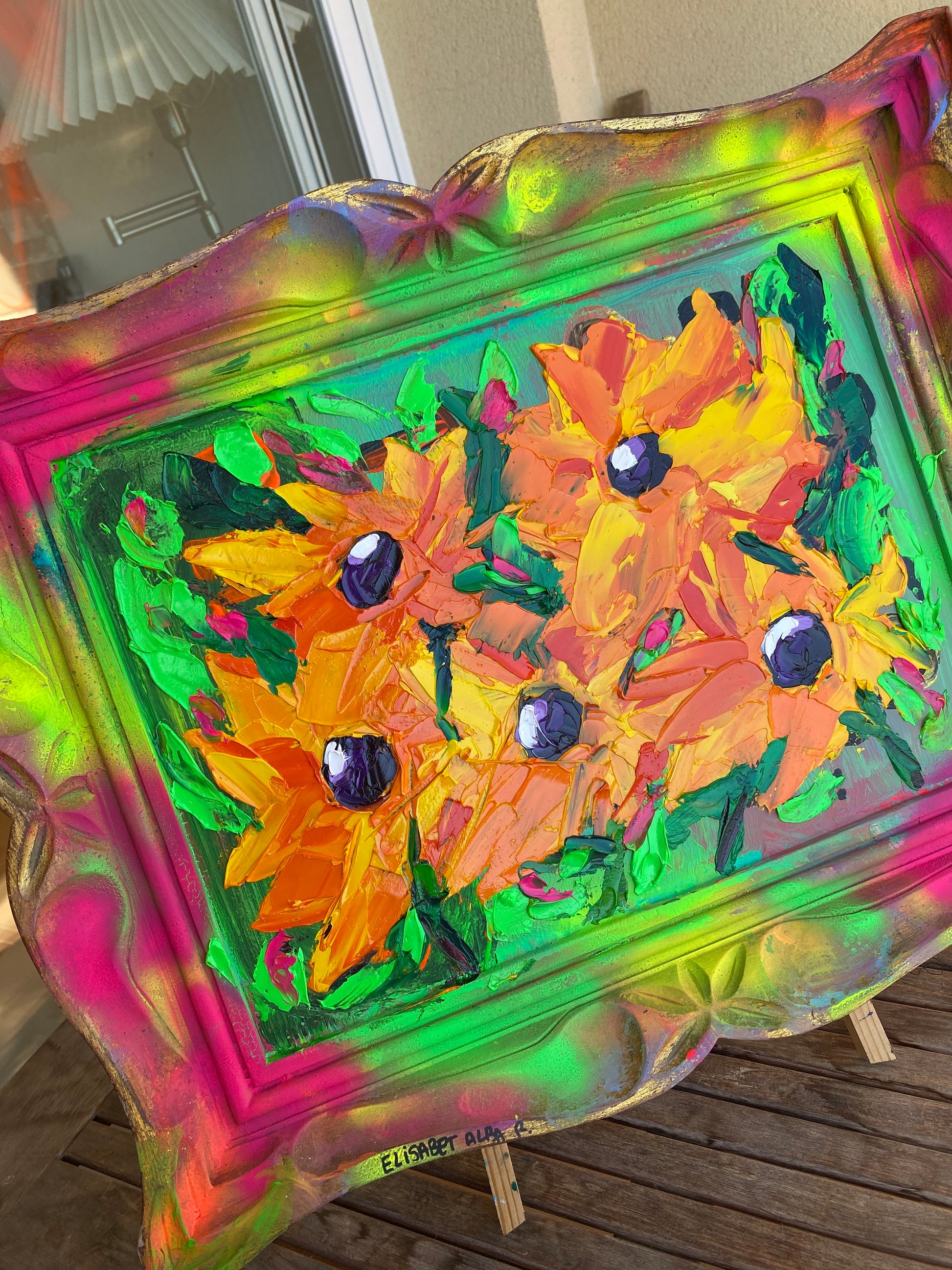 This expressive floral artwork is painted in oil on wood, nestled within a vintage frame that has been revitalized with vibrant spray paint. Bold palette knife strokes bring the flowers to life with rich texture and luminous energy. Self Love is a tribute to personal growth, radiant confidence, and the beauty of blooming in your own colors.