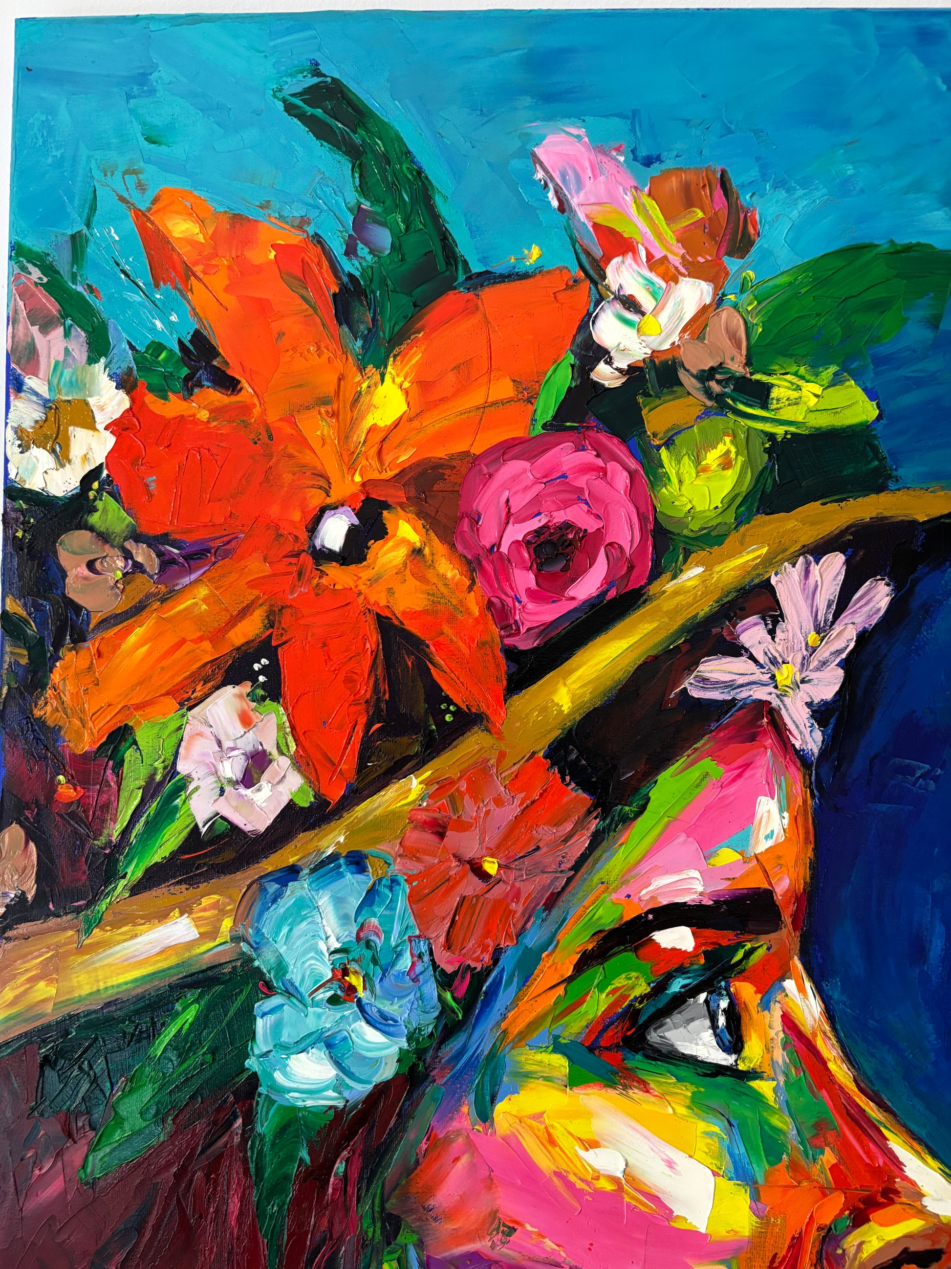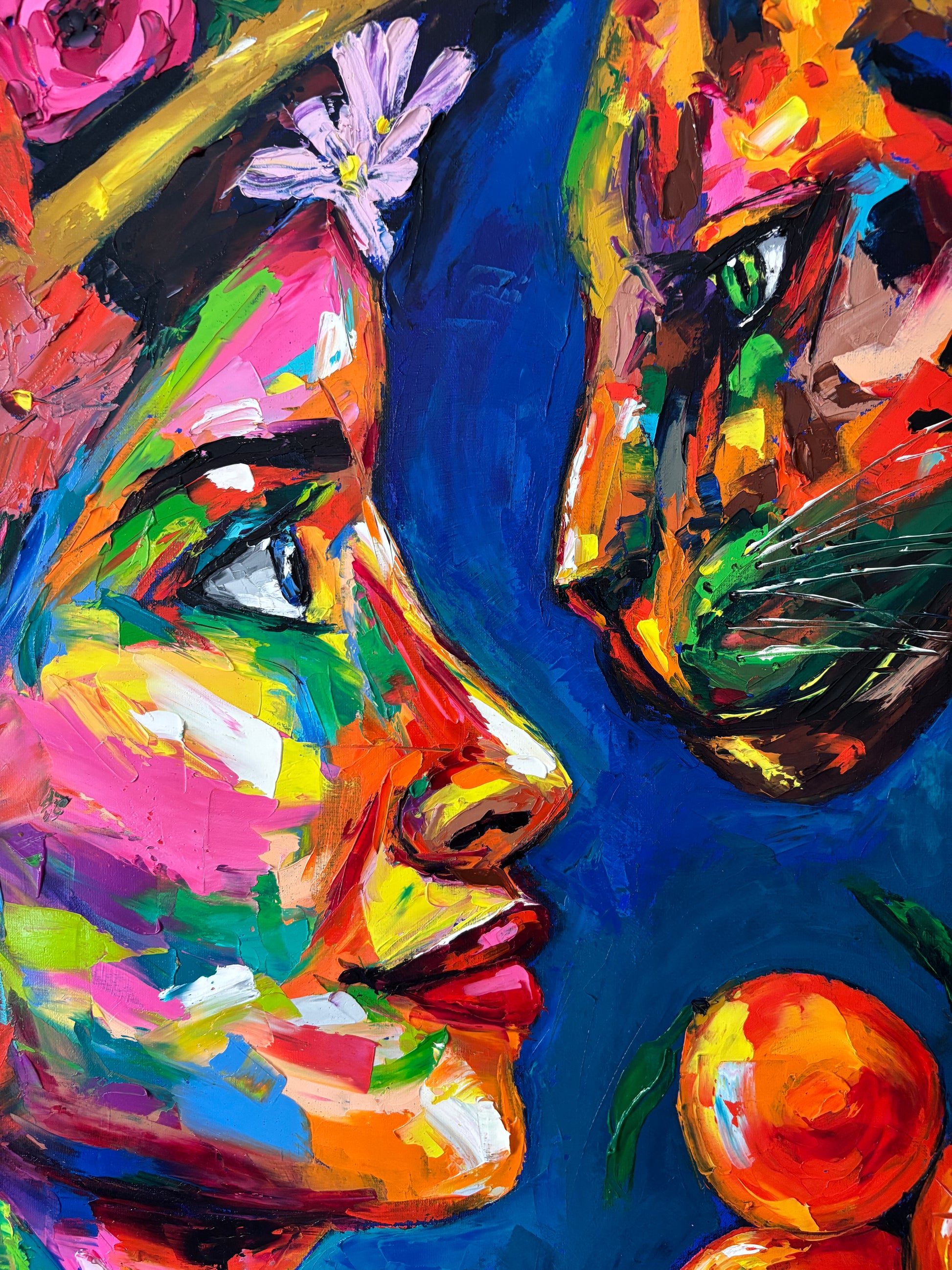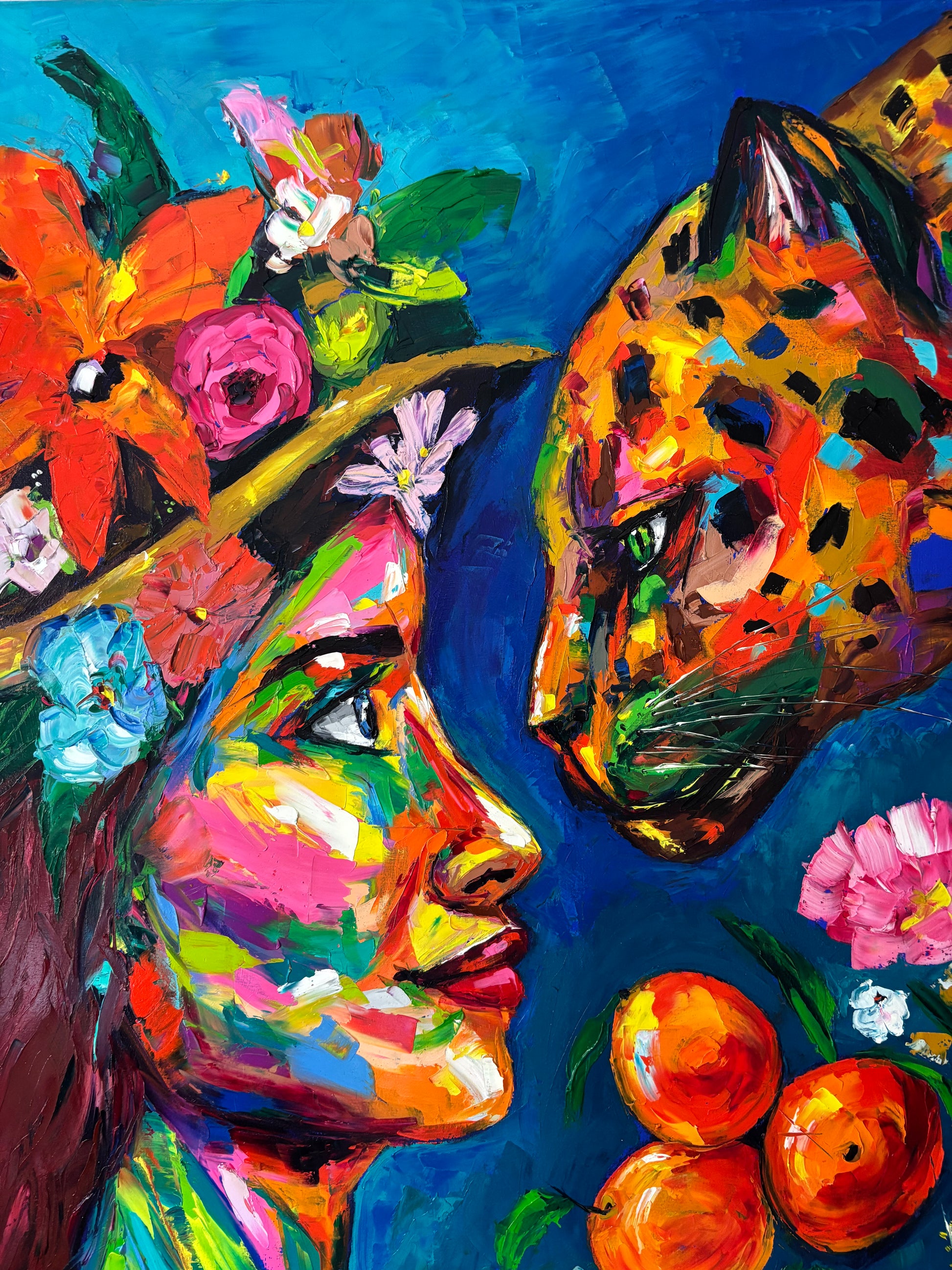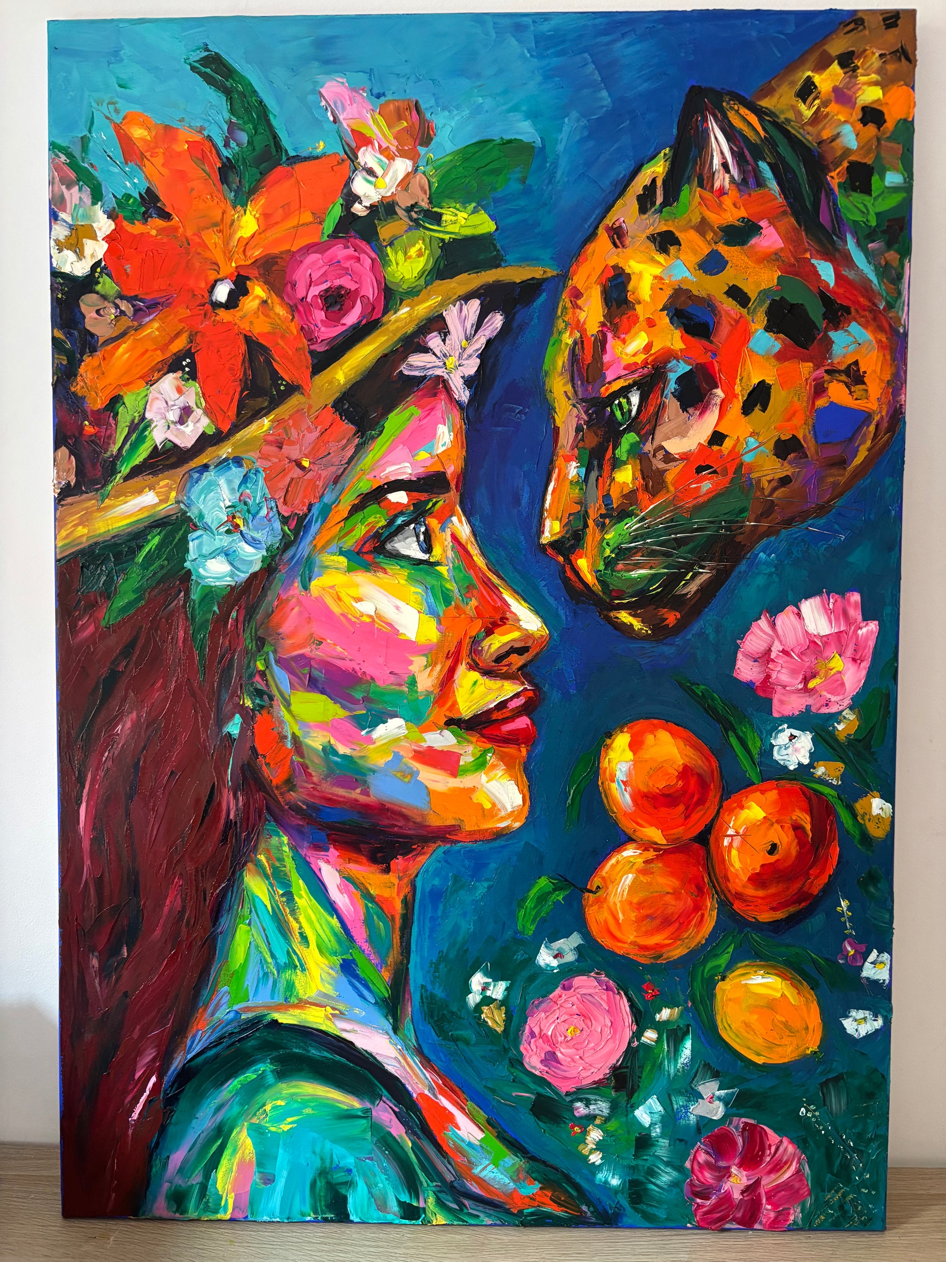 “She Wears the Wild Like a Crown” is a captivating oil-on-canvas that celebrates the raw beauty and strength of femininity in harmony with nature. With bold palette knife strokes and radiant colors, the portrait depicts a woman adorned with a crown of flowers, locked in an intense yet gentle gaze with a powerful leopard. Vibrant oranges and blossoms add richness and symbolism, evoking vitality, courage, and abundance. This textured artwork is a striking tribute to the untamed spirit, where grace and wilderness meet in perfect balance.