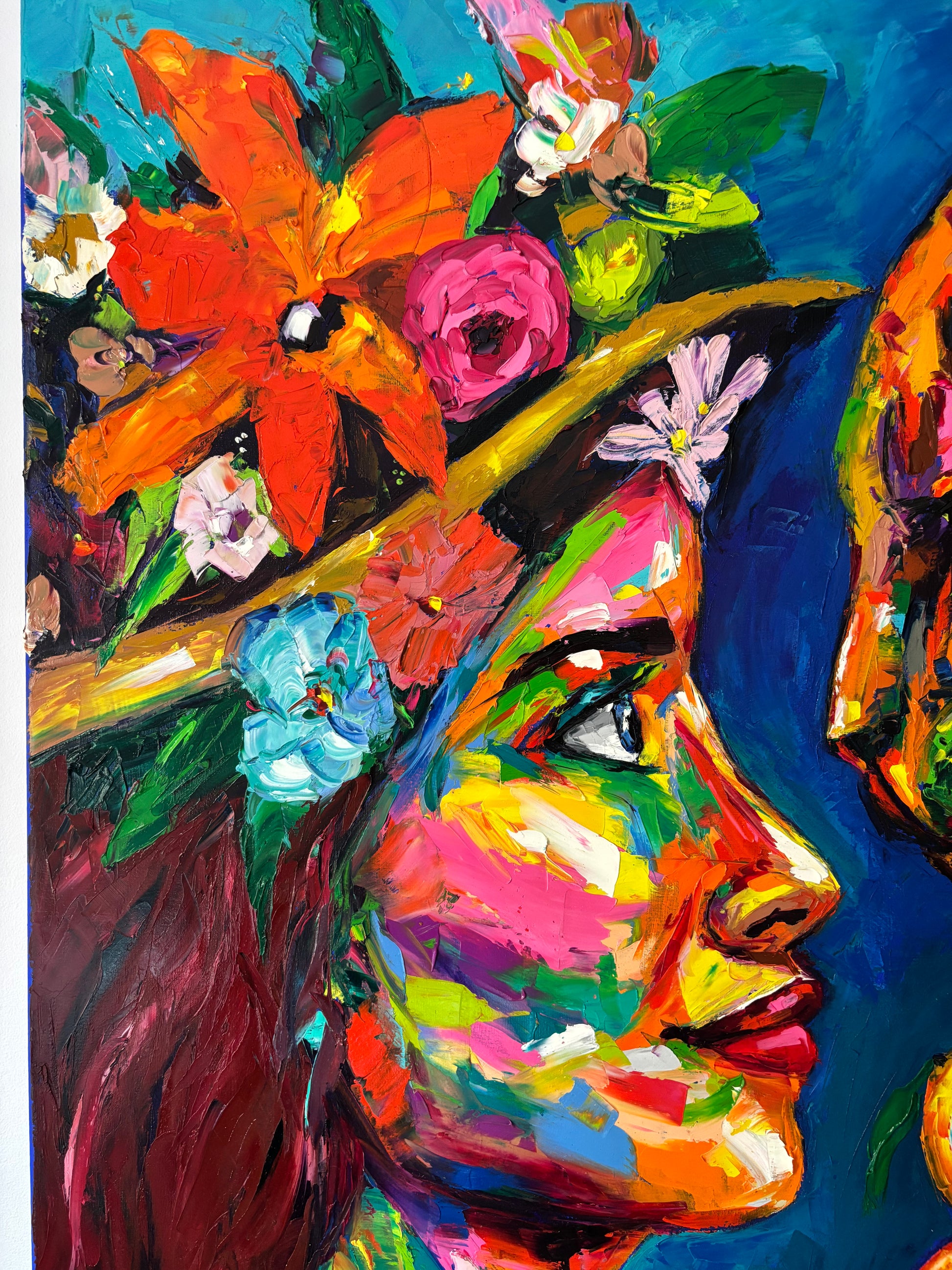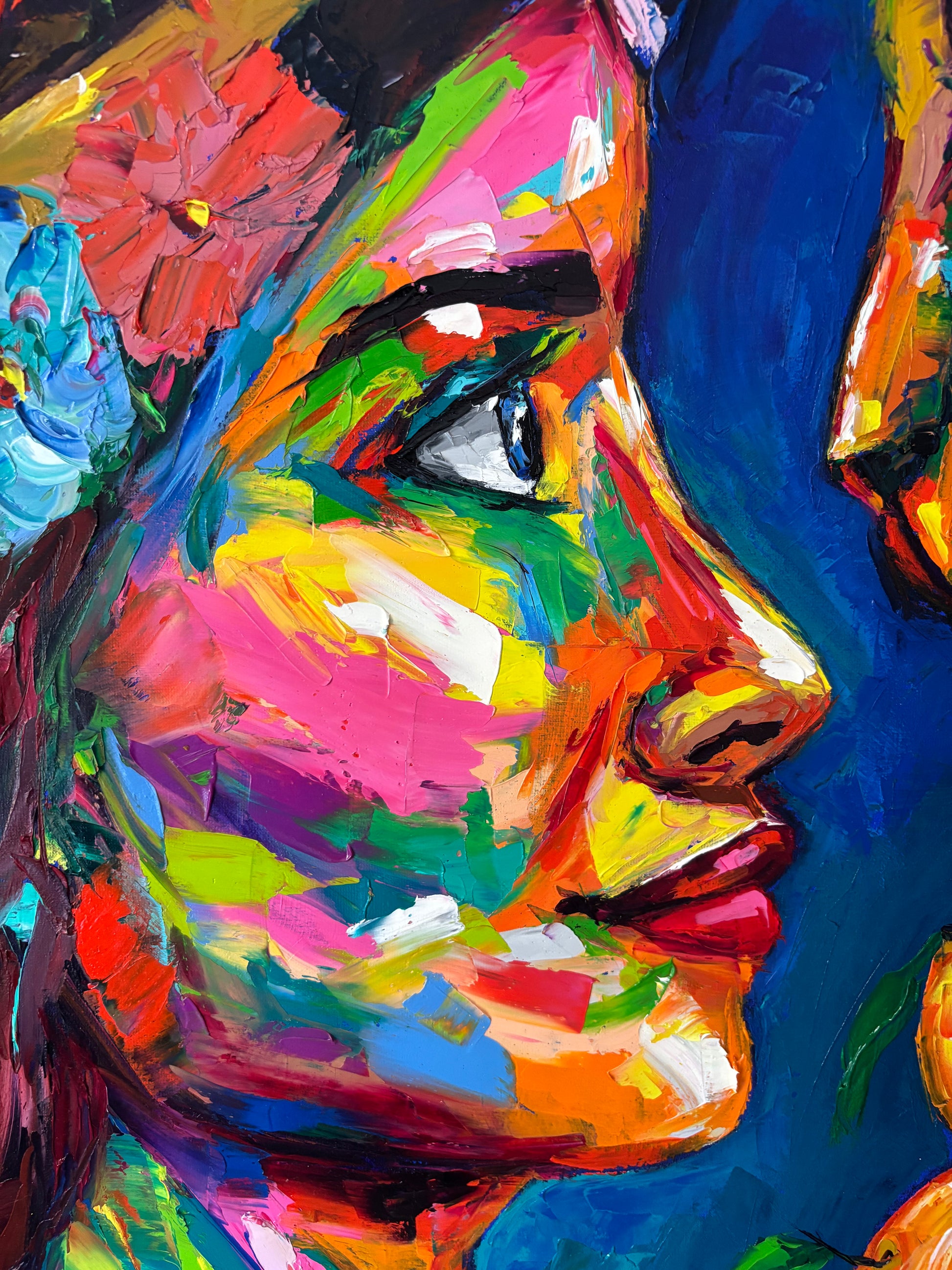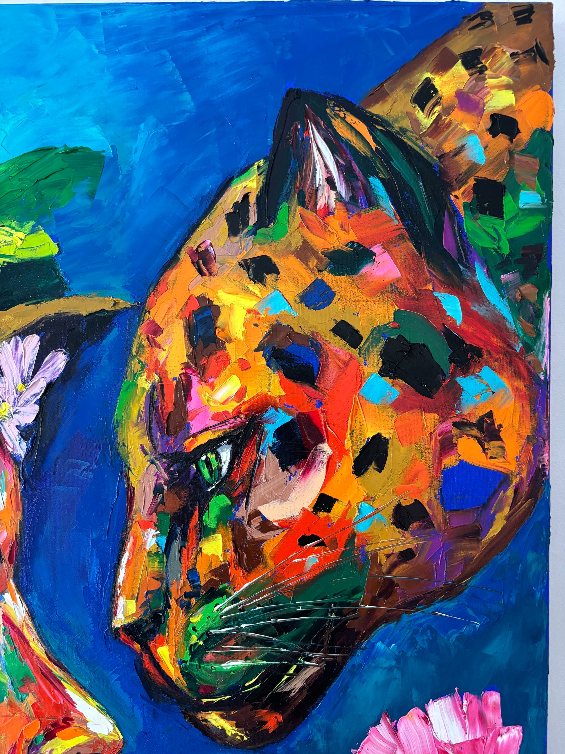 “She Wears the Wild Like a Crown” is a captivating oil-on-canvas that celebrates the raw beauty and strength of femininity in harmony with nature. With bold palette knife strokes and radiant colors, the portrait depicts a woman adorned with a crown of flowers, locked in an intense yet gentle gaze with a powerful leopard. Vibrant oranges and blossoms add richness and symbolism, evoking vitality, courage, and abundance. This textured artwork is a striking tribute to the untamed spirit, where grace and wilderness meet in perfect balance.