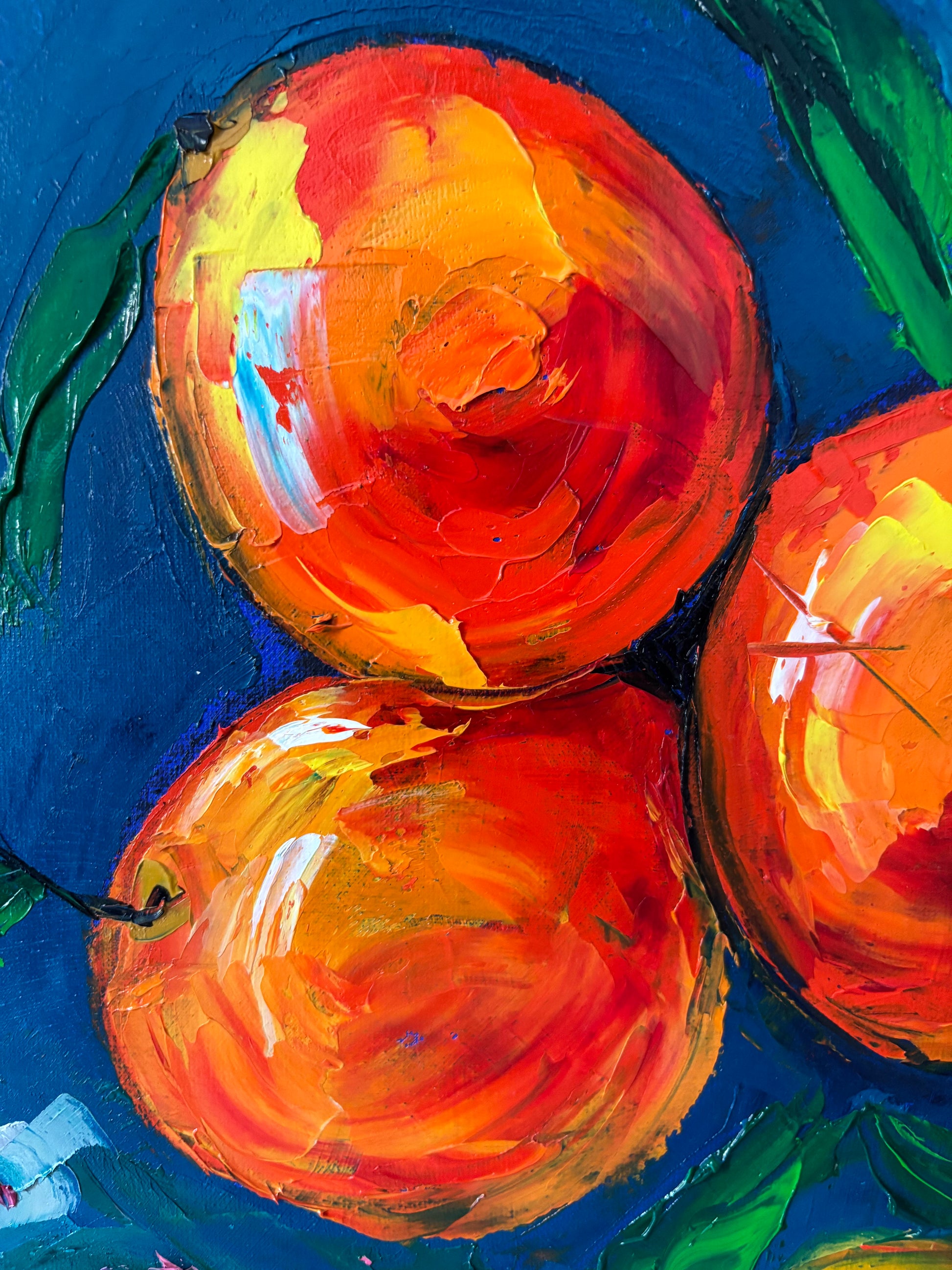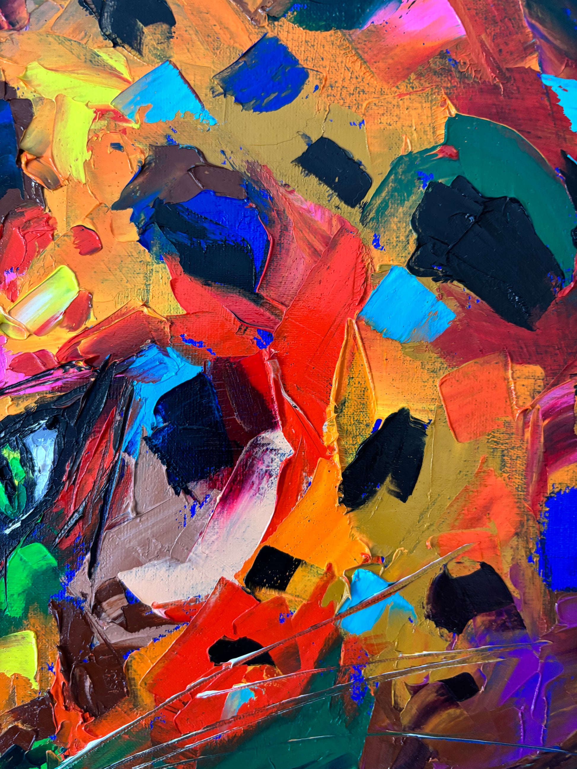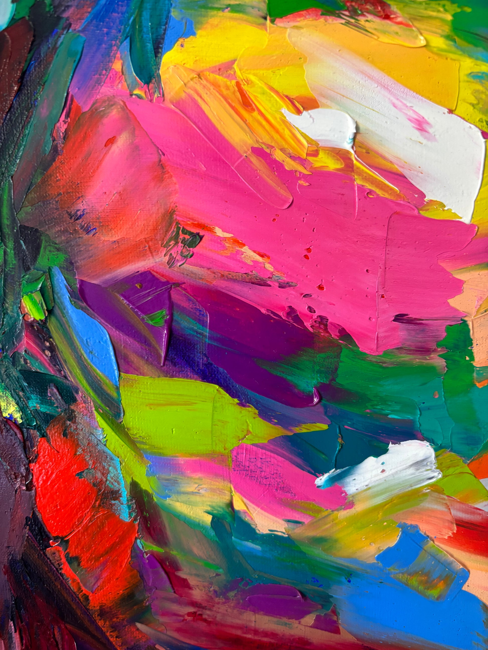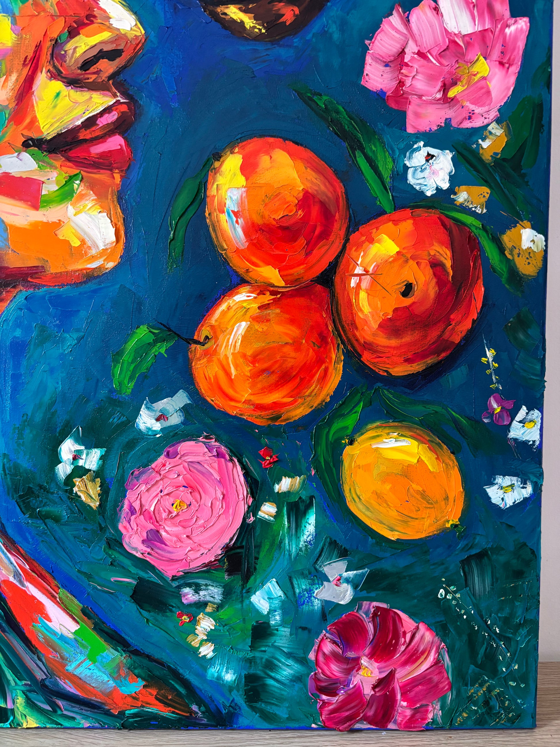 “She Wears the Wild Like a Crown” is a captivating oil-on-canvas that celebrates the raw beauty and strength of femininity in harmony with nature. With bold palette knife strokes and radiant colors, the portrait depicts a woman adorned with a crown of flowers, locked in an intense yet gentle gaze with a powerful leopard. Vibrant oranges and blossoms add richness and symbolism, evoking vitality, courage, and abundance. This textured artwork is a striking tribute to the untamed spirit, where grace and wilderness meet in perfect balance.