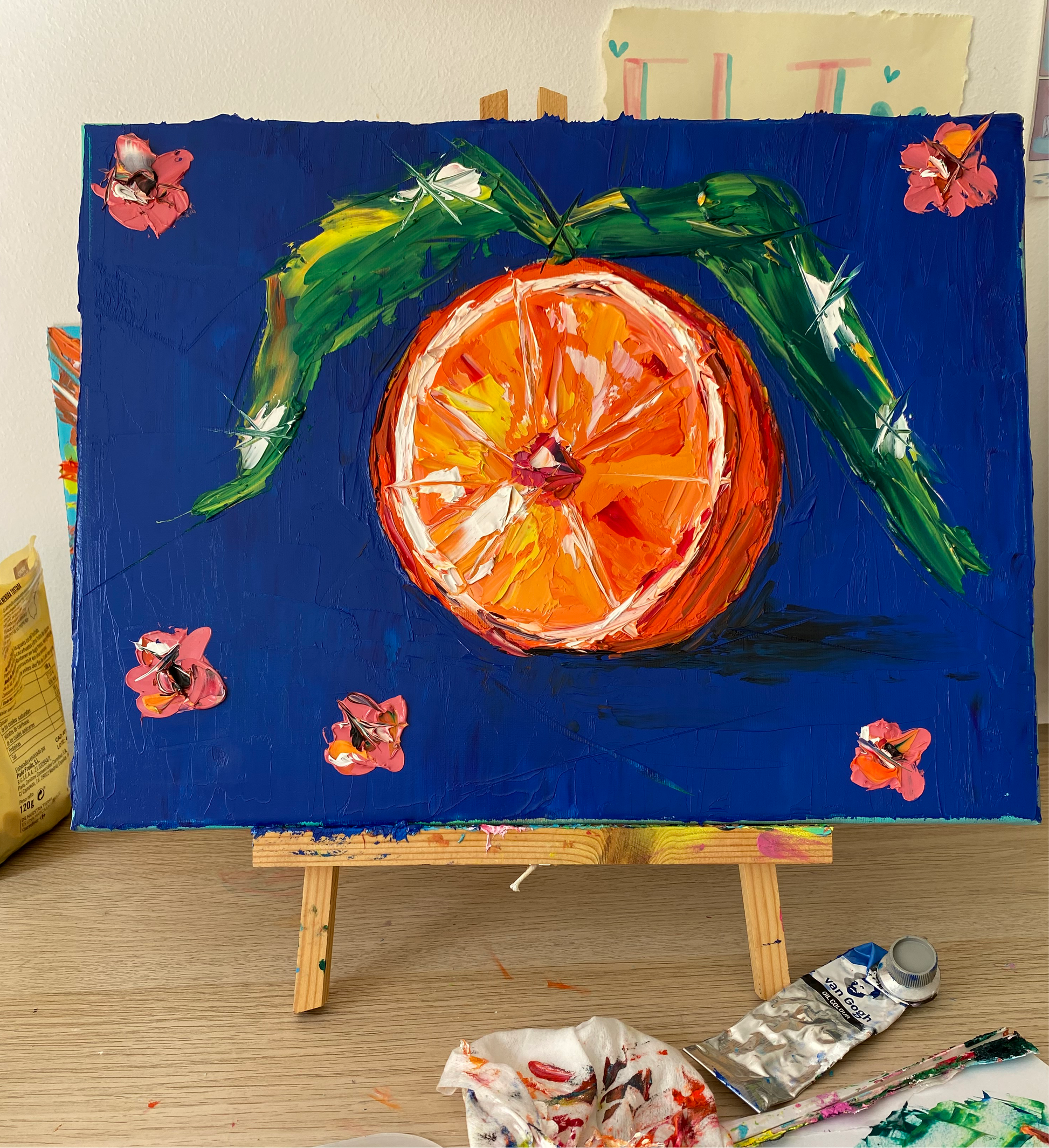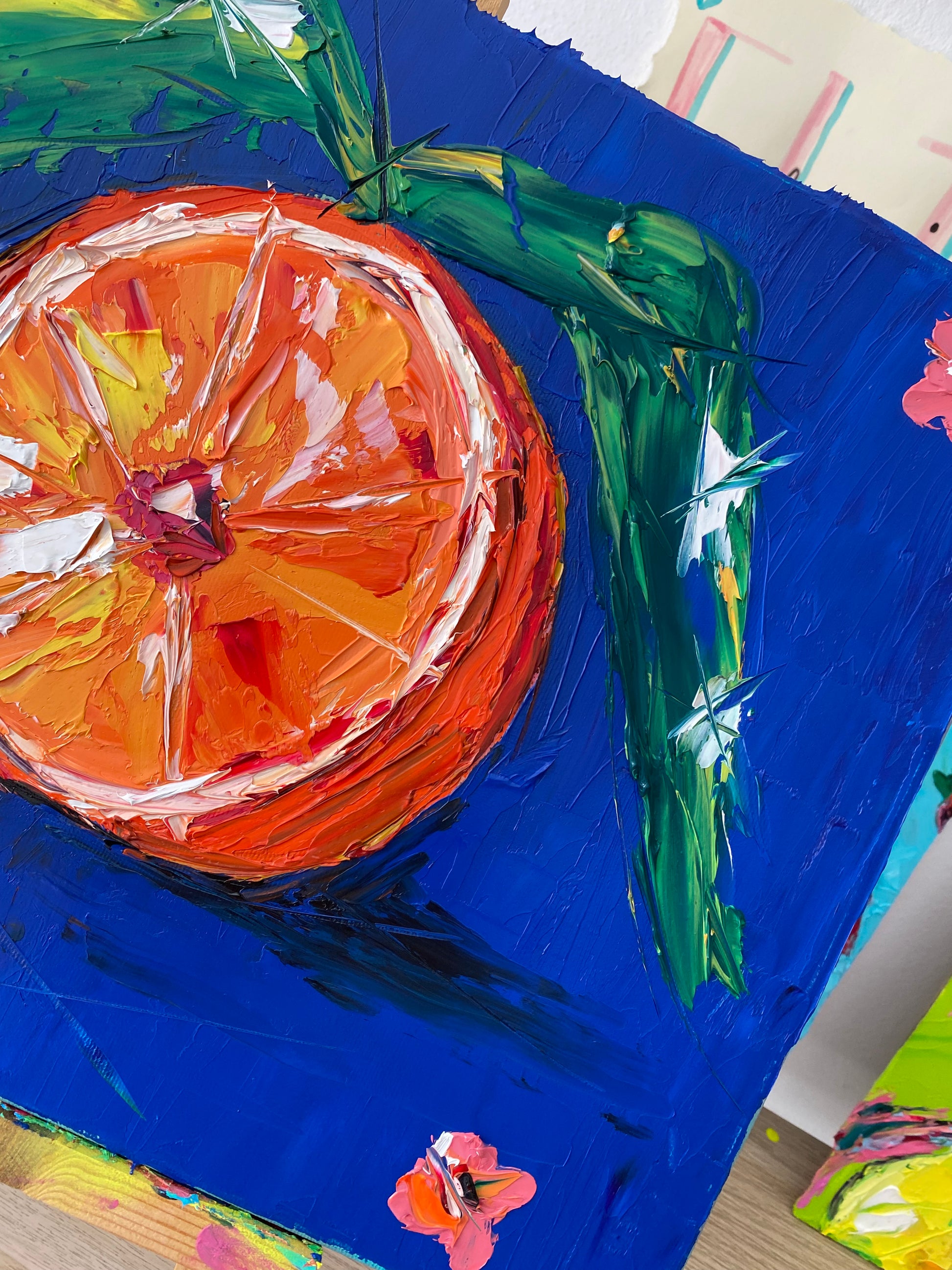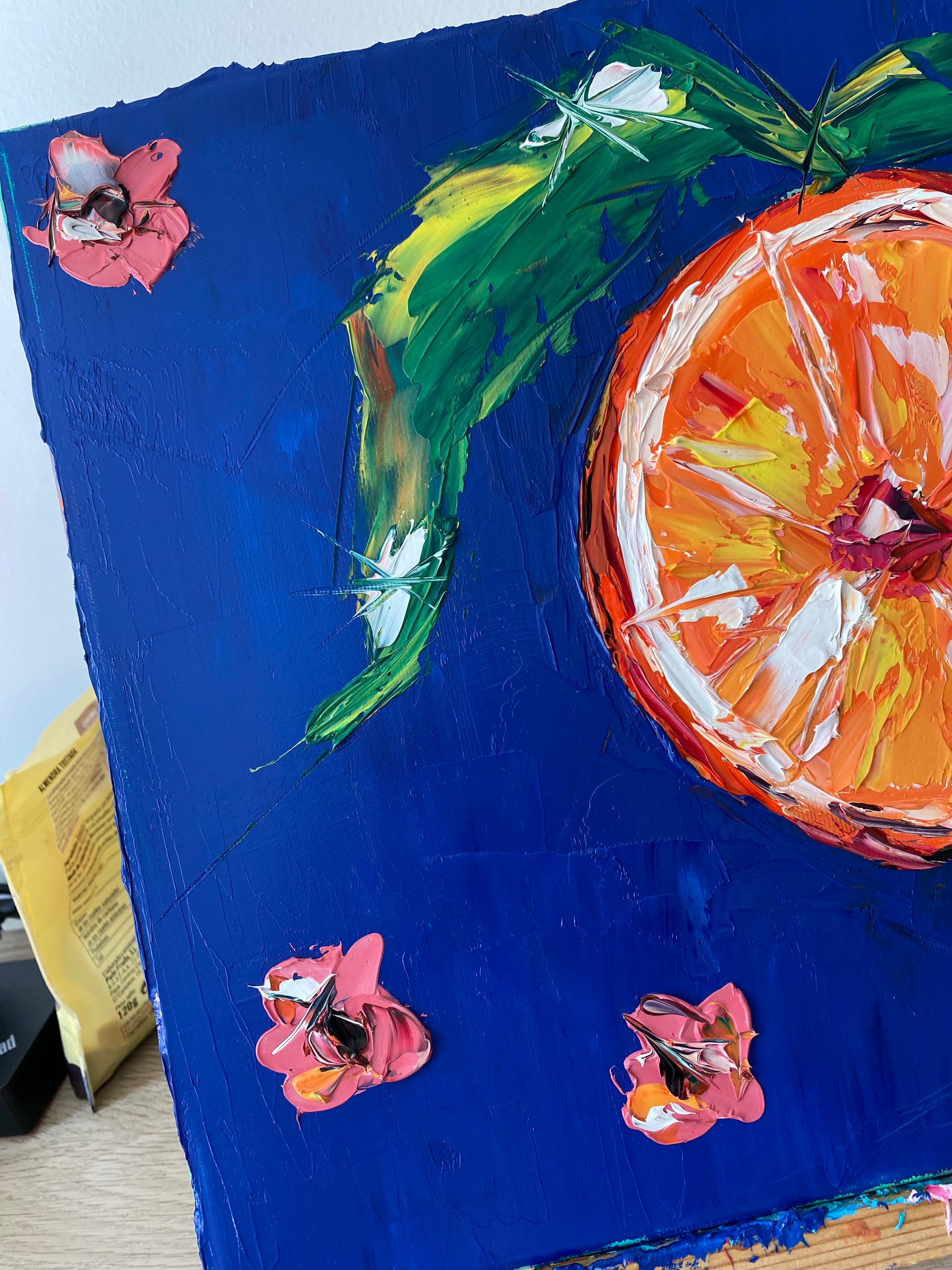 Radiant and full of vitality, this oil on canvas turns a simple orange into a jewel of light and energy. Painted with a palette knife, the juicy citrus glows in vibrant shades of orange and gold, contrasted against a deep cobalt blue. Sparkling highlights shimmer like diamonds on the green leaves, while delicate pink blossoms dance around the fruit, adding a touch of playfulness. A bold and uplifting piece that celebrates brightness, joy, and the beauty of nature’s treasures.