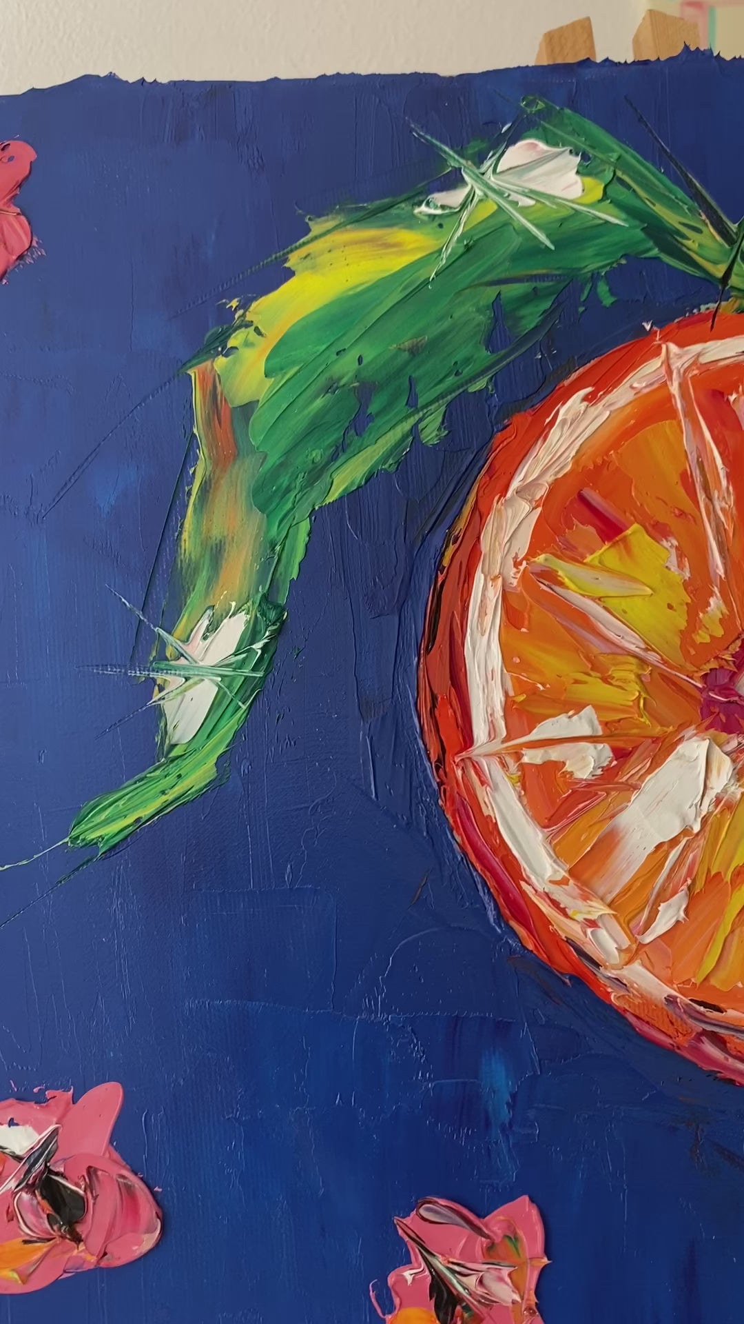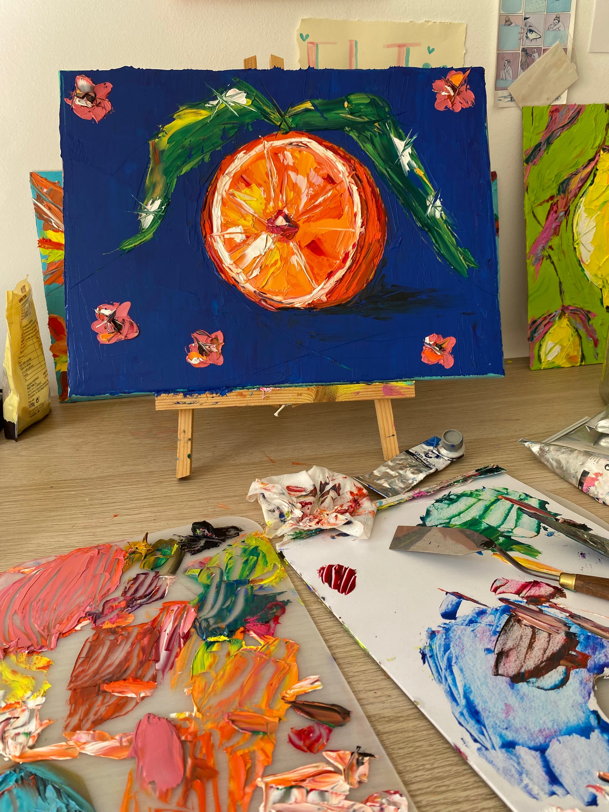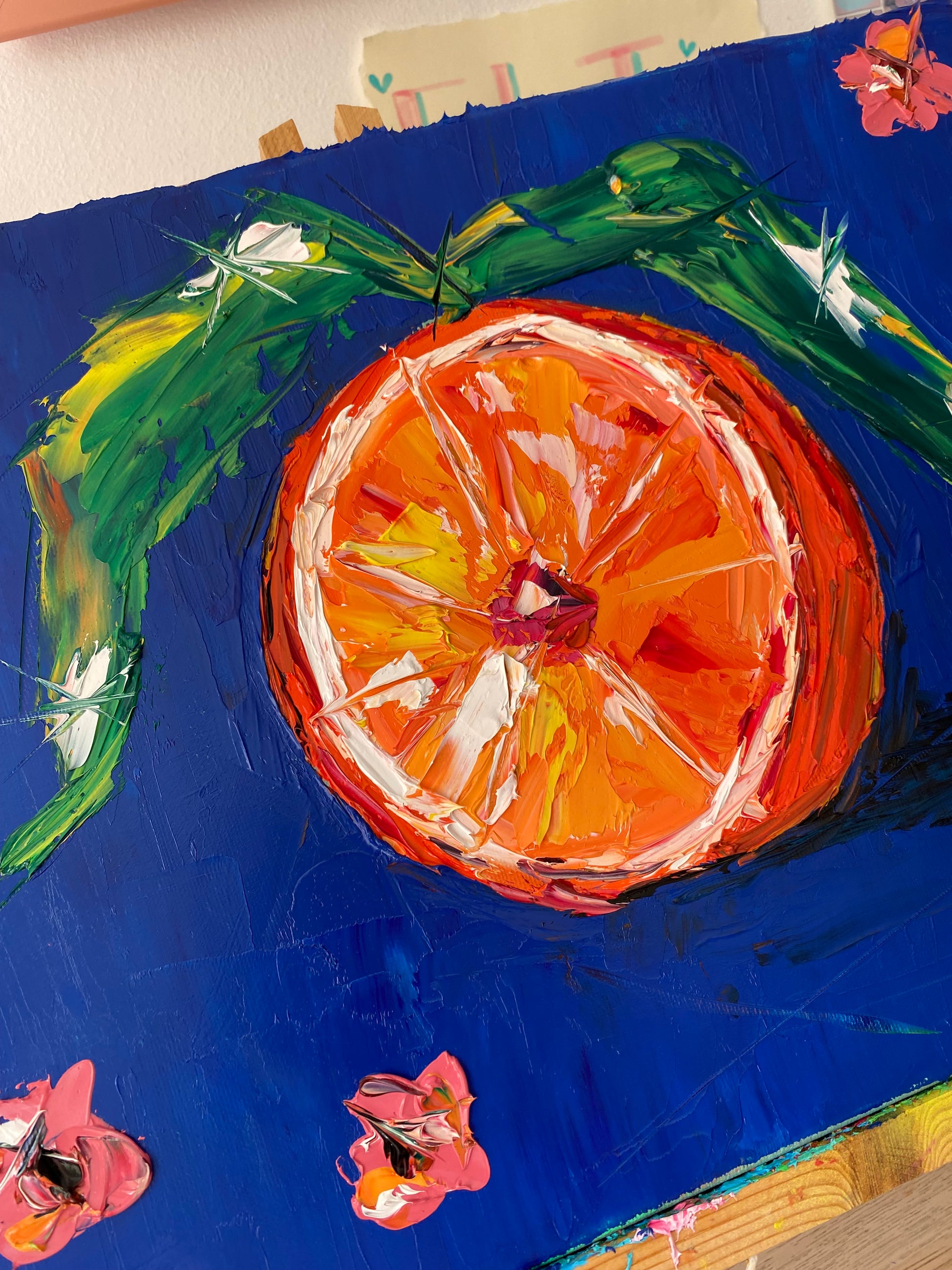 Radiant and full of vitality, this oil on canvas turns a simple orange into a jewel of light and energy. Painted with a palette knife, the juicy citrus glows in vibrant shades of orange and gold, contrasted against a deep cobalt blue. Sparkling highlights shimmer like diamonds on the green leaves, while delicate pink blossoms dance around the fruit, adding a touch of playfulness. A bold and uplifting piece that celebrates brightness, joy, and the beauty of nature’s treasures.
