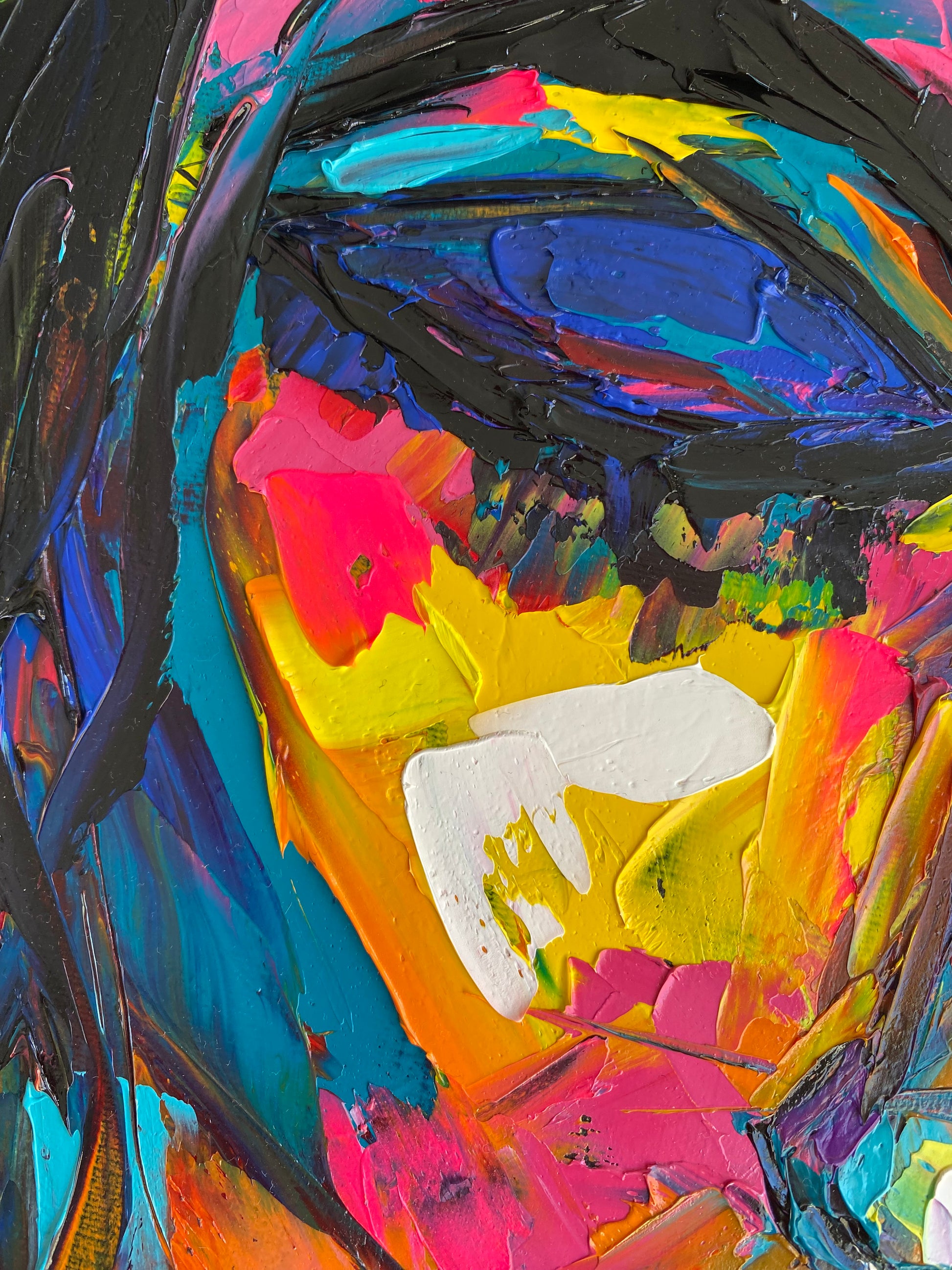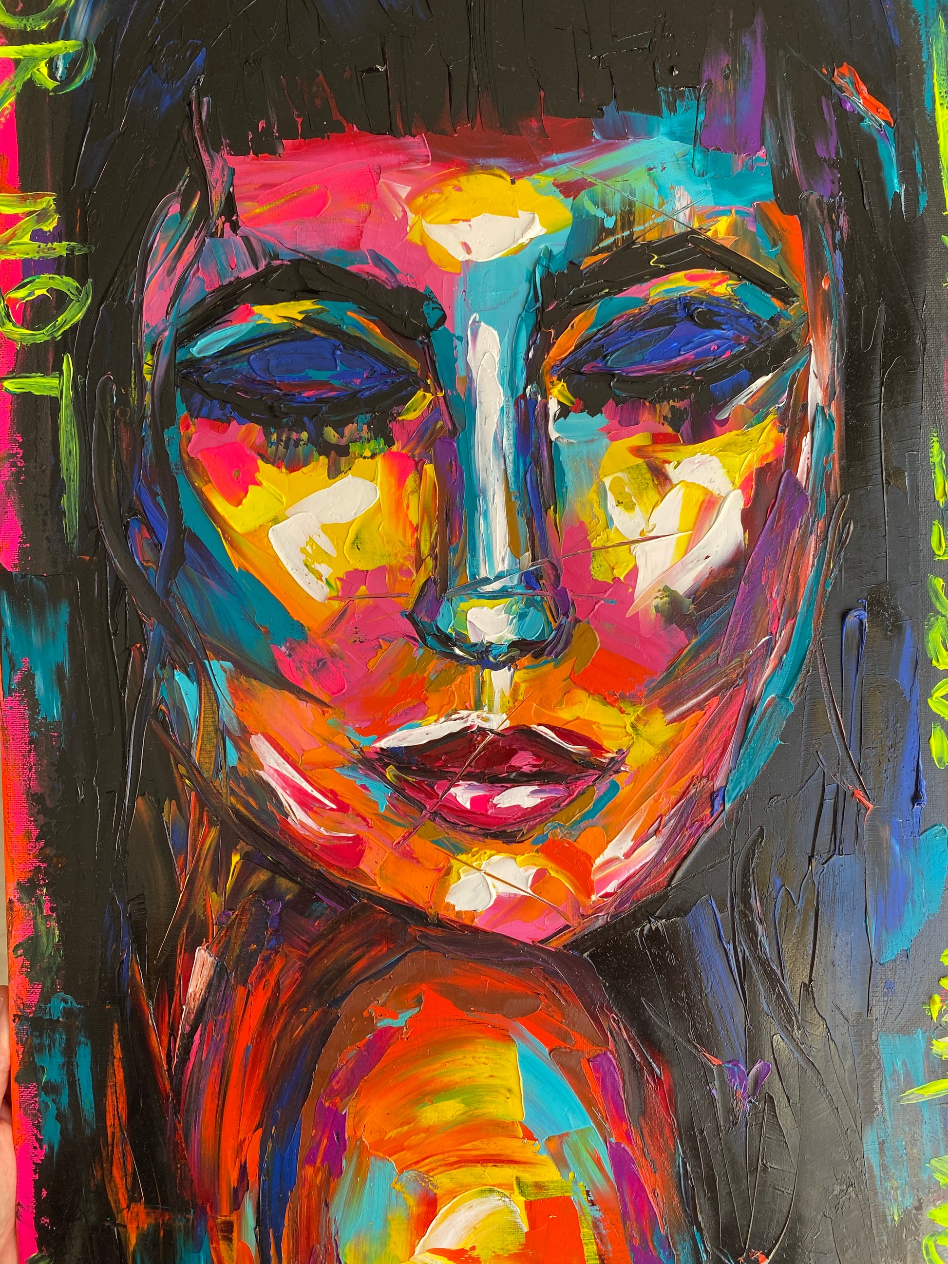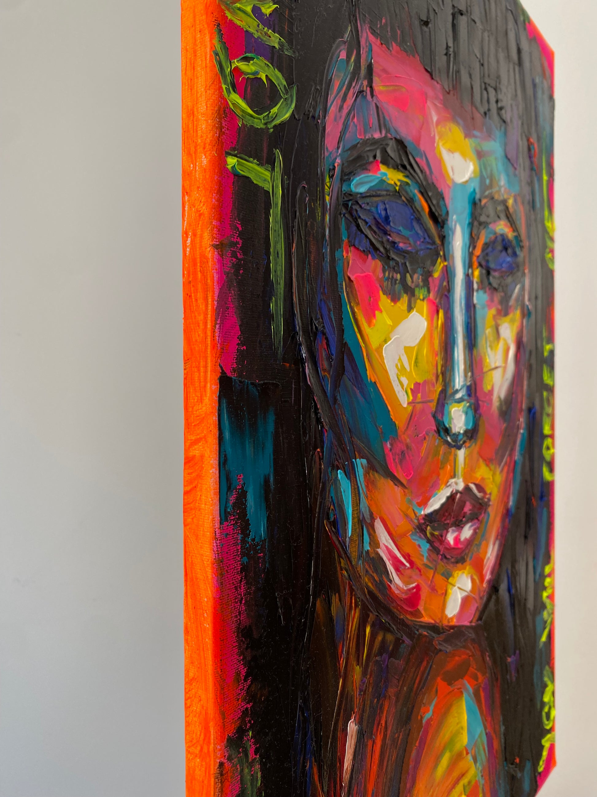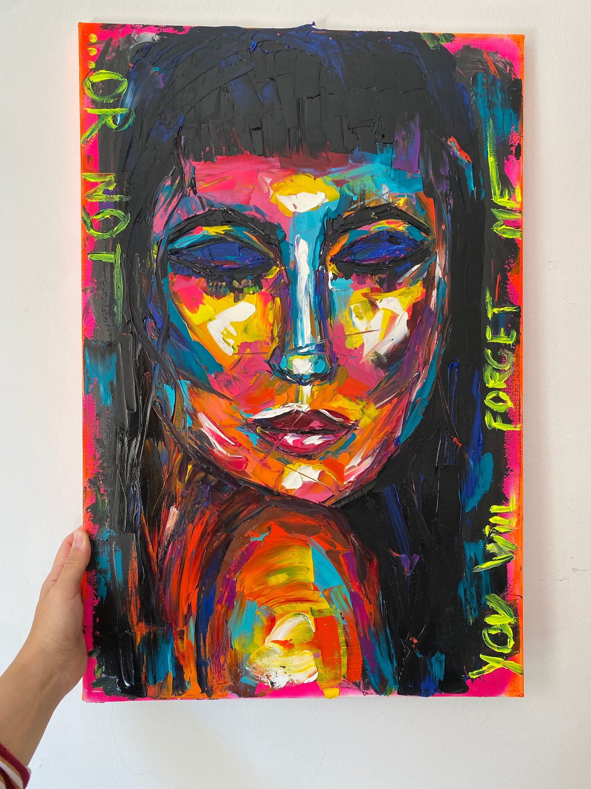 Raw, vibrant, and haunting, this portrait radiates with both fragility and strength. Painted with a palette knife in electrifying tones of neon pink, orange, turquoise, and yellow against deep blacks, the face emerges as if torn between light and shadow. The closed eyes invite introspection, while the bold words on the canvas—“You Will Forget Me (Or Not)”—linger like an echo of memory and identity. A powerful piece that speaks of presence, loss, and the eternal struggle of being remembered.