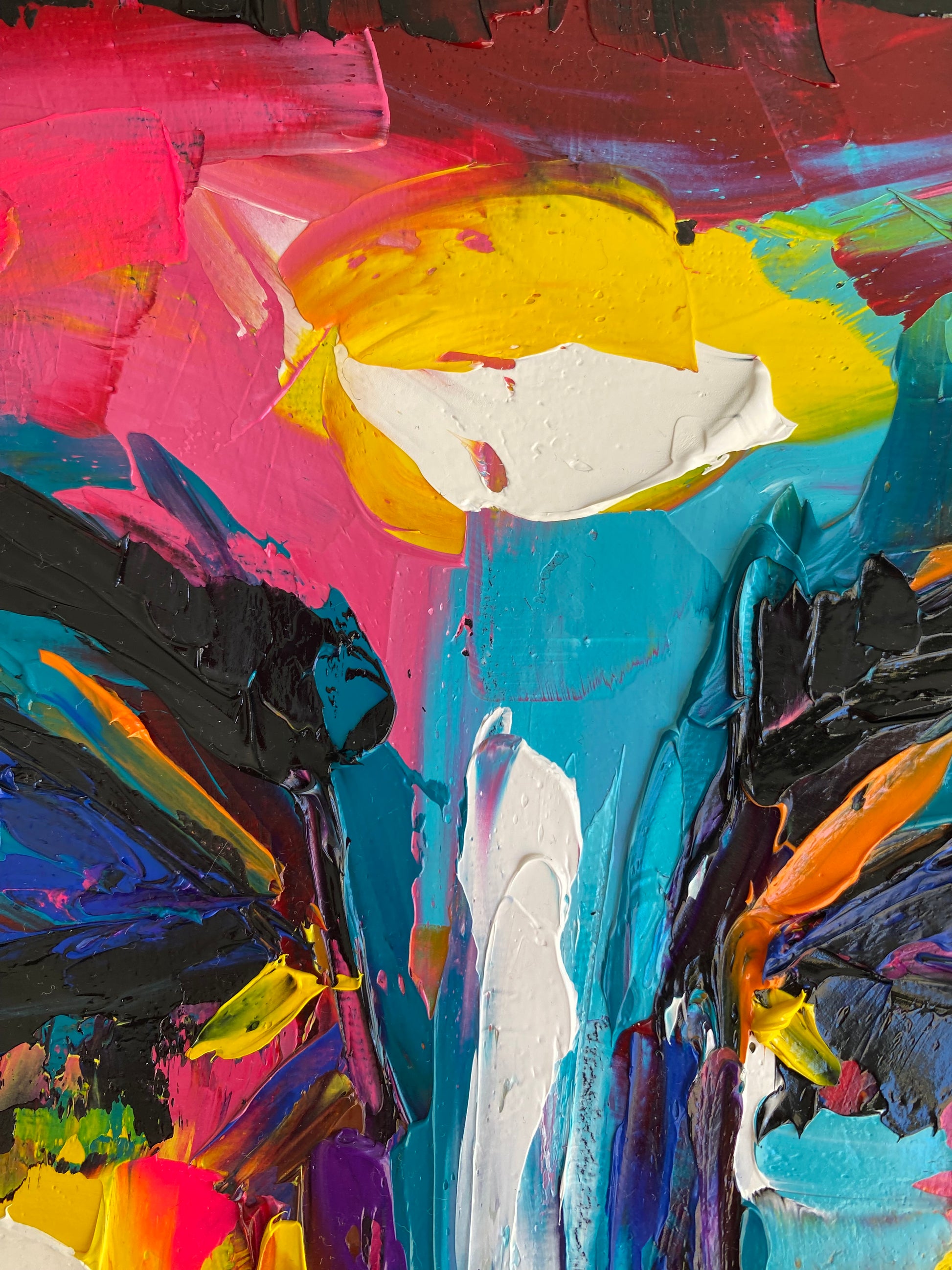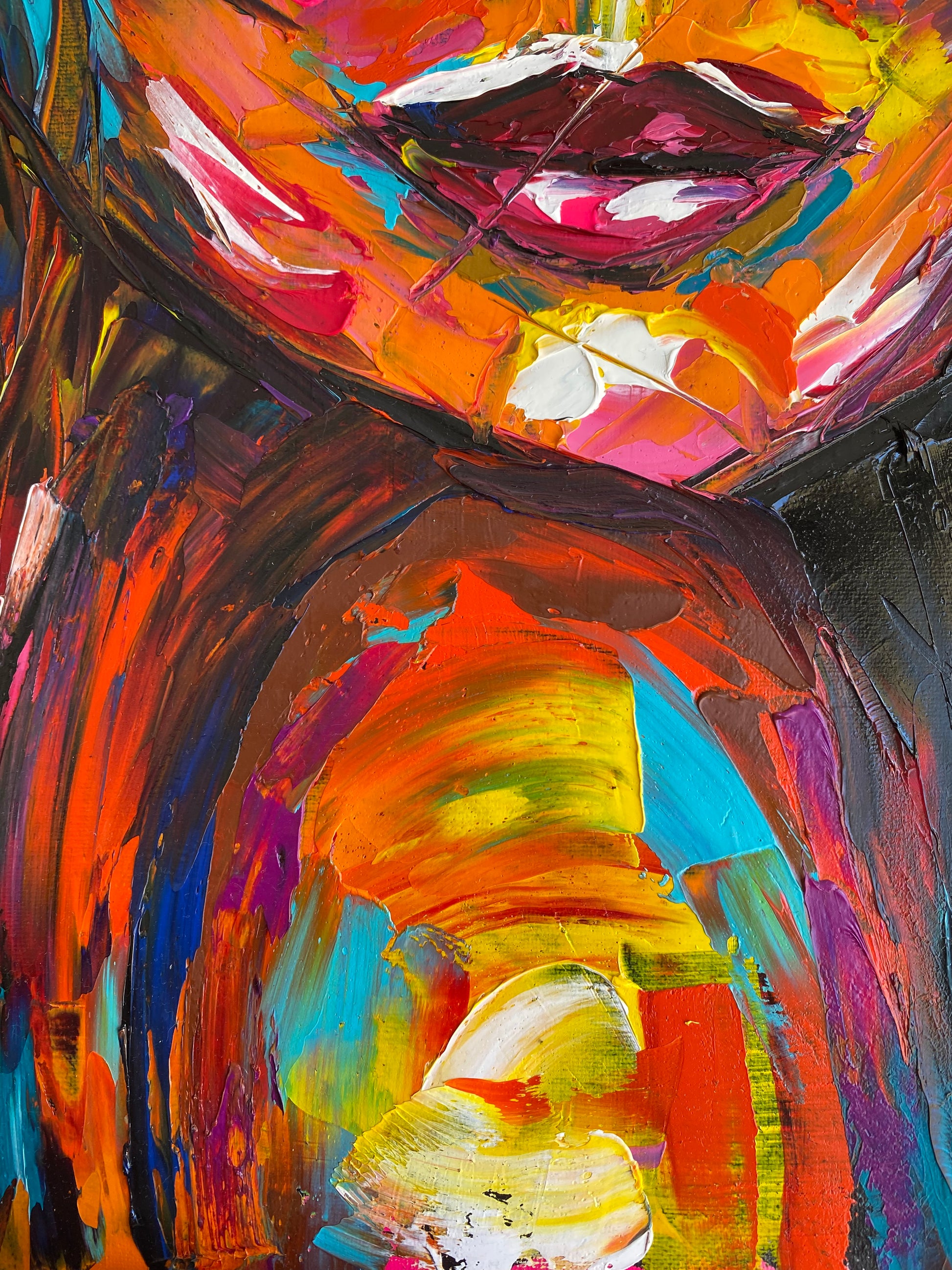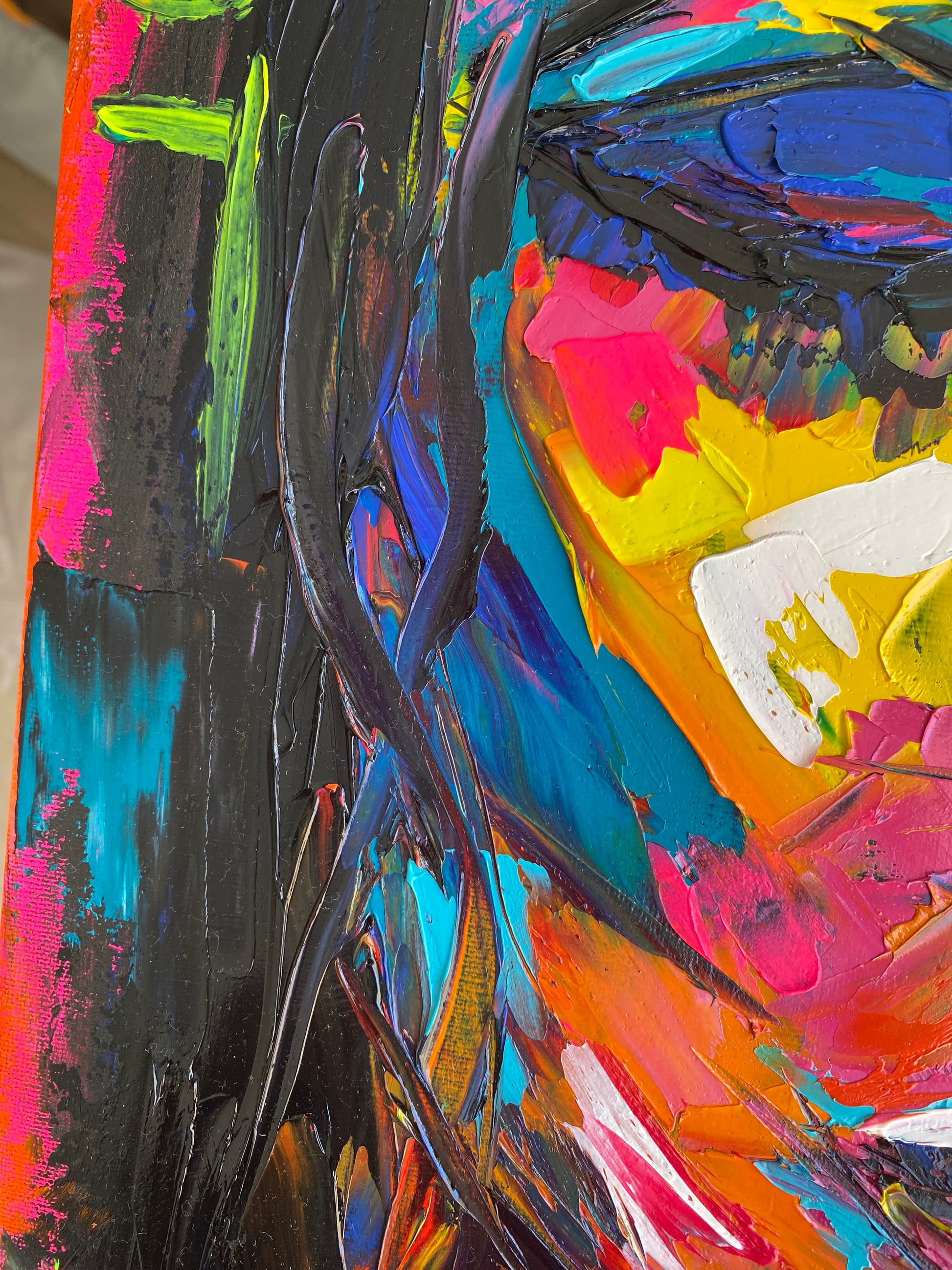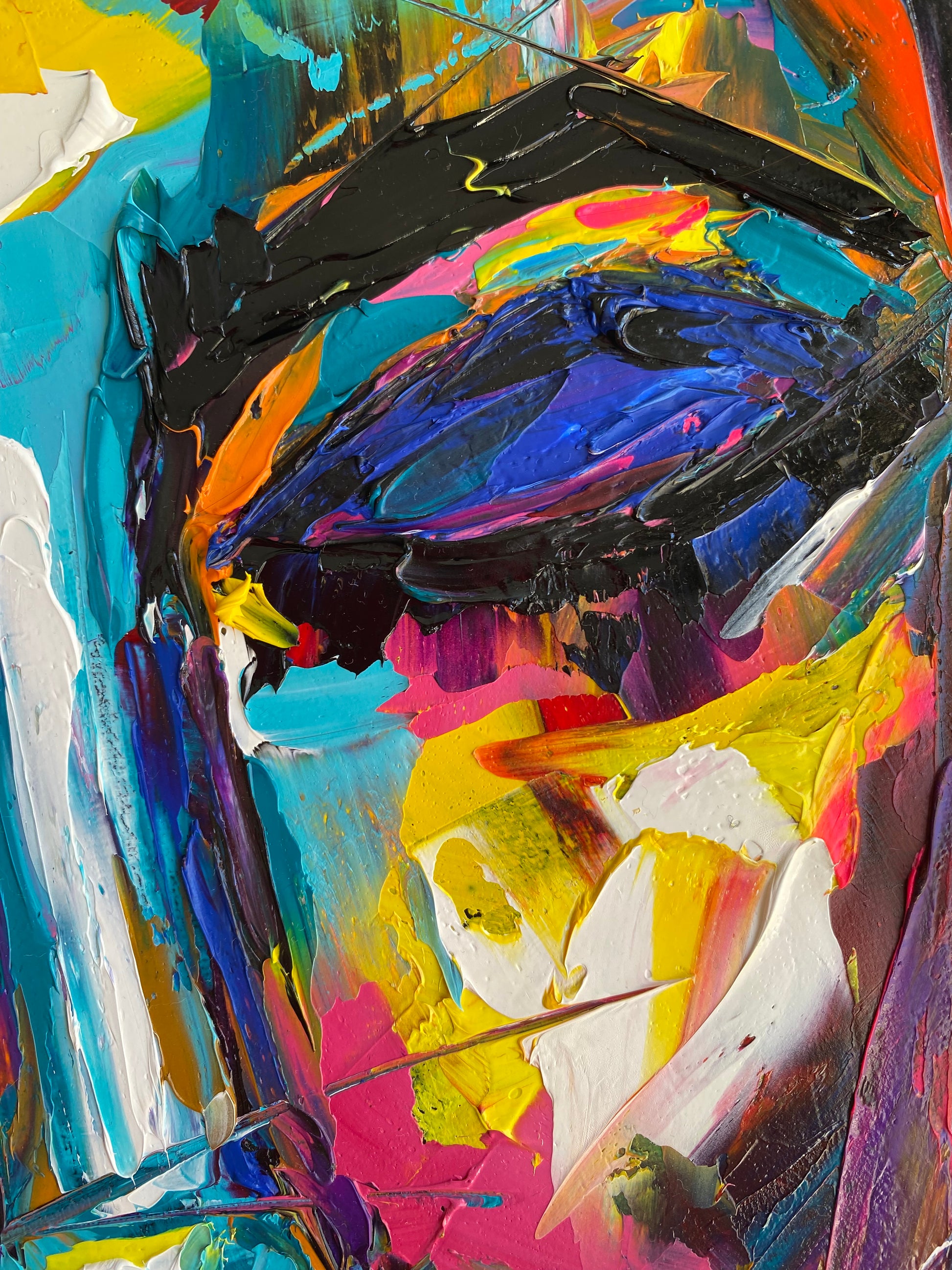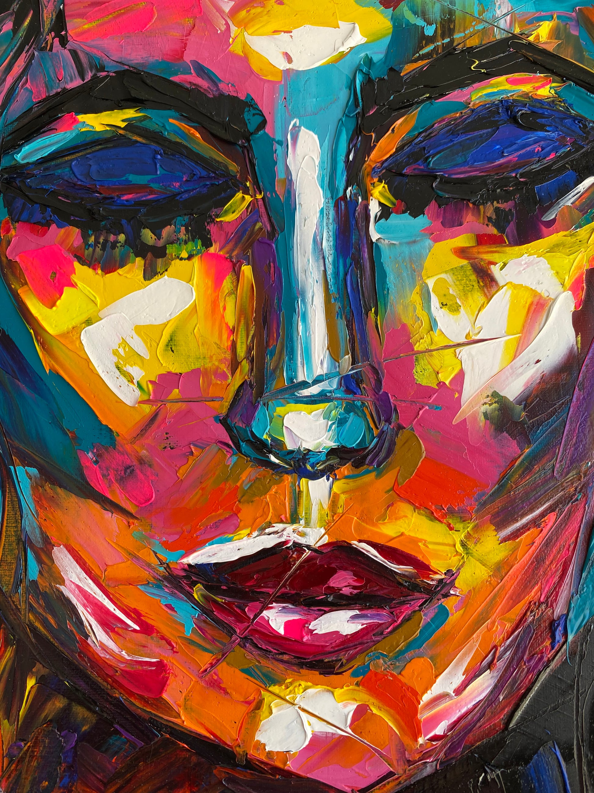 Raw, vibrant, and haunting, this portrait radiates with both fragility and strength. Painted with a palette knife in electrifying tones of neon pink, orange, turquoise, and yellow against deep blacks, the face emerges as if torn between light and shadow. The closed eyes invite introspection, while the bold words on the canvas—“You Will Forget Me (Or Not)”—linger like an echo of memory and identity. A powerful piece that speaks of presence, loss, and the eternal struggle of being remembered.