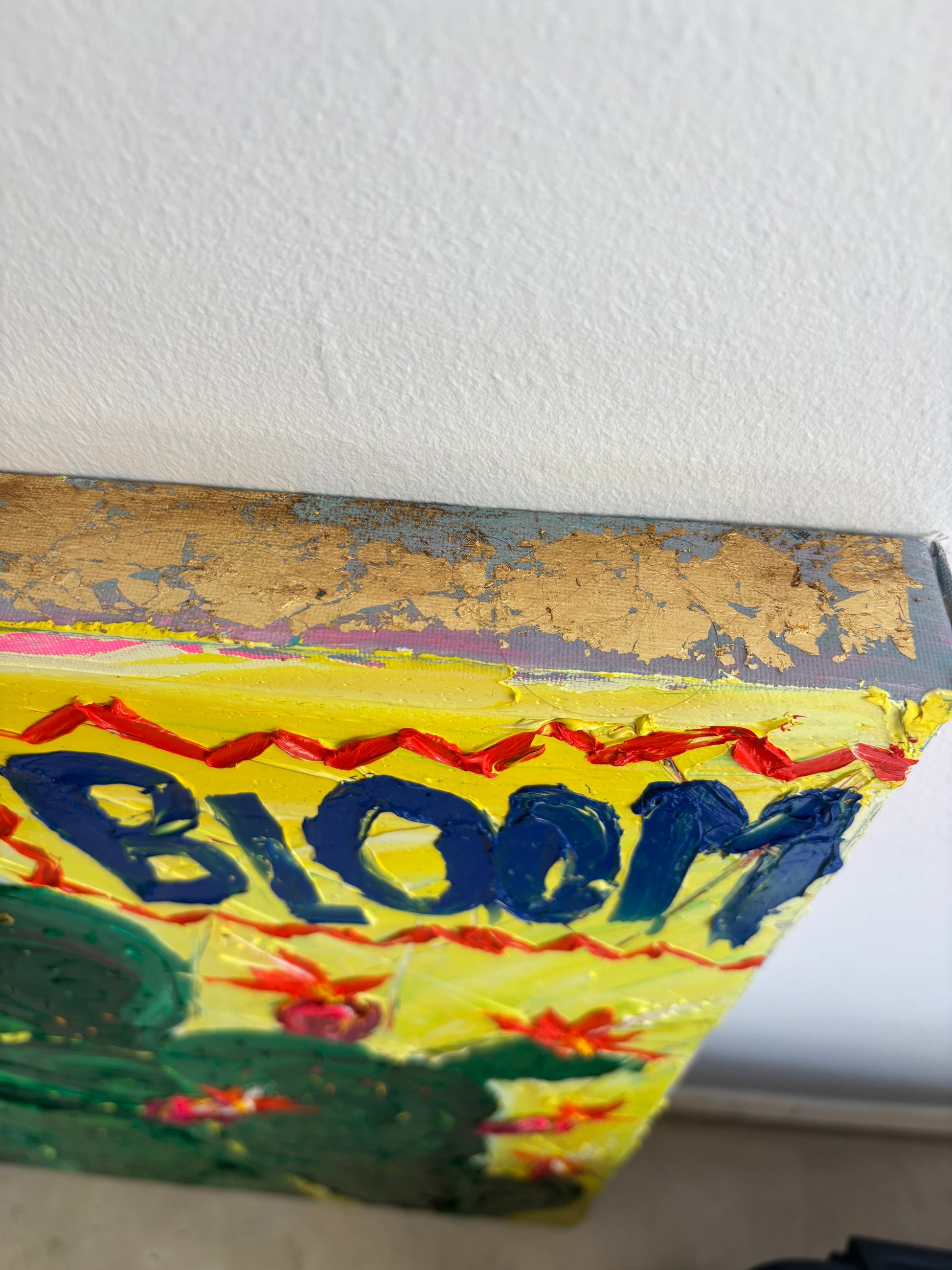 This vibrant palette-knife oil painting celebrates the life force of cacti in full bloom. Against a radiant yellow background that radiates energy and light, the deep greens of the cactus pads emerge with rich texture and movement. Bright red and fuchsia flowers burst with intensity, reminding us that even among thorns and dryness, life always finds a way to flourish. The bold word “BLOOM” painted on the canvas reinforces the message of growth, resilience, and unexpected beauty.
