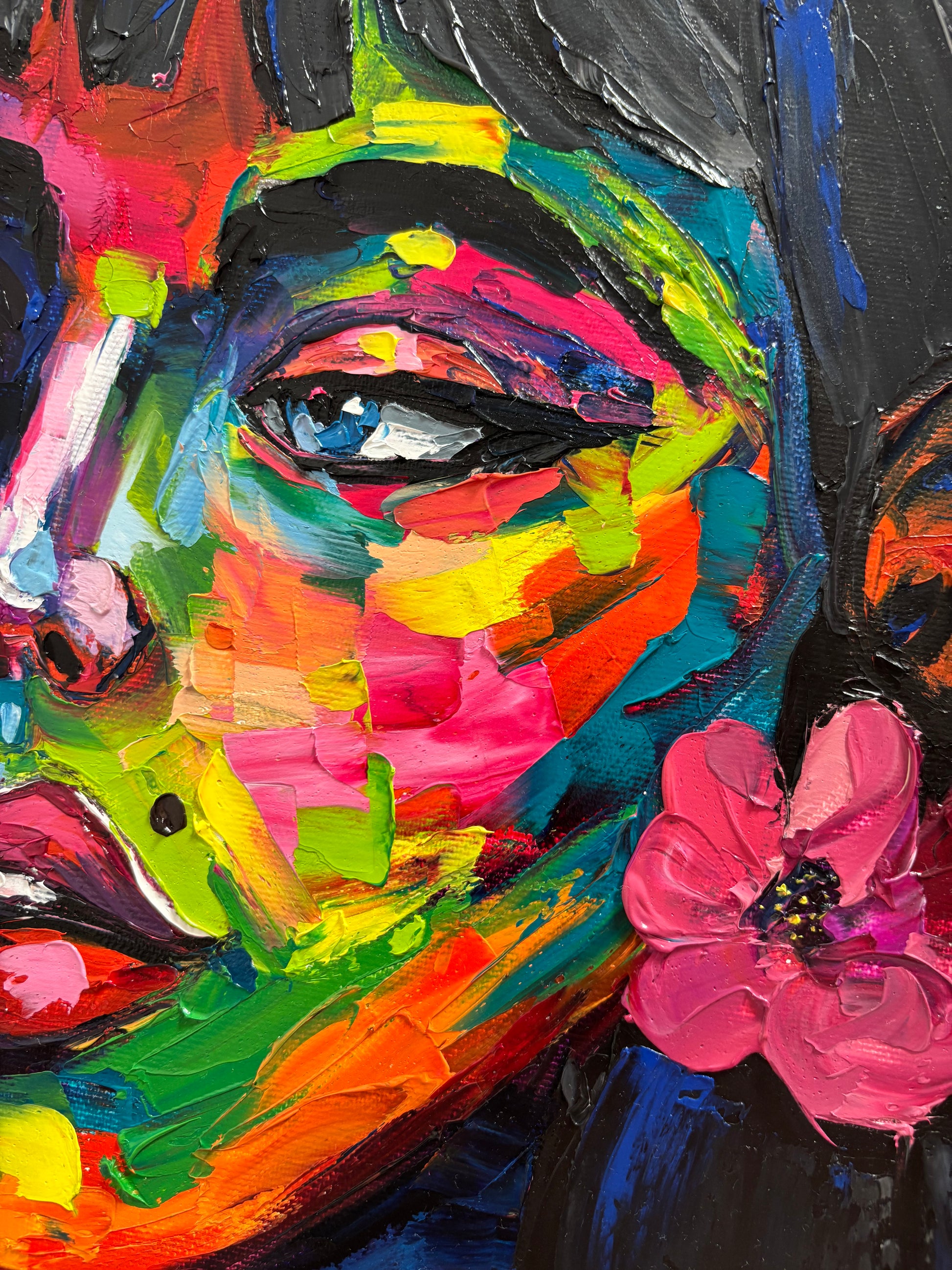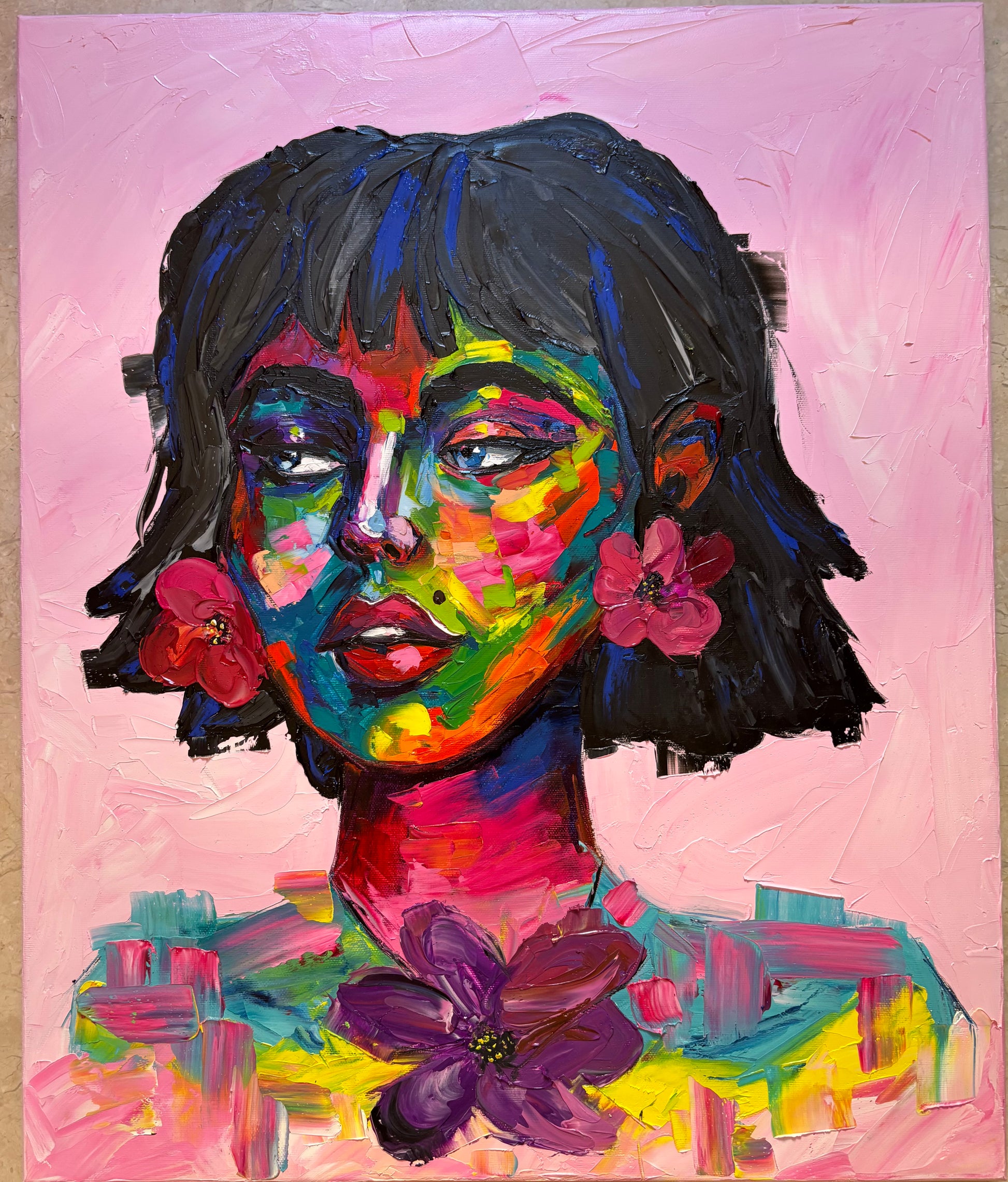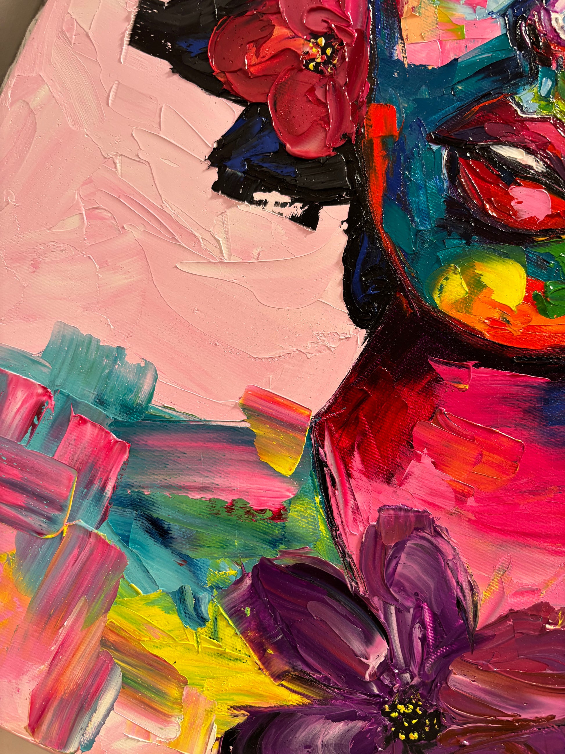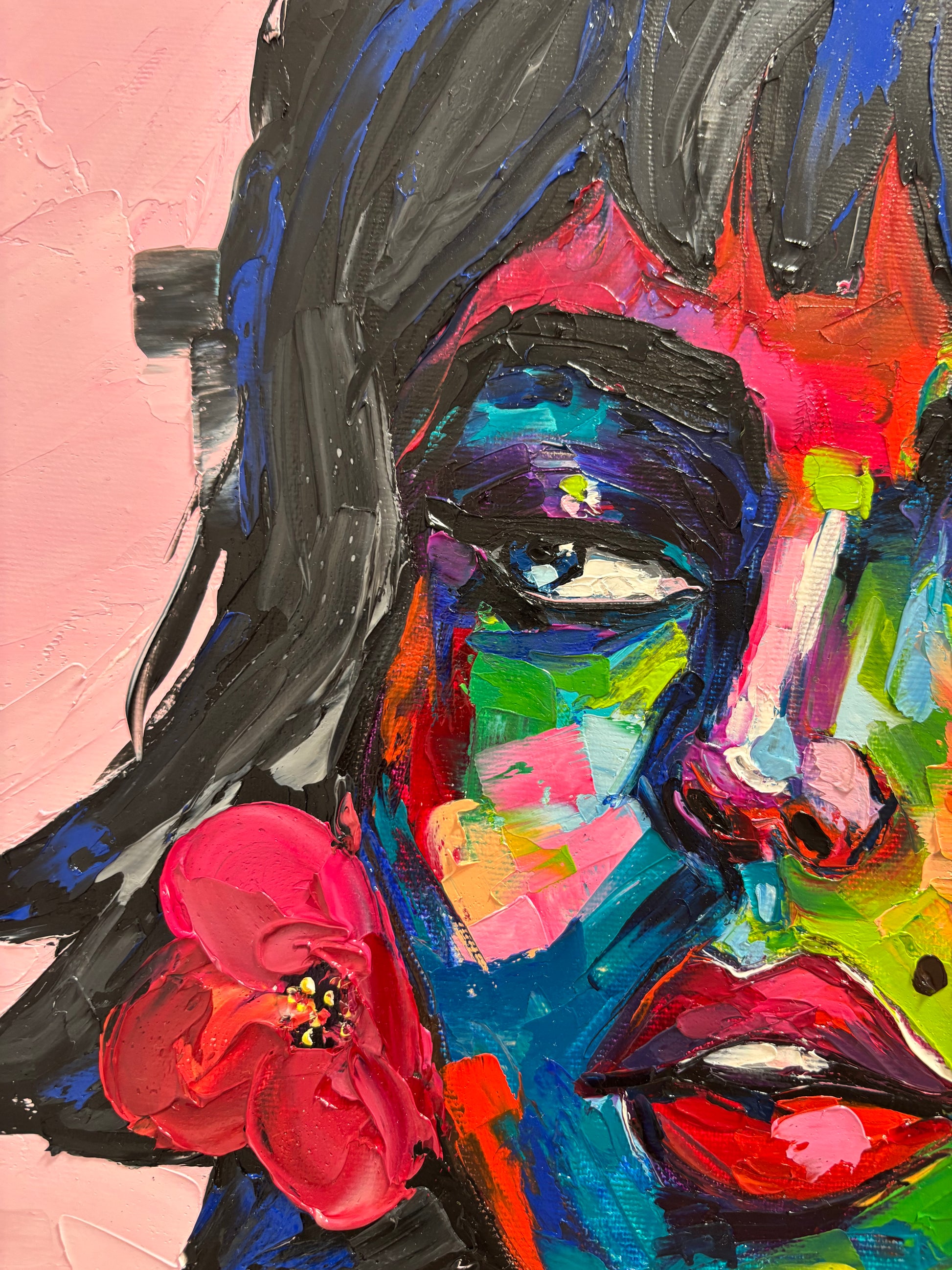 “The Memory Code” is a vibrant oil painting created with bold palette-knife strokes, where radiant colors and textured layers bring to life the portrait of a woman adorned with flowers. Against a soft pink background, her face glows with fuchsia, turquoise, emerald, and violet tones, symbolizing fragments of memory woven into identity and resilience. Both powerful and delicate, this artwork captures the coded emotions that lie beneath the surface, making it a striking and poetic statement piece for any collection.