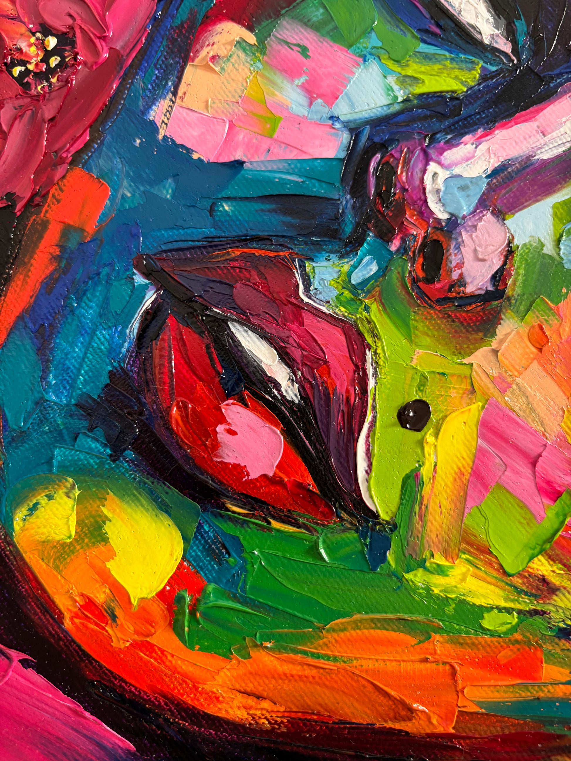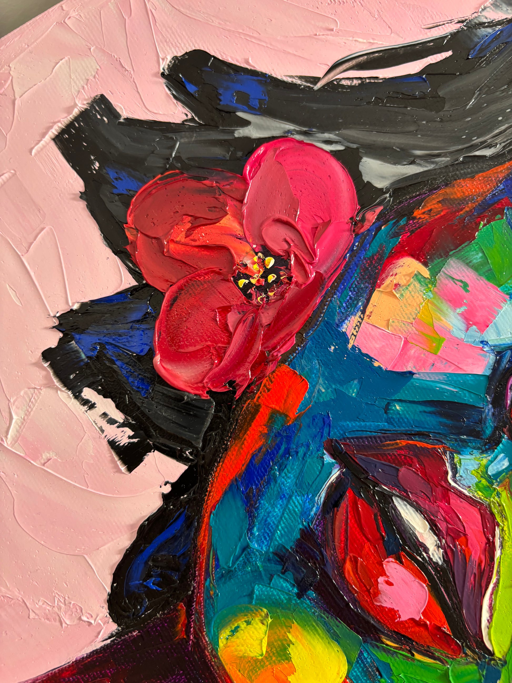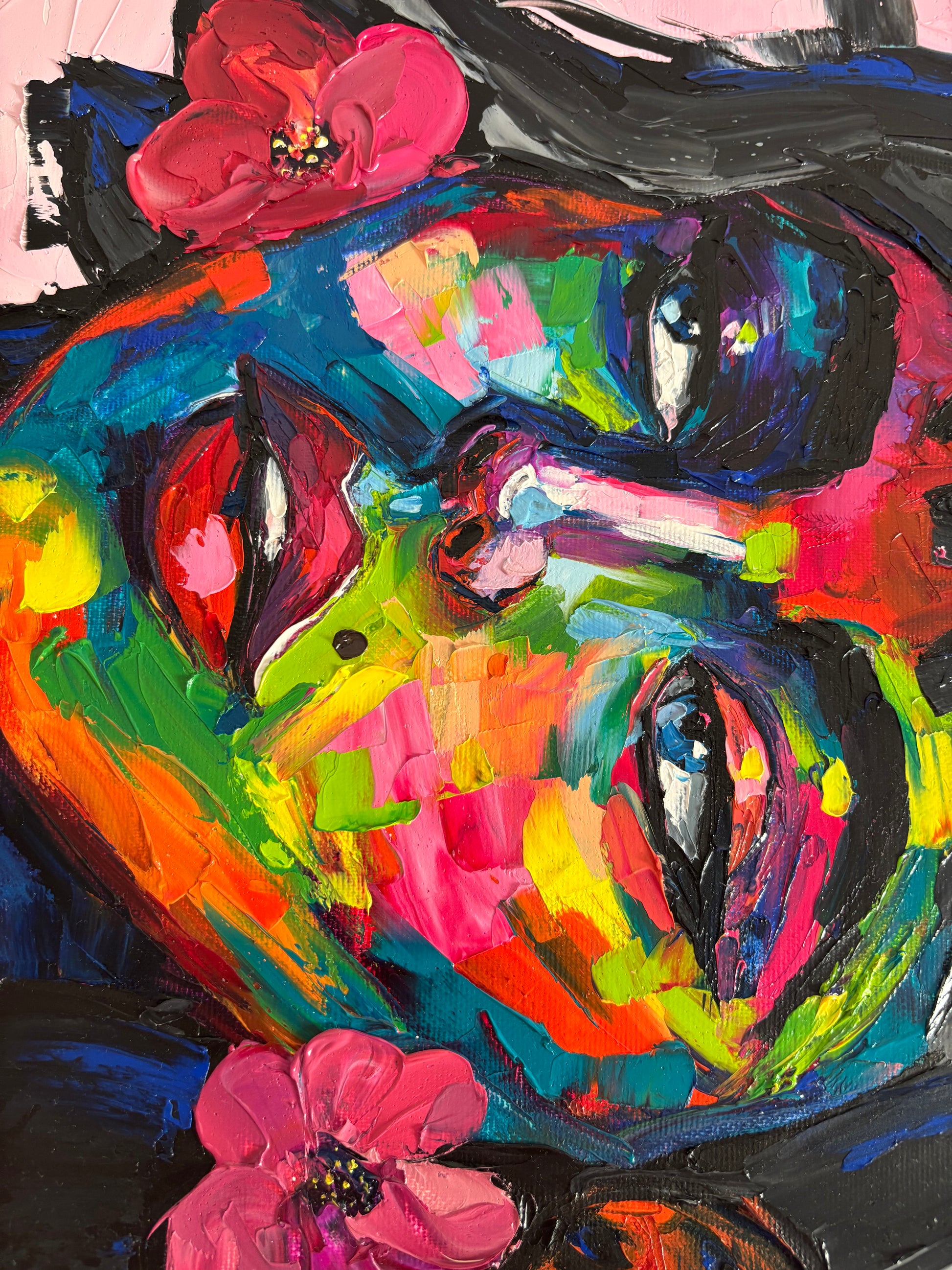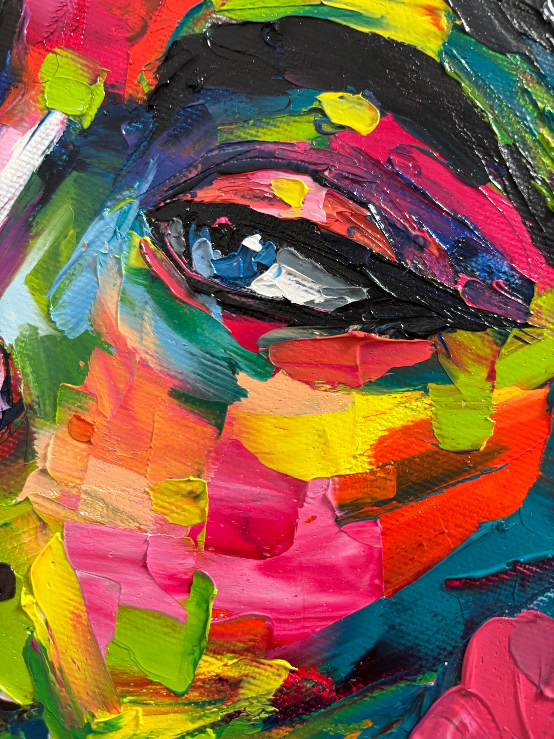 “The Memory Code” is a vibrant oil painting created with bold palette-knife strokes, where radiant colors and textured layers bring to life the portrait of a woman adorned with flowers. Against a soft pink background, her face glows with fuchsia, turquoise, emerald, and violet tones, symbolizing fragments of memory woven into identity and resilience. Both powerful and delicate, this artwork captures the coded emotions that lie beneath the surface, making it a striking and poetic statement piece for any collection.