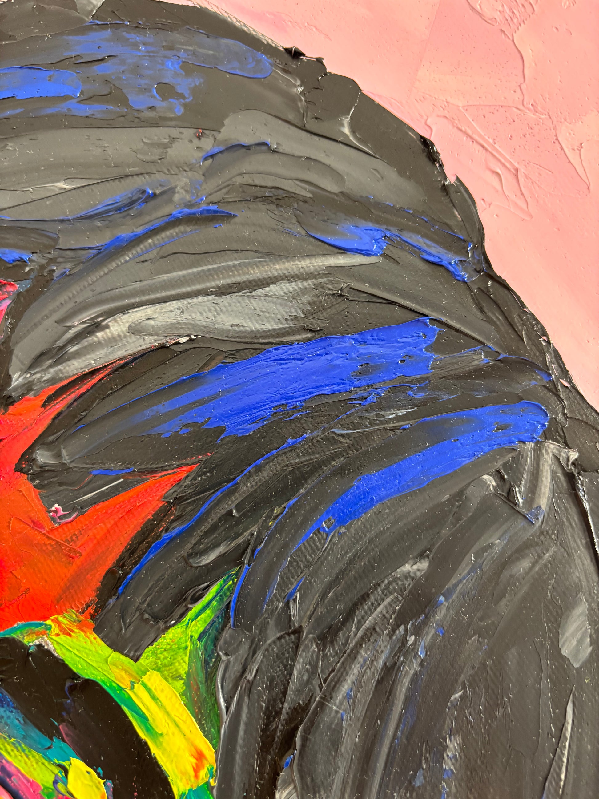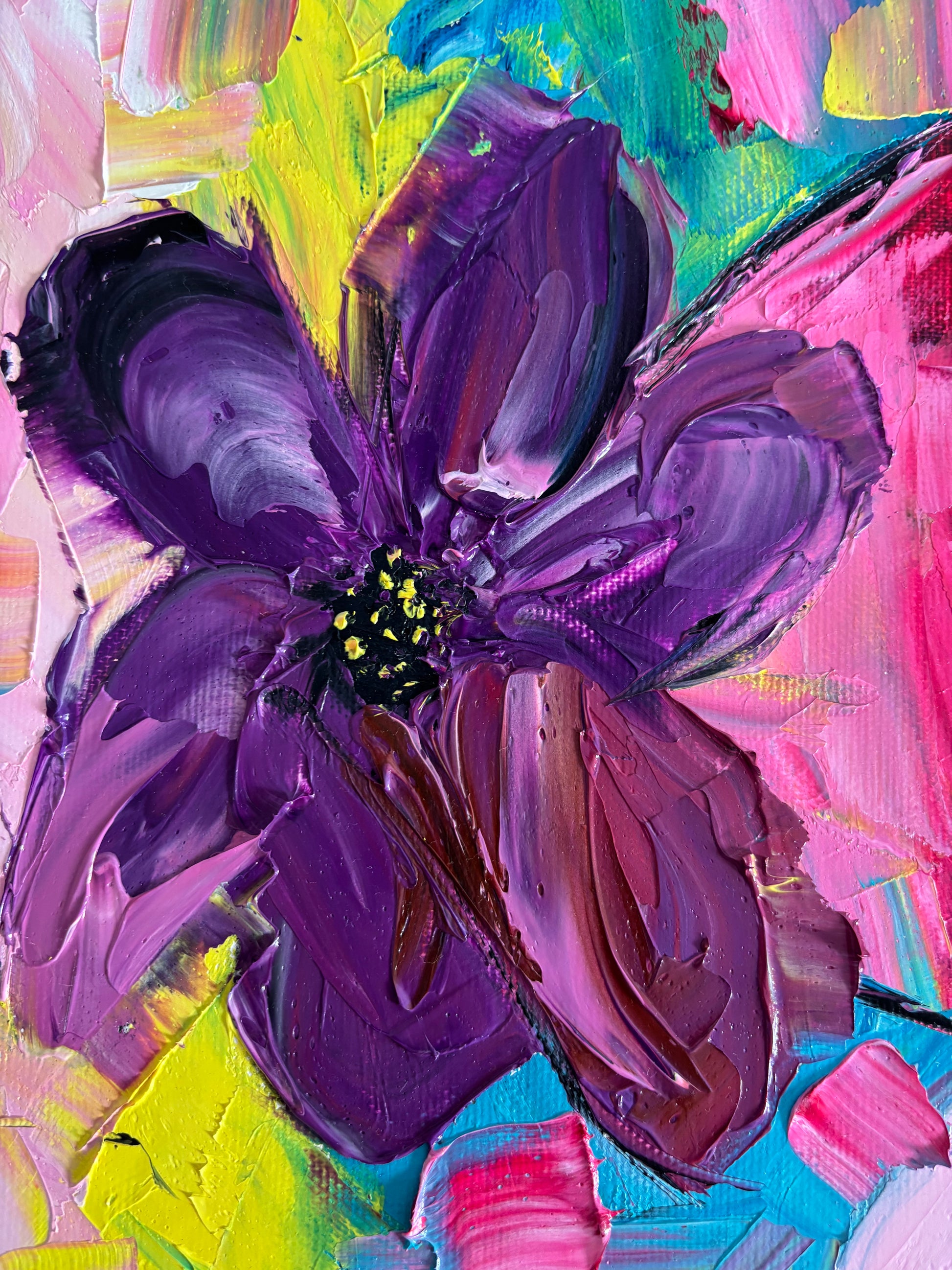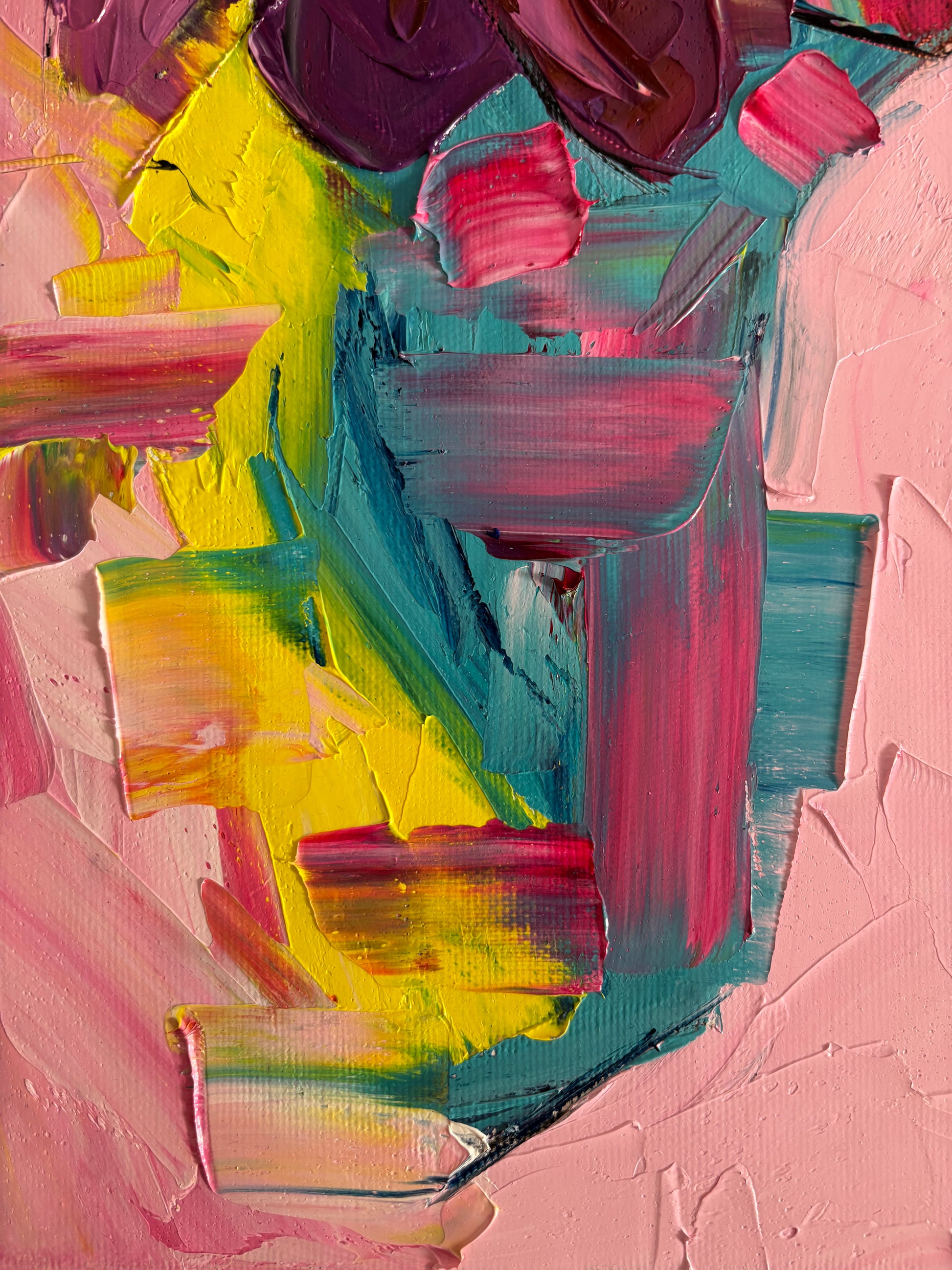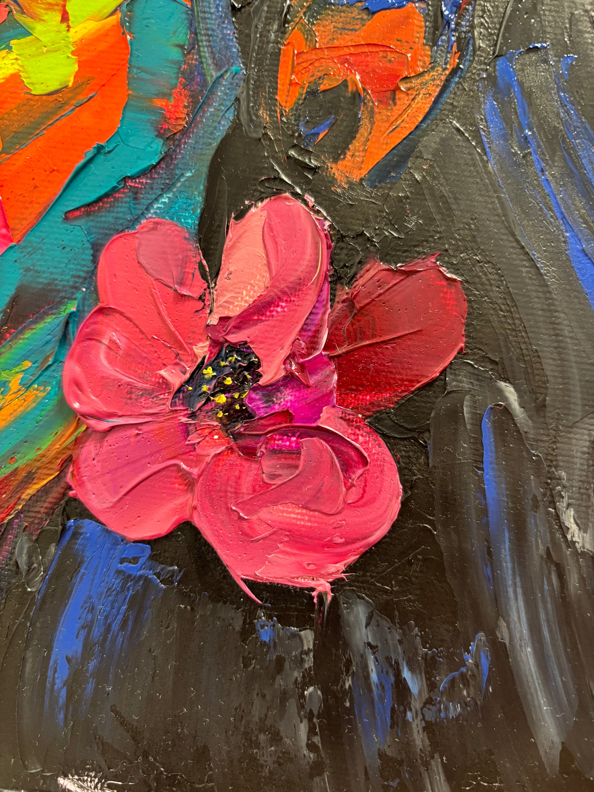 “The Memory Code” is a vibrant oil painting created with bold palette-knife strokes, where radiant colors and textured layers bring to life the portrait of a woman adorned with flowers. Against a soft pink background, her face glows with fuchsia, turquoise, emerald, and violet tones, symbolizing fragments of memory woven into identity and resilience. Both powerful and delicate, this artwork captures the coded emotions that lie beneath the surface, making it a striking and poetic statement piece for any collection.