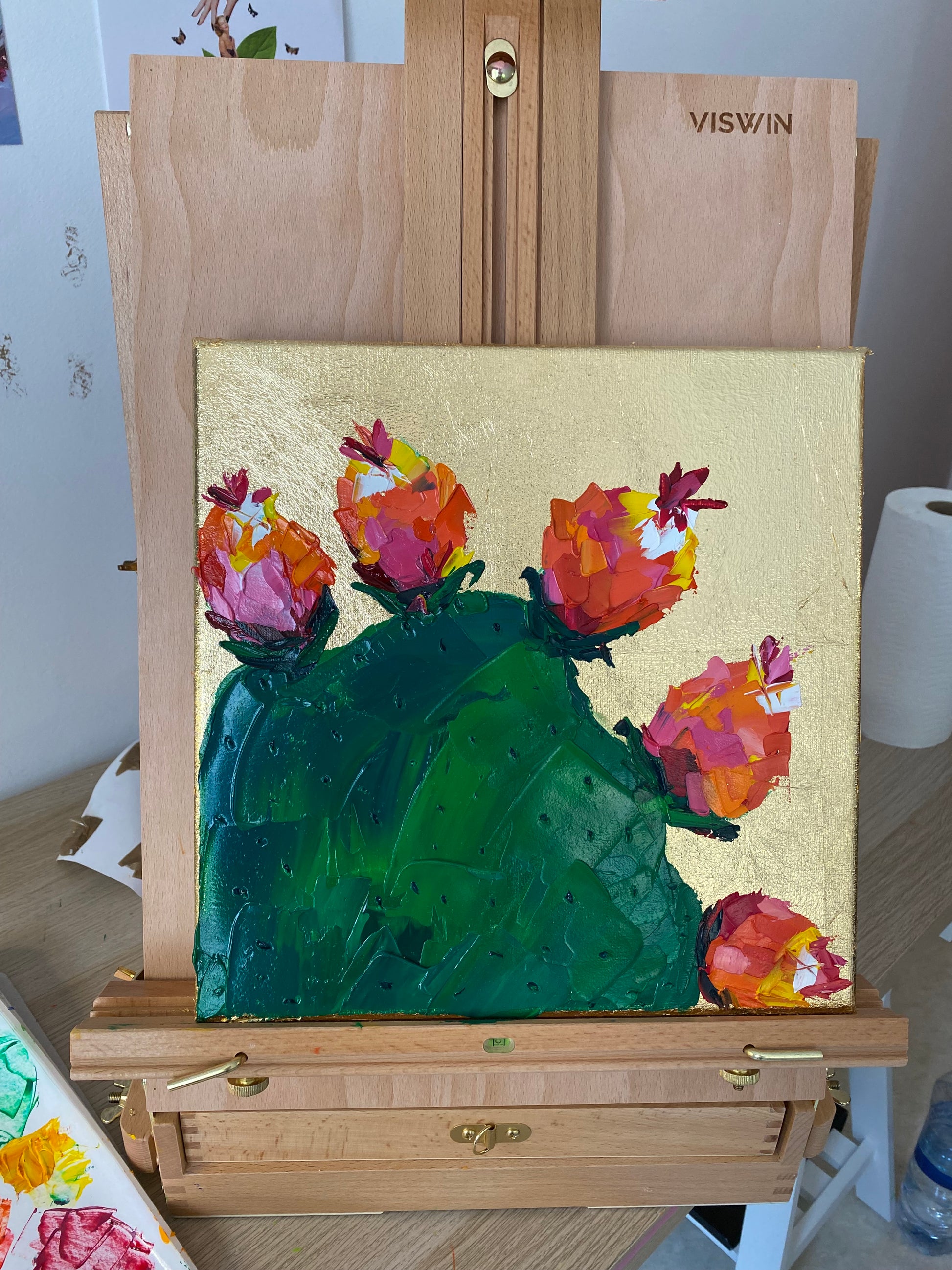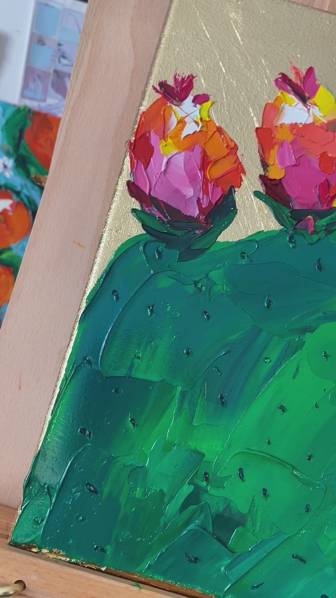 A radiant fusion of strength and elegance, this oil on canvas reimagines the cactus in full bloom against a shimmering golden backdrop. The deep green pads anchor the composition, while the flowers—painted in bold strokes of pink, orange, and crimson—explode with vibrant energy. Created with a palette knife, the heavy textures make each blossom glow with life, as if lit from within. A striking artwork that celebrates resilience, beauty, and the timeless allure of nature gilded in gold.
