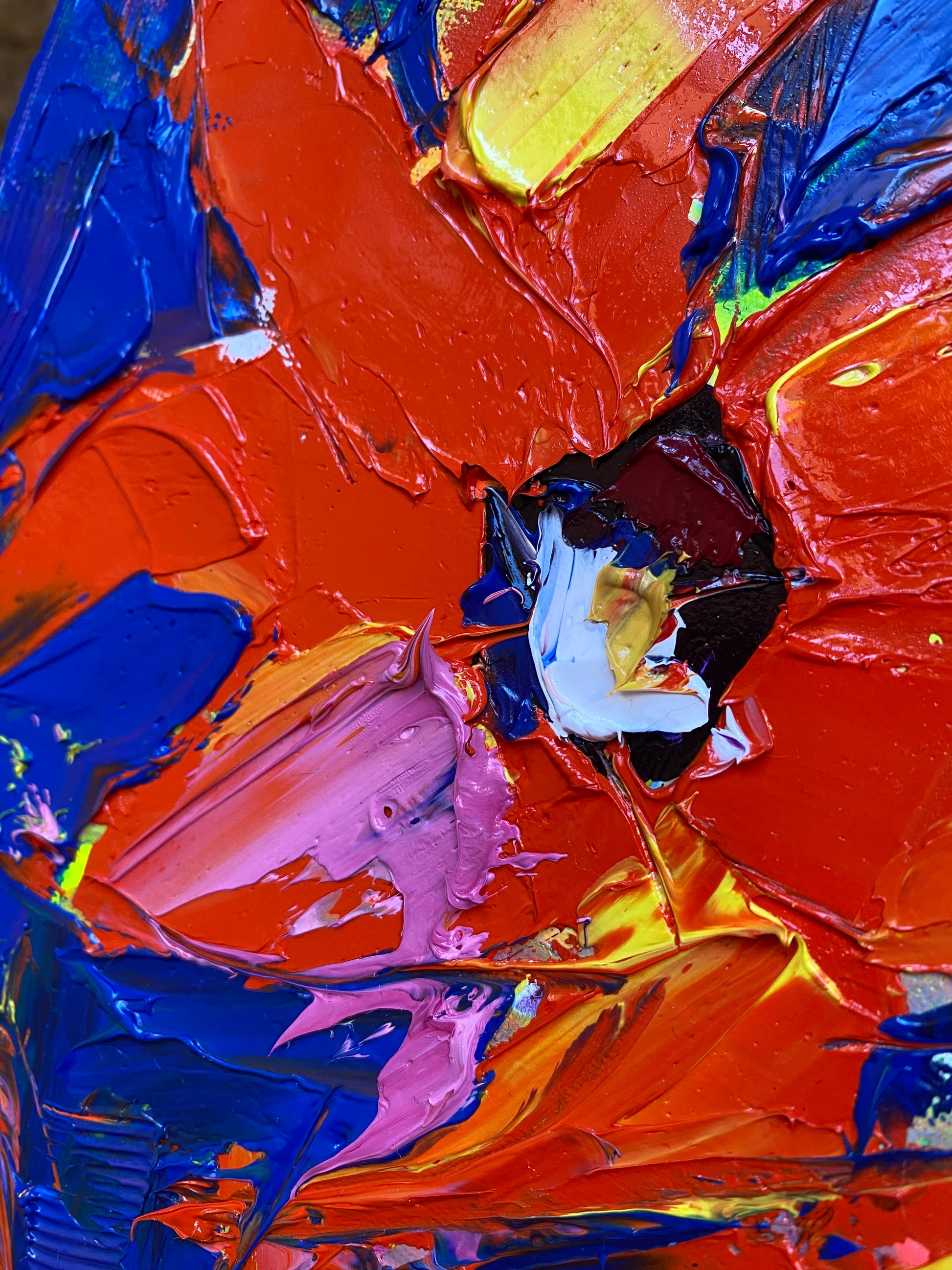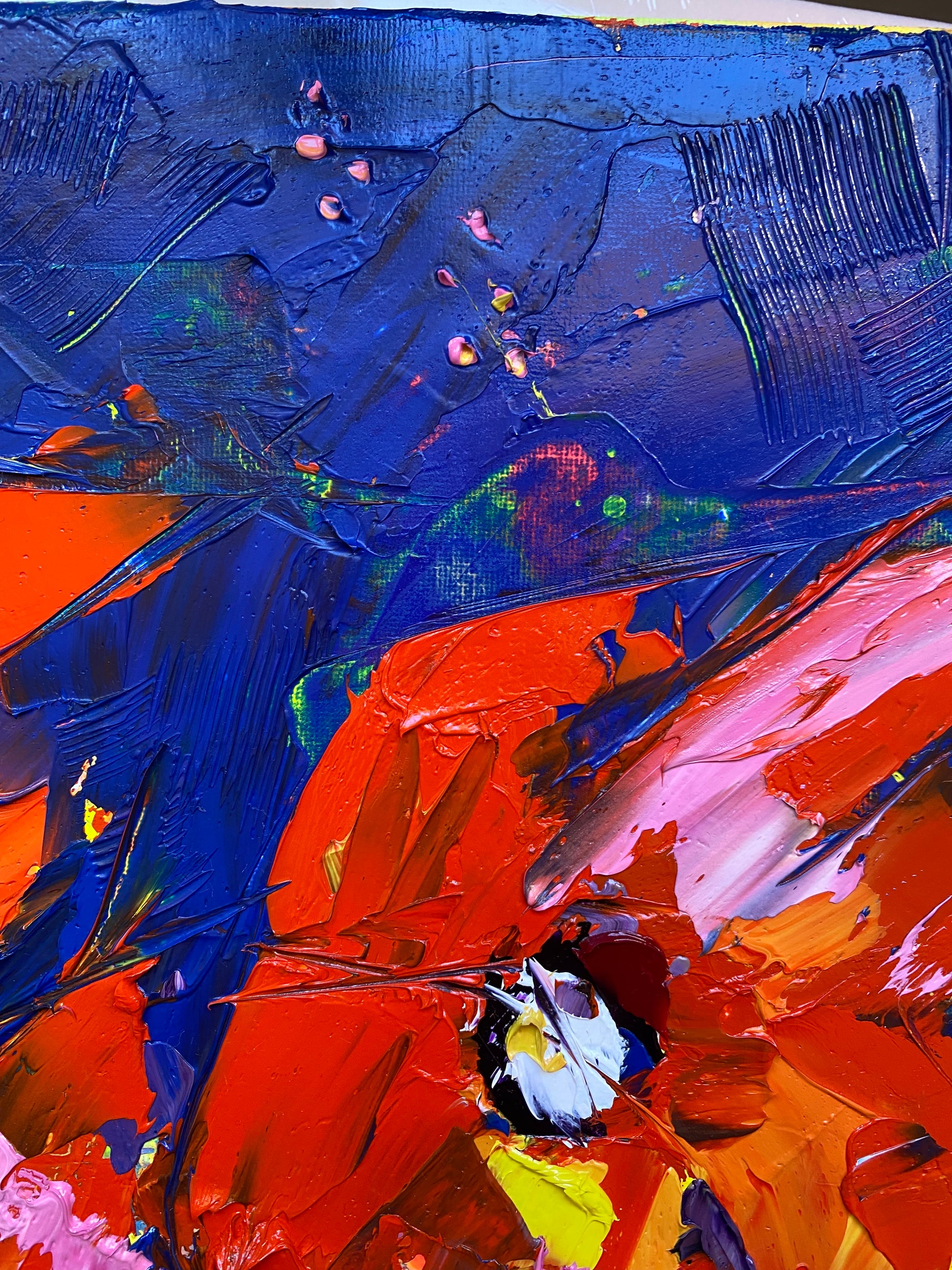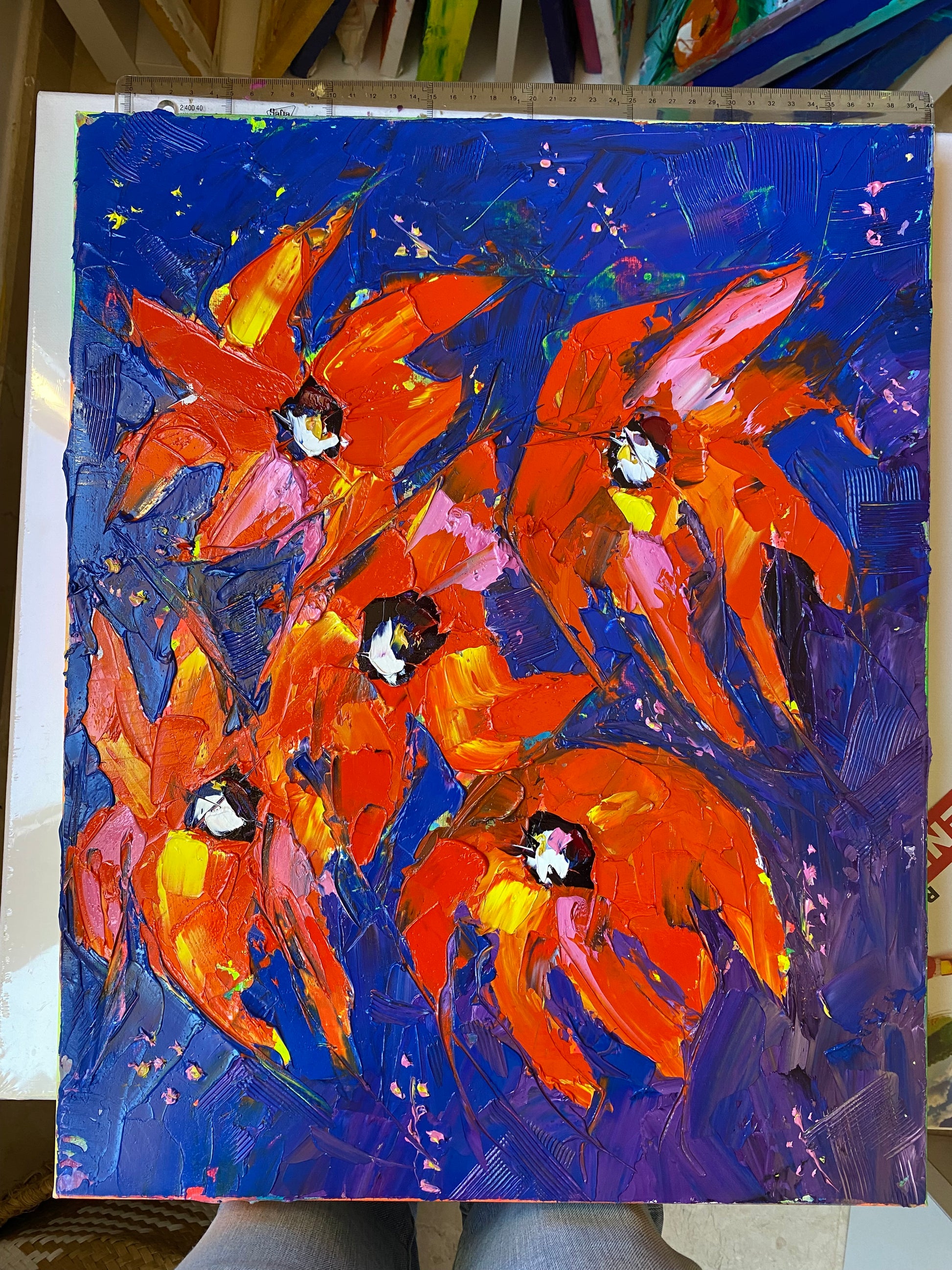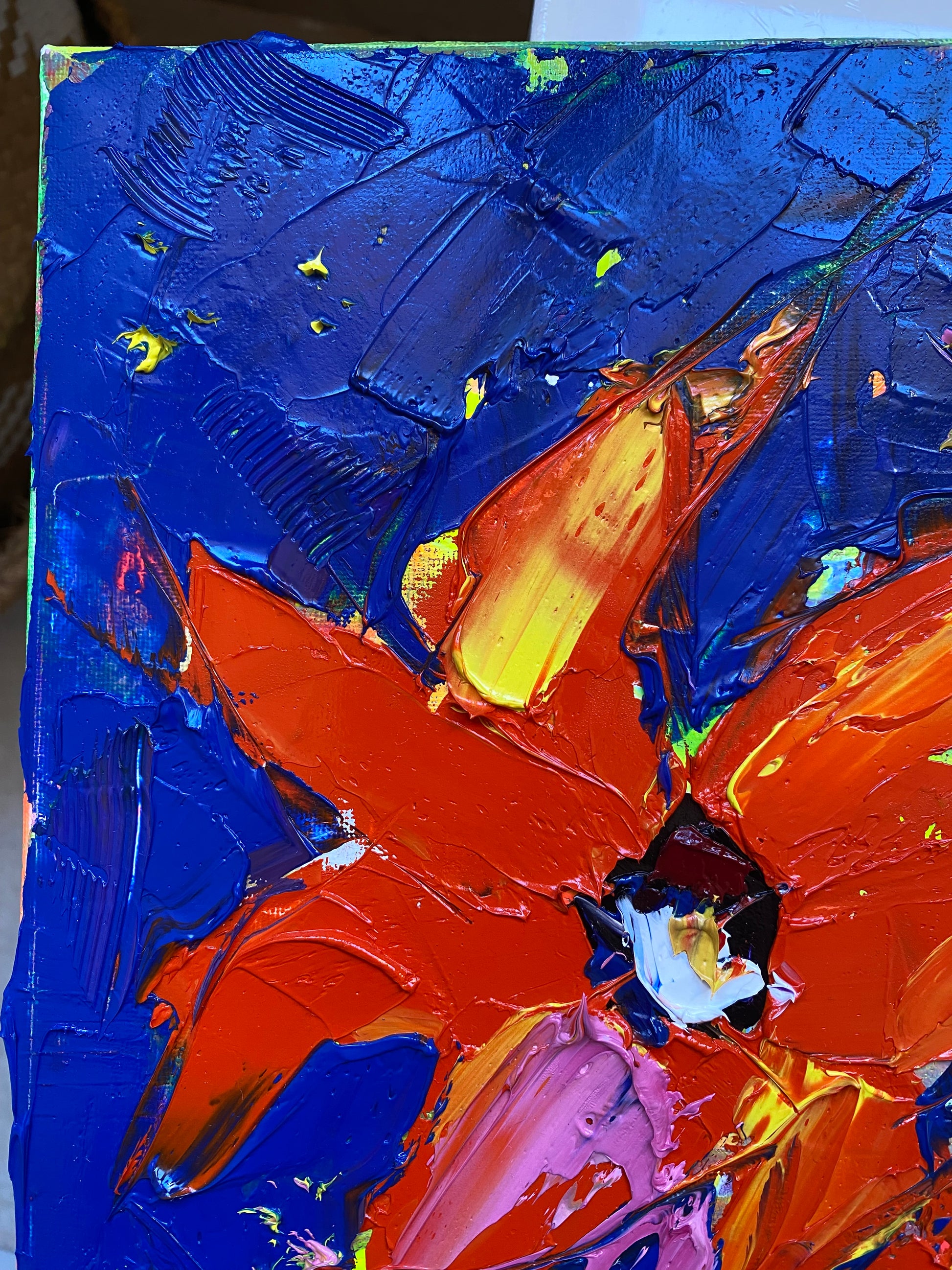 Flames” is an expressive oil painting created with a palette knife, capturing the fierce beauty of abstract flowers in motion. Bold crimson and orange strokes ignite against a vibrant blue background, evoking the energy and freedom of fire. A celebration of color, texture, and wild emotion.