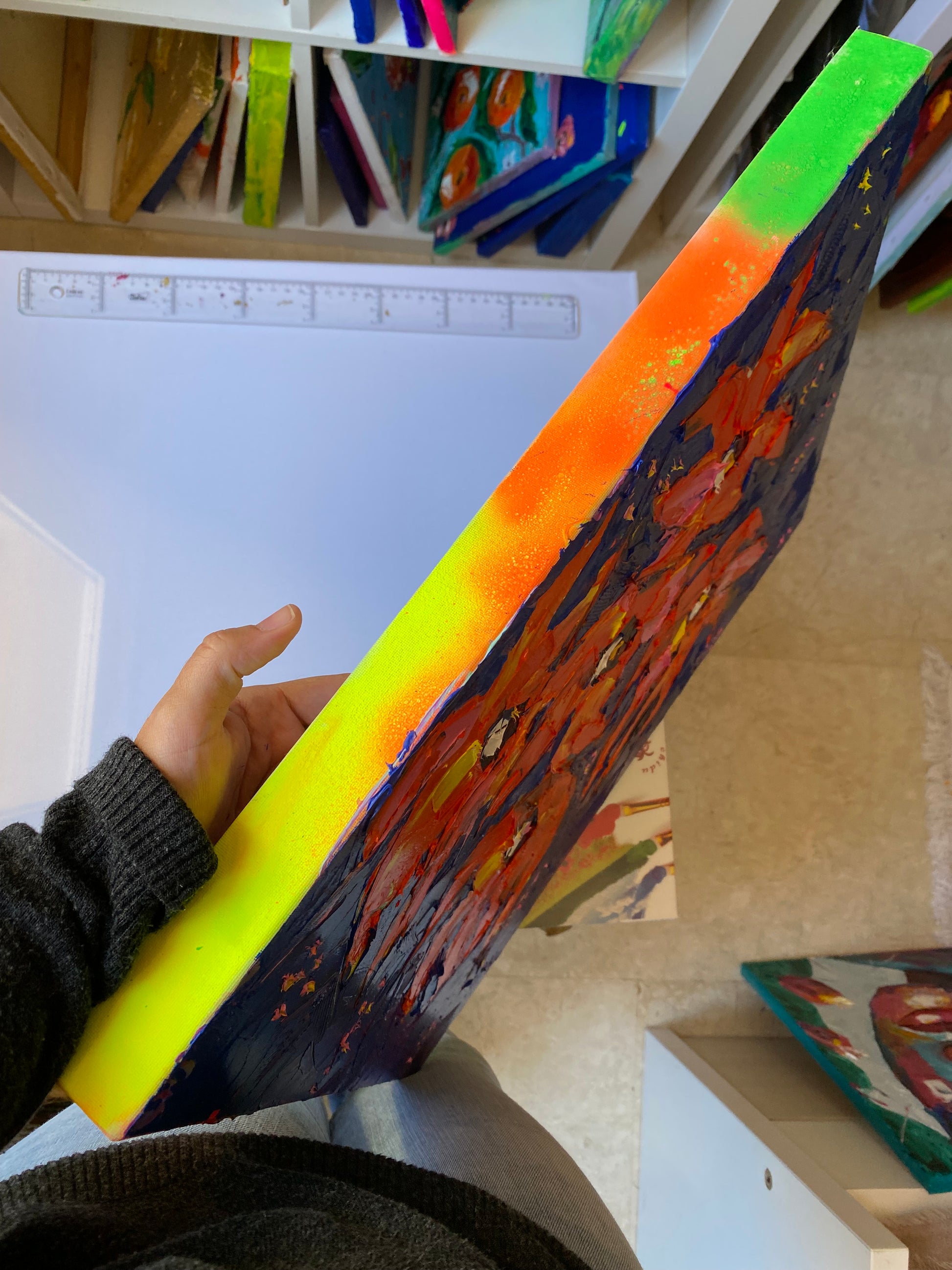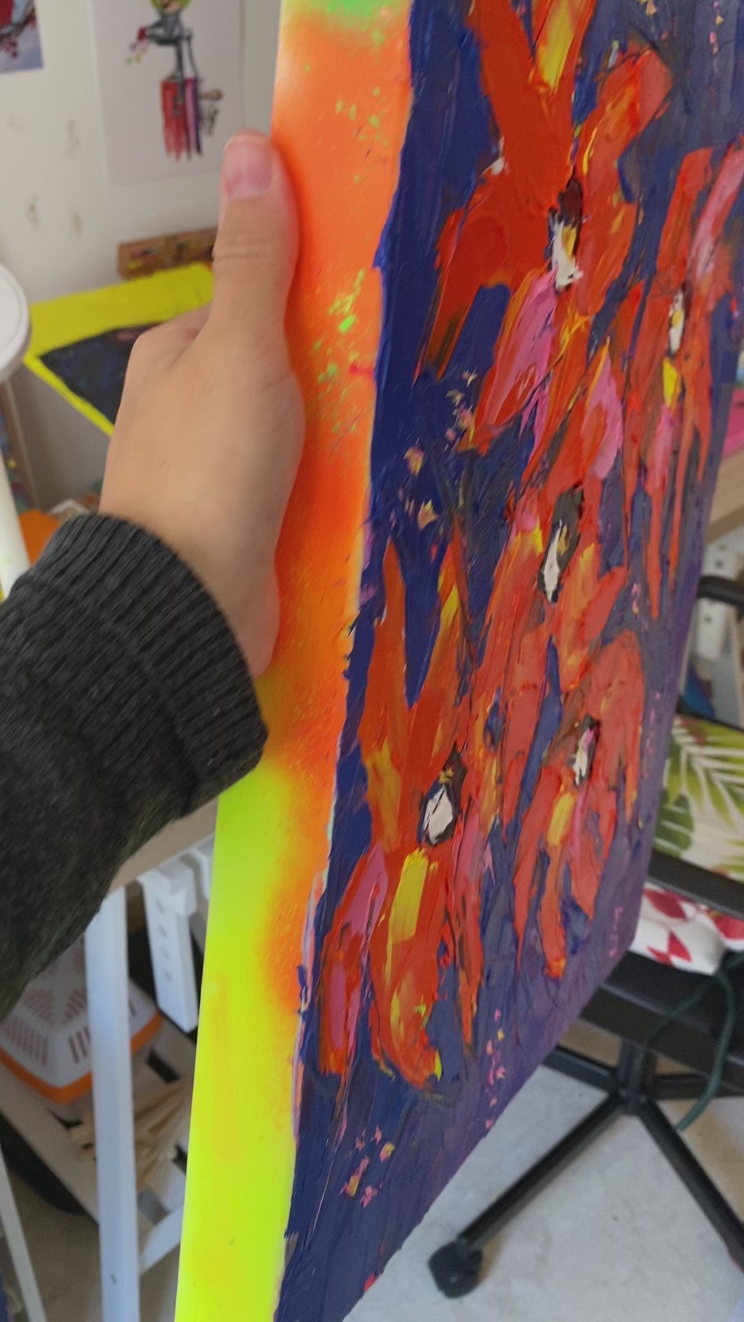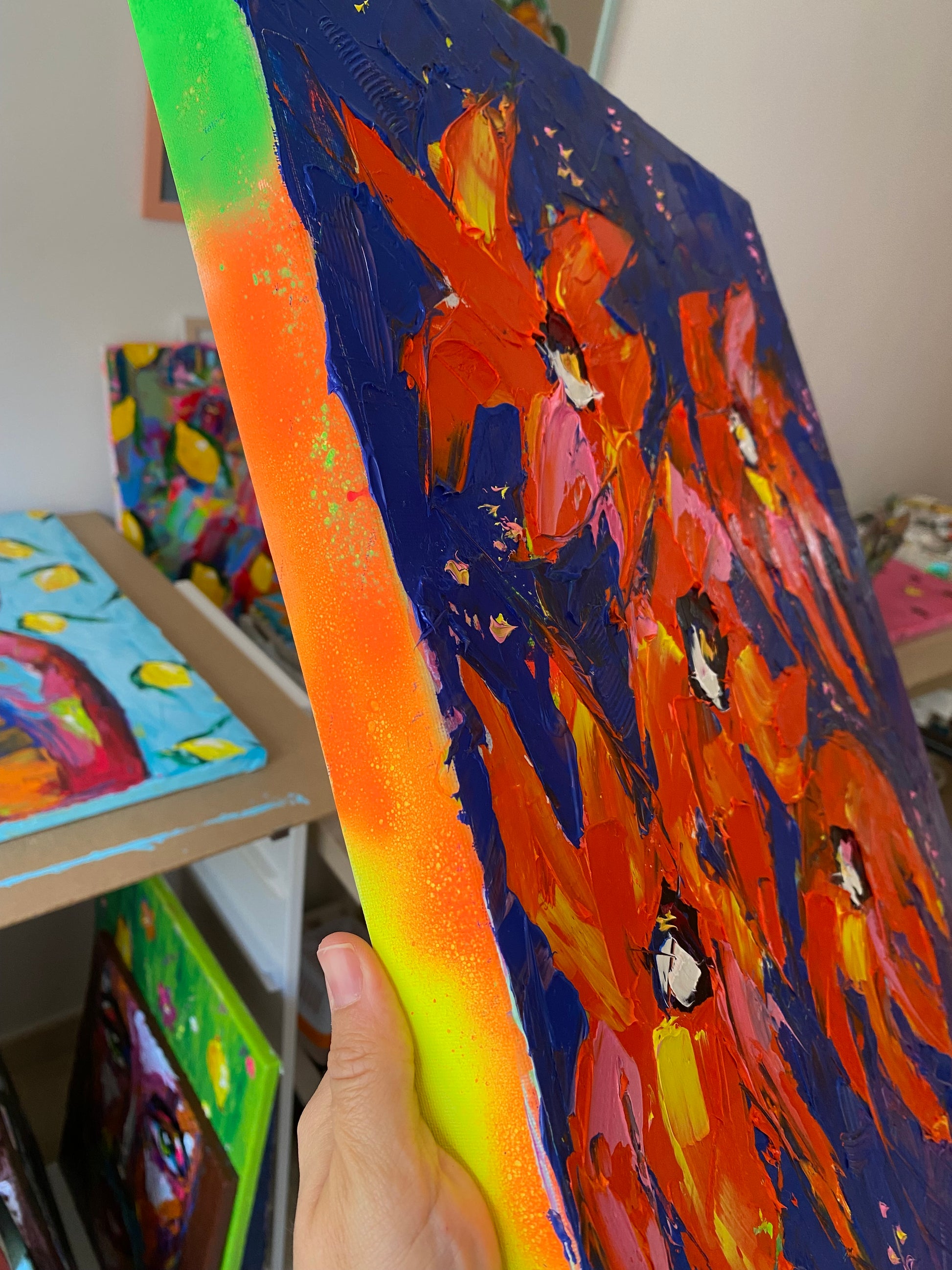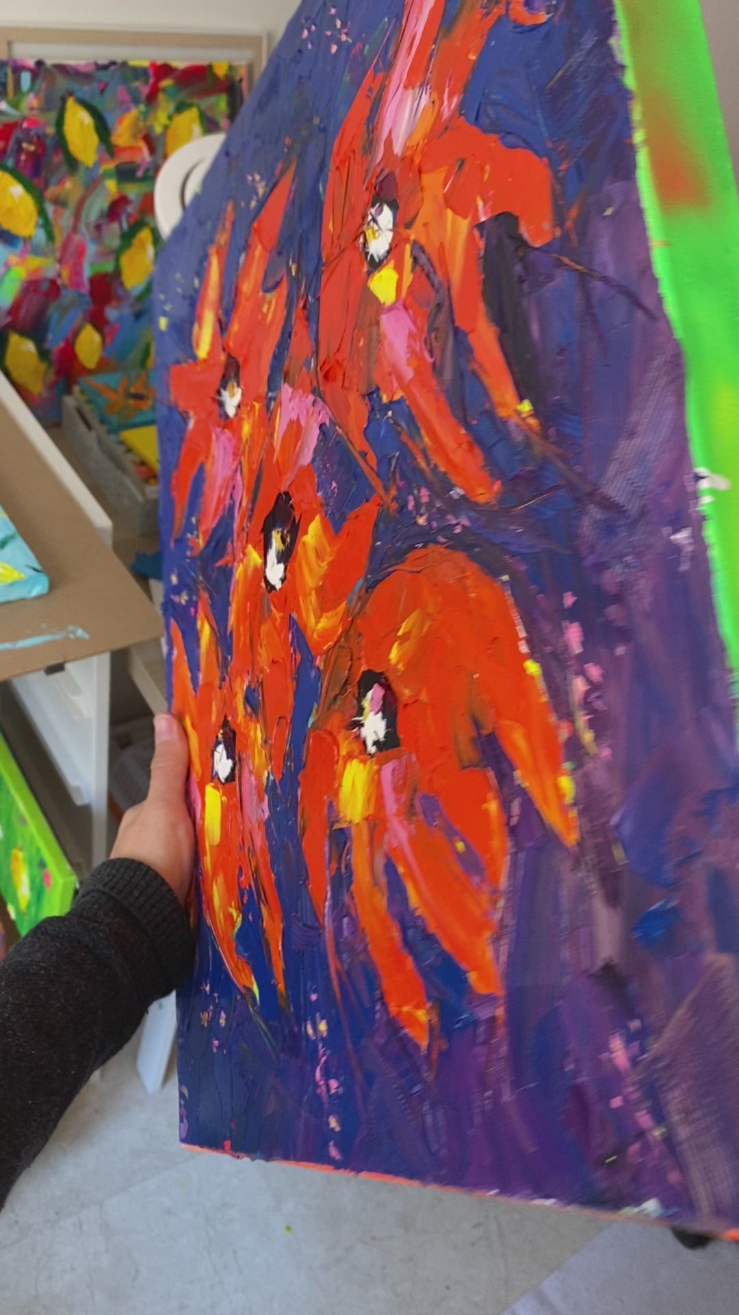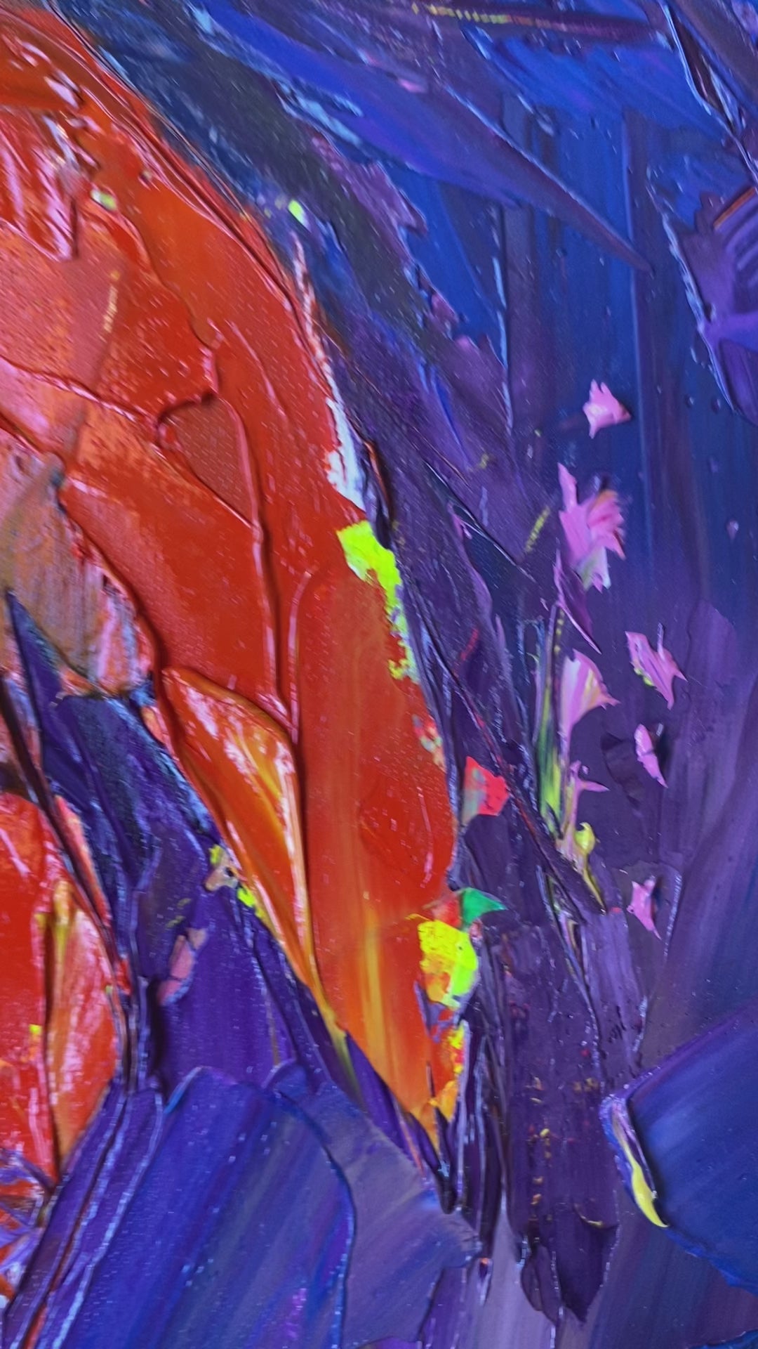 Flames” is an expressive oil painting created with a palette knife, capturing the fierce beauty of abstract flowers in motion. Bold crimson and orange strokes ignite against a vibrant blue background, evoking the energy and freedom of fire. A celebration of color, texture, and wild emotion.