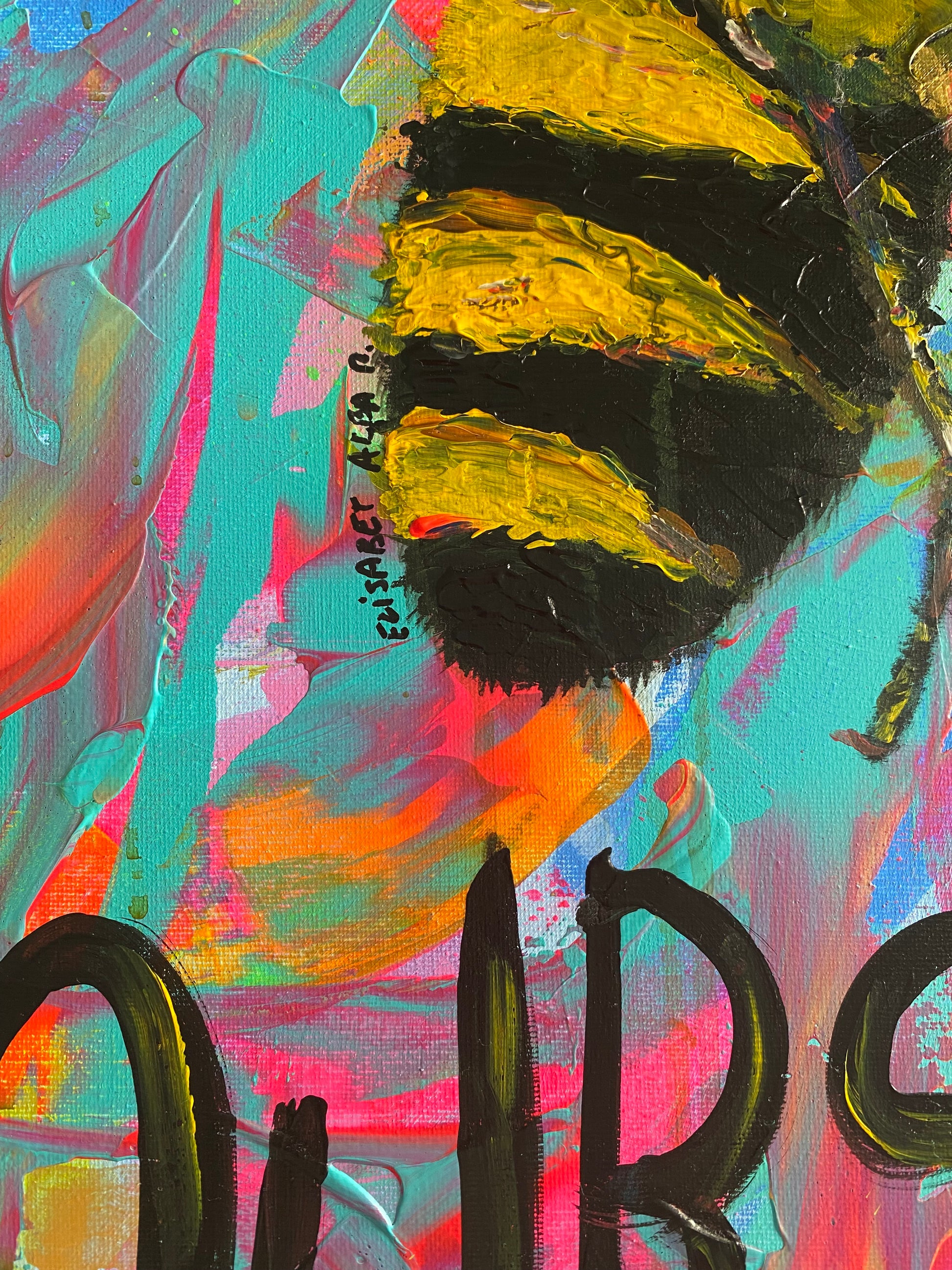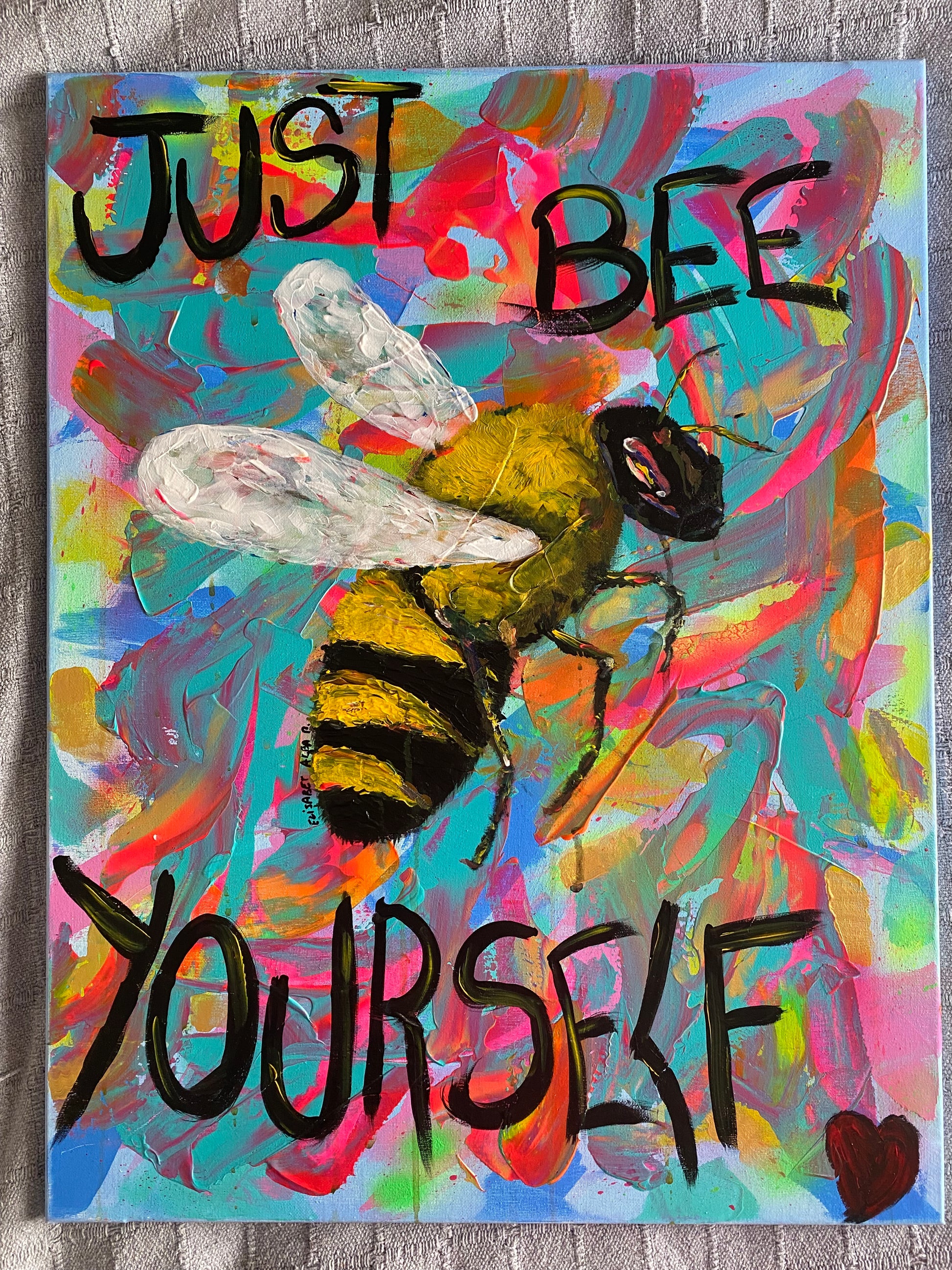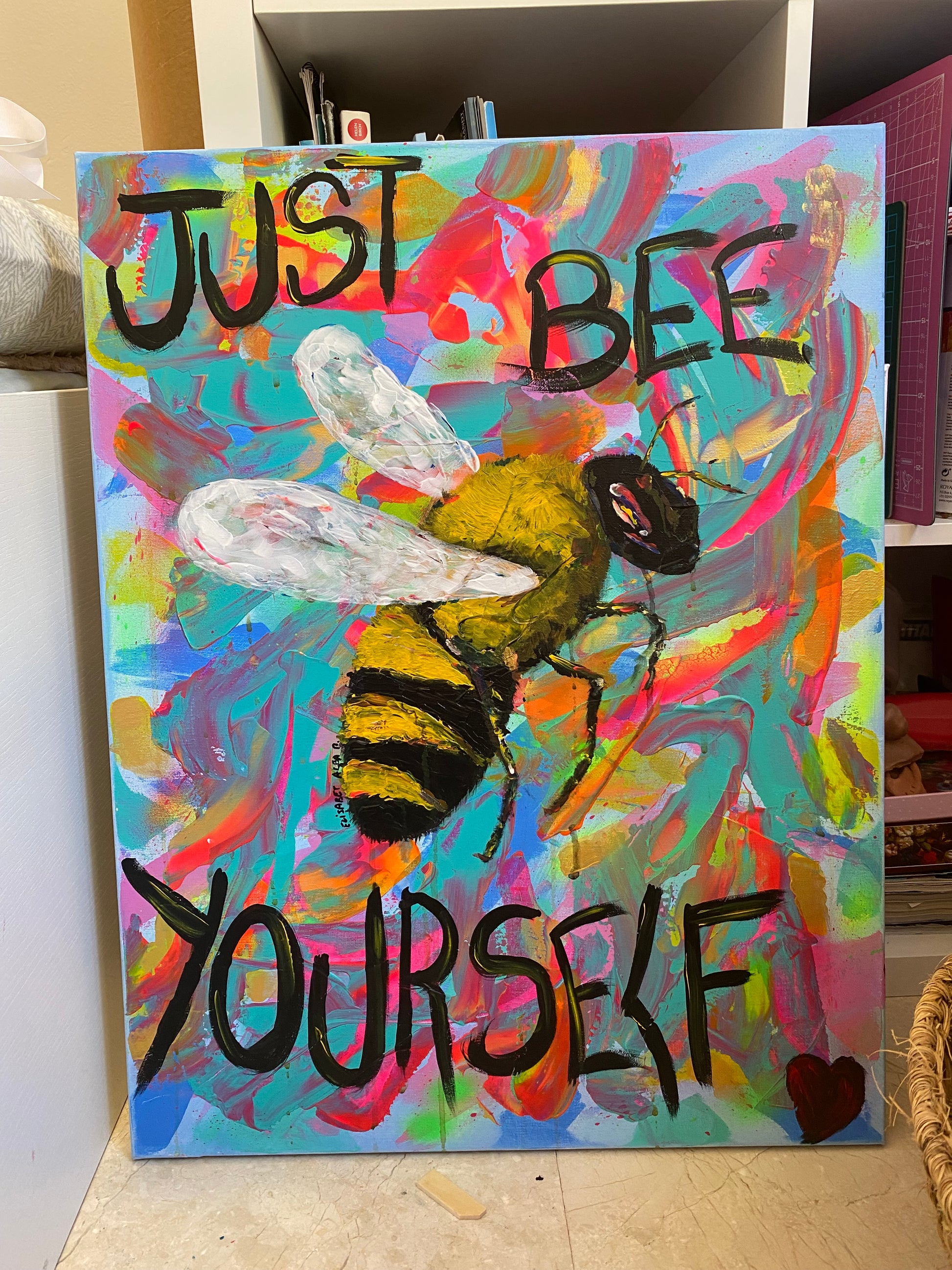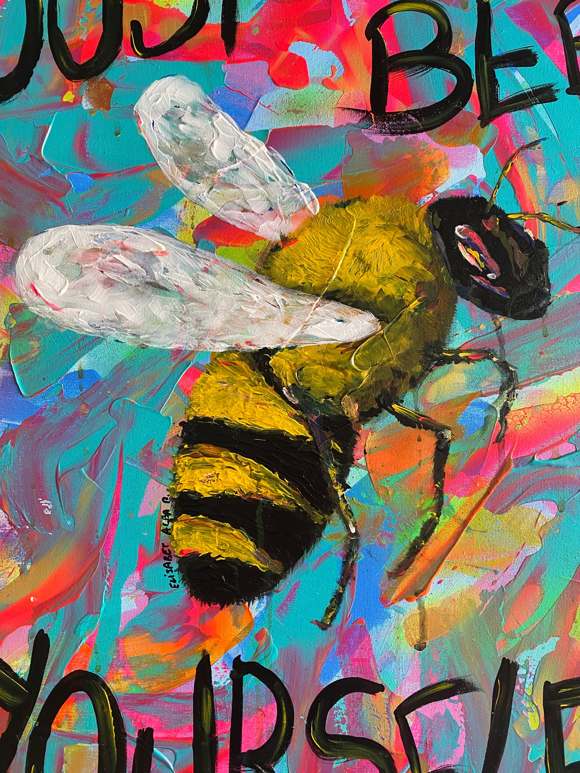 Playful, vibrant, and empowering, this mixed-media style canvas bursts with color and positivity. Against a lively backdrop of swirling neon strokes, a bold bee takes center stage—its textured wings shimmering with light, while the words “Just Bee Yourself” remind us of the beauty of authenticity. Radiating joy and confidence, this artwork is more than a painting: it’s a daily affirmation to embrace who you are and let your true colors shine.