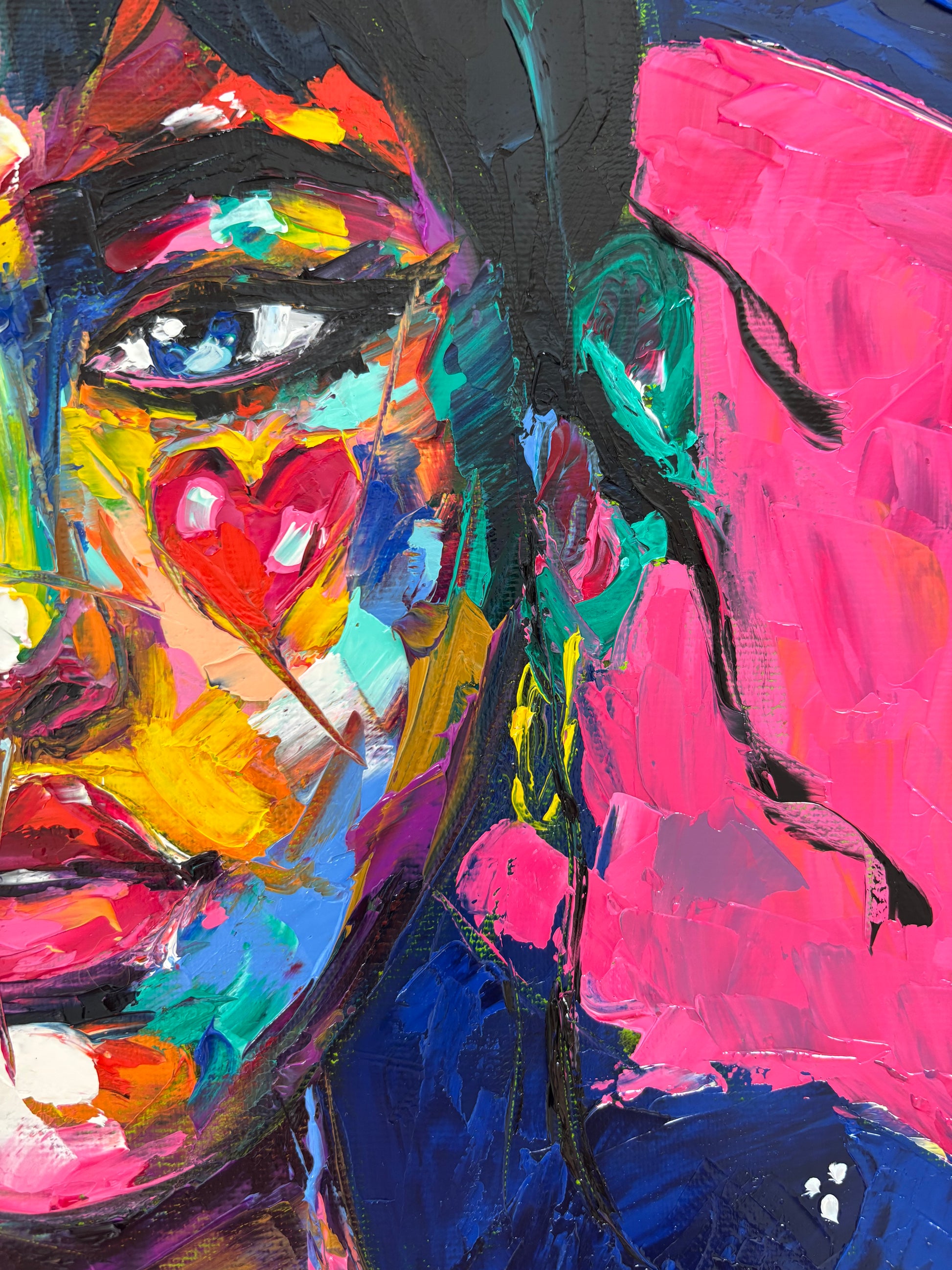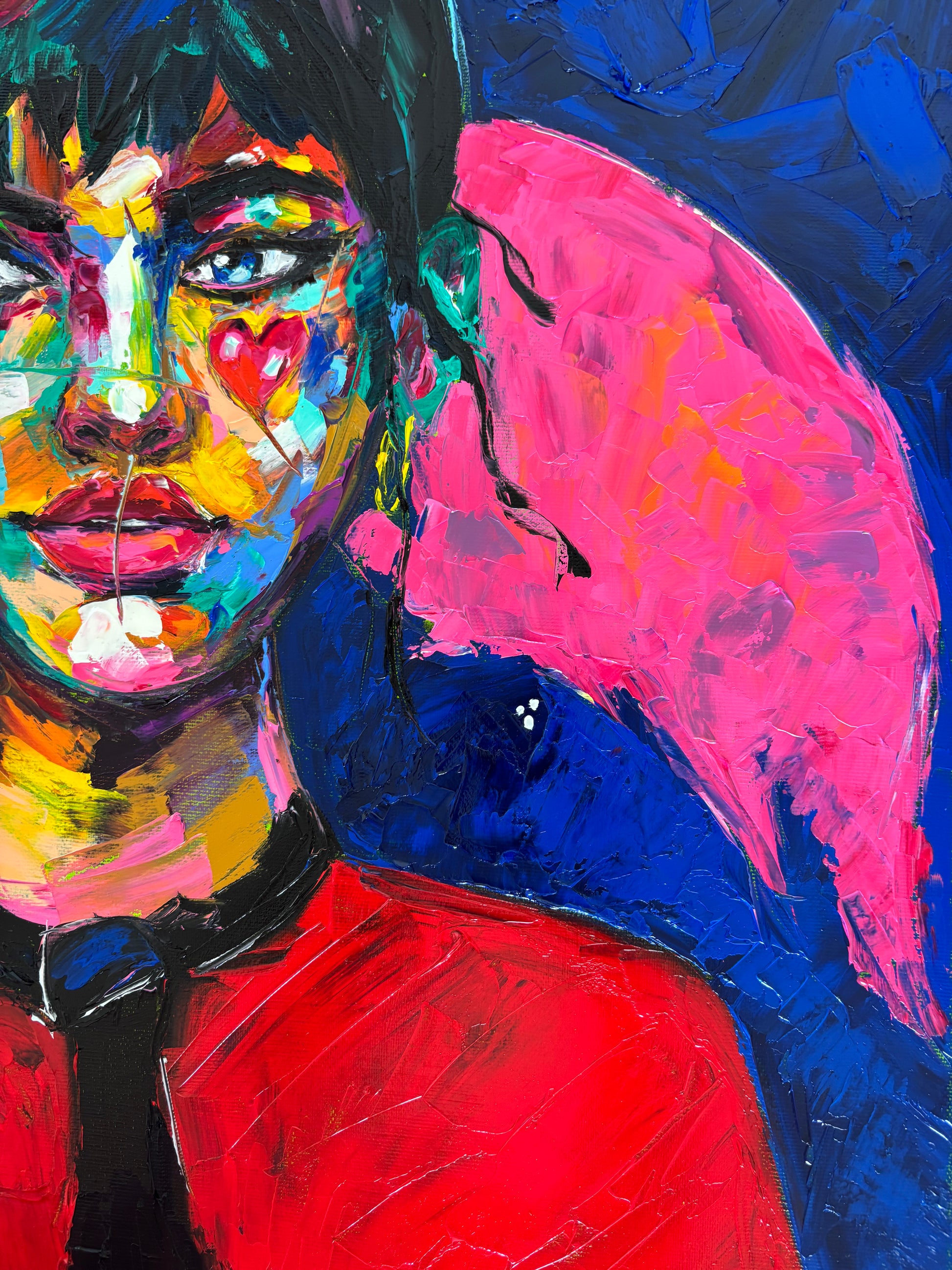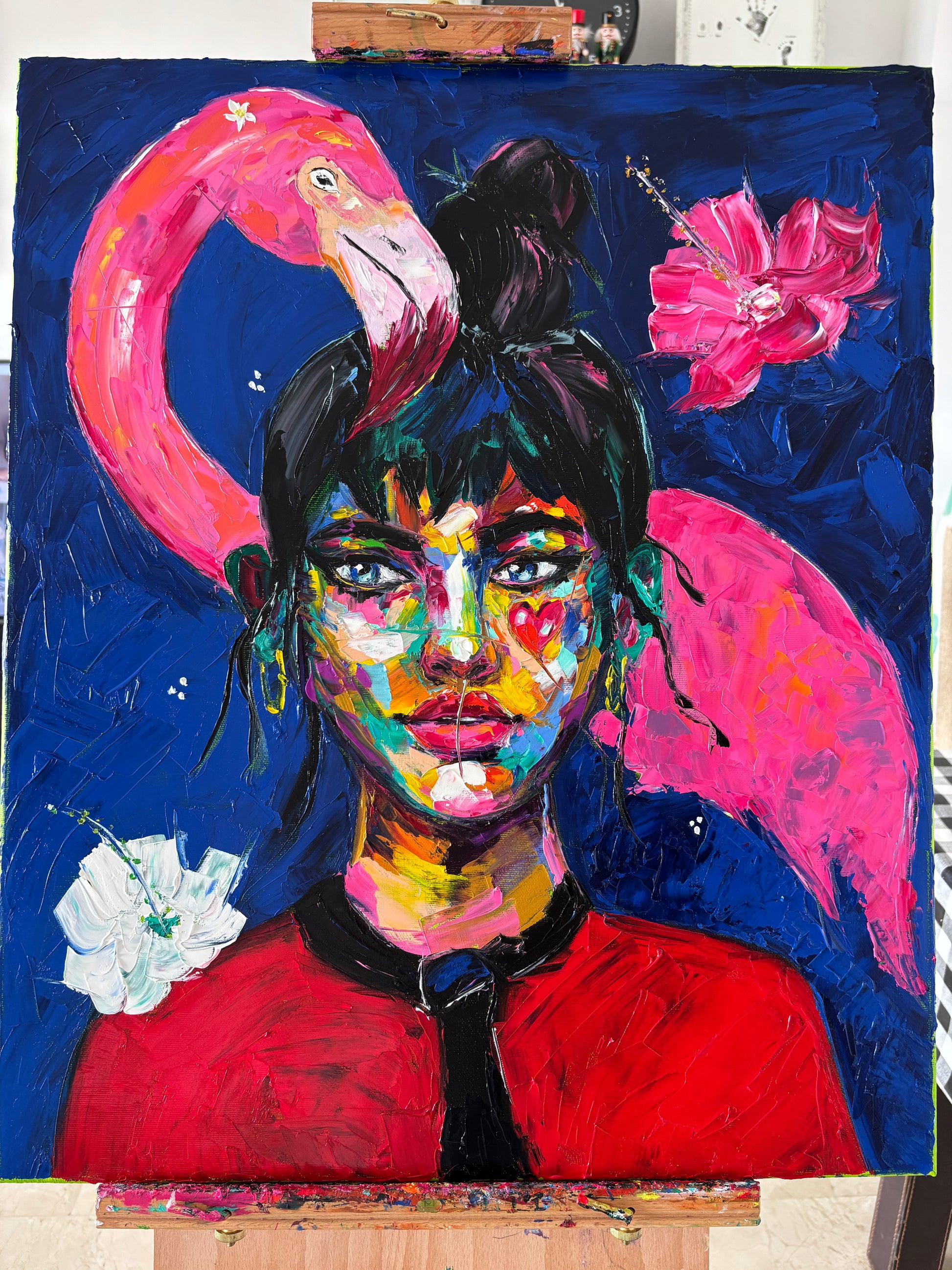 “The Pink Omen” is a powerful oil painting created with bold palette knife strokes that fuse surrealism and expressionism. A woman’s colorful, textured face stares forward with intensity, while a vibrant pink flamingo gracefully curves around her head like a crown, accompanied by blooming hibiscus flowers. The deep blue background enhances the striking reds, pinks, and multicolored details, creating a vivid contrast that radiates strength, mystery, and femininity. A captivating statement piece, The Pink Omen speaks of transformation, beauty, and the symbolism hidden in nature.