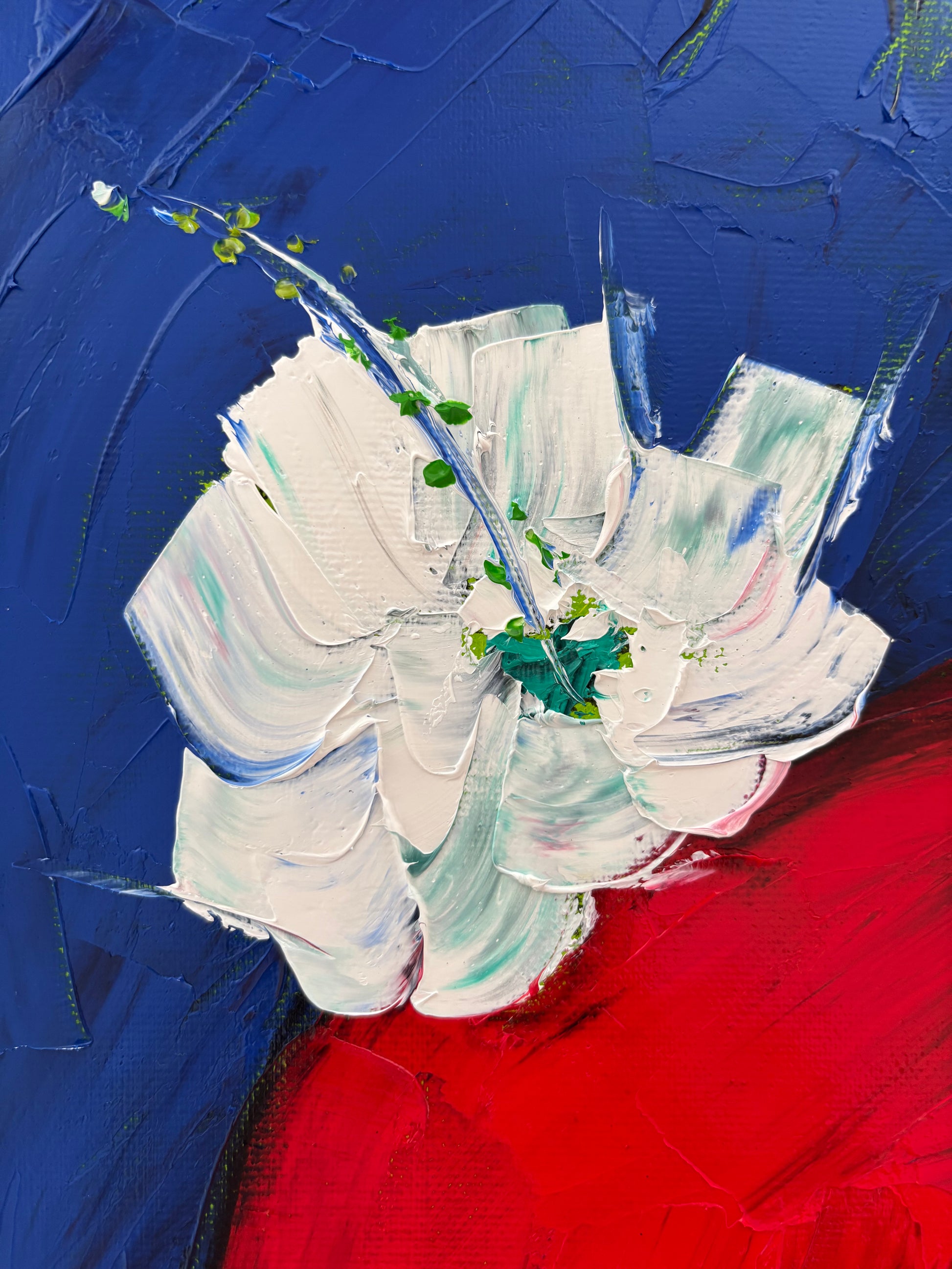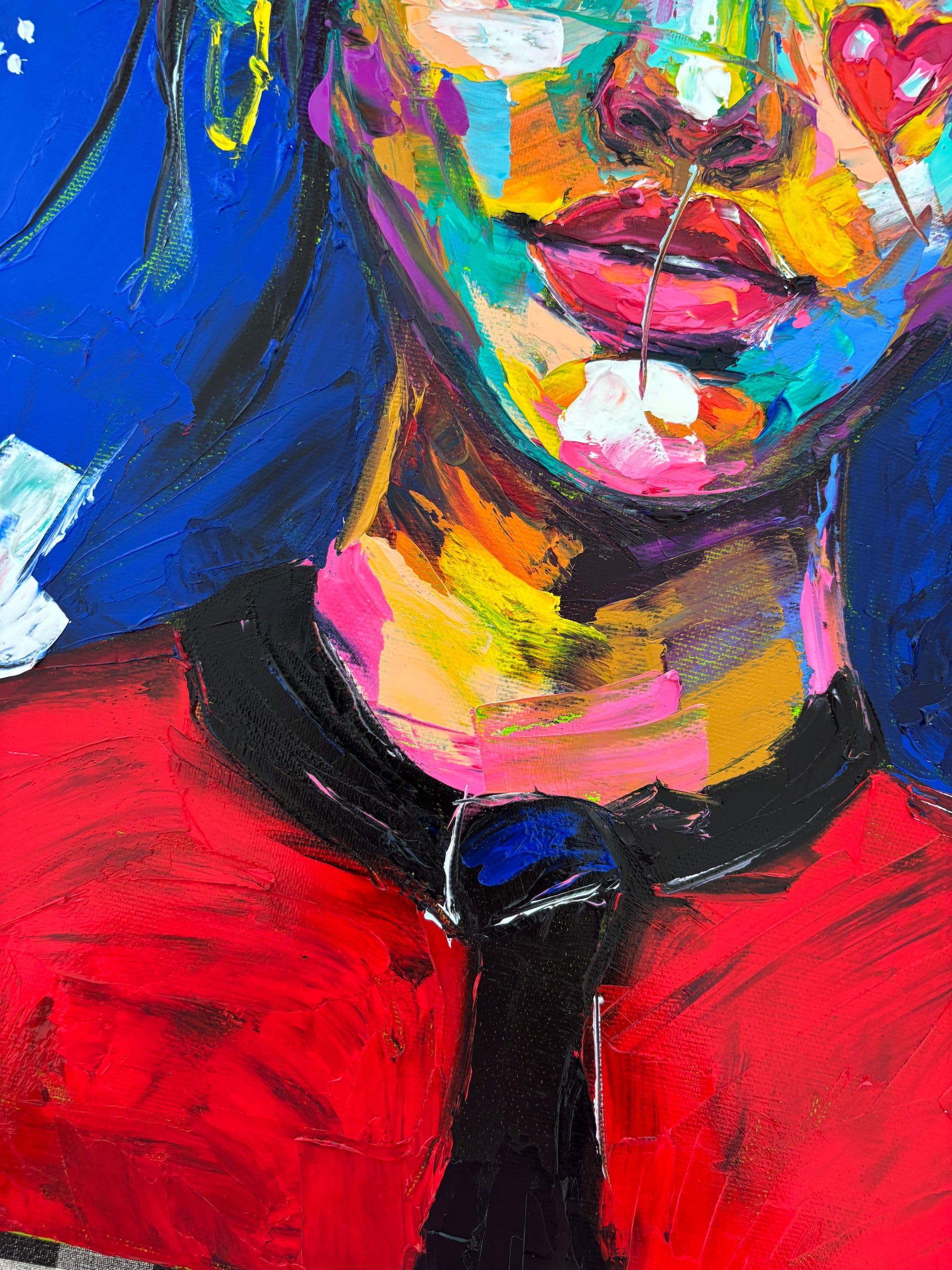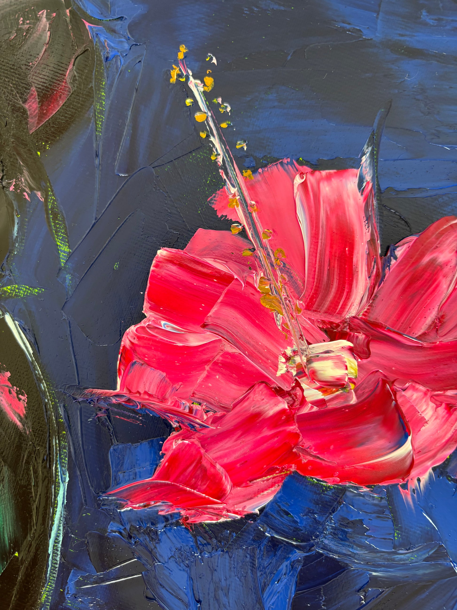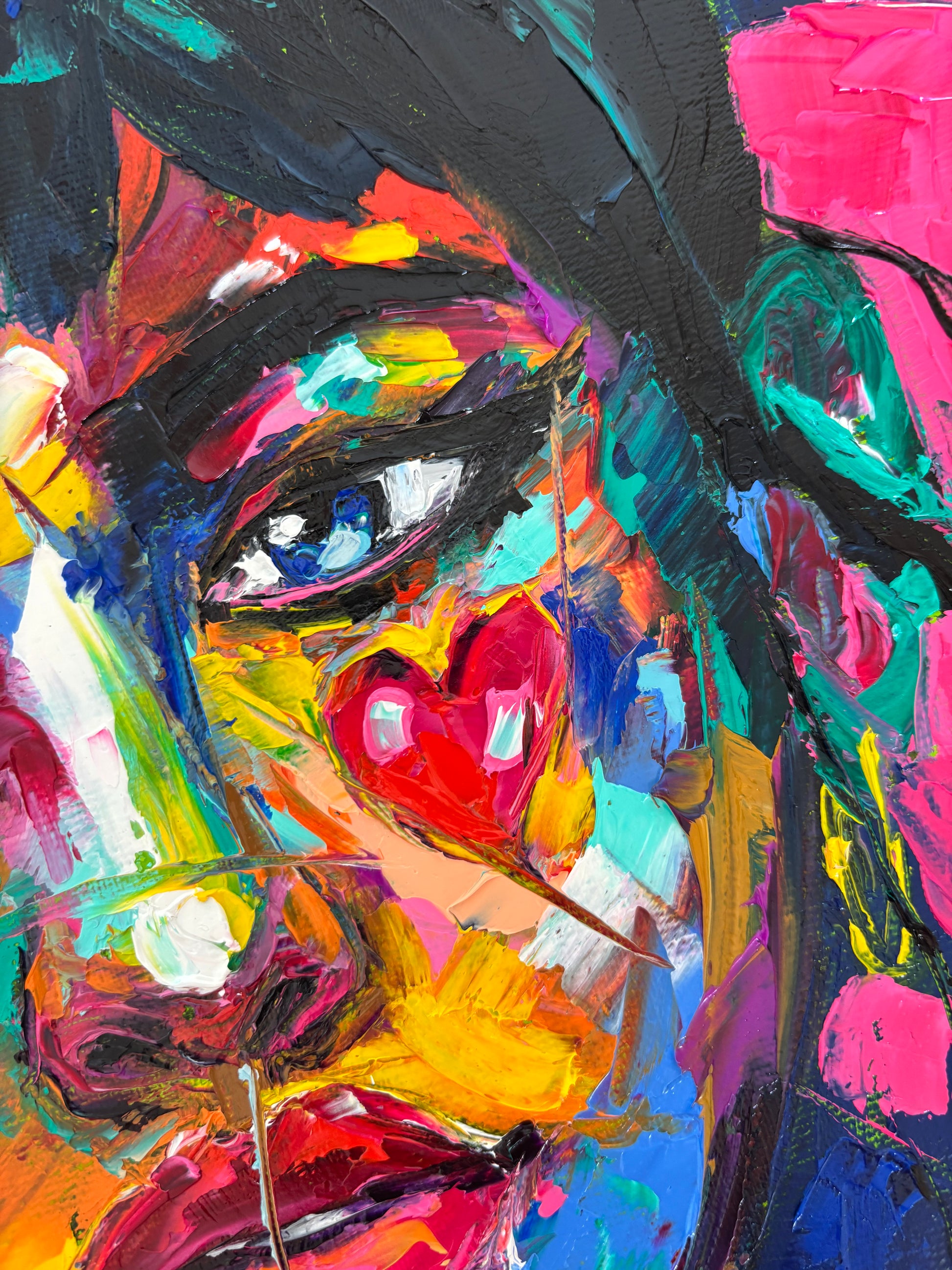 “The Pink Omen” is a powerful oil painting created with bold palette knife strokes that fuse surrealism and expressionism. A woman’s colorful, textured face stares forward with intensity, while a vibrant pink flamingo gracefully curves around her head like a crown, accompanied by blooming hibiscus flowers. The deep blue background enhances the striking reds, pinks, and multicolored details, creating a vivid contrast that radiates strength, mystery, and femininity. A captivating statement piece, The Pink Omen speaks of transformation, beauty, and the symbolism hidden in nature.