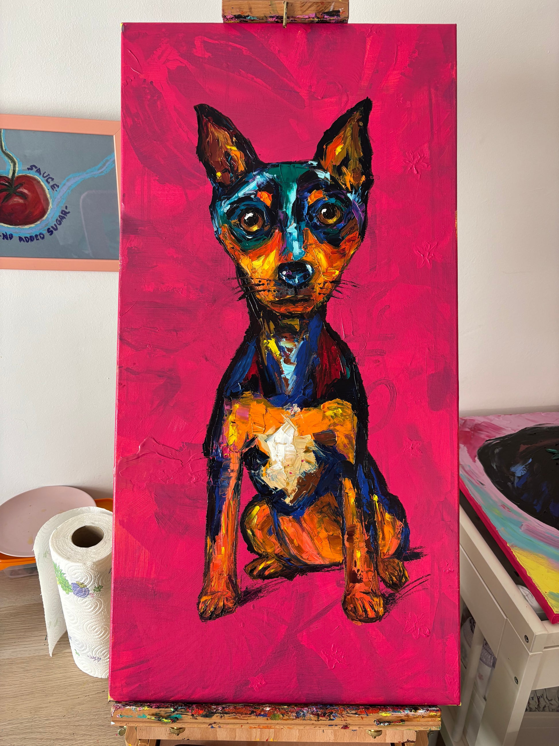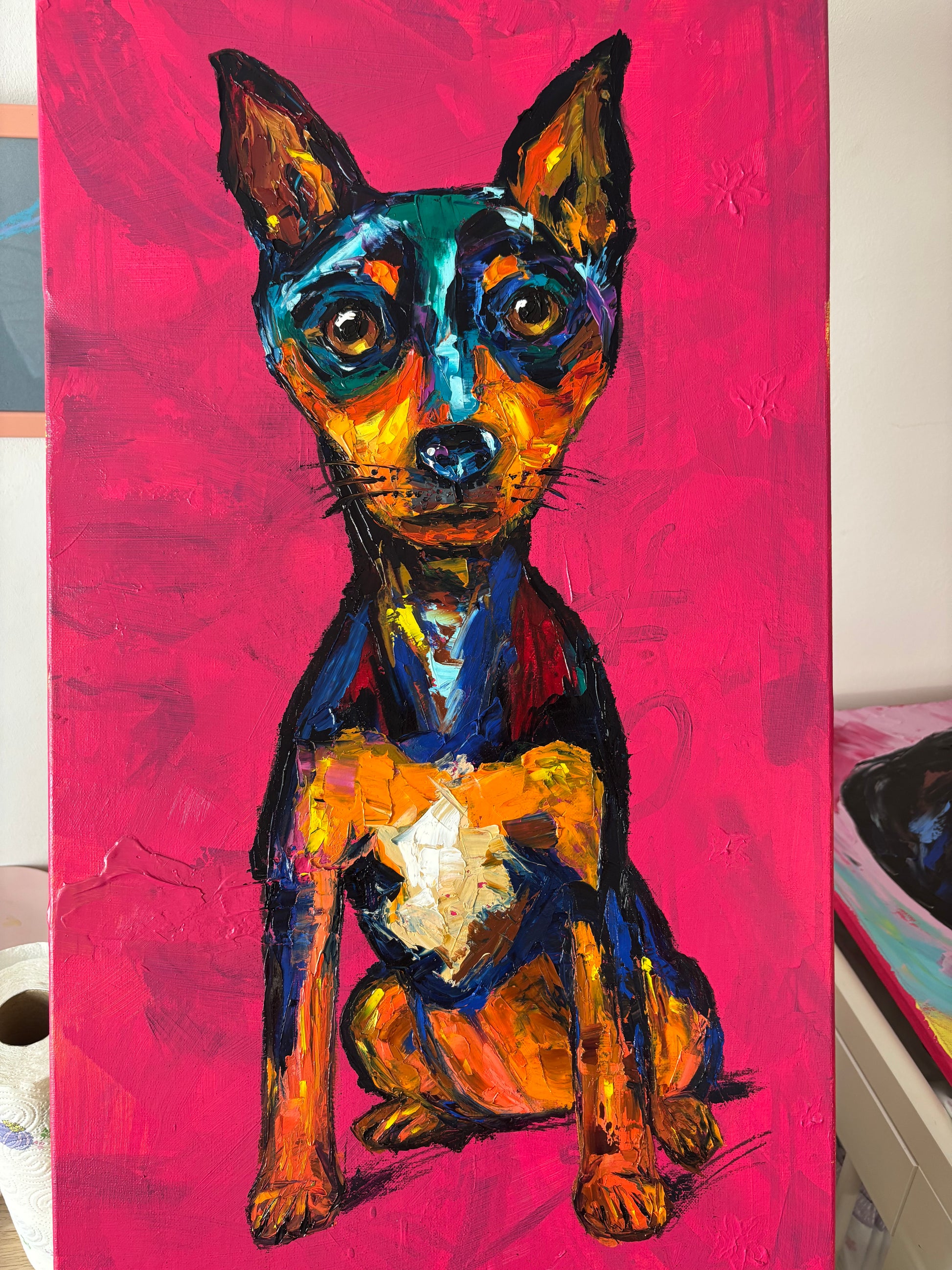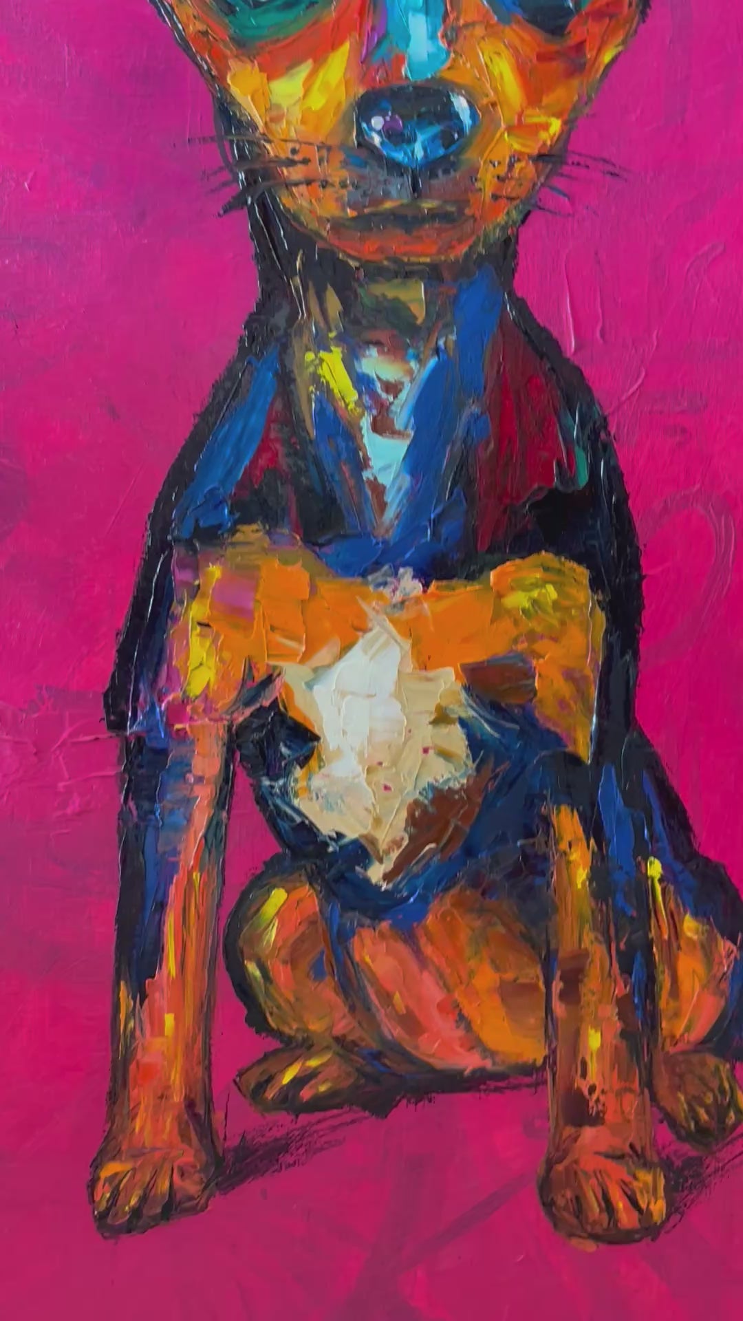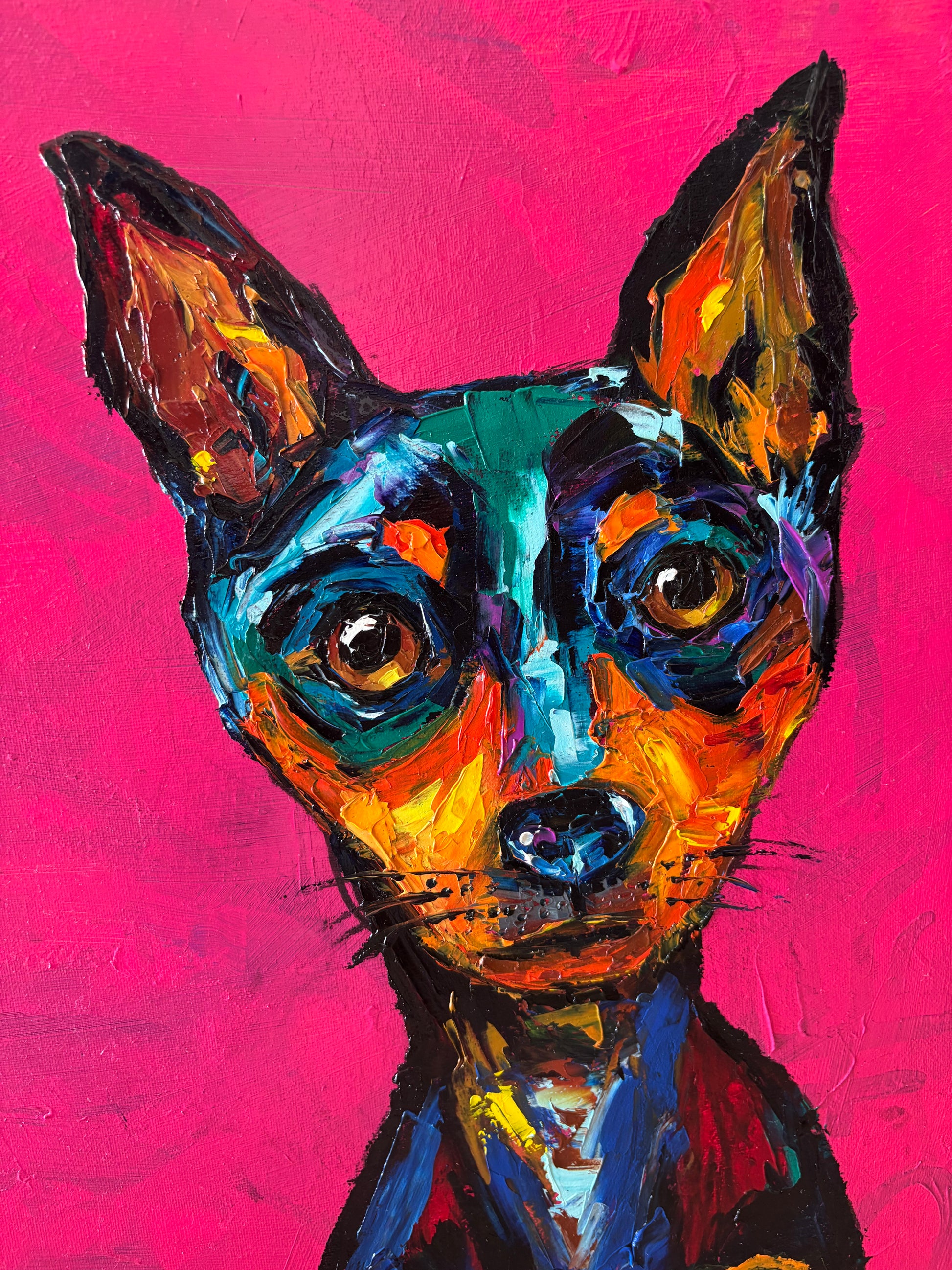 This piece is a vivid explosion of emotion captured through oil and bold brushstrokes, celebrating the soulful eyes and loyal spirit of a beloved companion. I channeled raw expression to bring warmth and depth to the canvas, inviting the viewer to feel the dog's quiet strength and tender vulnerability. It’s an energetic, heartfelt presence that will light up any space with love and intensity.