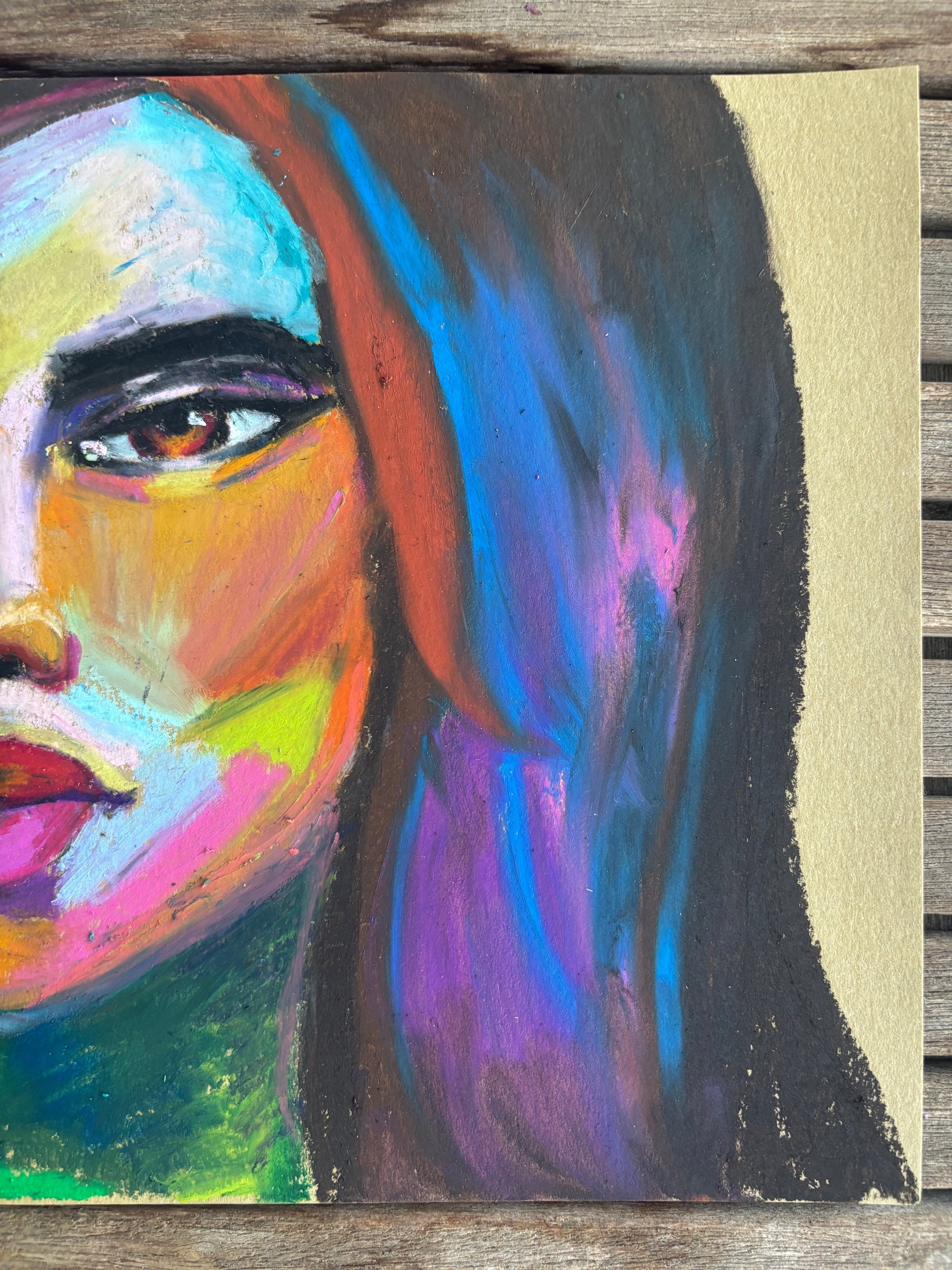 “Untamed Spectrum” is an expressive portrait created with oil pastels on paper, where vibrant layers of color reveal both intensity and vulnerability. The bold contrasts and raw textures emphasize the untamed spirit behind the gaze, inviting the viewer to connect beyond the surface.