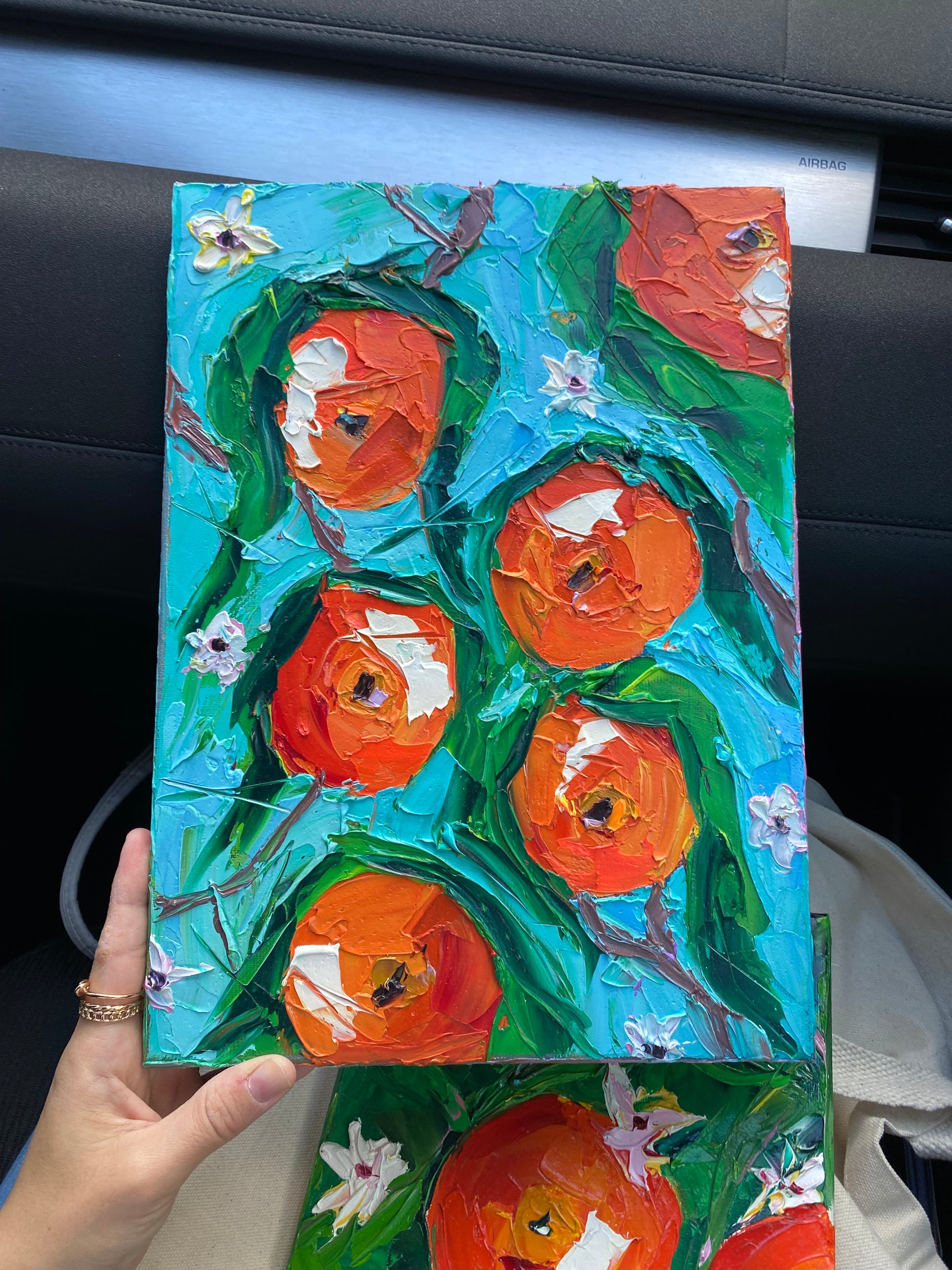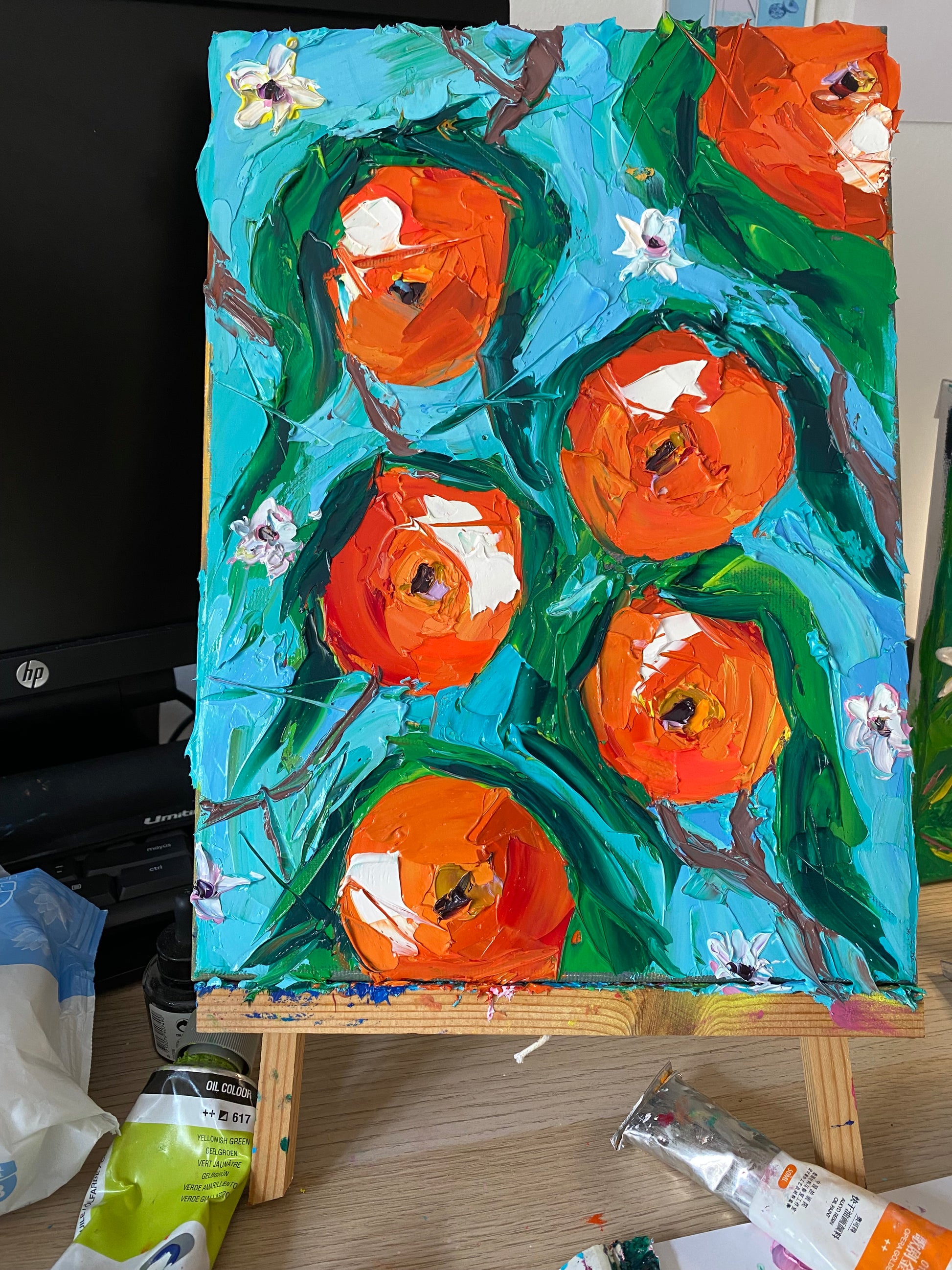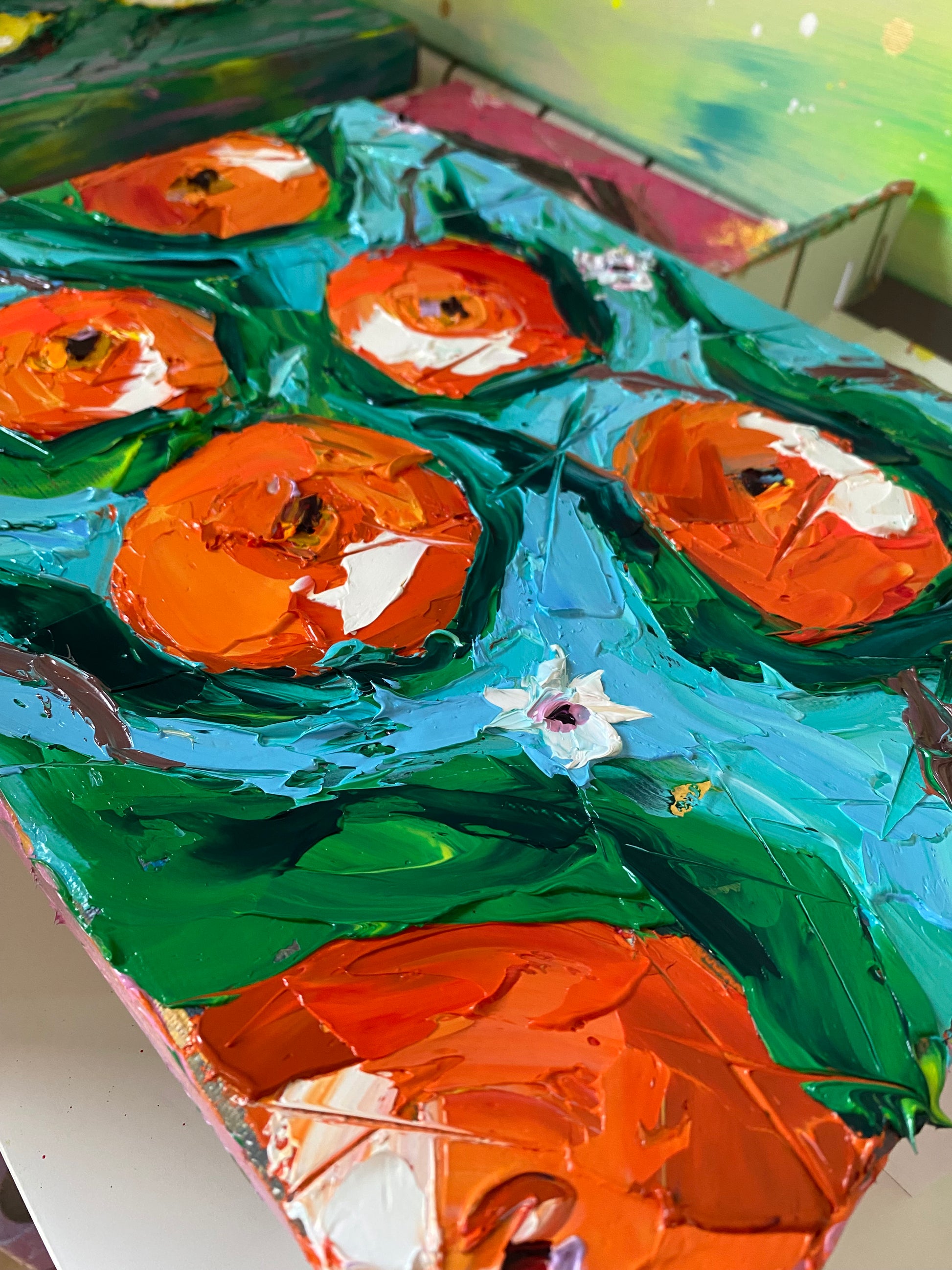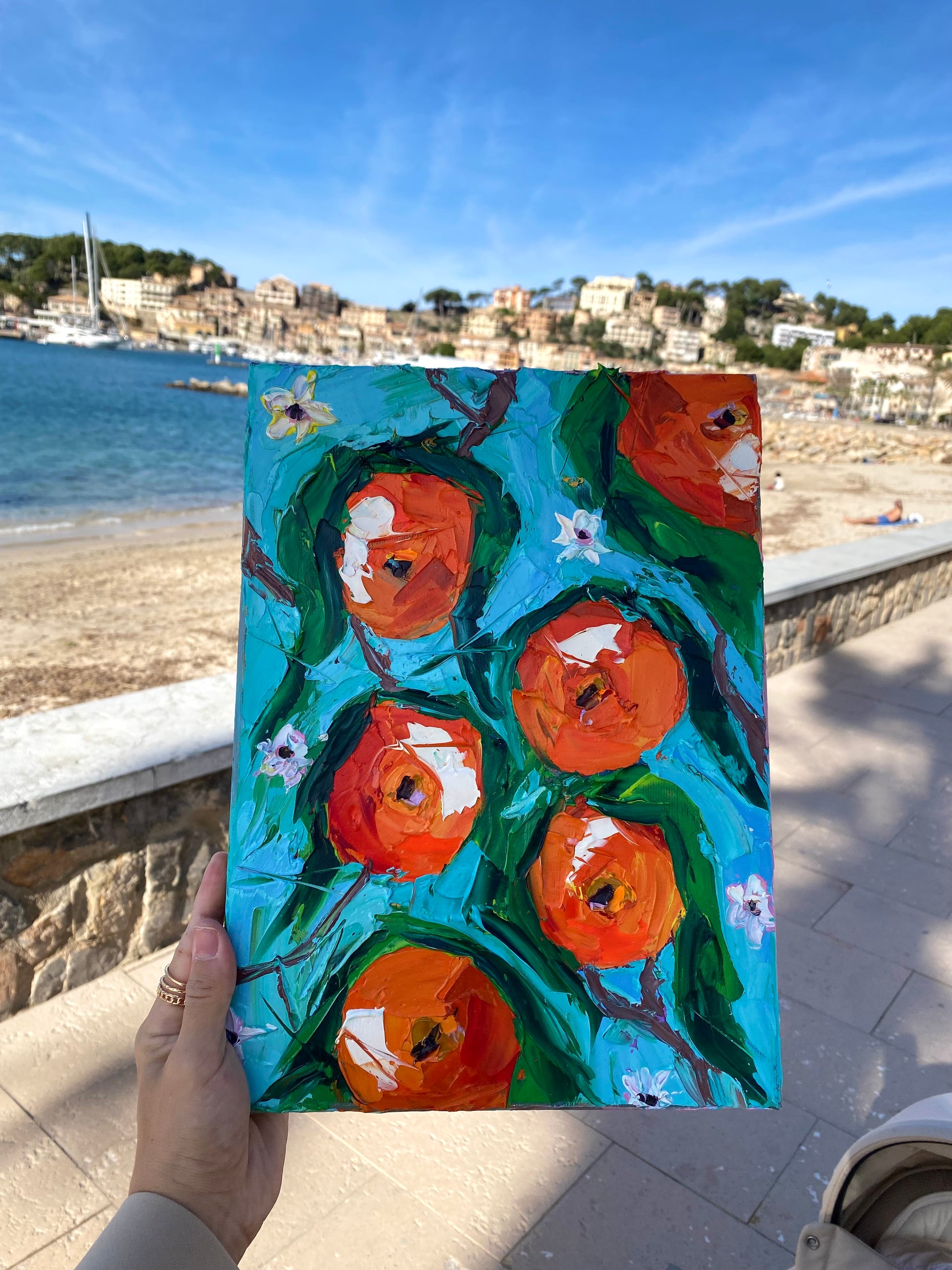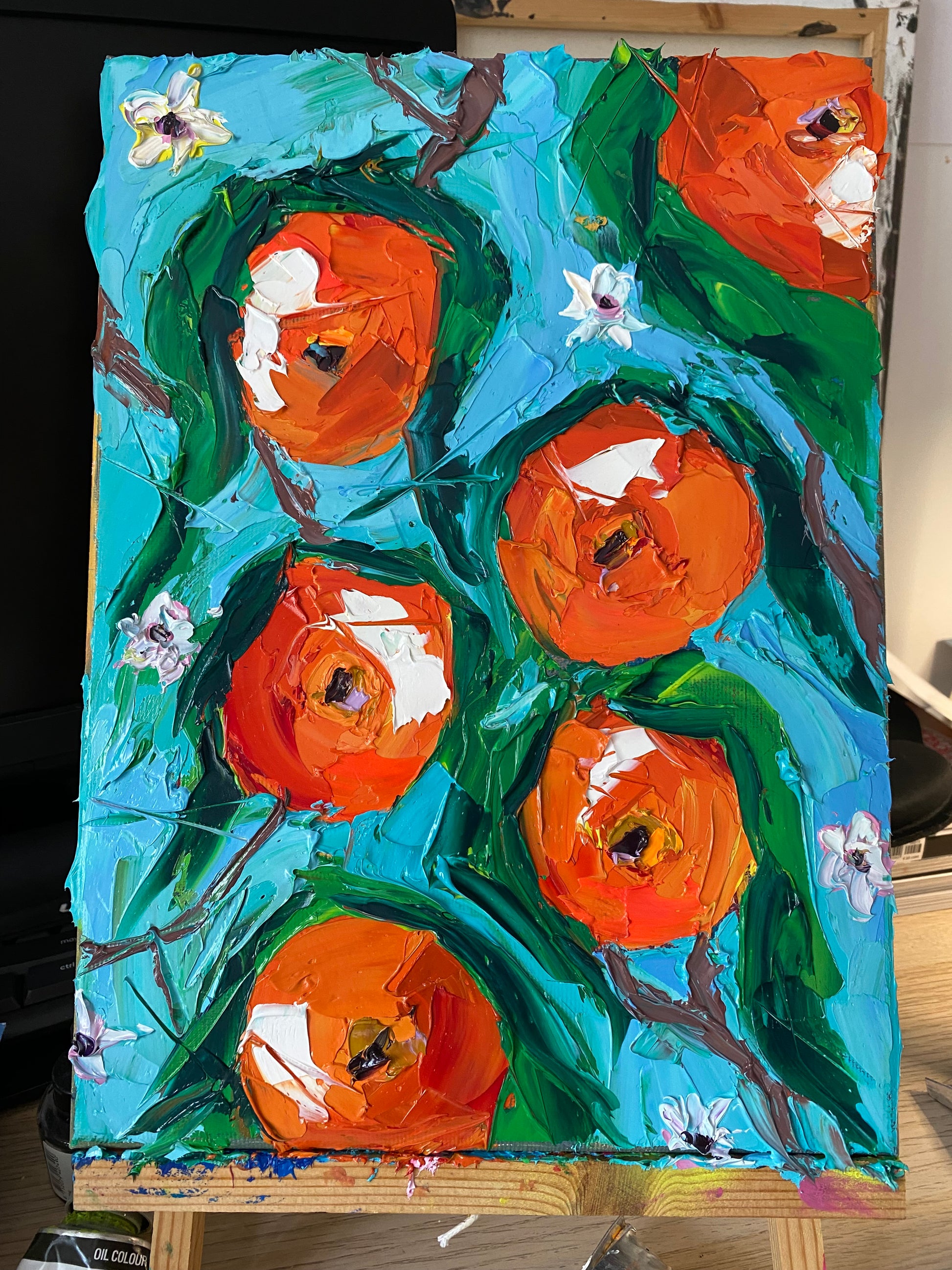 A vibrant tribute to the orchards of Spain, Valencia bursts with the color and vitality of its iconic oranges. Painted with a palette knife, the textured fruits glow in rich shades of orange against fresh turquoise and green, while delicate white blossoms hint at the fragrance of spring. Each bold stroke celebrates abundance, sunshine, and the spirit of the Mediterranean. A joyful artwork that brings the warmth and brightness of Valencia’s orchards into any space.